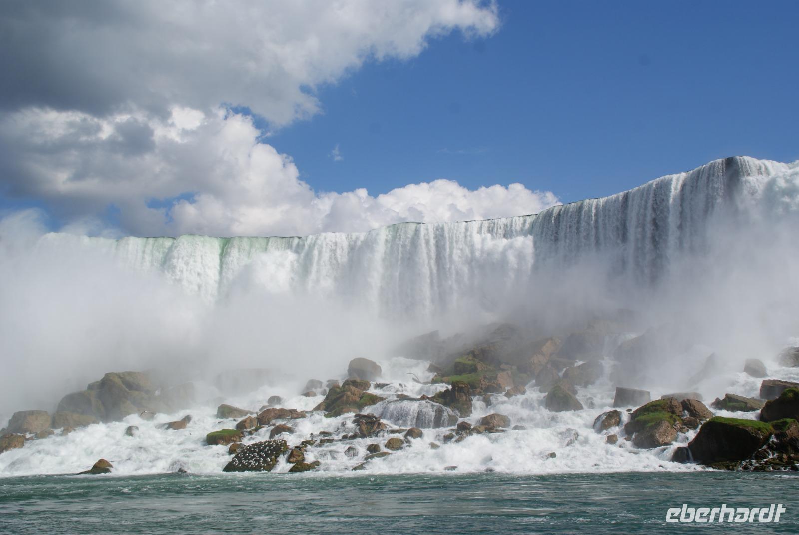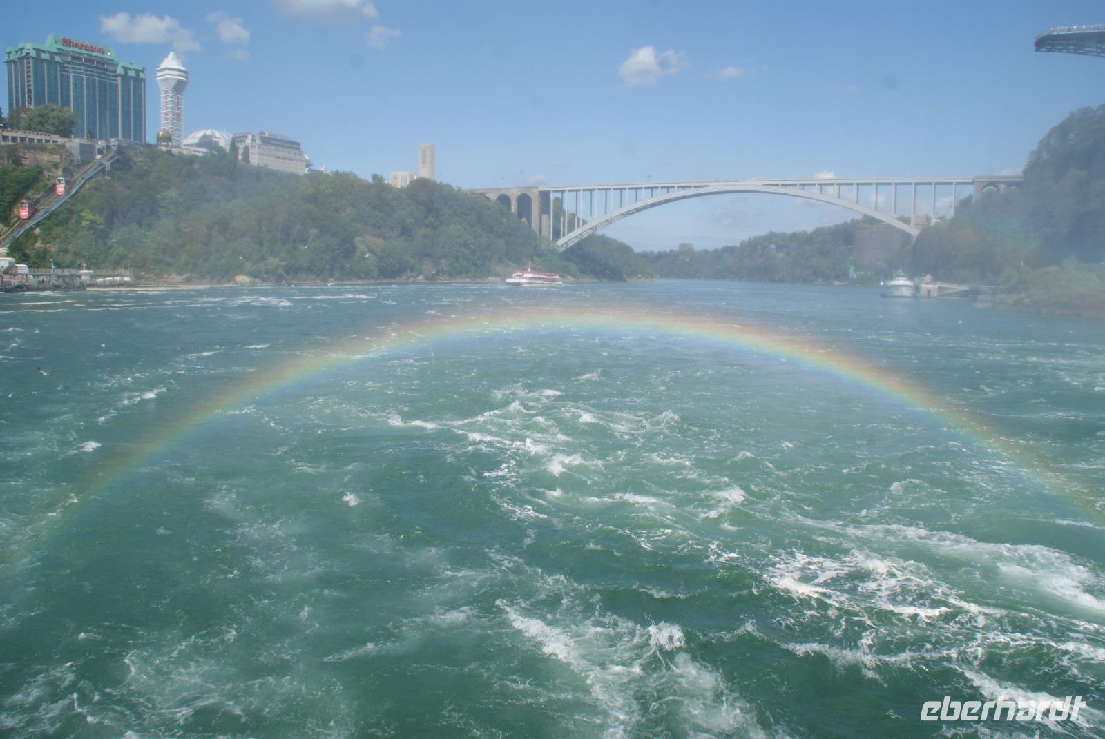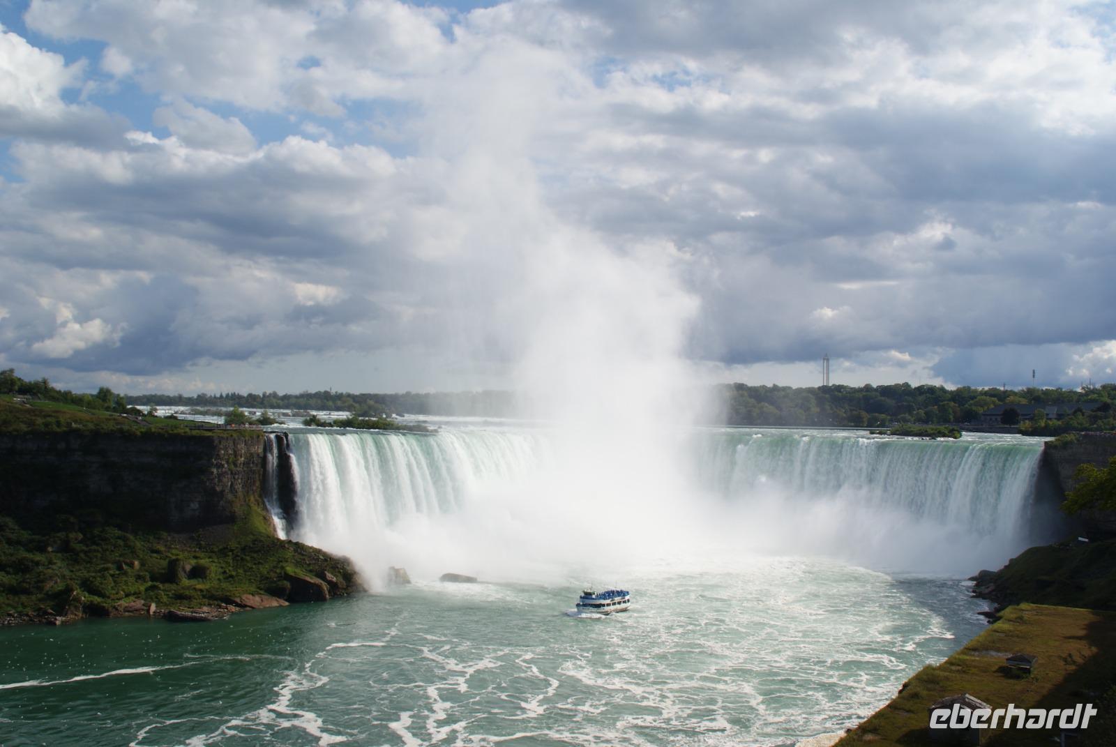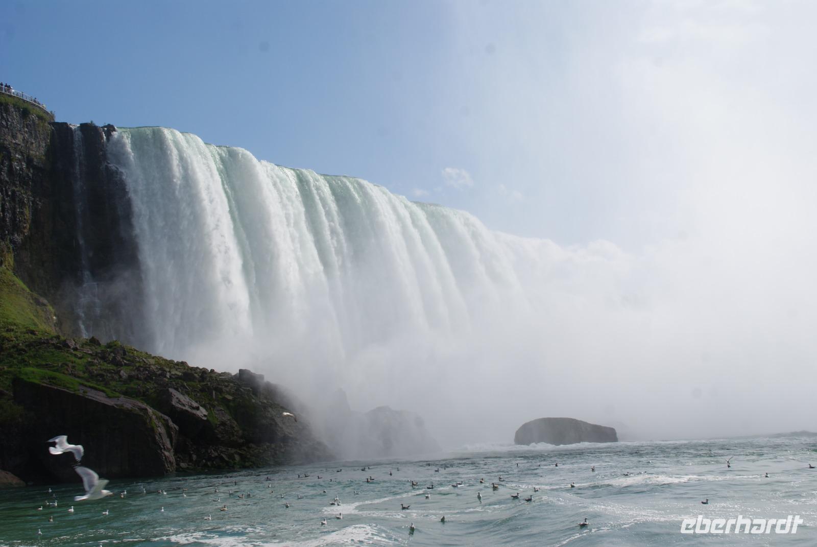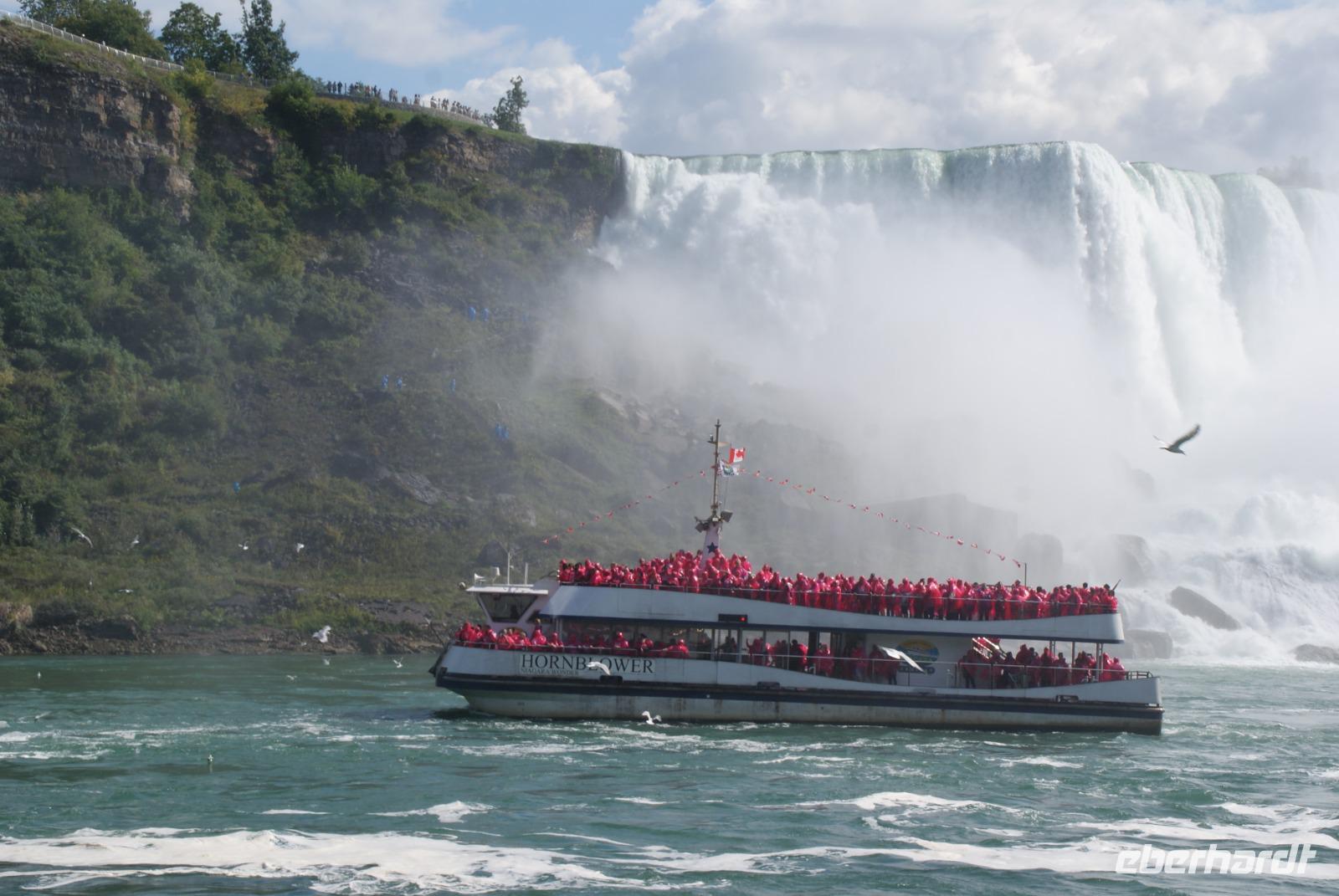 Bedingt durch die Zeitverschiebung von -6 Stunden sind wir alle schon wieder sehr früh wach und treffen uns zum ersten kanadischen Frühstück. Deftig in seiner Art, damit die einheimischen Holzfäller gut gestärkt den Tag beginnen können. So nun auch wir! Los geht unsere Reise mit dem Besuch des CN Towers, von dem wir in schwindelnder Höhe einen fantastischen Blick über ein noch wolkenloses Toronto haben und die unglaubliche Fernsicht genießen. Von dort aus starten wir zur City Tour durch die Hauptstadt der Provinz Ontario, welche übersetzt aus der indianischen Sprache „Treffpunkt" bedeutet. Auf dem Kennzeichen der Provinz steht geschrieben „Yours to discover" (Deins-um von dir entdeckt zu werden). Vorbei an der University Avenue fahren wir entlang des Queen Parks zum beeindruckenden Parlamentsgebäude. Von Dorle hören wir, dass in Toronto das Insulin erforscht und der erste Herzschrittmacher produziert wurde. Hier leben unzählige Nationen friedlich miteinander, es werden 140 Sprachen gesprochen und jeder 2. Bewohner wurde nicht in Kanada geboren... Weiter geht's durch China Town, wo mittlerweile 400.000 Chinesen wohnen. Wir passieren den Dundas Square, der mit dem New Yorker Time Square verglichen wird. Einen Fotostopp planen wir am Rathaus, von wo wir zum Eaton Center spazieren um uns einen Mittagssnack für die Weiterfahrt zu besorgen. Gegen Mittag setzen wir die Fahrt zu den Niagara Fällen fort. Wir fahren durch die Niagara Region und erfahren, dass diese für ihren guten Wein und als Obstkorb Ost Kanadas bekannt ist. Schon bald erreichen wir das „donnernde Wasser" welches Niagara übersetzt bedeutet. Wir sehen die Gischt der Fälle schon von weitem und steuern zunächst die Bootstour der Firma Hornblower an. Einheitlich verpackt im roten Regenschutz gehen wir an Bord und fahren ganz nah an die Fälle heran. Zunächst entlang der amerikanischen und danach zu den kanadischen Hufeisenfällen, den Horseshoe Falls. Beeindruckt kehren wir von dem feucht-fröhlichen Schauspiel zurück und ein Teil unserer Gruppe bricht zum Helikopterflug auf. Während die einen fliegen und die anderen spazieren, hat jeder auf seine Art einen tollen Nachmittag mit viel Zeit die Fälle mit all ihren Fassetten kennenzulernen. Das heutige Abendessen findet im 236m hohen Skylon Tower statt, welcher vom Aussichtsrestaurant nicht nur ein tolles Buffet sondern auch eine grandiose Aussicht auf die bald beleuchteten Fälle bietet. Ein einmaliges Erlebnis. Abschließend spazieren wir nochmals zu den angestrahlten Fällen, die mal blau, dann rot erleuchten...ein unvergessliches Erlebnis und ein toller erster Tag unserer Reise!