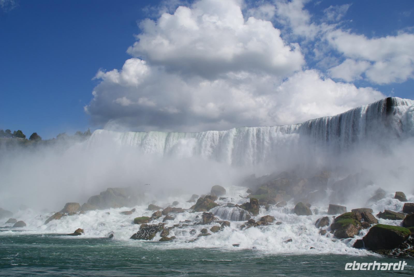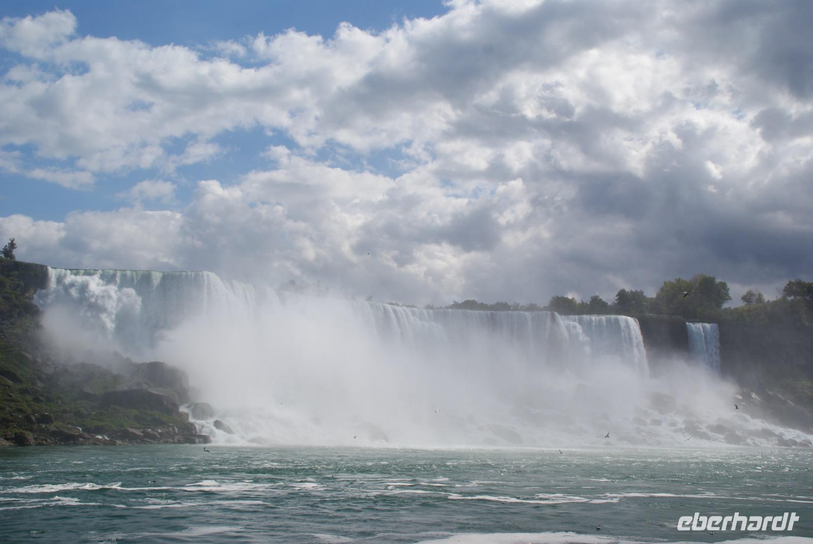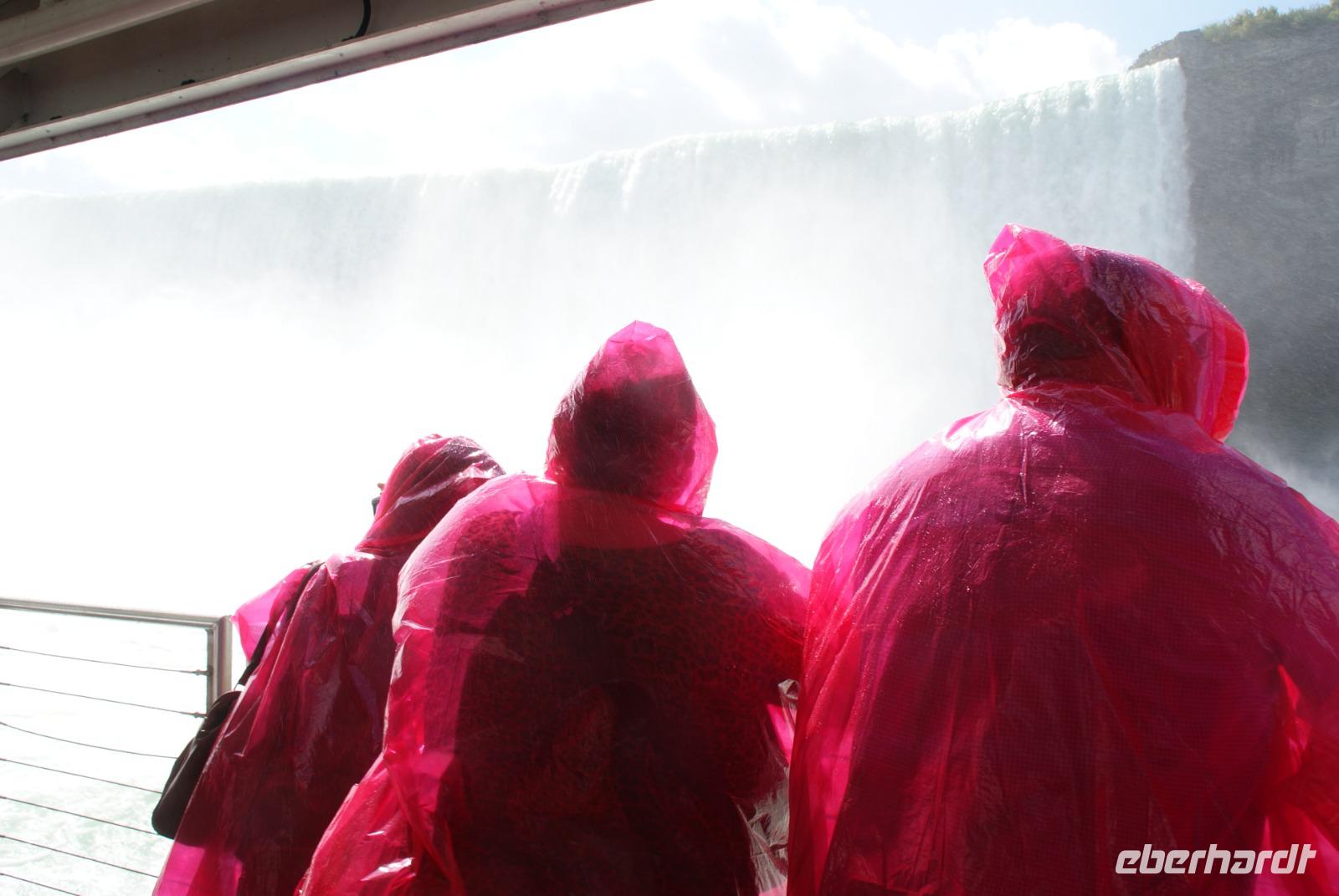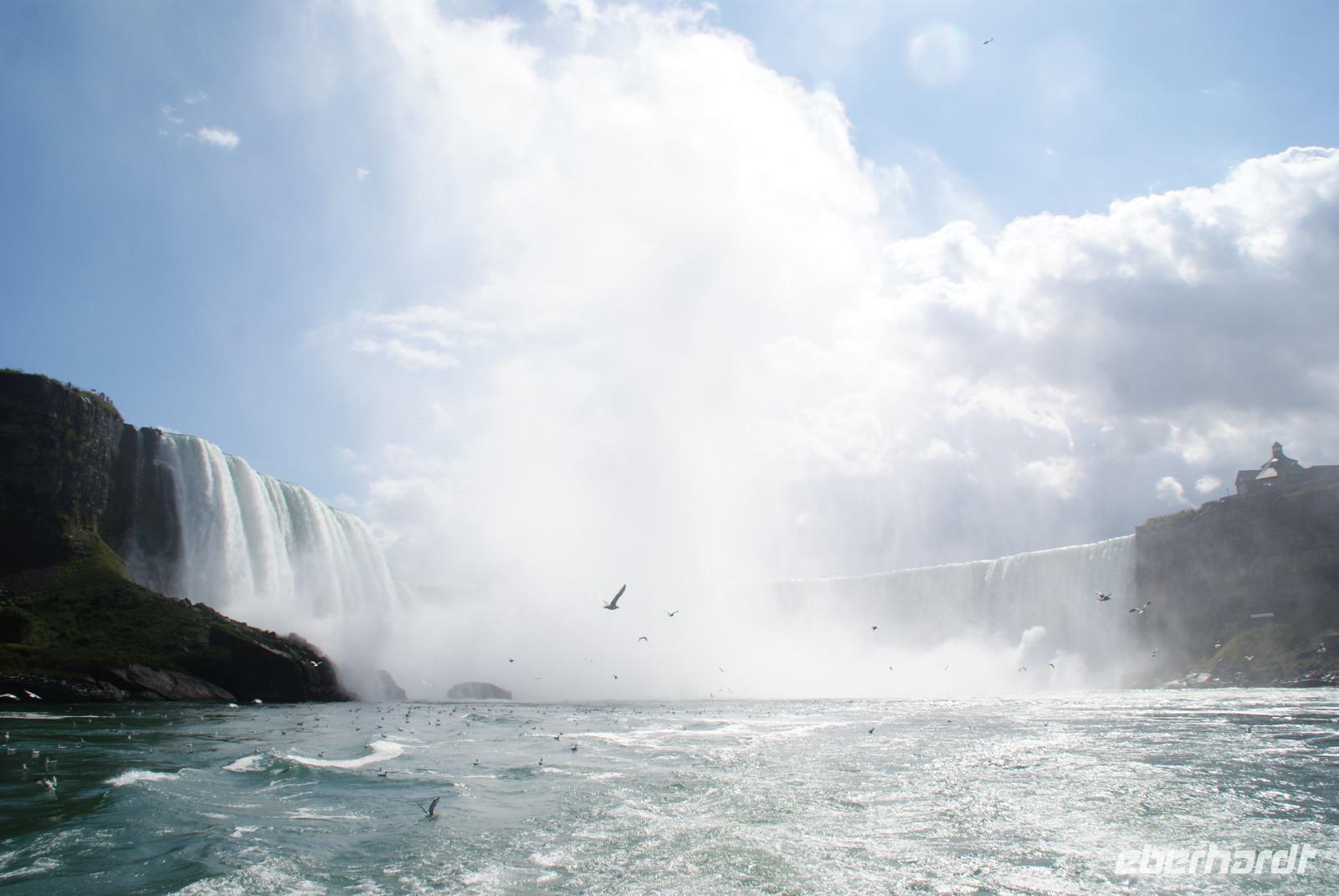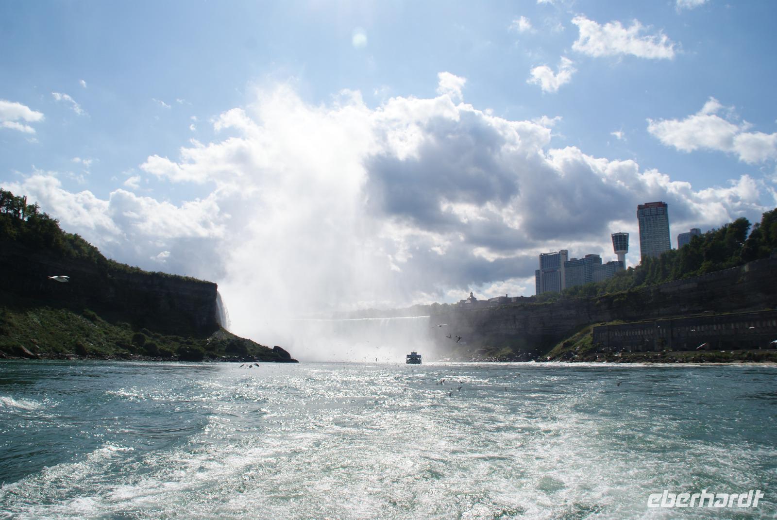 Bedingt durch die Zeitverschiebung von -6 Stunden sind wir alle schon wieder sehr früh wach und treffen uns zum ersten kanadischen Frühstück. Deftig in seiner Art, damit die einheimischen Holzfäller gut gestärkt den Tag beginnen können. So nun auch wir! Los geht unsere Reise mit dem Besuch des CN Towers, von dem wir in schwindelnder Höhe einen fantastischen Blick über ein noch wolkenloses Toronto haben und die unglaubliche Fernsicht genießen. Von dort aus starten wir zur City Tour durch die Hauptstadt der Provinz Ontario, welche übersetzt aus der indianischen Sprache „Treffpunkt" bedeutet. Auf dem Kennzeichen der Provinz steht geschrieben „Yours to discover" (Deins-um von dir entdeckt zu werden). Vorbei an der University Avenue fahren wir entlang des Queen Parks zum beeindruckenden Parlamentsgebäude. Von Dorle hören wir, dass in Toronto das Insulin erforscht und der erste Herzschrittmacher produziert wurde. Hier leben unzählige Nationen friedlich miteinander, es werden 140 Sprachen gesprochen und jeder 2. Bewohner wurde nicht in Kanada geboren... Weiter geht's durch China Town, wo mittlerweile 400.000 Chinesen wohnen. Wir passieren den Dundas Square, der mit dem New Yorker Time Square verglichen wird. Einen Fotostopp planen wir am Rathaus, von wo wir zum Eaton Center spazieren um uns einen Mittagssnack für die Weiterfahrt zu besorgen. Gegen Mittag setzen wir die Fahrt zu den Niagara Fällen fort. Wir fahren durch die Niagara Region und erfahren, dass diese für ihren guten Wein und als Obstkorb Ost Kanadas bekannt ist. Schon bald erreichen wir das „donnernde Wasser" welches Niagara übersetzt bedeutet. Wir sehen die Gischt der Fälle schon von weitem und steuern zunächst die Bootstour der Firma Hornblower an. Einheitlich verpackt im roten Regenschutz gehen wir an Bord und fahren ganz nah an die Fälle heran. Zunächst entlang der amerikanischen und danach zu den kanadischen Hufeisenfällen, den Horseshoe Falls. Beeindruckt kehren wir von dem feucht-fröhlichen Schauspiel zurück und ein Teil unserer Gruppe bricht zum Helikopterflug auf. Während die einen fliegen und die anderen spazieren, hat jeder auf seine Art einen tollen Nachmittag mit viel Zeit die Fälle mit all ihren Fassetten kennenzulernen. Das heutige Abendessen findet im 236m hohen Skylon Tower statt, welcher vom Aussichtsrestaurant nicht nur ein tolles Buffet sondern auch eine grandiose Aussicht auf die bald beleuchteten Fälle bietet. Ein einmaliges Erlebnis. Abschließend spazieren wir nochmals zu den angestrahlten Fällen, die mal blau, dann rot erleuchten...ein unvergessliches Erlebnis und ein toller erster Tag unserer Reise!