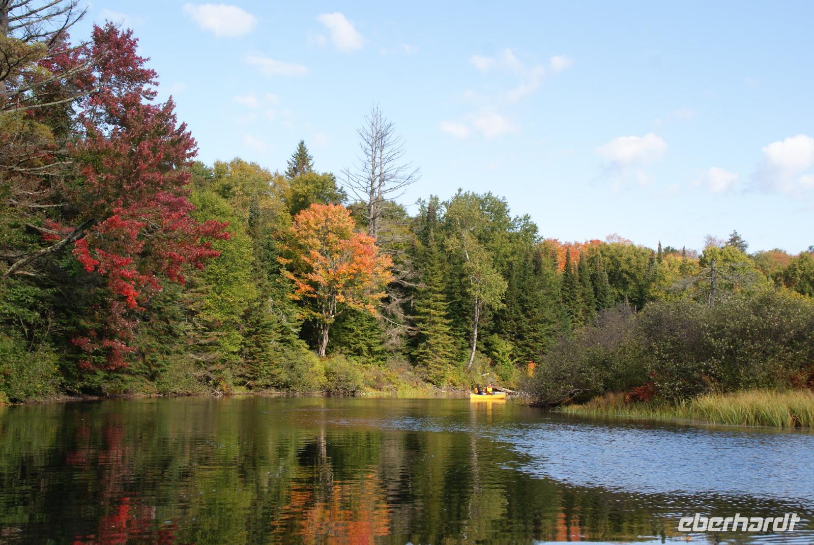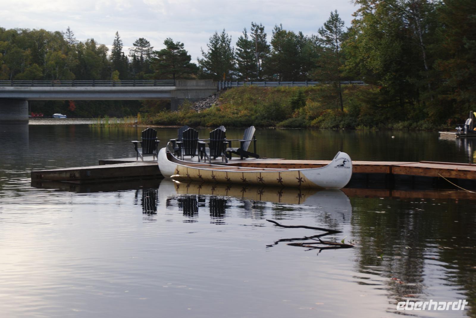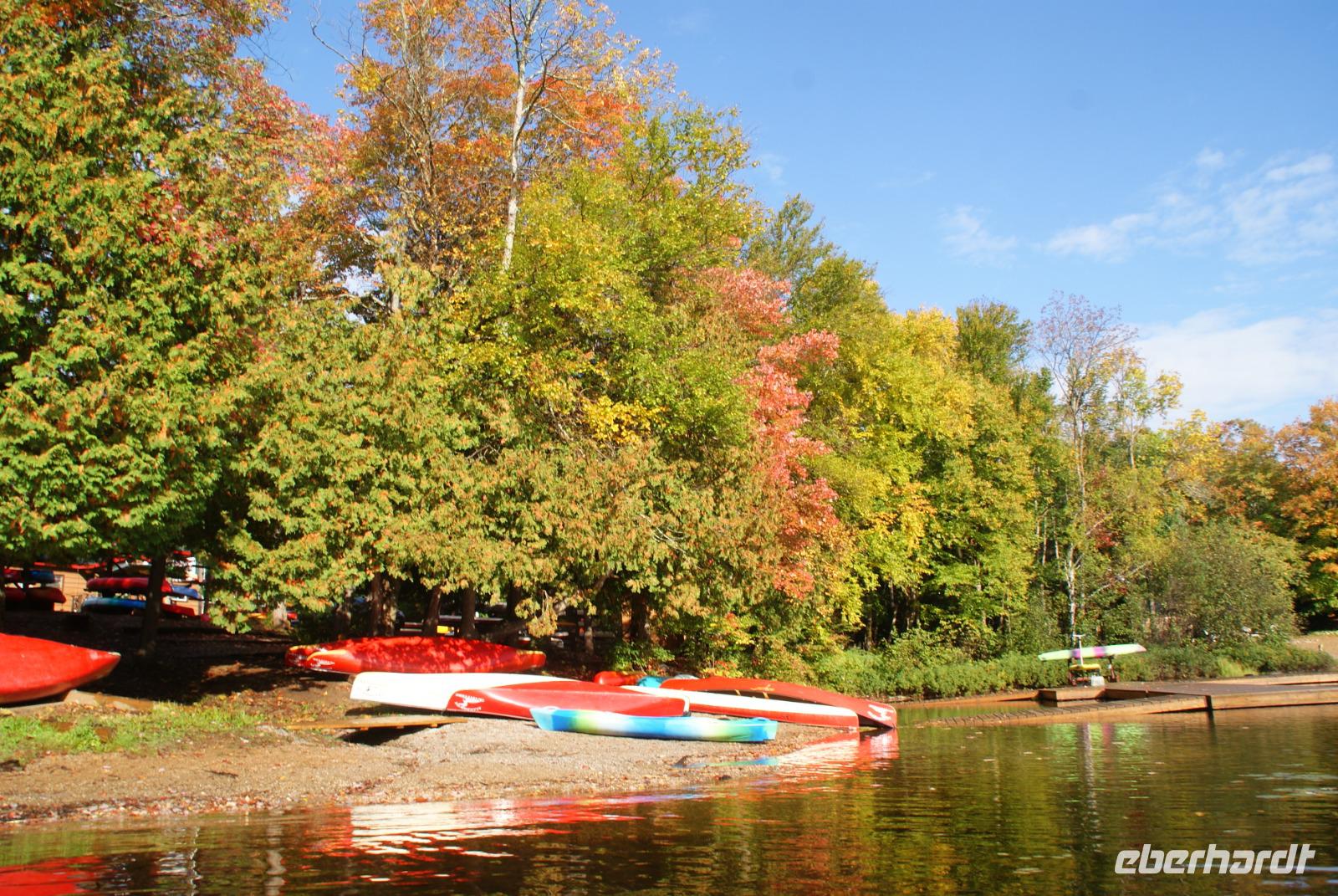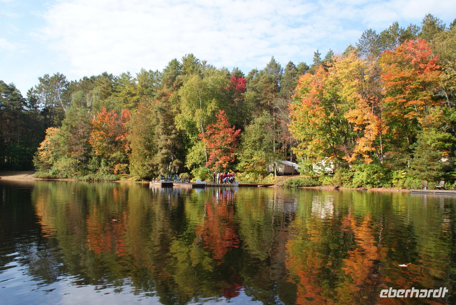 Der heutige Tag führt uns nach einem reichhaltigen Frühstück zum Oxtongue Lake, wo wir mit drei Kanus eine schöne Tour unternehmen. Die Guides Jeff, Mark und Chris begleiten je ein Kanu, sorgen dafür, dass wir in die richtige Richtung paddeln und erzählen uns viel Interessantes über die Umgebung. Trotz Regen in der Nacht und am Morgen, haben wir ein Riesenglück und während unserer Fahrt einfach nur Traumwetter. Der Indian Summer gibt sich die Ehre. Strahlend blauer Himmel, die bunten Bäume leuchten, die Natur spiegelt sich im See-wir sind verzückt. So ein Glück! Wenn Engel reisen...Ein buntes Gemisch aus Birken, Eichen, Zuckerahorn, Espen, Tannen umgibt uns und vor lauter staunen, vergessen wir schon mal zu paddeln. Nach unserer Rückkehr stoßen wir bei einem Glas Sekt auf den tollen Reiseverlauf und die besonders netten Gäste an, nehmen unser gemütliches Picknick ein. Am Nachmittag geht es zum Whisky Trail, einem ca. 2,5 Km langen Wanderweg, buchstäblich über Stock und Stein. Die Bewegung tut uns gut und wir genießen die Ruhe in der wunderschönen Natur. Im Resort zurückgekehrt, erlebt jeder den Nachmittag nach eigenem Gusto mit Wanderung, Sonnen oder einfach nur das Erlebte Revue passieren lassen.
