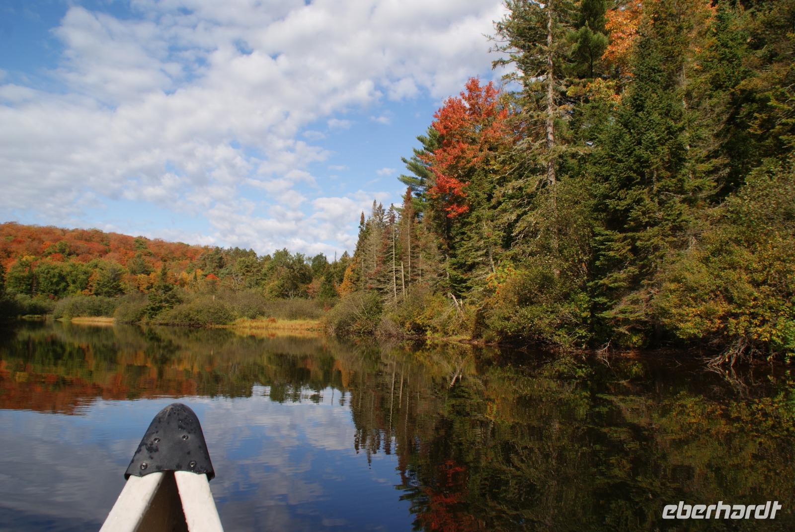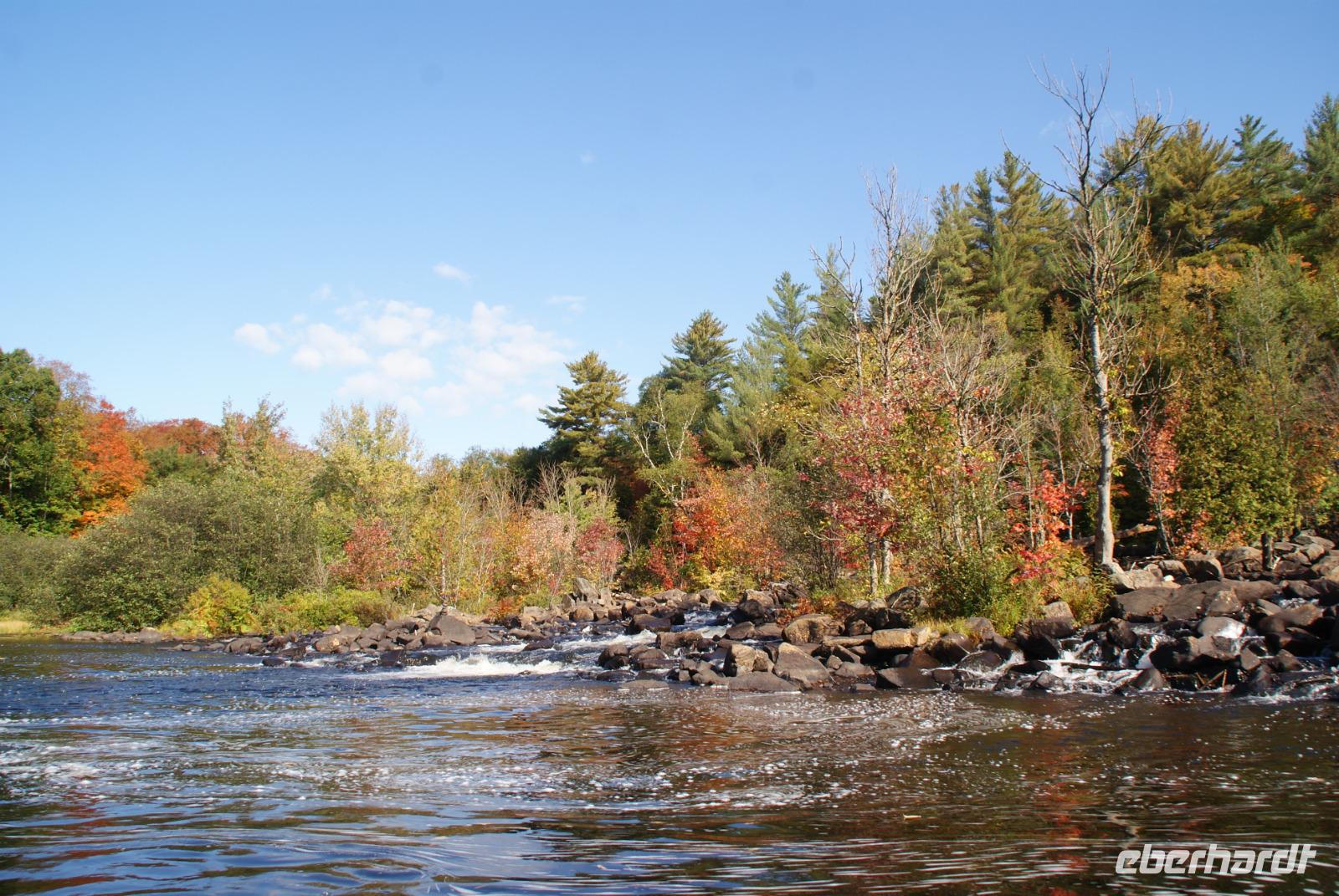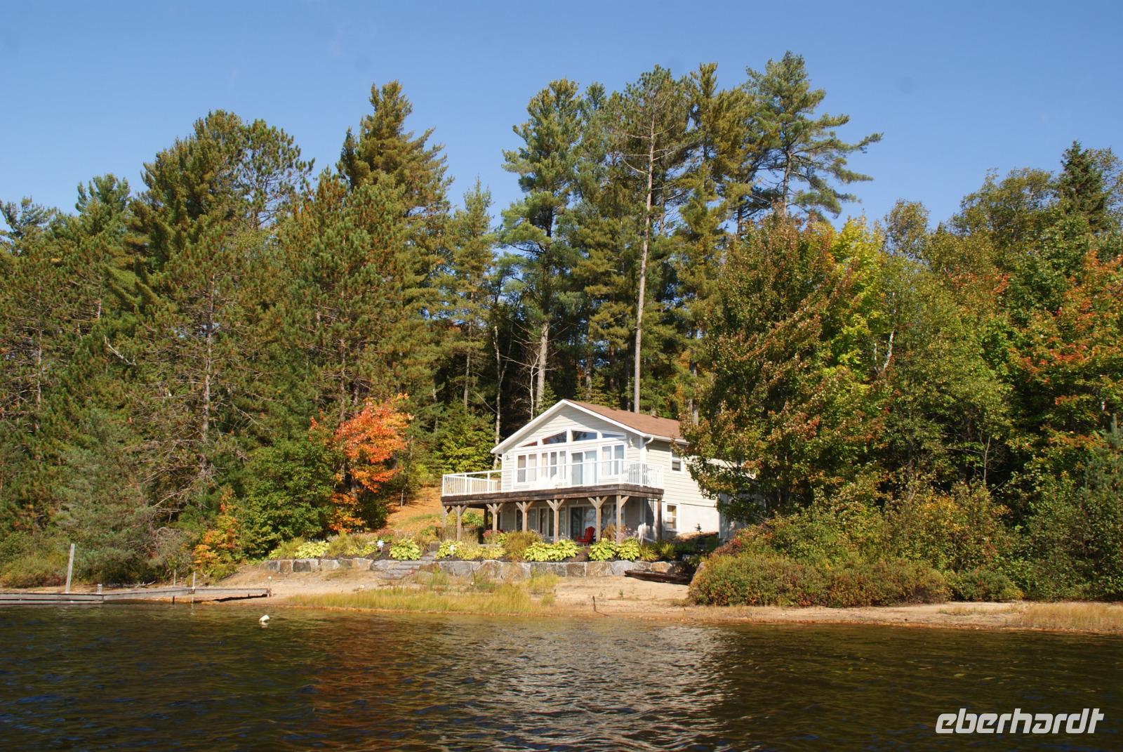 Der heutige Tag führt uns nach einem reichhaltigen Frühstück zum Oxtongue Lake, wo wir mit drei Kanus eine schöne Tour unternehmen. Die Guides Jeff, Mark und Chris begleiten je ein Kanu, sorgen dafür, dass wir in die richtige Richtung paddeln und erzählen uns viel Interessantes über die Umgebung. Trotz Regen in der Nacht und am Morgen, haben wir ein Riesenglück und während unserer Fahrt einfach nur Traumwetter. Der Indian Summer gibt sich die Ehre. Strahlend blauer Himmel, die bunten Bäume leuchten, die Natur spiegelt sich im See-wir sind verzückt. So ein Glück! Wenn Engel reisen...Ein buntes Gemisch aus Birken, Eichen, Zuckerahorn, Espen, Tannen umgibt uns und vor lauter staunen, vergessen wir schon mal zu paddeln. Nach unserer Rückkehr stoßen wir bei einem Glas Sekt auf den tollen Reiseverlauf und die besonders netten Gäste an, nehmen unser gemütliches Picknick ein. Am Nachmittag geht es zum Whisky Trail, einem ca. 2,5 Km langen Wanderweg, buchstäblich über Stock und Stein. Die Bewegung tut uns gut und wir genießen die Ruhe in der wunderschönen Natur. Im Resort zurückgekehrt, erlebt jeder den Nachmittag nach eigenem Gusto mit Wanderung, Sonnen oder einfach nur das Erlebte Revue passieren lassen.