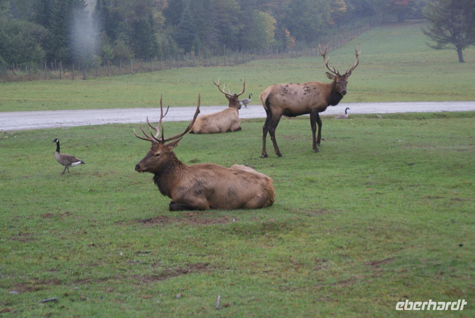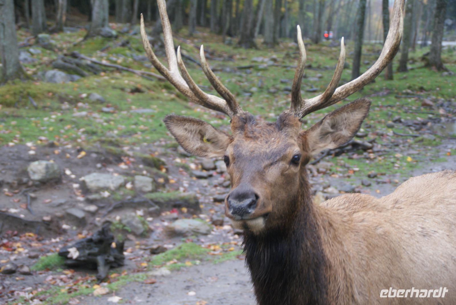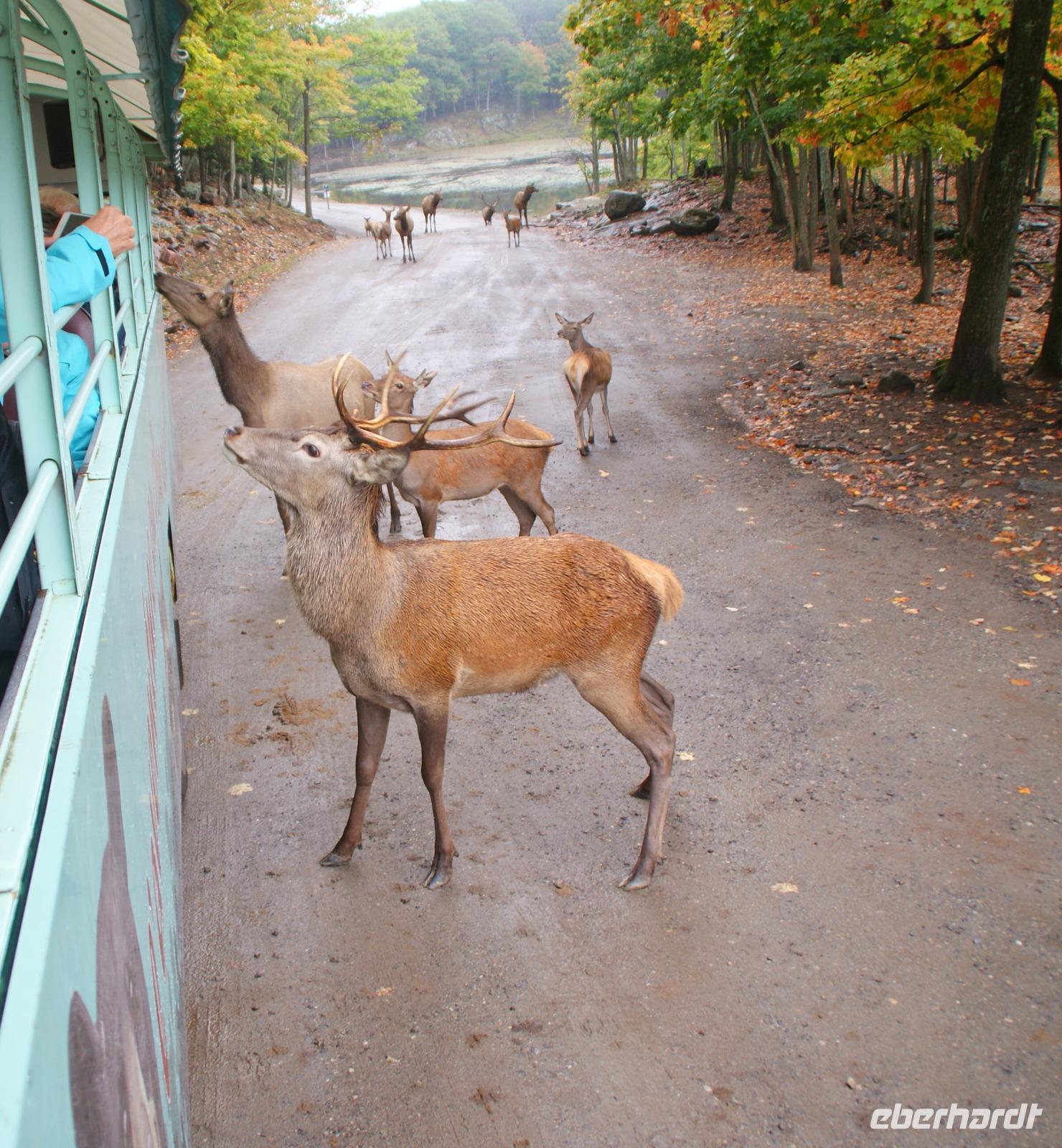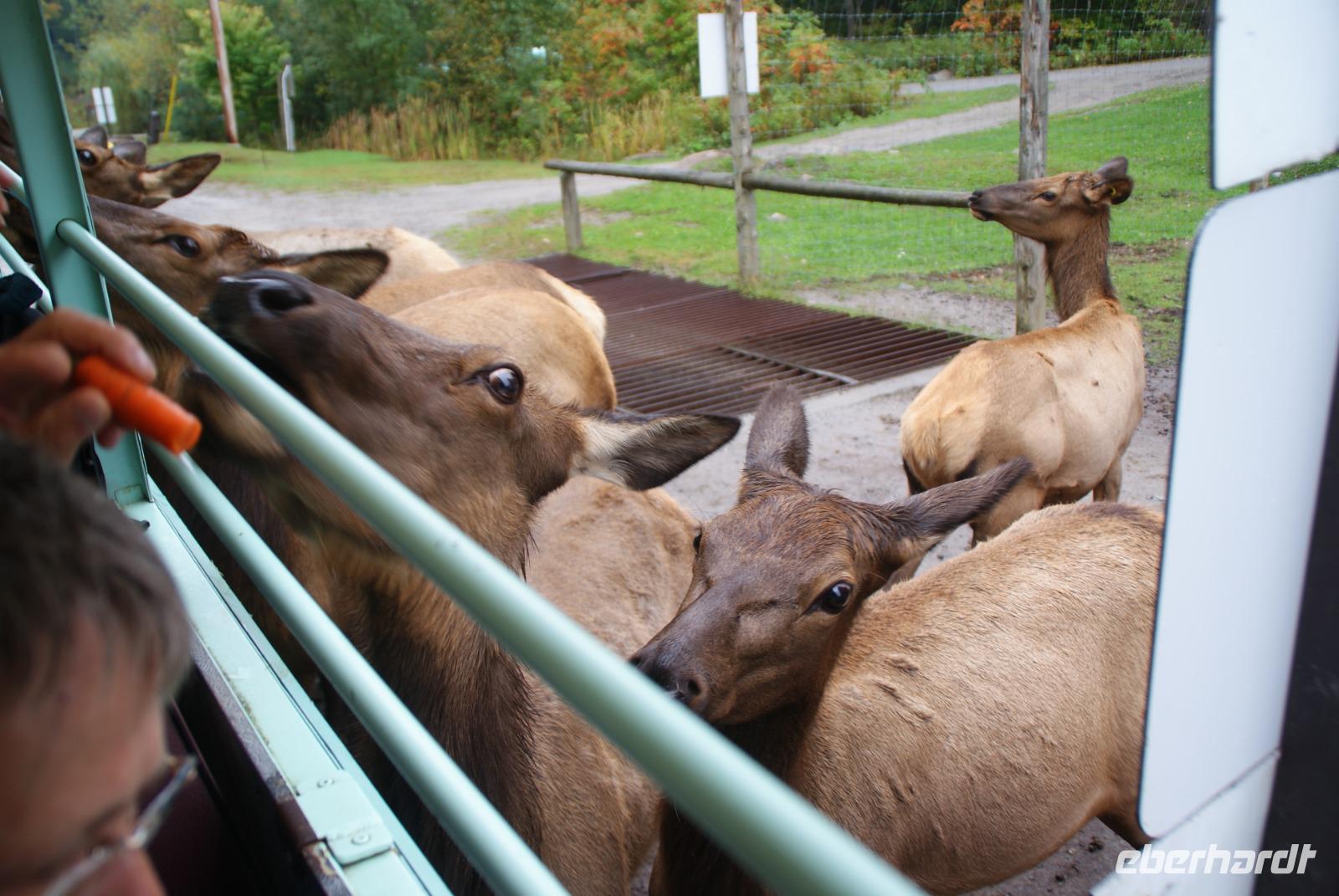Der heutige Morgen beginnt mit einem Frühstück der besonderen Art und Regen in Ottawa. Vor unserer Abreise erhaschen wir noch einen Blick auf die imposanten Totempfähle im wunderbaren Kanadischen Geschichtsmuseum, welches direkt gegenüber unseres Hotels liegt. Wir erfahren, dass Totempfähle nur von den Indianer Stämmen aus dem Westen gefertigt wurden und diese Geschichten über die jeweiligen Familien erzählen. Mit einem letzten schönen Blick auf das gegenüberliegende Ottawa verabschieden wir uns und fahren zum Omega Wildpark. Hier wechseln wir das Fahrzeug und fahren mit einem offenen Schulbus und Fahrer Gilles durch den Park. Zahlreiche Wapitis bilden bereits das Empfangskomitee, wohlwissend, dass wir frische Möhren im Gepäck haben. Somit füttern wir bereitwillig die zahmen Tiere und freuen uns, dass diese keineswegs scheu ganz nah an uns herantreten. Auf unserer 2-stündigen Fahrt sehen wir folgende Tiere: Polarfüchse, Karibus, Wölfe, Wildschweine, Bisons, einen Moschusochsen, einen Elch mit Ersatzmama (Ziege), Weisswedelhirsche, Kojoten, Arktische Wölfe sowie Bergziegen. Ein tolles Erlebnis, diese Tiere hautnah zu erleben. So viel Abenteuer macht hungrig und so kehren wir in das gediegene Chateau Montebello zum Mittagessen ein. Beeindruckt vom phantastischen Ambiente lassen wir es uns schmecken und erfreuen uns über das reichhaltige Buffet. Am Nachmittag erreichen wir Montréal, welches 1642 von Paul de Chomedey, sieur de Maisonneuve gegründet wurde. Den Namen erhielt es vom königlichen Berg, dem Mont Royal, den wir als erstes zu Fuß erwandern. Normalerweise hat man von hier einen gigantischen Blick über die Skyline der Stadt, die heute leider im Nebel liegt. So haben wir zumindest einen schönen Spaziergang erlebt und fahren in unser heutiges Hotel Gouverneur Place Dupuis, welches zentral gelegen einlädt, den restlichen Abend die Stadt zu erkunden.