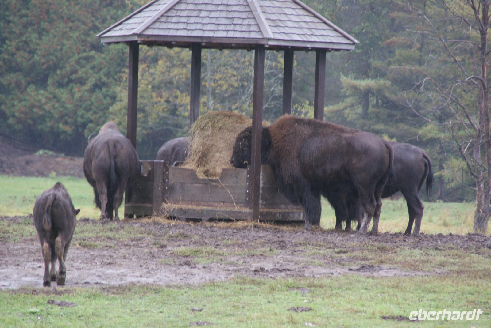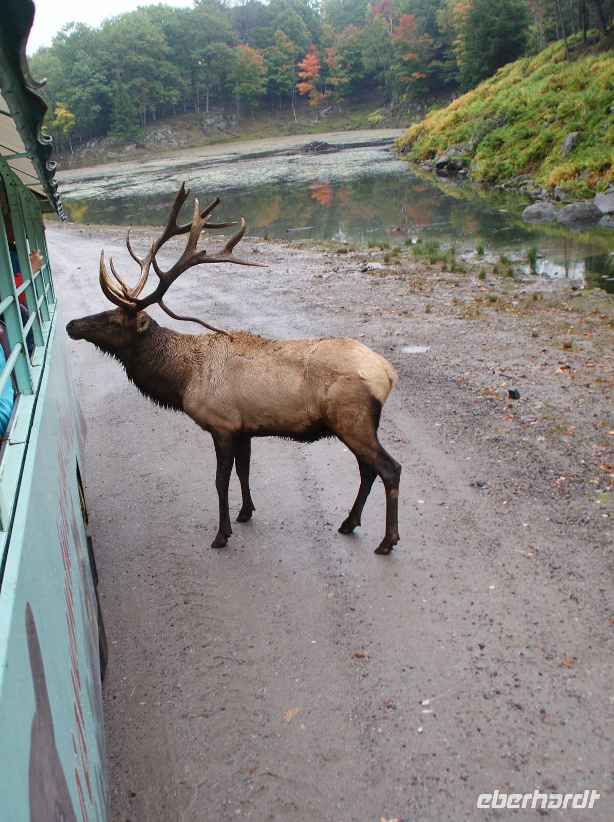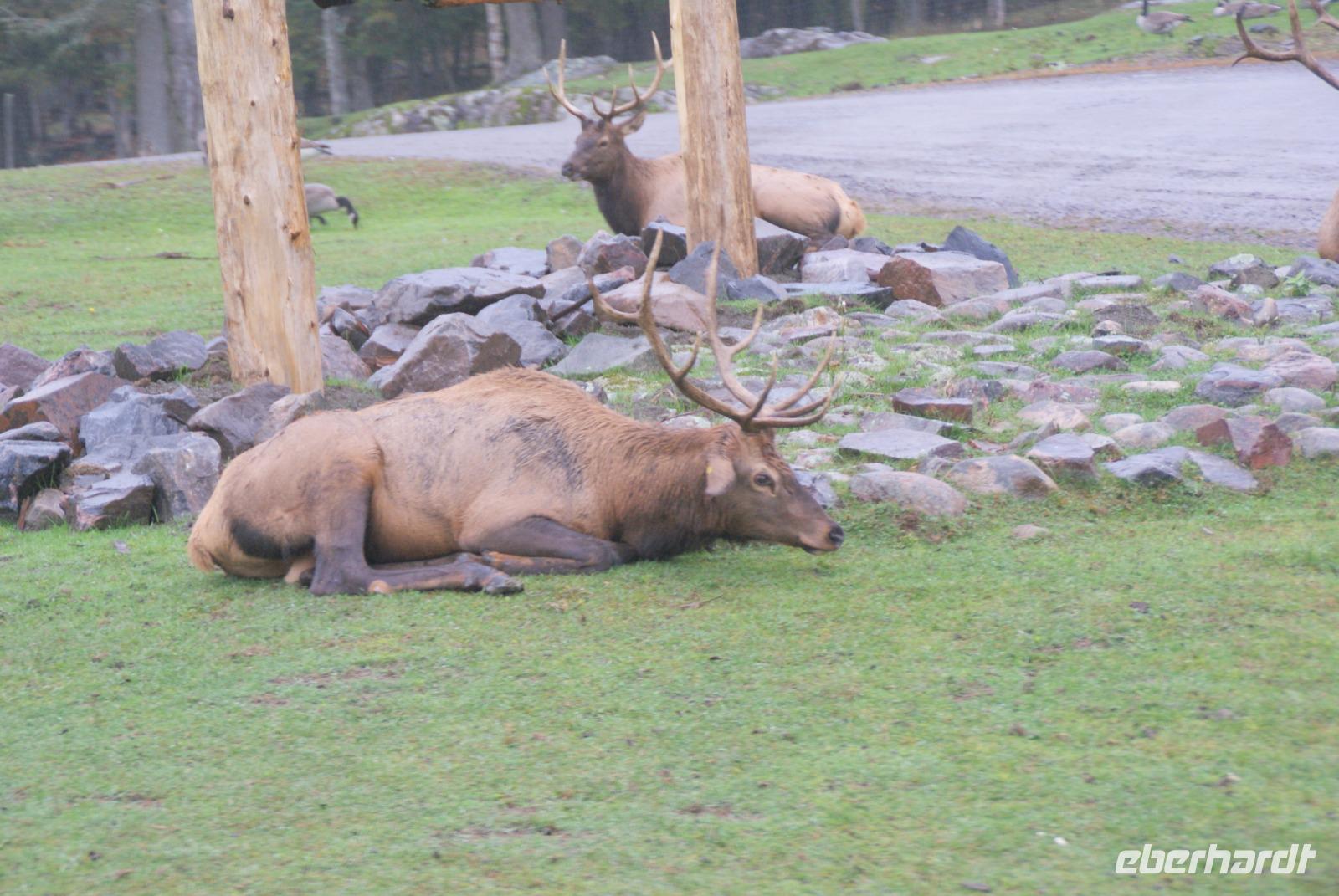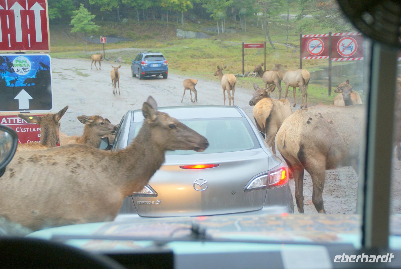 Der heutige Morgen beginnt mit einem Frühstück der besonderen Art und Regen in Ottawa. Vor unserer Abreise erhaschen wir noch einen Blick auf die imposanten Totempfähle im wunderbaren Kanadischen Geschichtsmuseum, welches direkt gegenüber unseres Hotels liegt. Wir erfahren, dass Totempfähle nur von den Indianer Stämmen aus dem Westen gefertigt wurden und diese Geschichten über die jeweiligen Familien erzählen. Mit einem letzten schönen Blick auf das gegenüberliegende Ottawa verabschieden wir uns und fahren zum Omega Wildpark. Hier wechseln wir das Fahrzeug und fahren mit einem offenen Schulbus und Fahrer Gilles durch den Park. Zahlreiche Wapitis bilden bereits das Empfangskomitee, wohlwissend, dass wir frische Möhren im Gepäck haben. Somit füttern wir bereitwillig die zahmen Tiere und freuen uns, dass diese keineswegs scheu ganz nah an uns herantreten. Auf unserer 2-stündigen Fahrt sehen wir folgende Tiere: Polarfüchse, Karibus, Wölfe, Wildschweine, Bisons, einen Moschusochsen, einen Elch mit Ersatzmama (Ziege), Weisswedelhirsche, Kojoten, Arktische Wölfe sowie Bergziegen. Ein tolles Erlebnis, diese Tiere hautnah zu erleben. So viel Abenteuer macht hungrig und so kehren wir in das gediegene Chateau Montebello zum Mittagessen ein. Beeindruckt vom phantastischen Ambiente lassen wir es uns schmecken und erfreuen uns über das reichhaltige Buffet. Am Nachmittag erreichen wir Montréal, welches 1642 von Paul de Chomedey, sieur de Maisonneuve gegründet wurde. Den Namen erhielt es vom königlichen Berg, dem Mont Royal, den wir als erstes zu Fuß erwandern. Normalerweise hat man von hier einen gigantischen Blick über die Skyline der Stadt, die heute leider im Nebel liegt. So haben wir zumindest einen schönen Spaziergang erlebt und fahren in unser heutiges Hotel Gouverneur Place Dupuis, welches zentral gelegen einlädt, den restlichen Abend die Stadt zu erkunden.