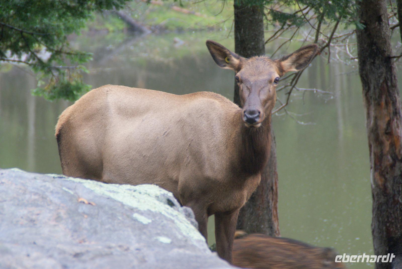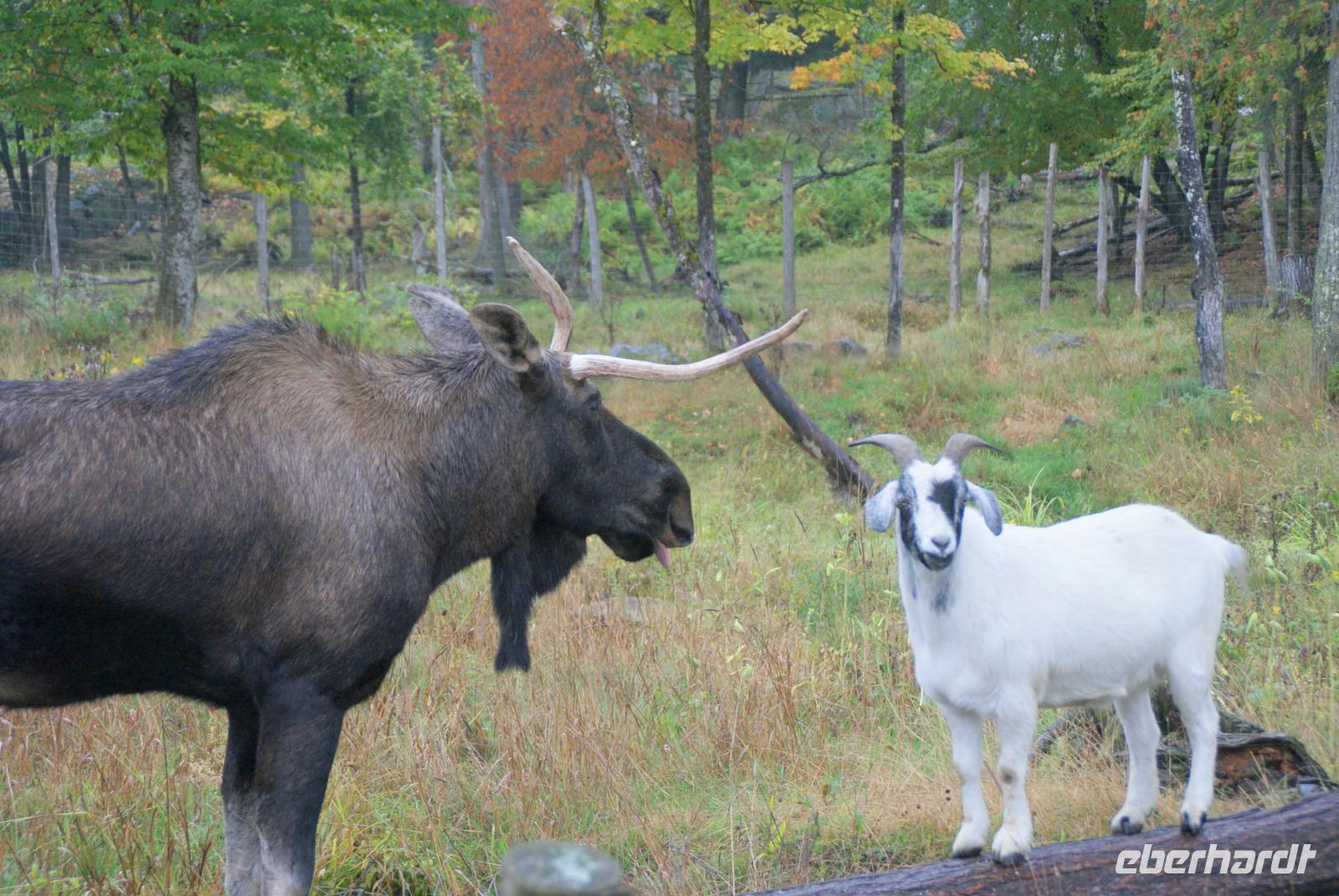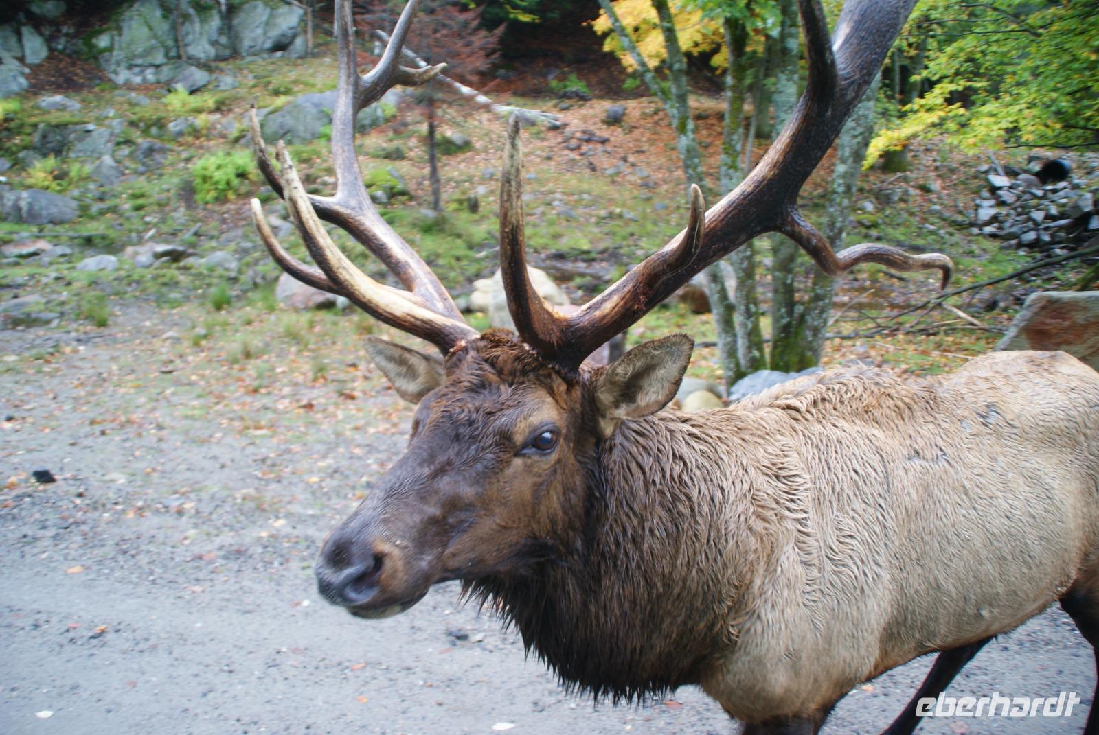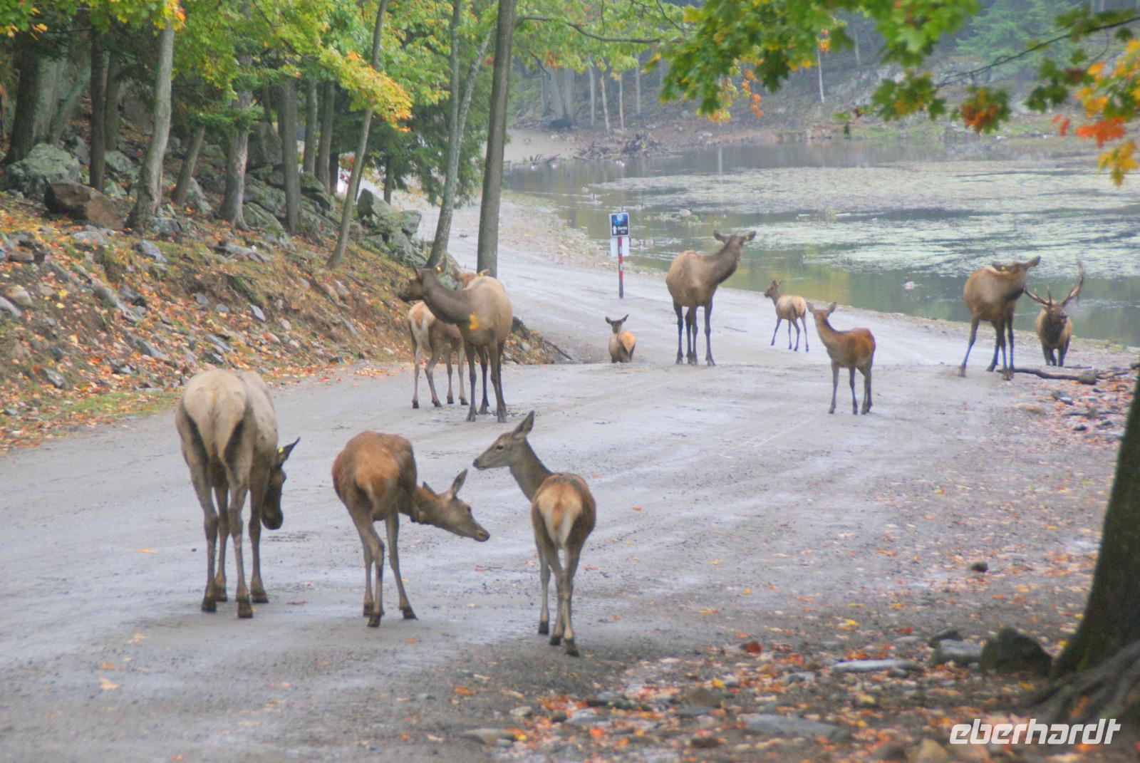 Der heutige Morgen beginnt mit einem Frühstück der besonderen Art und Regen in Ottawa. Vor unserer Abreise erhaschen wir noch einen Blick auf die imposanten Totempfähle im wunderbaren Kanadischen Geschichtsmuseum, welches direkt gegenüber unseres Hotels liegt. Wir erfahren, dass Totempfähle nur von den Indianer Stämmen aus dem Westen gefertigt wurden und diese Geschichten über die jeweiligen Familien erzählen. Mit einem letzten schönen Blick auf das gegenüberliegende Ottawa verabschieden wir uns und fahren zum Omega Wildpark. Hier wechseln wir das Fahrzeug und fahren mit einem offenen Schulbus und Fahrer Gilles durch den Park. Zahlreiche Wapitis bilden bereits das Empfangskomitee, wohlwissend, dass wir frische Möhren im Gepäck haben. Somit füttern wir bereitwillig die zahmen Tiere und freuen uns, dass diese keineswegs scheu ganz nah an uns herantreten. Auf unserer 2-stündigen Fahrt sehen wir folgende Tiere: Polarfüchse, Karibus, Wölfe, Wildschweine, Bisons, einen Moschusochsen, einen Elch mit Ersatzmama (Ziege), Weisswedelhirsche, Kojoten, Arktische Wölfe sowie Bergziegen. Ein tolles Erlebnis, diese Tiere hautnah zu erleben. So viel Abenteuer macht hungrig und so kehren wir in das gediegene Chateau Montebello zum Mittagessen ein. Beeindruckt vom phantastischen Ambiente lassen wir es uns schmecken und erfreuen uns über das reichhaltige Buffet. Am Nachmittag erreichen wir Montréal, welches 1642 von Paul de Chomedey, sieur de Maisonneuve gegründet wurde. Den Namen erhielt es vom königlichen Berg, dem Mont Royal, den wir als erstes zu Fuß erwandern. Normalerweise hat man von hier einen gigantischen Blick über die Skyline der Stadt, die heute leider im Nebel liegt. So haben wir zumindest einen schönen Spaziergang erlebt und fahren in unser heutiges Hotel Gouverneur Place Dupuis, welches zentral gelegen einlädt, den restlichen Abend die Stadt zu erkunden.