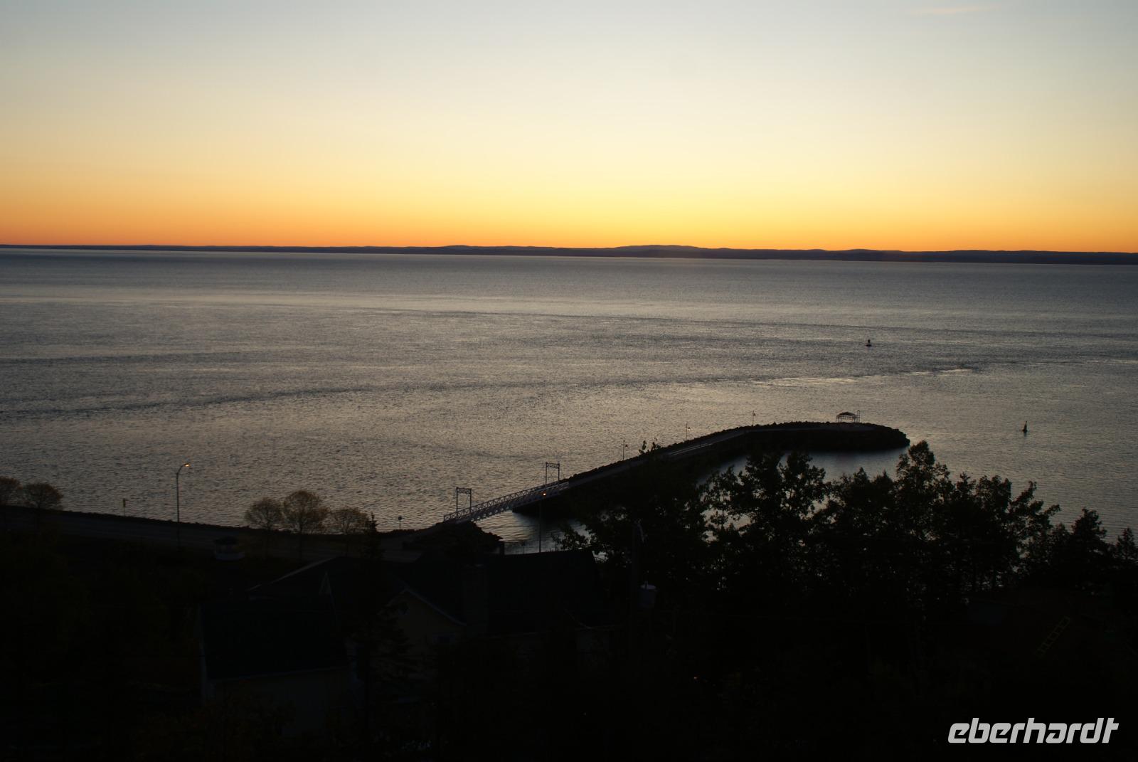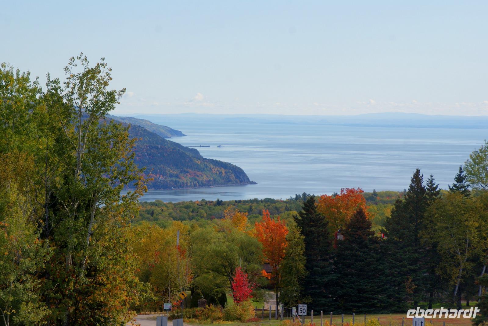 Gestärkt durch ein deftiges, kanadisches Frühstück brechen wir auf und fahren Richtung Tadoussac zur Wahlbeobachtung. Herrliche Landschaft zieht an uns vorbei und der Indian Summer erweist sich alle Ehre. Beim Fotostopp am See glühen die Fotoapparate und Handys, wir können uns von der Kulisse und der bunten Baumpracht nicht satt sehen. In Tadoussac angekommen, steuern wir zunächst das Informationszentrum an und erhalten eine interessante Einführung in die Wale, die wir hoffentlich später zu Gesicht bekommen. Bevor wir an Bord des Schiffes gehen, bleibt noch Zeit, die nähere Umgebung zu erkunden oder einfach nur die Natur zu genießen. Um 13 Uhr fahren wir pünktlich auf dem St. Lorenz Strom hinaus und sehen nach kurzer Zeit schon die ersten weißen Beluga Wale, von denen wir vorher im Film schon viel erfahren haben. Ein paar Kilometer weiter sind wir plötzlich umgeben von Walen und wissen gar nicht, in welche Richtung wir zuerst schauen sollen. Ein Erlebnis! Bis zu 13m lange Buckelwale, bis zu 25m lange Finnwale, welche die zweitgrößte Walart darstellen, bis zu 8m lange Minkwale, Belugas und auch Seehunde, die uns neugierig beäugen. Ein fantastisches und unvergessliches Erlebnis, als die Buckelwale in unserer Nähe abtauchten und dann ihre Finne zeigten. Zurück in St. Catherine erwartet uns Guy bereits mit dem Bus und wir treten die Rückfahrt nach La Malbaie an. Ein Schwarzbär läuft vor uns über die Straße-wir können unser Glück nicht fassen, denn man sieht diese äußerst selten hier in der Region und es ist unser erster Bär auf dieser schönen Reise. Somit ein rundum gelungener Tag, den erneut ein tolles Abendessen mit bezauberndem Ambiente abrundet. Wir spazieren gemeinsam zum Hotel Fairmont Le Manoir Richelieu, erhalten dort ein 3-Gang Menü, welches sehr schmackhaft ist und wir lassen es uns erneut gut gehen.