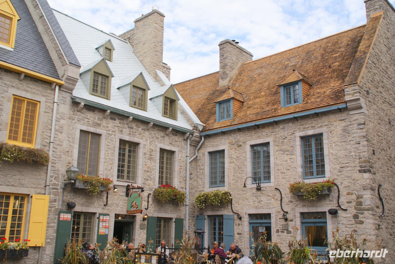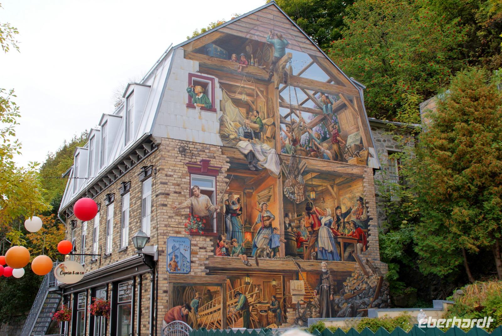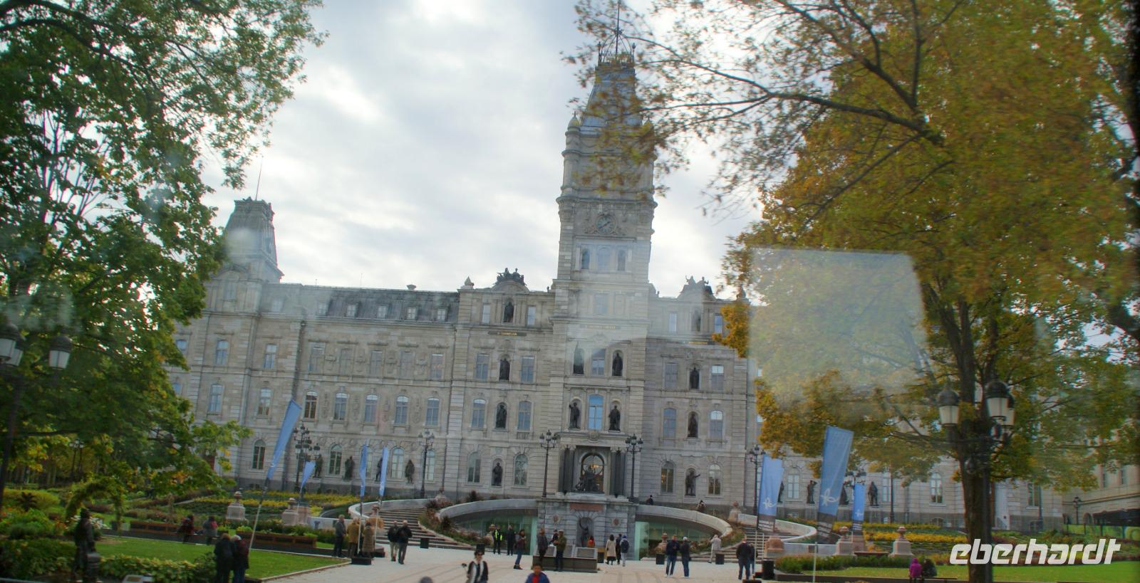 Ein letztes leckeres Frühstück mit Blick auf den St. Lorenz Strom und wir machen uns auf den Weg Richtung Quebec. Es ist Kaiserwetter, die herbstlichen Bäume leuchten, welch ein Abschlusstag! Wir halten nochmals am Besucherzentrum mit Blick auf die Bucht von St. Paul und herrlicher Kulisse auf die Kanadische Landschaft. Als nächsten Programmpunkt geht es zum Canyon Saint Anne und wir spazieren über drei Hängebrücken, die den unter uns liegenden Fluss überqueren, eine tolle Anlage mit vielen weiteren Fotomotiven. Die ganz Mutigen unter uns schießen kurz später in einer Art Speed-Sessellift durch luftige Höhen über den Canyon und die Gaudi ist groß, für die an Bord und für die, die von unten zuschauen. Nachdem wir für unser Mittagspicknick eingekauft haben, halten wir am bekannten Montmorency Wasserfall, welcher 83m hoch ist und somit die Niagarafälle um 30m überragt. Über einen schönen Spazierweg und eine Hängebrücke gelangen wir auf die andere Seite des Wasserfalls und haben auch von hier nochmals eine grandiose Sicht unter anderem auch schon auf die Skyline von Quebec. Am frühen Nachmittag erreichen wir den letzten Höhepunkt unserer so besonderen Reise. Wir besuchen Dorles Wahlheimatstadt, Unesco Weltkulturerbe, die Landeshauptstadt der Provinz Quebec. Quebec! Da sind wir. Wir durchfahren das Stadttor St. Louis und schon befinden wir uns in der Altstadt. Bald sehen wir das Wahrzeichen der Stadt, das berühmte Chateau Frontenac, welches 1893 gebaut wurde und als eins der exklusivsten Luxushotels gilt. Wir spazieren ein Stück durch die Oberstadt, wie der obere Teil der Altstadt genannt wird, zu Fuß, durchschreiten die Künstlergasse und finden uns vor dem imposanten Rathaus wieder. Auf der Fahrt in die Unterstadt führt uns die Tour vorbei an schönen alten Gebäuden und wir fühlen uns wie im tiefsten Frankreich vergangener Tage. Wir spazieren zu Fuß zum Place Royal, wo viele Bauten originalgetreu errichtet wurden, die eindrucksvoll zeigen, wie man einst hier wohnte. Der Platz galt einst als Handelsplatz der Pelzhändler und der Ureinwohner. Eine Statue des Sonnenkönigs, Ludwig der XIV. gab dem Platz den Namen, der übersetzt Königsplatz bedeutet. Ganz in der Nähe erklärt uns Dorle eindrucksvoll ein haushohes Gemälde, welches Szenerien aus vergangenen Tagen der Stadt darstellt. Danach haben wir noch Zeit die Unterstadt in Eigenregie zu erkunden. Am Abend führen wir die Stadtführung noch ein kurzes Stück fort und sehen die „Felder Abrahams", welche einst ein bedeutender Kriegsschauplatz waren. Heute dienen diese als Naherholungsgebiet der Quebecer, wo diverse Sportarten praktiziert werden können. Unser Abschlussabend führt uns in die Cabana de sucre-in die Zuckerhütte. Hier erfahren wir viel über die Ahornsirupgewinnung, die ausschließlich von im Frühjahr von März-April an den Zuckerahornbäumen des Kanadischen Ostens vorgenommen wird. Wir hören, dass ein Baum mindestens 40 Jahre alt sein muss, bevor der den köstlichen Pflanzensaft von sich gibt. Man benötigt mindestens 40l Ahornsaft um einen Liter Ahornsirup zu produzieren. Ein zünftiges, rustikales Abendessen in eben solchem Ambiente mit Live Musik und Tanz beenden unseren Abschlussabend im schönen Quebec.
