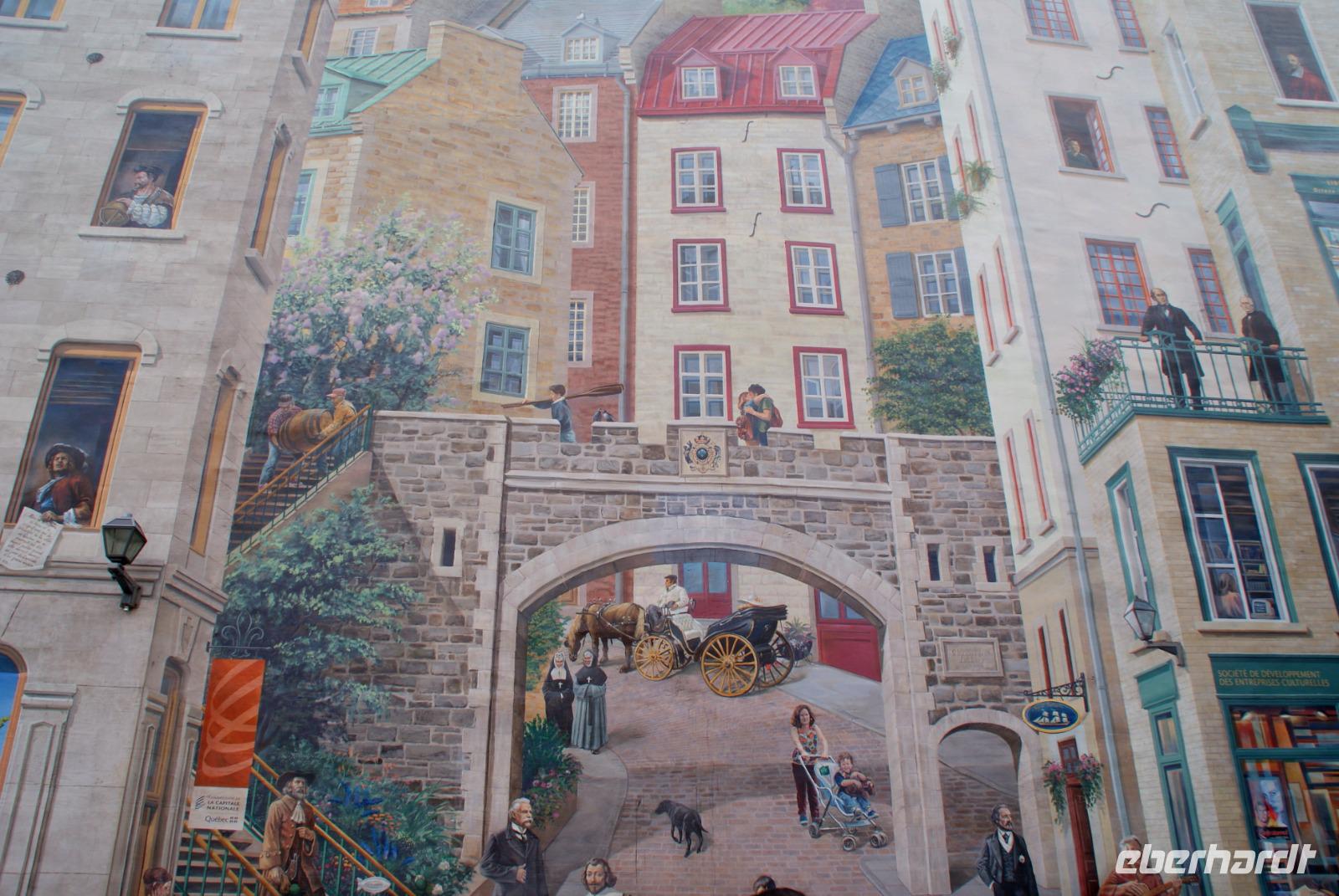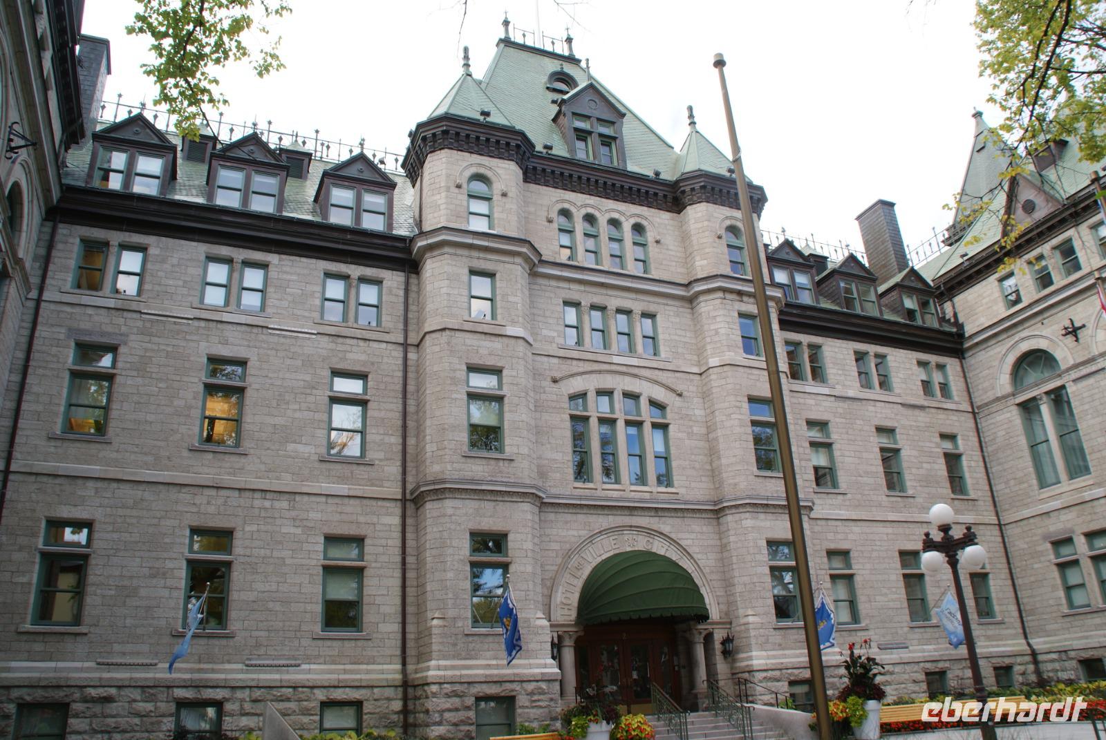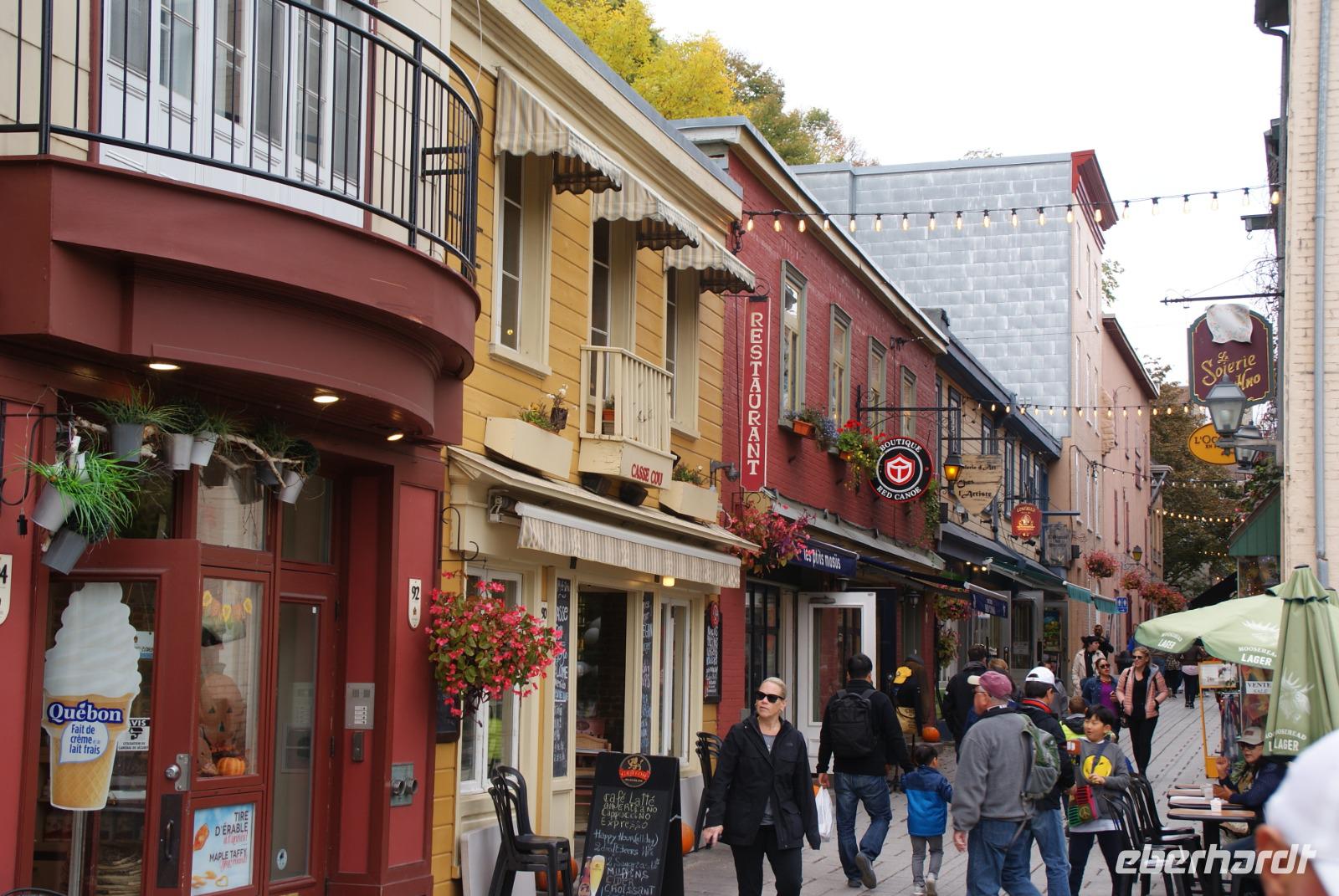 Ein letztes leckeres Frühstück mit Blick auf den St. Lorenz Strom und wir machen uns auf den Weg Richtung Quebec. Es ist Kaiserwetter, die herbstlichen Bäume leuchten, welch ein Abschlusstag! Wir halten nochmals am Besucherzentrum mit Blick auf die Bucht von St. Paul und herrlicher Kulisse auf die Kanadische Landschaft. Als nächsten Programmpunkt geht es zum Canyon Saint Anne und wir spazieren über drei Hängebrücken, die den unter uns liegenden Fluss überqueren, eine tolle Anlage mit vielen weiteren Fotomotiven. Die ganz Mutigen unter uns schießen kurz später in einer Art Speed-Sessellift durch luftige Höhen über den Canyon und die Gaudi ist groß, für die an Bord und für die, die von unten zuschauen. Nachdem wir für unser Mittagspicknick eingekauft haben, halten wir am bekannten Montmorency Wasserfall, welcher 83m hoch ist und somit die Niagarafälle um 30m überragt. Über einen schönen Spazierweg und eine Hängebrücke gelangen wir auf die andere Seite des Wasserfalls und haben auch von hier nochmals eine grandiose Sicht unter anderem auch schon auf die Skyline von Quebec. Am frühen Nachmittag erreichen wir den letzten Höhepunkt unserer so besonderen Reise. Wir besuchen Dorles Wahlheimatstadt, Unesco Weltkulturerbe, die Landeshauptstadt der Provinz Quebec. Quebec! Da sind wir. Wir durchfahren das Stadttor St. Louis und schon befinden wir uns in der Altstadt. Bald sehen wir das Wahrzeichen der Stadt, das berühmte Chateau Frontenac, welches 1893 gebaut wurde und als eins der exklusivsten Luxushotels gilt. Wir spazieren ein Stück durch die Oberstadt, wie der obere Teil der Altstadt genannt wird, zu Fuß, durchschreiten die Künstlergasse und finden uns vor dem imposanten Rathaus wieder. Auf der Fahrt in die Unterstadt führt uns die Tour vorbei an schönen alten Gebäuden und wir fühlen uns wie im tiefsten Frankreich vergangener Tage. Wir spazieren zu Fuß zum Place Royal, wo viele Bauten originalgetreu errichtet wurden, die eindrucksvoll zeigen, wie man einst hier wohnte. Der Platz galt einst als Handelsplatz der Pelzhändler und der Ureinwohner. Eine Statue des Sonnenkönigs, Ludwig der XIV. gab dem Platz den Namen, der übersetzt Königsplatz bedeutet. Ganz in der Nähe erklärt uns Dorle eindrucksvoll ein haushohes Gemälde, welches Szenerien aus vergangenen Tagen der Stadt darstellt. Danach haben wir noch Zeit die Unterstadt in Eigenregie zu erkunden. Am Abend führen wir die Stadtführung noch ein kurzes Stück fort und sehen die „Felder Abrahams", welche einst ein bedeutender Kriegsschauplatz waren. Heute dienen diese als Naherholungsgebiet der Quebecer, wo diverse Sportarten praktiziert werden können. Unser Abschlussabend führt uns in die Cabana de sucre-in die Zuckerhütte. Hier erfahren wir viel über die Ahornsirupgewinnung, die ausschließlich von im Frühjahr von März-April an den Zuckerahornbäumen des Kanadischen Ostens vorgenommen wird. Wir hören, dass ein Baum mindestens 40 Jahre alt sein muss, bevor der den köstlichen Pflanzensaft von sich gibt. Man benötigt mindestens 40l Ahornsaft um einen Liter Ahornsirup zu produzieren. Ein zünftiges, rustikales Abendessen in eben solchem Ambiente mit Live Musik und Tanz beenden unseren Abschlussabend im schönen Quebec.