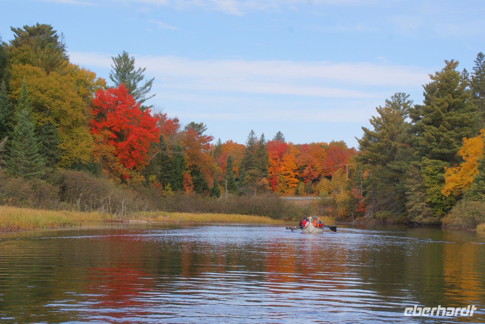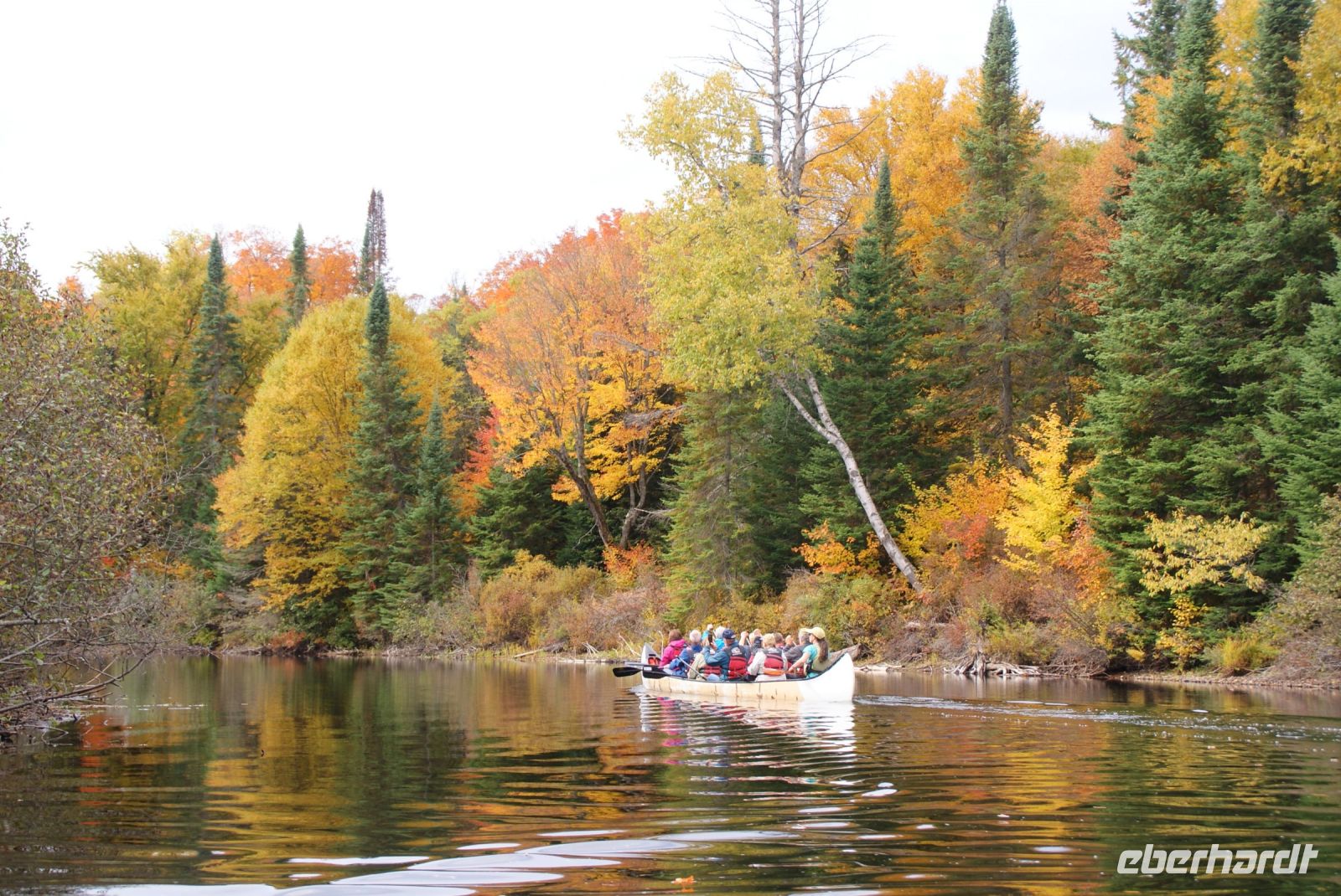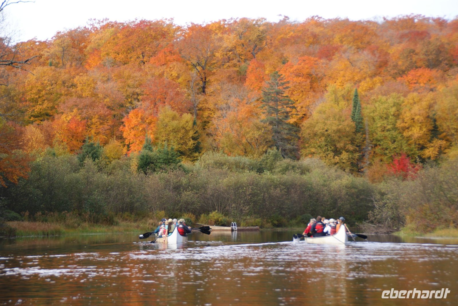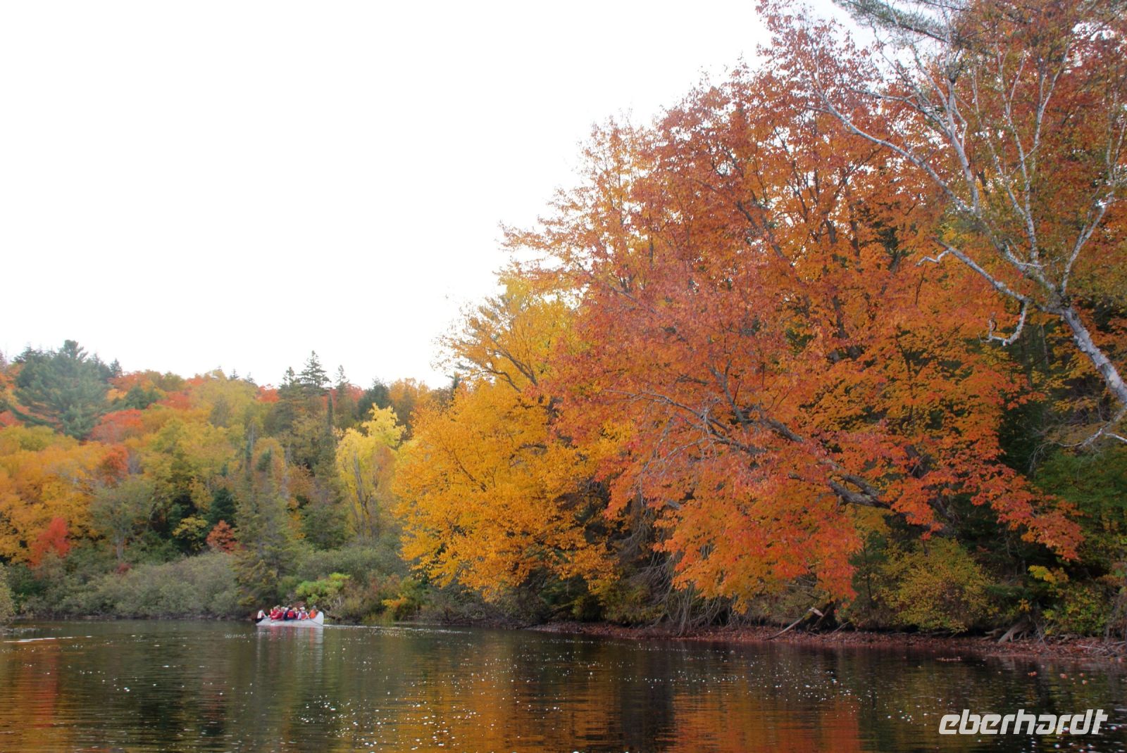 Der heutige Morgen führt uns zum Oxtongue Lake, auf dem wir eine Kanufahrt unternehmen. Aufgeteilt auf drei Boote und drei örtliche Guides paddeln wir um die Wette zunächst am See entlang und biegen später in einen Fluss ab, der uns zu einem Wasserfall führt. Uns umgibt erneut eine herrliche Herbstkulisse, es herrschen milde Temperaturen, die Sonne scheint und wir erleben einen wunderbar sportlichen Vormittag. So viel körperliche Bewegung macht uns hungrig, sodass wir nach Rückkehr unsere Lunchboxen am See genießen, Paul dazu noch einen mitgebrachten Gasgrill anwirft und zusätzlich noch Würstchen für uns brät. Welch ein Luxus, dazu die tolle Kulisse am See, schöne Sitzgelegenheiten und ein toller Mittagssnack umgeben von grandioser Natur, die wir uns nun bunter nicht mehr vorstellen können. Anschließend fahren wir in den Algonquin Park hinein, halten für diverse Fotostopps mit Prachtaufnahmen und unternehmen abschließend eine schöne Wanderung entlang des Spruce bog Boardwalk. Dies ist ein schöner 1,5 Km langer Rundweg, der uns am See entlang und durch den Wald führt. Wir begegnen handzahmen Meisen, die sich auf unsern Händen niederlassen, genauso wie etliche Streifenhörnchen, die ebenfalls recht zutraulich sind. Auf dem Rückweg halten wir nochmals am Canoe Lake, wo wir erneut eine tolle Fotokulisse vorfinden. Auch heute haben wir wieder einen Indian Summer Tag vom Feinsten erlebt, die Natur in vollen Zügen genossen, das alles bei milden Temperaturen und Sonnenschein-Petrus hat es sehr gut mit uns gemeint.