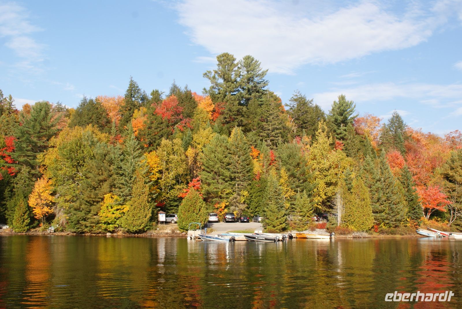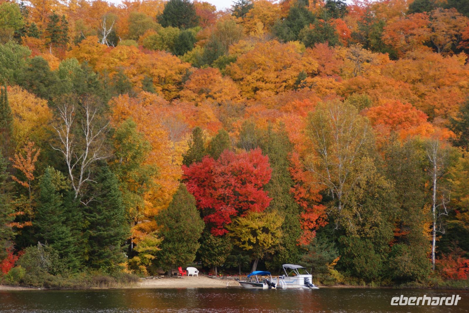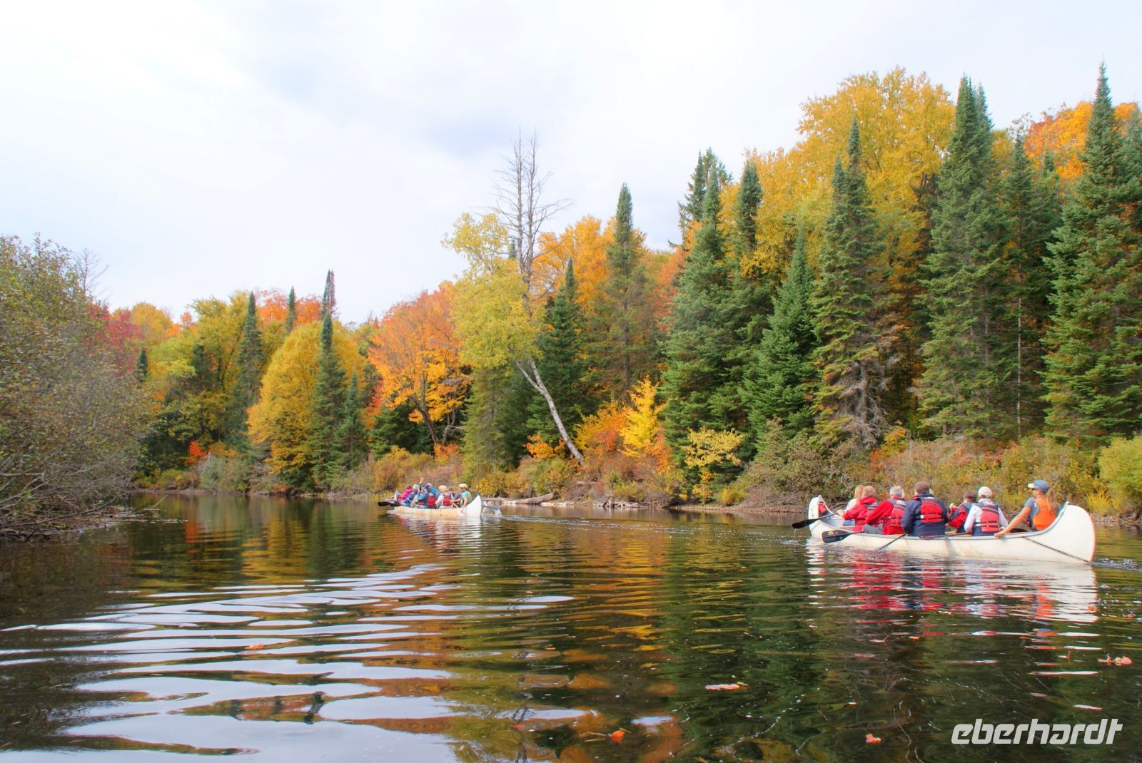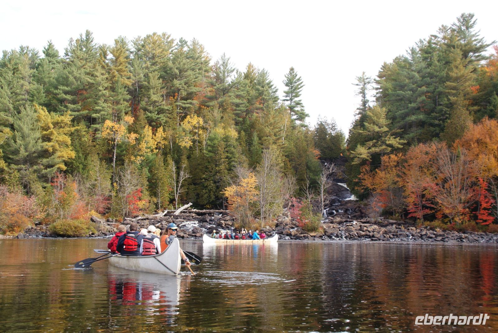 Der heutige Morgen führt uns zum Oxtongue Lake, auf dem wir eine Kanufahrt unternehmen. Aufgeteilt auf drei Boote und drei örtliche Guides paddeln wir um die Wette zunächst am See entlang und biegen später in einen Fluss ab, der uns zu einem Wasserfall führt. Uns umgibt erneut eine herrliche Herbstkulisse, es herrschen milde Temperaturen, die Sonne scheint und wir erleben einen wunderbar sportlichen Vormittag. So viel körperliche Bewegung macht uns hungrig, sodass wir nach Rückkehr unsere Lunchboxen am See genießen, Paul dazu noch einen mitgebrachten Gasgrill anwirft und zusätzlich noch Würstchen für uns brät. Welch ein Luxus, dazu die tolle Kulisse am See, schöne Sitzgelegenheiten und ein toller Mittagssnack umgeben von grandioser Natur, die wir uns nun bunter nicht mehr vorstellen können. Anschließend fahren wir in den Algonquin Park hinein, halten für diverse Fotostopps mit Prachtaufnahmen und unternehmen abschließend eine schöne Wanderung entlang des Spruce bog Boardwalk. Dies ist ein schöner 1,5 Km langer Rundweg, der uns am See entlang und durch den Wald führt. Wir begegnen handzahmen Meisen, die sich auf unsern Händen niederlassen, genauso wie etliche Streifenhörnchen, die ebenfalls recht zutraulich sind. Auf dem Rückweg halten wir nochmals am Canoe Lake, wo wir erneut eine tolle Fotokulisse vorfinden. Auch heute haben wir wieder einen Indian Summer Tag vom Feinsten erlebt, die Natur in vollen Zügen genossen, das alles bei milden Temperaturen und Sonnenschein-Petrus hat es sehr gut mit uns gemeint.