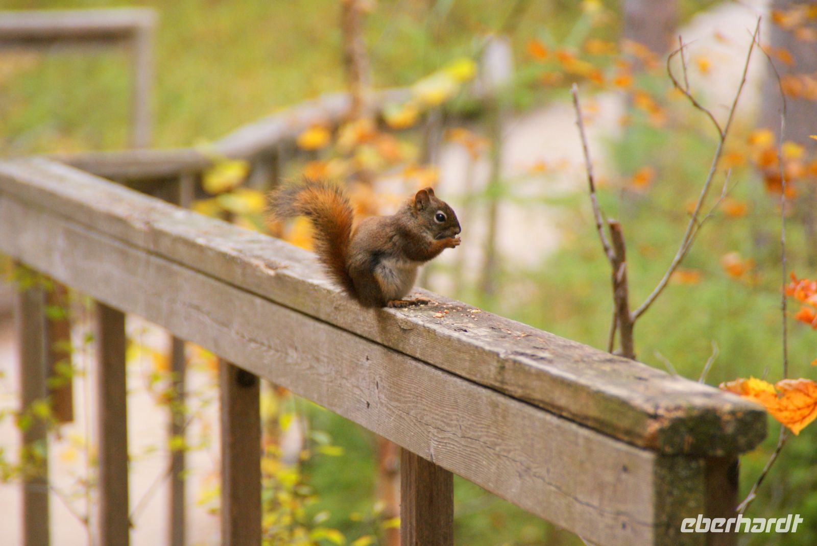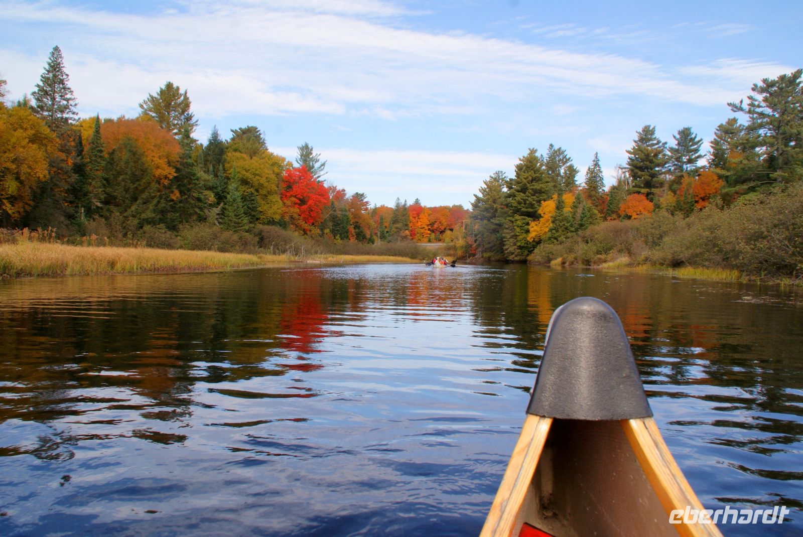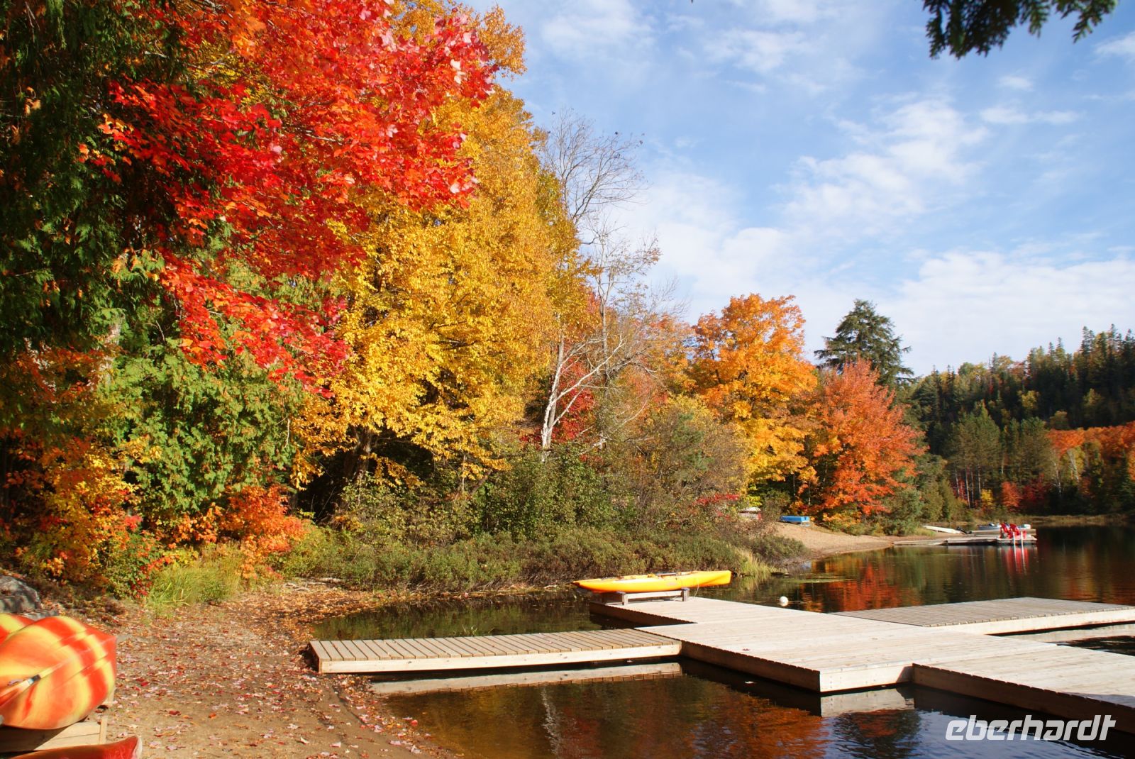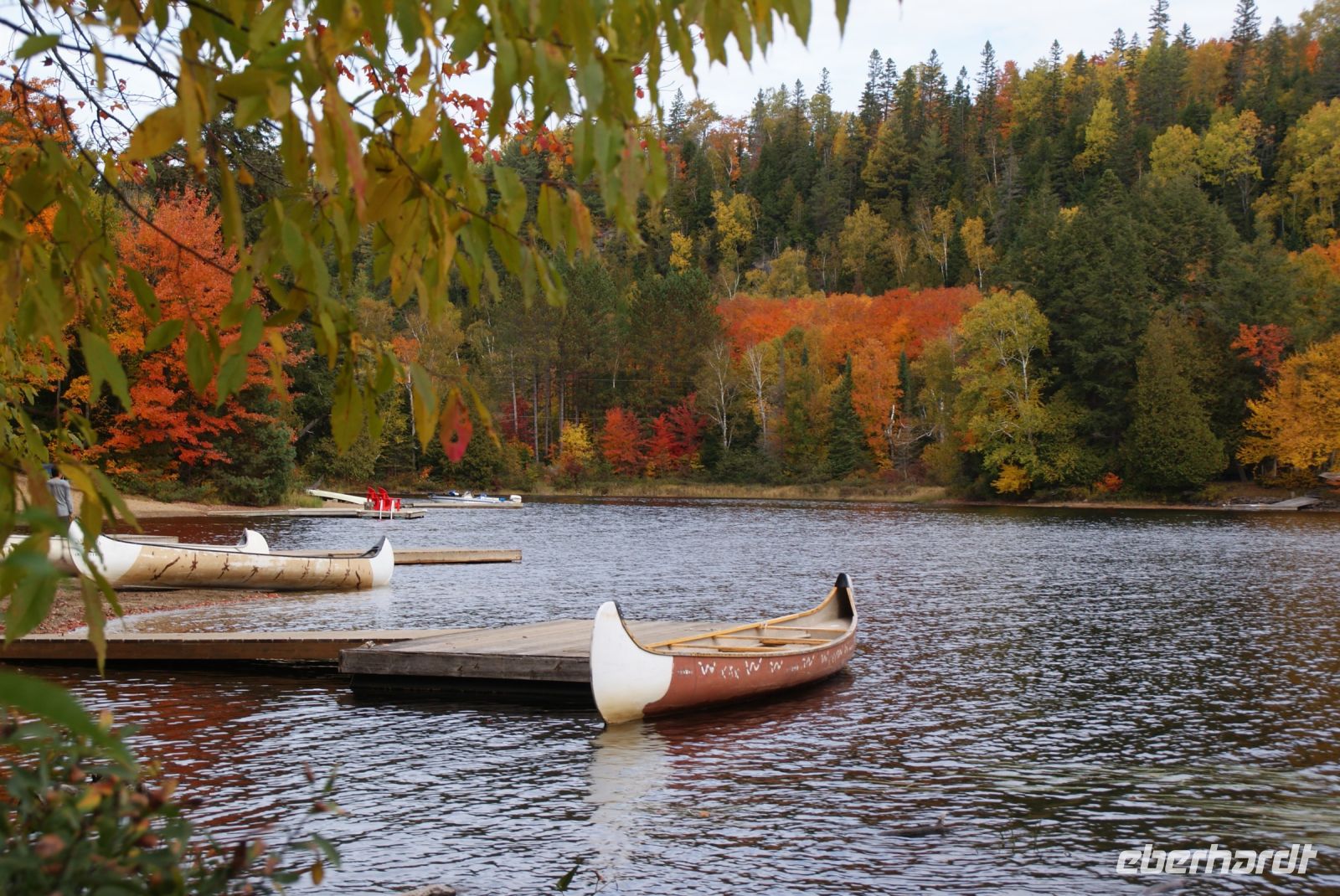 Der heutige Morgen führt uns zum Oxtongue Lake, auf dem wir eine Kanufahrt unternehmen. Aufgeteilt auf drei Boote und drei örtliche Guides paddeln wir um die Wette zunächst am See entlang und biegen später in einen Fluss ab, der uns zu einem Wasserfall führt. Uns umgibt erneut eine herrliche Herbstkulisse, es herrschen milde Temperaturen, die Sonne scheint und wir erleben einen wunderbar sportlichen Vormittag. So viel körperliche Bewegung macht uns hungrig, sodass wir nach Rückkehr unsere Lunchboxen am See genießen, Paul dazu noch einen mitgebrachten Gasgrill anwirft und zusätzlich noch Würstchen für uns brät. Welch ein Luxus, dazu die tolle Kulisse am See, schöne Sitzgelegenheiten und ein toller Mittagssnack umgeben von grandioser Natur, die wir uns nun bunter nicht mehr vorstellen können. Anschließend fahren wir in den Algonquin Park hinein, halten für diverse Fotostopps mit Prachtaufnahmen und unternehmen abschließend eine schöne Wanderung entlang des Spruce bog Boardwalk. Dies ist ein schöner 1,5 Km langer Rundweg, der uns am See entlang und durch den Wald führt. Wir begegnen handzahmen Meisen, die sich auf unsern Händen niederlassen, genauso wie etliche Streifenhörnchen, die ebenfalls recht zutraulich sind. Auf dem Rückweg halten wir nochmals am Canoe Lake, wo wir erneut eine tolle Fotokulisse vorfinden. Auch heute haben wir wieder einen Indian Summer Tag vom Feinsten erlebt, die Natur in vollen Zügen genossen, das alles bei milden Temperaturen und Sonnenschein-Petrus hat es sehr gut mit uns gemeint.