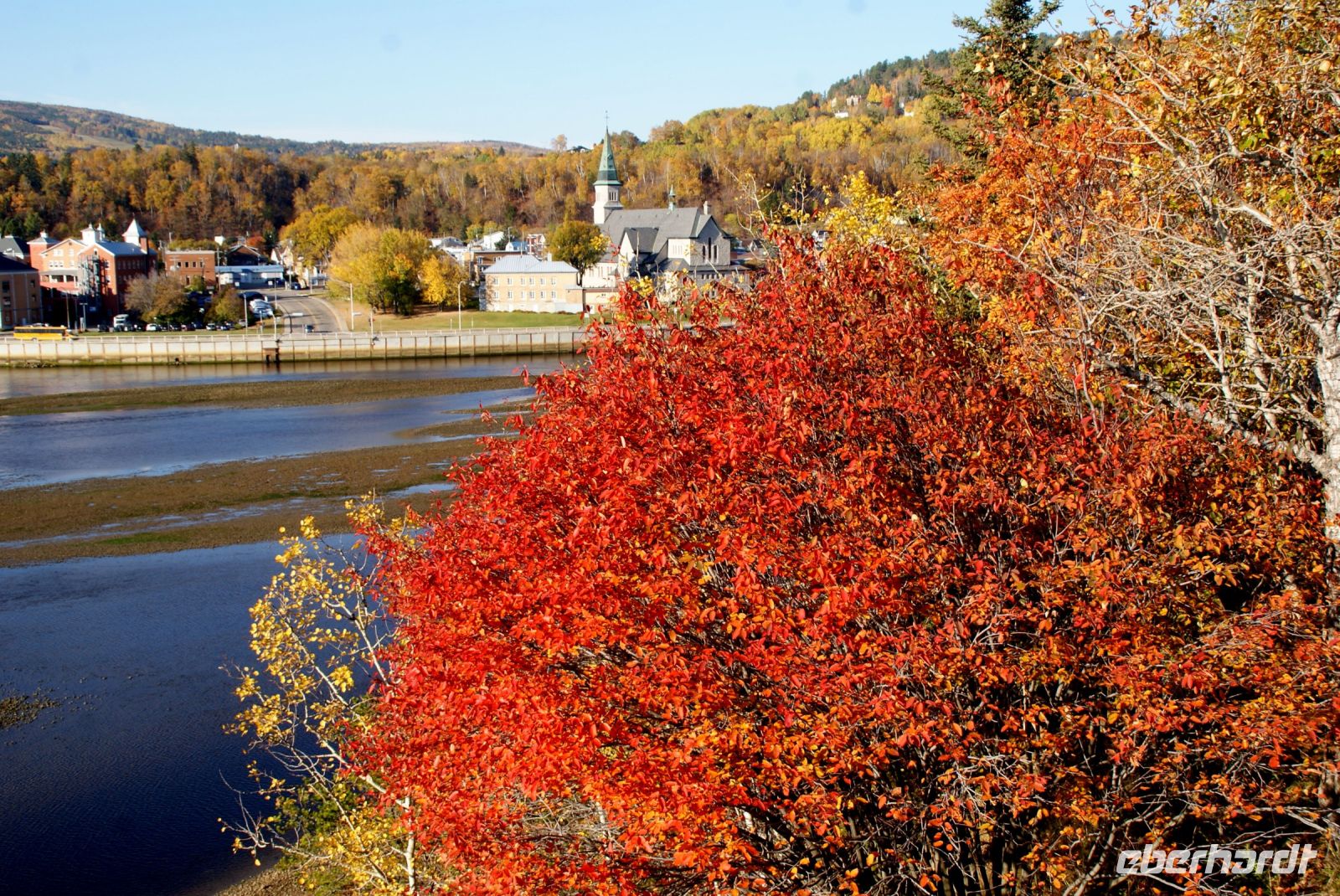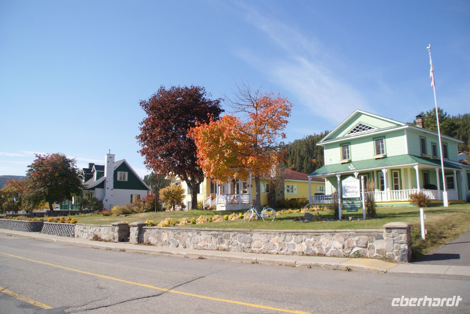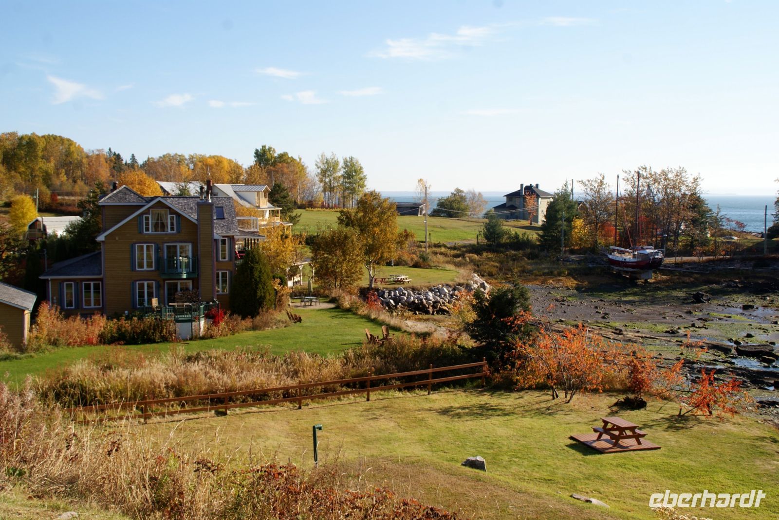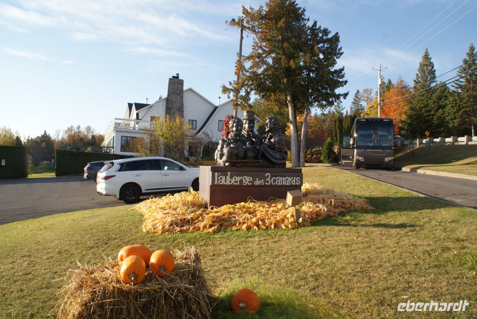 Auch zum Frühstück sind wir heute die einzigen Gäste und es erwacht wieder ein herrlicher Herbsttag. Die Sonne strahlt, die Bäume leuchten und wir könnten noch Tage hier in der schönen Unterkunft verbringen. Unser Programm führt uns heute entlang des St. Lorenz Stroms, dieser entspringt aus dem Ontario See und ist zwischen 30 und 130 Km breit. Unglaubliche Dimensionen, die vergessen lassen, dass es sich hier um einen Fluss handelt, der in den Atlantik fließt. Wir fahren die alte Königsstraße entlang, die sogenannte „Chemin du Roy“ und sehen malerische Ortschaften, von denen Paul berichtet, dass man sich bereits auf den herannahenden Winter vorbereitet. Da viele Kanadier die vermeintlichen Keller als weiteren Wohnraum nutzen, muss im Winter eine Alternative für die Gerätschaften geschaffen werden und so sieht man etliche stabile Zelte, die neben den Häusern errichtet werden. Zunächst führt uns die Reise vorbei an Quebec zu den Montmorency Wasserfällen, die mit 83 m Höhe nochmals 30 m höher als die Niagarafälle sind. Wir spazieren über die Hängebrücke und anschließend über etliche hölzerne Treppen wieder ins Tal hinab. Ein schöner Spaziergang, der uns die Wasserfälle aus den verschiedensten Perspektiven zeigt. Auf unserer Weiterfahrt zum Tagesziel La Malbaie passieren wir das Skigebiet Mount Anne, welches bereits auf 1000 m Höhe gelegen ist. Hier haben die Quebecer im Winter bereits innerhalb einer Stunde eine schöne Möglichkeit Skifahren zu gehen. Aktuell erweist sich uns jedoch der Indian Summer alle Ehre und so genießen wir einfach die herrliche Natur entlang unserer Strecke, die schöner und bunter nicht sein kann. Am frühen Abend erreichen wir unsere Unterkunft für die nächsten beiden Tage, die „Auberge de trois canard“, die Herberge der drei Enten und zum Tagesabschluss genießen wir ein köstliches Menü und lassen nochmals das Erlebte Revue passieren.