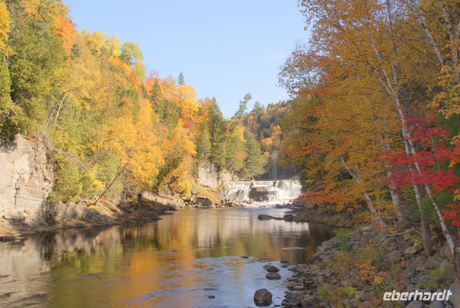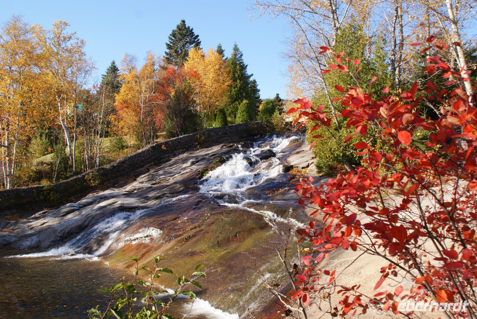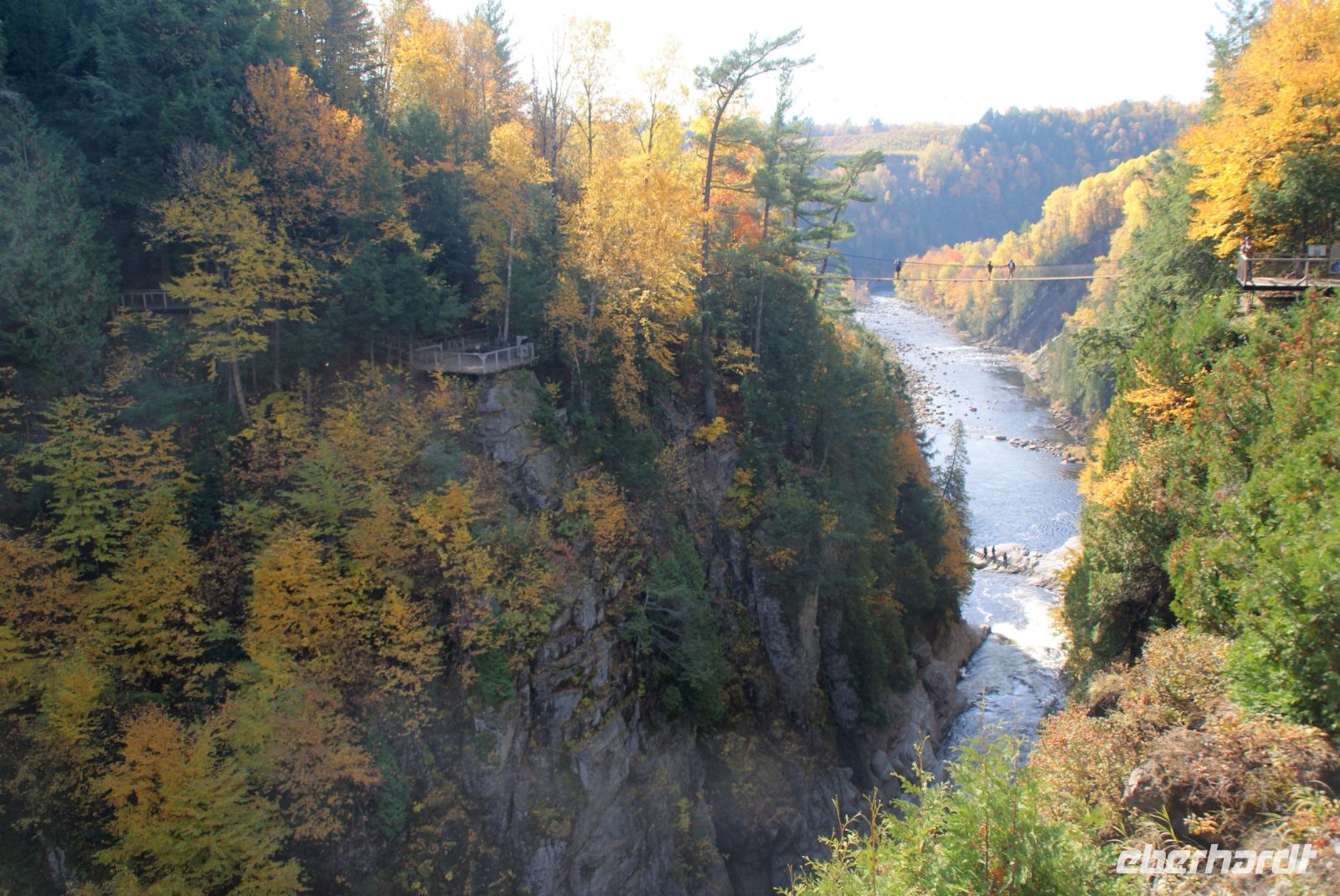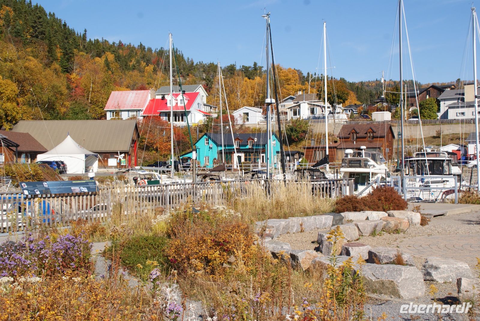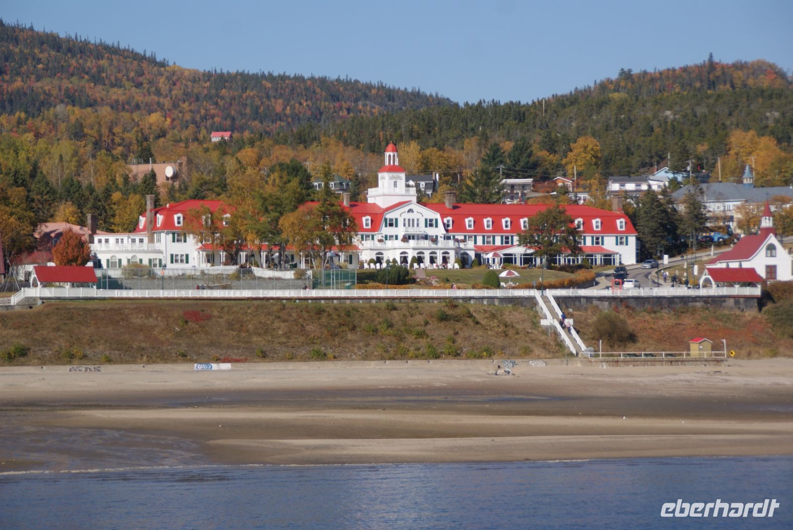 Auch zum Frühstück sind wir heute die einzigen Gäste und es erwacht wieder ein herrlicher Herbsttag. Die Sonne strahlt, die Bäume leuchten und wir könnten noch Tage hier in der schönen Unterkunft verbringen. Unser Programm führt uns heute entlang des St. Lorenz Stroms, dieser entspringt aus dem Ontario See und ist zwischen 30 und 130 Km breit. Unglaubliche Dimensionen, die vergessen lassen, dass es sich hier um einen Fluss handelt, der in den Atlantik fließt. Wir fahren die alte Königsstraße entlang, die sogenannte „Chemin du Roy“ und sehen malerische Ortschaften, von denen Paul berichtet, dass man sich bereits auf den herannahenden Winter vorbereitet. Da viele Kanadier die vermeintlichen Keller als weiteren Wohnraum nutzen, muss im Winter eine Alternative für die Gerätschaften geschaffen werden und so sieht man etliche stabile Zelte, die neben den Häusern errichtet werden. Zunächst führt uns die Reise vorbei an Quebec zu den Montmorency Wasserfällen, die mit 83 m Höhe nochmals 30 m höher als die Niagarafälle sind. Wir spazieren über die Hängebrücke und anschließend über etliche hölzerne Treppen wieder ins Tal hinab. Ein schöner Spaziergang, der uns die Wasserfälle aus den verschiedensten Perspektiven zeigt. Auf unserer Weiterfahrt zum Tagesziel La Malbaie passieren wir das Skigebiet Mount Anne, welches bereits auf 1000 m Höhe gelegen ist. Hier haben die Quebecer im Winter bereits innerhalb einer Stunde eine schöne Möglichkeit Skifahren zu gehen. Aktuell erweist sich uns jedoch der Indian Summer alle Ehre und so genießen wir einfach die herrliche Natur entlang unserer Strecke, die schöner und bunter nicht sein kann. Am frühen Abend erreichen wir unsere Unterkunft für die nächsten beiden Tage, die „Auberge de trois canard“, die Herberge der drei Enten und zum Tagesabschluss genießen wir ein köstliches Menü und lassen nochmals das Erlebte Revue passieren.