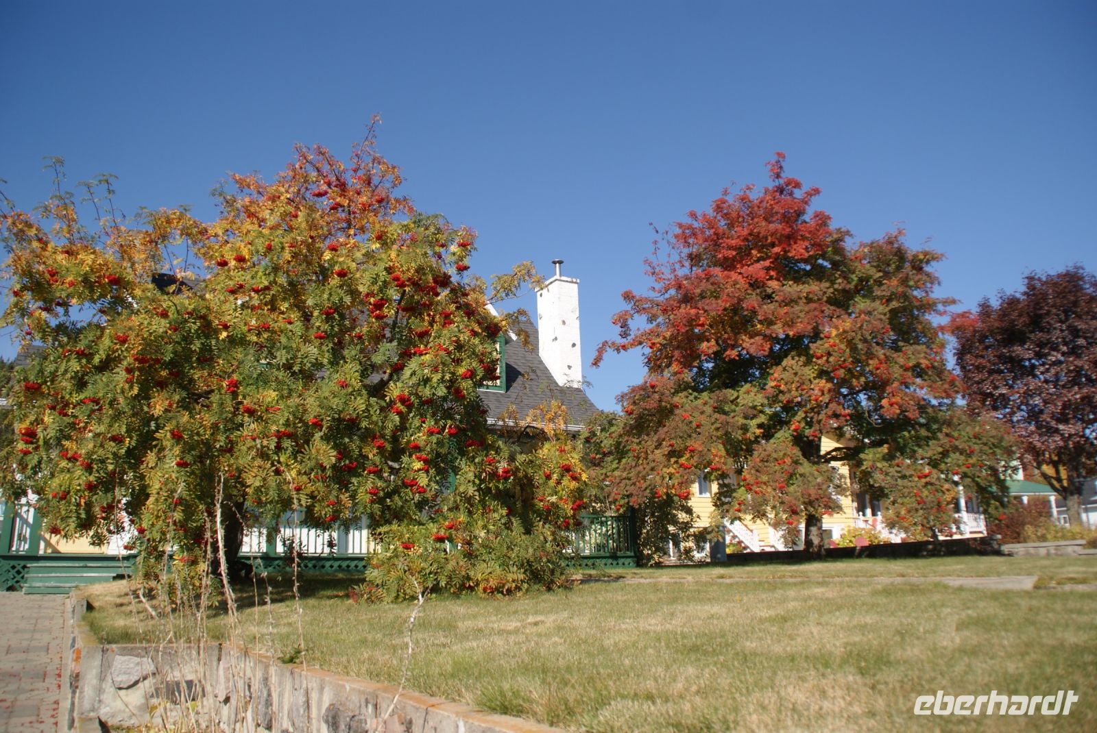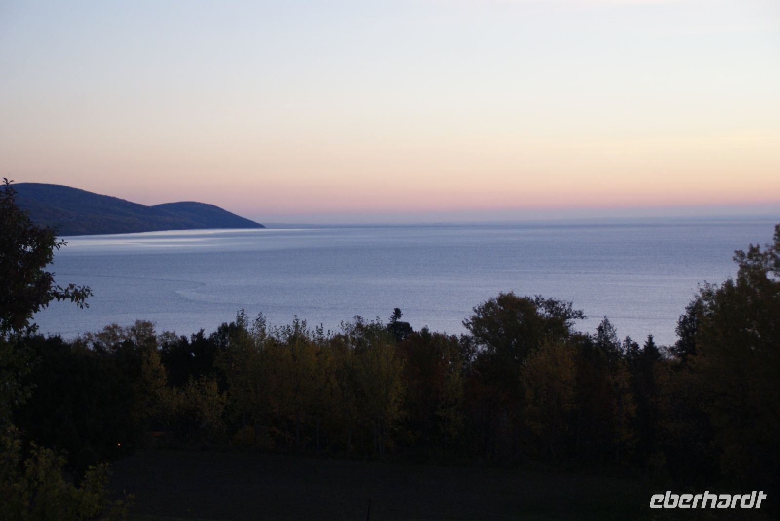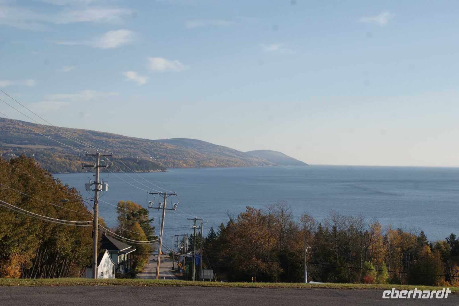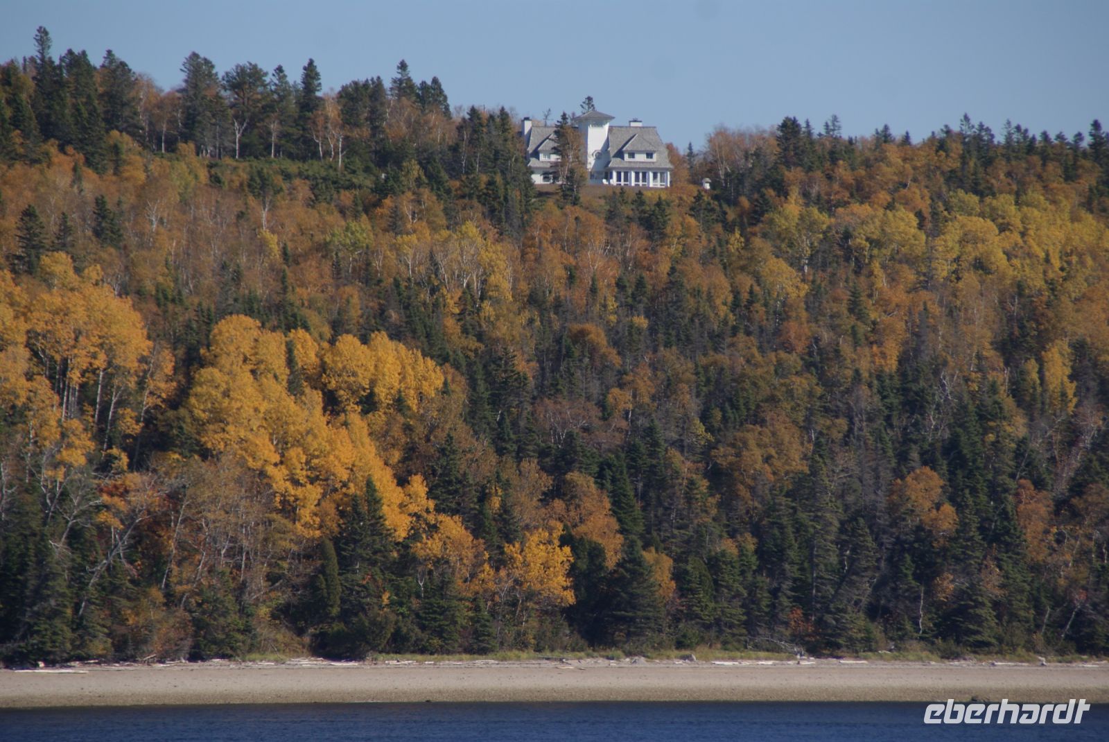 Auch zum Frühstück sind wir heute die einzigen Gäste und es erwacht wieder ein herrlicher Herbsttag. Die Sonne strahlt, die Bäume leuchten und wir könnten noch Tage hier in der schönen Unterkunft verbringen. Unser Programm führt uns heute entlang des St. Lorenz Stroms, dieser entspringt aus dem Ontario See und ist zwischen 30 und 130 Km breit. Unglaubliche Dimensionen, die vergessen lassen, dass es sich hier um einen Fluss handelt, der in den Atlantik fließt. Wir fahren die alte Königsstraße entlang, die sogenannte „Chemin du Roy“ und sehen malerische Ortschaften, von denen Paul berichtet, dass man sich bereits auf den herannahenden Winter vorbereitet. Da viele Kanadier die vermeintlichen Keller als weiteren Wohnraum nutzen, muss im Winter eine Alternative für die Gerätschaften geschaffen werden und so sieht man etliche stabile Zelte, die neben den Häusern errichtet werden. Zunächst führt uns die Reise vorbei an Quebec zu den Montmorency Wasserfällen, die mit 83 m Höhe nochmals 30 m höher als die Niagarafälle sind. Wir spazieren über die Hängebrücke und anschließend über etliche hölzerne Treppen wieder ins Tal hinab. Ein schöner Spaziergang, der uns die Wasserfälle aus den verschiedensten Perspektiven zeigt. Auf unserer Weiterfahrt zum Tagesziel La Malbaie passieren wir das Skigebiet Mount Anne, welches bereits auf 1000 m Höhe gelegen ist. Hier haben die Quebecer im Winter bereits innerhalb einer Stunde eine schöne Möglichkeit Skifahren zu gehen. Aktuell erweist sich uns jedoch der Indian Summer alle Ehre und so genießen wir einfach die herrliche Natur entlang unserer Strecke, die schöner und bunter nicht sein kann. Am frühen Abend erreichen wir unsere Unterkunft für die nächsten beiden Tage, die „Auberge de trois canard“, die Herberge der drei Enten und zum Tagesabschluss genießen wir ein köstliches Menü und lassen nochmals das Erlebte Revue passieren.