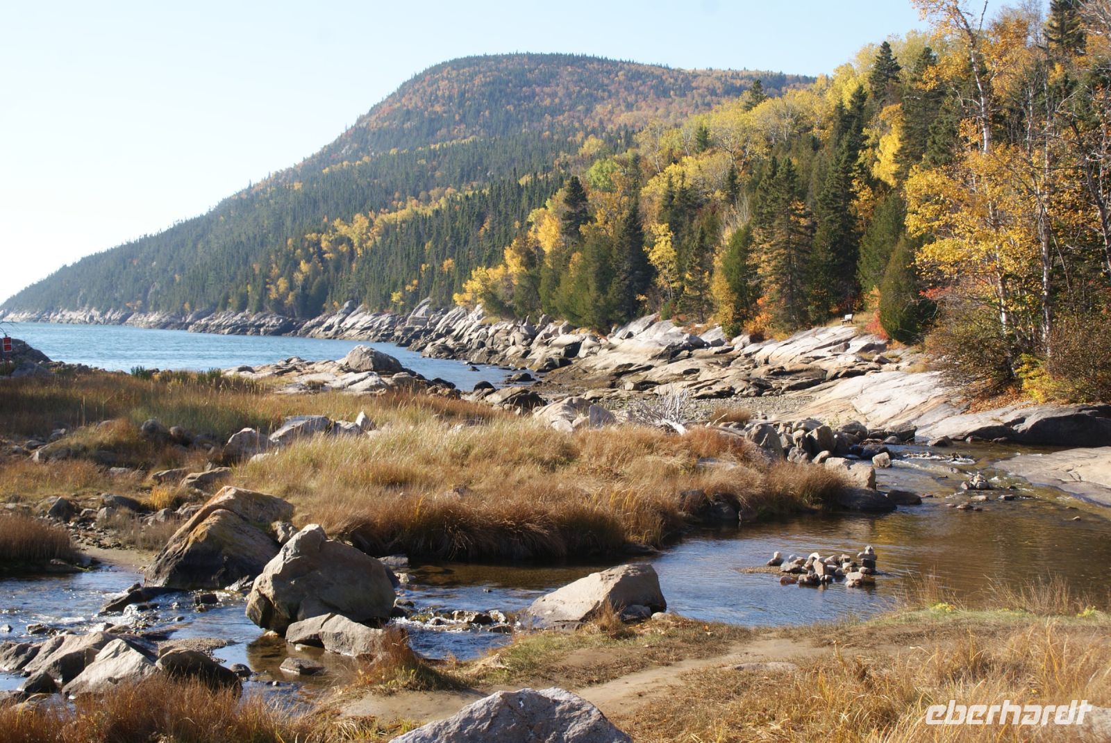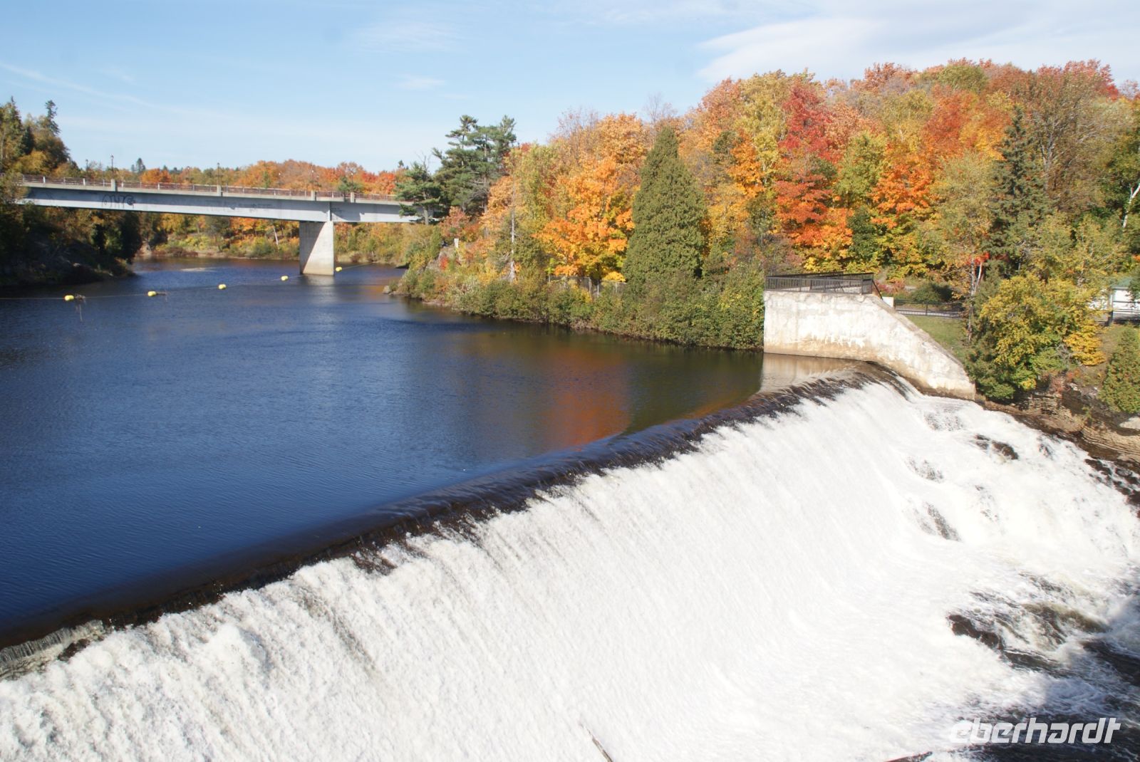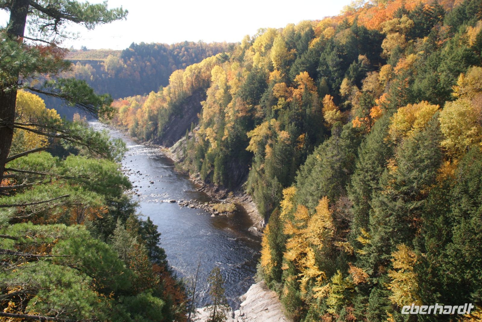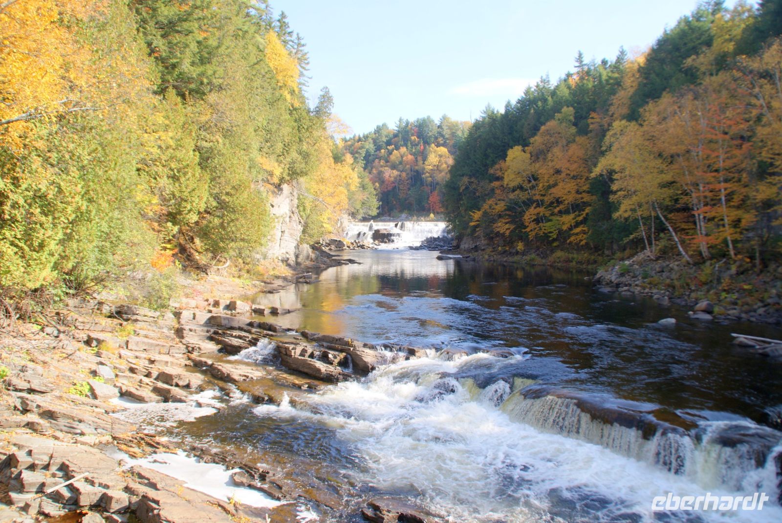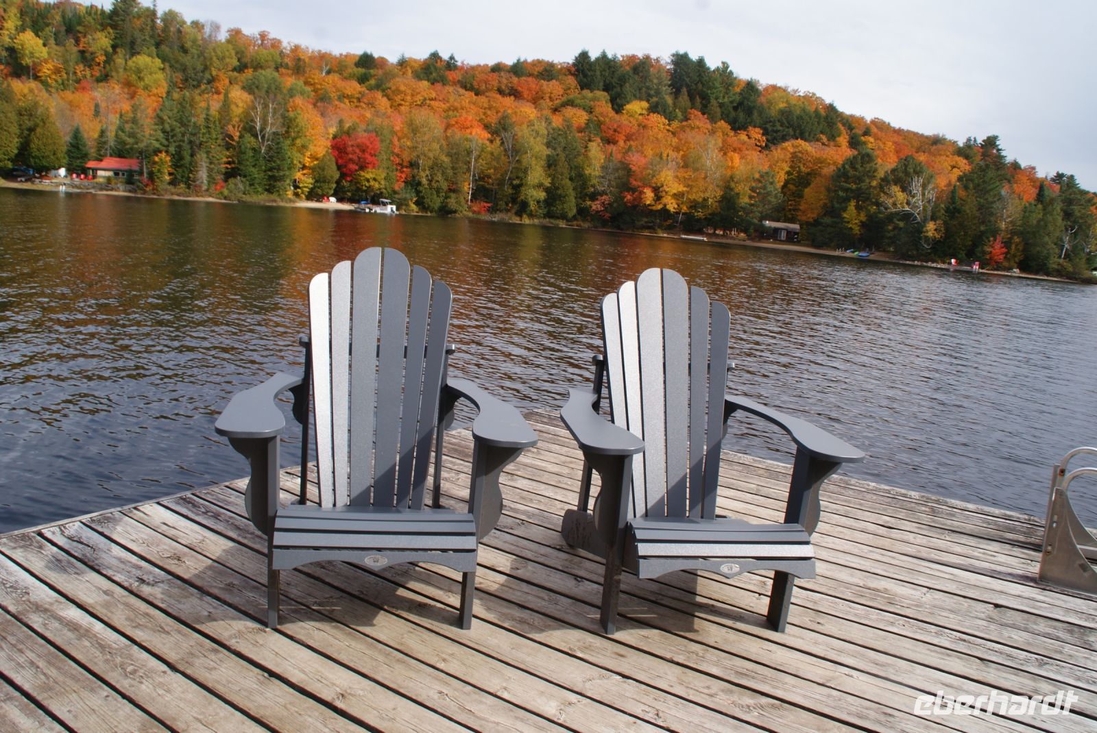 Auch zum Frühstück sind wir heute die einzigen Gäste und es erwacht wieder ein herrlicher Herbsttag. Die Sonne strahlt, die Bäume leuchten und wir könnten noch Tage hier in der schönen Unterkunft verbringen. Unser Programm führt uns heute entlang des St. Lorenz Stroms, dieser entspringt aus dem Ontario See und ist zwischen 30 und 130 Km breit. Unglaubliche Dimensionen, die vergessen lassen, dass es sich hier um einen Fluss handelt, der in den Atlantik fließt. Wir fahren die alte Königsstraße entlang, die sogenannte „Chemin du Roy“ und sehen malerische Ortschaften, von denen Paul berichtet, dass man sich bereits auf den herannahenden Winter vorbereitet. Da viele Kanadier die vermeintlichen Keller als weiteren Wohnraum nutzen, muss im Winter eine Alternative für die Gerätschaften geschaffen werden und so sieht man etliche stabile Zelte, die neben den Häusern errichtet werden. Zunächst führt uns die Reise vorbei an Quebec zu den Montmorency Wasserfällen, die mit 83 m Höhe nochmals 30 m höher als die Niagarafälle sind. Wir spazieren über die Hängebrücke und anschließend über etliche hölzerne Treppen wieder ins Tal hinab. Ein schöner Spaziergang, der uns die Wasserfälle aus den verschiedensten Perspektiven zeigt. Auf unserer Weiterfahrt zum Tagesziel La Malbaie passieren wir das Skigebiet Mount Anne, welches bereits auf 1000 m Höhe gelegen ist. Hier haben die Quebecer im Winter bereits innerhalb einer Stunde eine schöne Möglichkeit Skifahren zu gehen. Aktuell erweist sich uns jedoch der Indian Summer alle Ehre und so genießen wir einfach die herrliche Natur entlang unserer Strecke, die schöner und bunter nicht sein kann. Am frühen Abend erreichen wir unsere Unterkunft für die nächsten beiden Tage, die „Auberge de trois canard“, die Herberge der drei Enten und zum Tagesabschluss genießen wir ein köstliches Menü und lassen nochmals das Erlebte Revue passieren.
