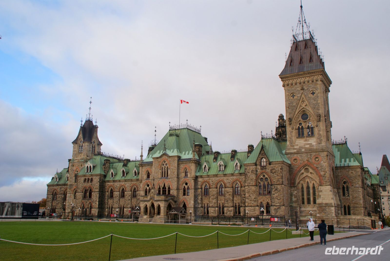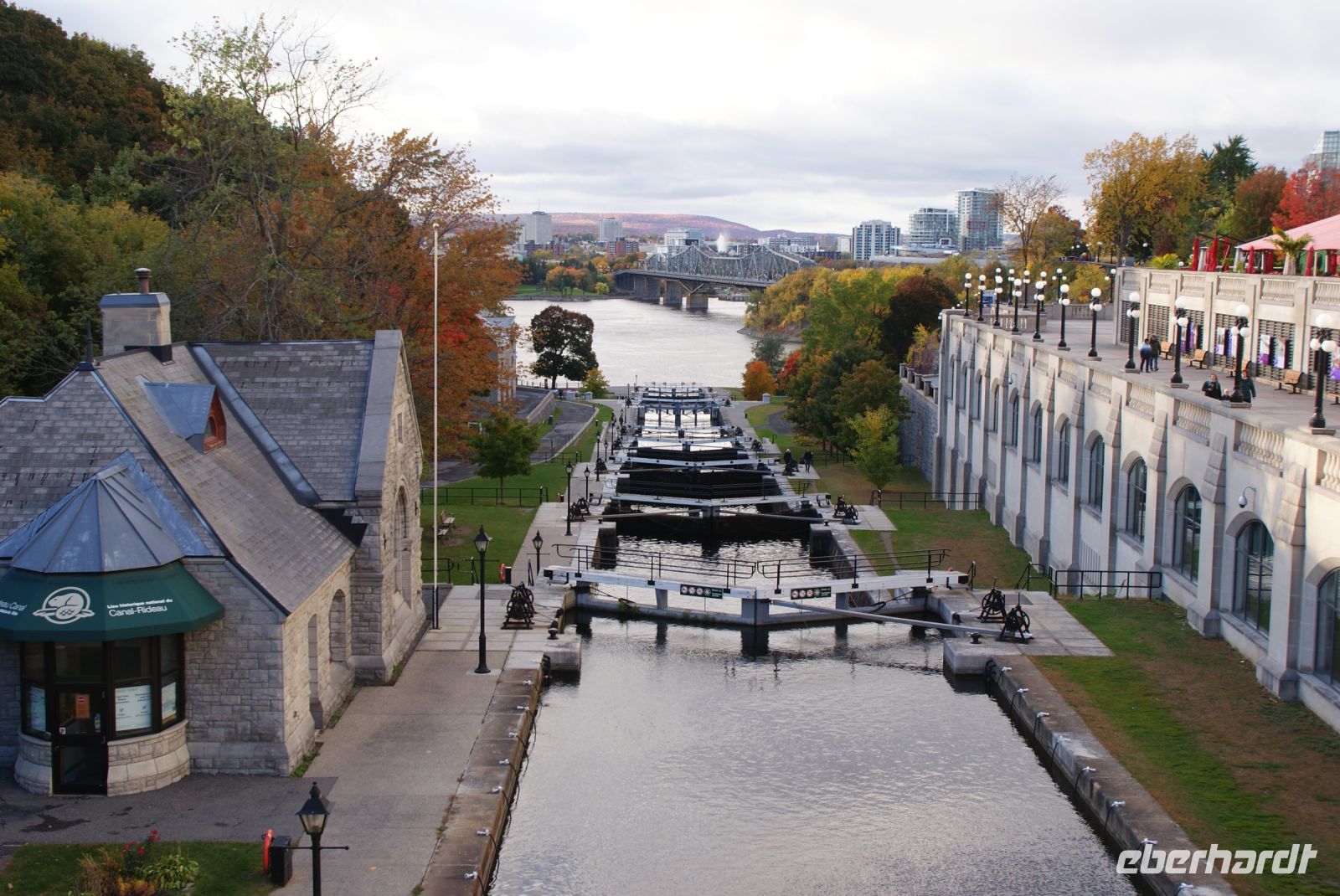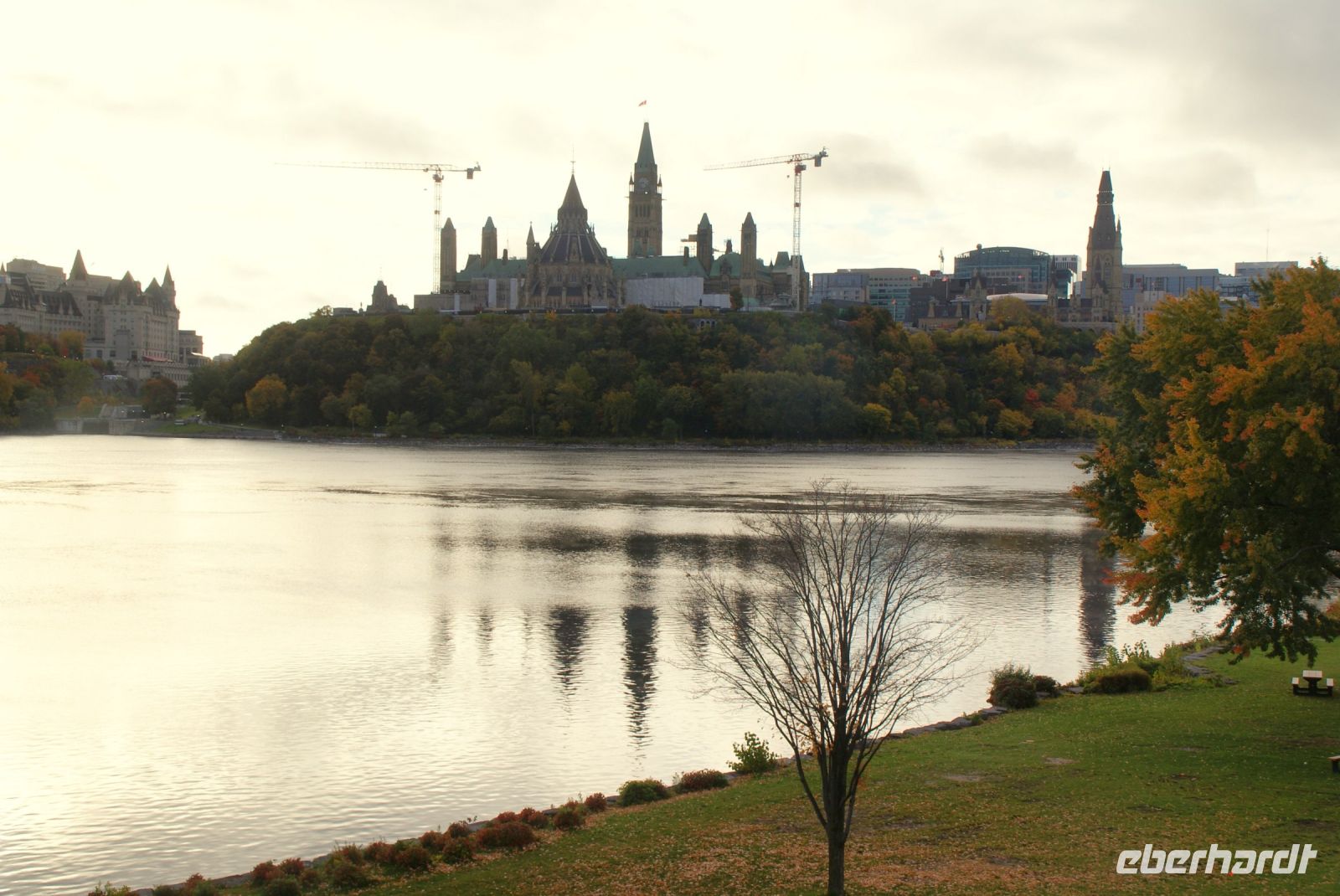 Ein deutlicher Temperatursturz hat uns erwischt und mit knapp 8 Grad verlassen wir das Hidden Valley Resort mit Ziel zunächst den Algonquin Park zu besuchen. Am Visitor Center angekommen, besuchen wir das schöne Museum mit beeindruckenden Exponaten der kanadischen Tierwelt, die hier sehr stilvoll präpariert und in Szene gesetzt wurden. Ein anschließender Spaziergang erfolgt durch das Logging Museum, welches einem Freilichtmuseum gleicht. Anschaulich wird hier dargestellt, wie die einstige Holzproduktion funktionierte, mit welchen Mitteln gearbeitet und wie gelebt wurde. Nachmittags erreichen wir die Hauptstadt Kanadas Ottawa, welche mit 1,2 Millionen Einwohnern doch eher wie eine Kleinstadt auf uns wirkt. Einst wurde diese als sicherste Stadt Kanadas befunden, da sich die doch deutlich größeren Städte zu nah an der amerikanischen Grenze befanden. Wir hören, dass der Name Ottawa aus der indigenen Sprache abgeleitet „Handelsstelle“ bedeutet und somit auf den einstigen Pelzhandel hinweist. Der Rideau Kanal, der die Stadt umfasst, ist 8 km lang und im Winter, die wohl längste Schlittschuhbahn der Welt. Am sogenannten Gazebo halten wir für einen Blick auf und über den Ottawa Fluss, auf dessen anderem Ufer sich die Stadt Gatineau befindet, die nun schon in der Provinz Quebec liegt. Diese Provinz ist viermal so groß wie Deutschland, einfach unfassbar für unsere Verhältnisse! Unsere Stadttour führt uns zum Rockcliff, dem sogenannten „Beverly Hills“ Ottawas, am Haus des Gouverneur-Generals spazieren wir durch dessen Park und sehen die vielen Bäume mit Inschriften berühmter Staatsmänner, die bei deren Besuch einst einen der Bäume pflanzten. Vorbei am Außenministerium, dem Botschaftsviertel, dem Regierungsgebäude und der Kunstgalerie mit überdimensionaler Spinne davor, gelangen wir zum Parliament Hill, den Rideau Schleusen und schließlich zum Byward Market mit seiner quirligen Markthalle. Abends speisen wir feudal im Hilton Hotel und checken anschließend in unser zentral gelegenes Hotel ein.
