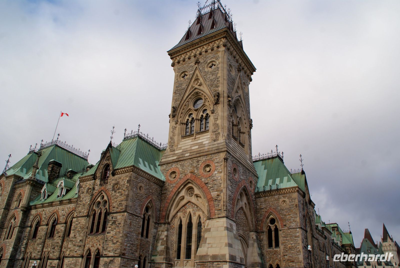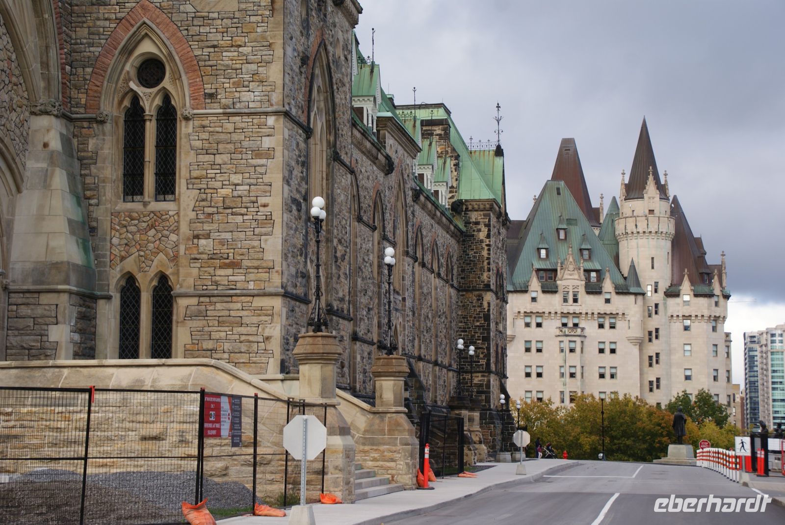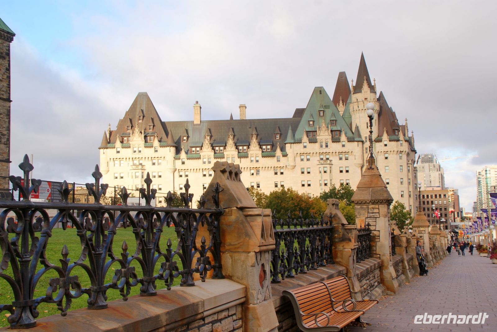 Ein deutlicher Temperatursturz hat uns erwischt und mit knapp 8 Grad verlassen wir das Hidden Valley Resort mit Ziel zunächst den Algonquin Park zu besuchen. Am Visitor Center angekommen, besuchen wir das schöne Museum mit beeindruckenden Exponaten der kanadischen Tierwelt, die hier sehr stilvoll präpariert und in Szene gesetzt wurden. Ein anschließender Spaziergang erfolgt durch das Logging Museum, welches einem Freilichtmuseum gleicht. Anschaulich wird hier dargestellt, wie die einstige Holzproduktion funktionierte, mit welchen Mitteln gearbeitet und wie gelebt wurde. Nachmittags erreichen wir die Hauptstadt Kanadas Ottawa, welche mit 1,2 Millionen Einwohnern doch eher wie eine Kleinstadt auf uns wirkt. Einst wurde diese als sicherste Stadt Kanadas befunden, da sich die doch deutlich größeren Städte zu nah an der amerikanischen Grenze befanden. Wir hören, dass der Name Ottawa aus der indigenen Sprache abgeleitet „Handelsstelle“ bedeutet und somit auf den einstigen Pelzhandel hinweist. Der Rideau Kanal, der die Stadt umfasst, ist 8 km lang und im Winter, die wohl längste Schlittschuhbahn der Welt. Am sogenannten Gazebo halten wir für einen Blick auf und über den Ottawa Fluss, auf dessen anderem Ufer sich die Stadt Gatineau befindet, die nun schon in der Provinz Quebec liegt. Diese Provinz ist viermal so groß wie Deutschland, einfach unfassbar für unsere Verhältnisse! Unsere Stadttour führt uns zum Rockcliff, dem sogenannten „Beverly Hills“ Ottawas, am Haus des Gouverneur-Generals spazieren wir durch dessen Park und sehen die vielen Bäume mit Inschriften berühmter Staatsmänner, die bei deren Besuch einst einen der Bäume pflanzten. Vorbei am Außenministerium, dem Botschaftsviertel, dem Regierungsgebäude und der Kunstgalerie mit überdimensionaler Spinne davor, gelangen wir zum Parliament Hill, den Rideau Schleusen und schließlich zum Byward Market mit seiner quirligen Markthalle. Abends speisen wir feudal im Hilton Hotel und checken anschließend in unser zentral gelegenes Hotel ein.