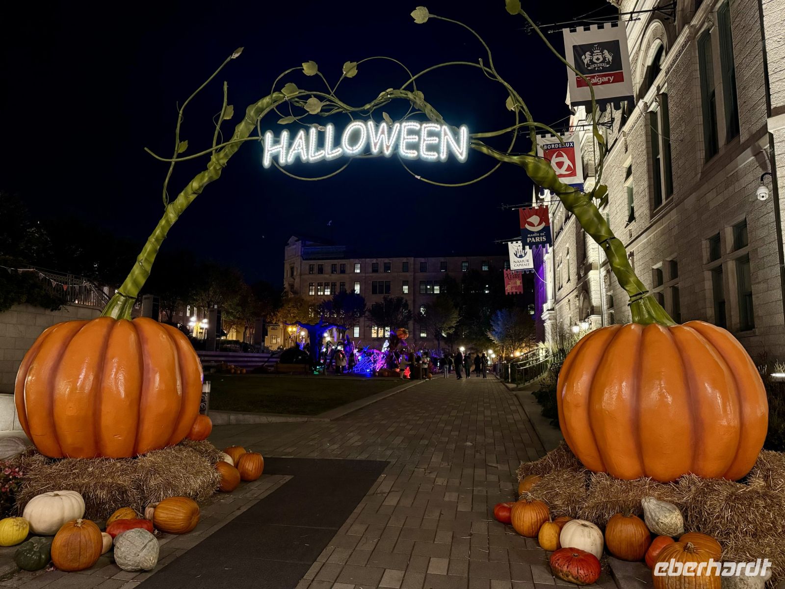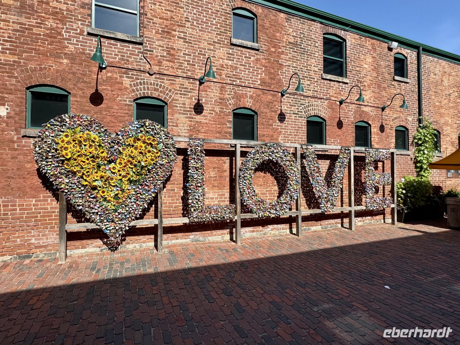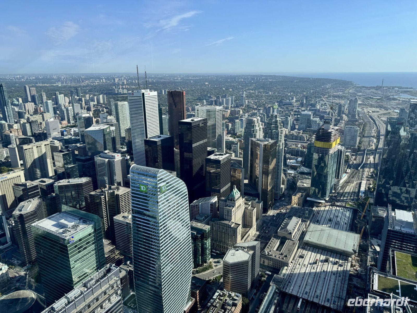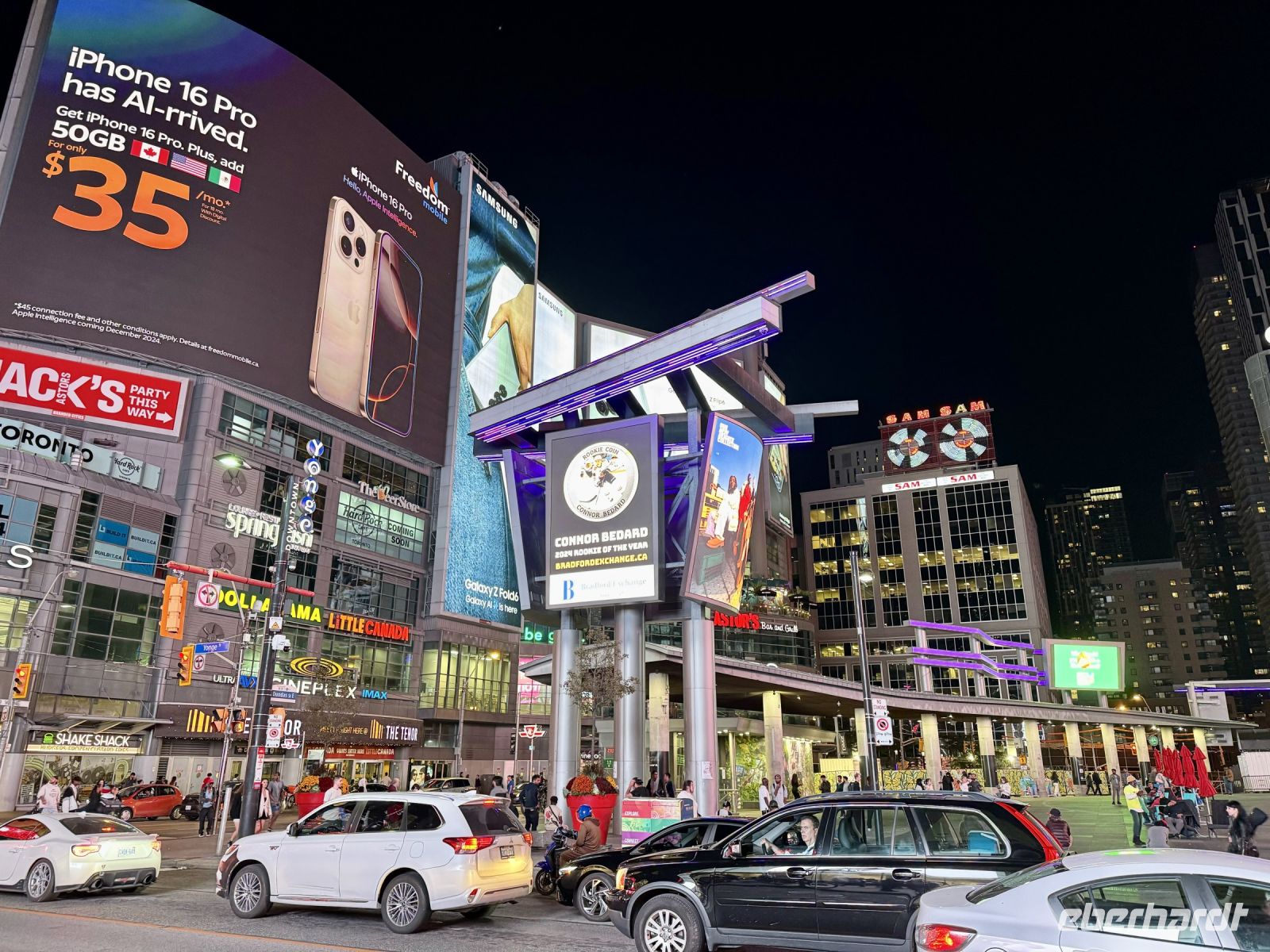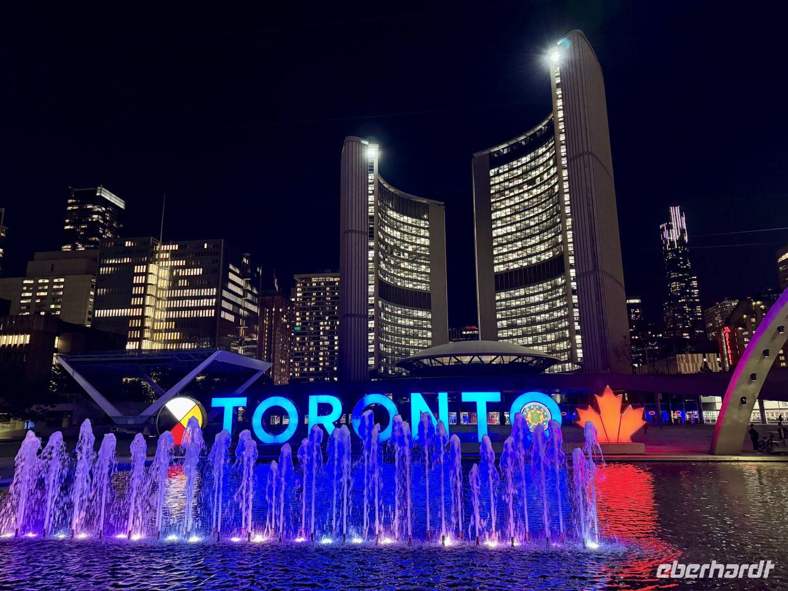 Viele meiner Reisegäste reisen schon am Tag zuvor nach Frankfurt an — das Vertrauen in die DB scheint auf einem Tiefpunkt zu sein. Mein ICE von Leipzig nach Frankfurt ist am frühen Morgen wider Erwarten fast pünktlich, zum Feiertag jedoch sehr voll. Und auch auf dem Frankfurter Flughafen herrscht reger Betrieb. Trotzdem gelangen wir erstaunlich schnell durch Kofferabgabe, Sicherheitskontrolle und Passkontrolle durch und haben noch Zeit für einen Kaffee oder sogar ein zeitiges Mittagessen. Auch meine Gäste, die schon per Zubringerflug von Dresden bzw. Hamburg anreisen, kommen alle gut ans Zwischenziel. Dann heißt es: Einsteigen bitte, Ihr Flug nach Toronto ist bereit zum Boarding. Die Crew ist zum Glück weniger antiquiert als die Boeing 747-400 der Lufthansa, aber ebenso routiniert und zuverlässig. Die Beinfreiheit ist gut und das Entertainment funktioniert. Ab und zu ruckelt es ein bisschen, vor allem über dem Atlantik und kurz vor der Landung. Insgesamt ein sehr ruhiger und ereignisloser Flug — was ja positiv zu werten ist. Mit nur 10 Minuten Verspätung setzt der Copilot die Maschine butterweich auf kanadischem Boden auf. Es erwarten uns Sonnenschein und angenehme Temperaturen von über 20 Grad. Ein Vorgeschmack auf einen schönen „Indian Summer“? Durch die Einreisekontrollen kommen wir ebenfalls wieder schnell hindurch, auch unsere Koffer sind alle mitgekommen. Nur unseren Busfahrer Jason finden wir dank einer falsch übermittelten Telefonnummer erst mit etwas Verzögerung. Er wiederum hat die ganze Zeit auf uns gewartet und begrüßt uns freundlich und gut gelaunt. Typisch kanadisch eben. Die Fahrt zum Hotel mitten in der Downtown von Toronto dauert heute auch nur rund 40 Minuten. Unterwegs sehen wir schon den Ontariosee und bekommen einen ersten Eindruck von der sehr modernen Metropole mit vielen Hochhäusern. Wir sehen auch schon die Union Station, das Finanzzentrum sowie das alte und neue Rathaus — beinahe schon eine kleine Stadtrundfahrt. Fast alle Gäste kommen auch noch mit auf einen kleinen Abendspaziergang zum Dundas Square und zum Rathaus (quer durch das Eaton Centre). An Toronto muss man sich immer erst einmal gewöhnen, an die vielen Menschen, an den Verkehr, an die Häuserschluchten. Der Vergleich mit New York drängt sich förmlich auf. Inzwischen ist es dunkel geworden und die vielen großen Leuchtreklamen am Dundas Square erhellen die Nacht. Er gilt entsprechend auch als kanadisches Gegenstück zum Times Square. Im Einkaufszentrum ist es schon wieder ruhiger und auch an den beiden Rathäusern ist nicht viel los, sodass wir zum Abschluss des langen Anreisetages schöne Fotos mit dem beleuchteten Toronto-Schriftzug machen können.