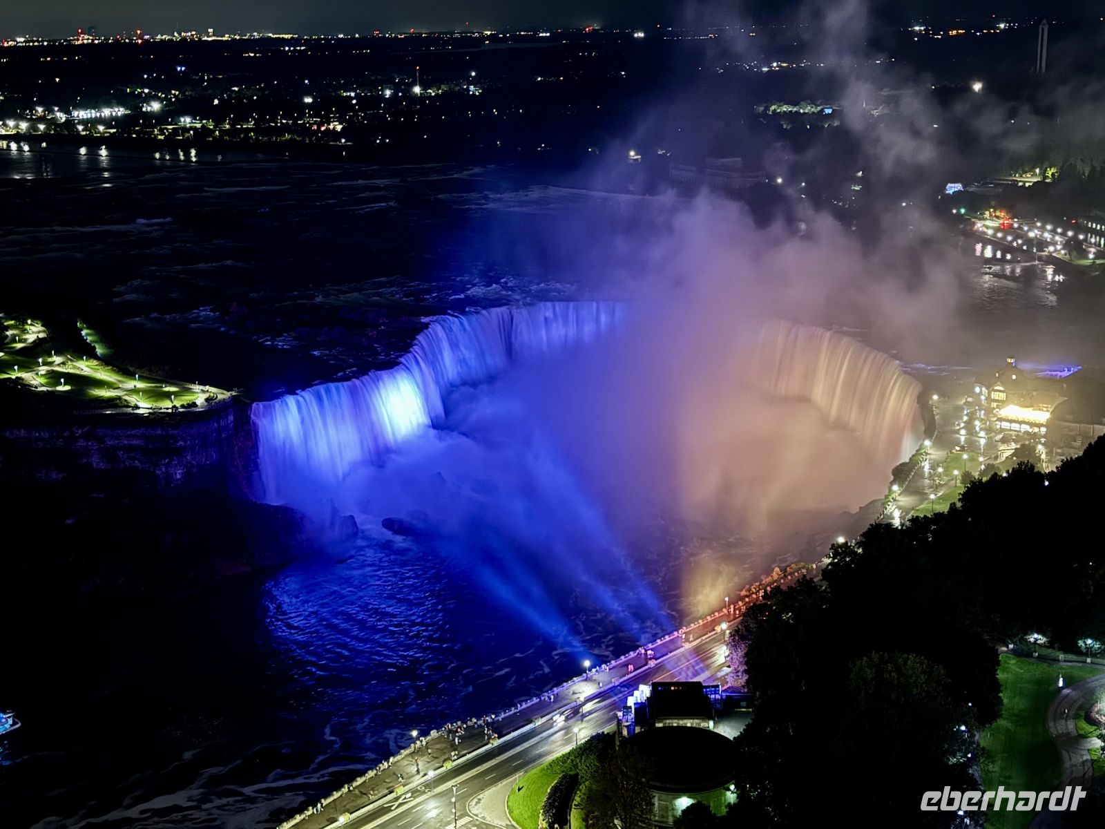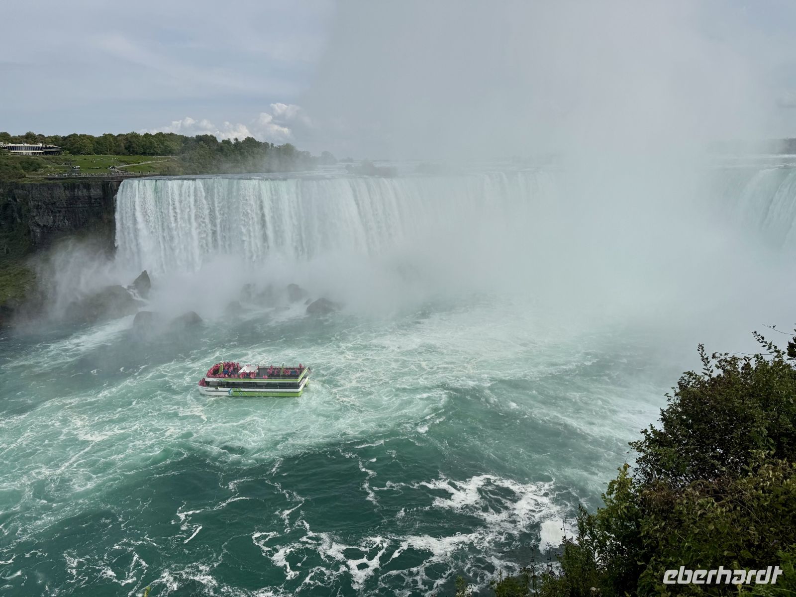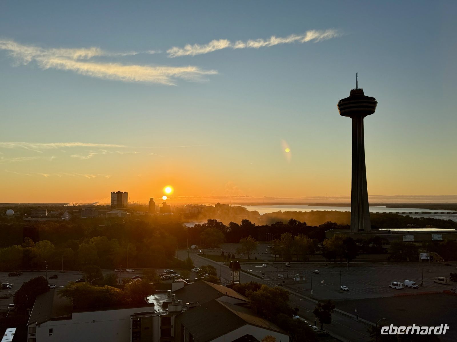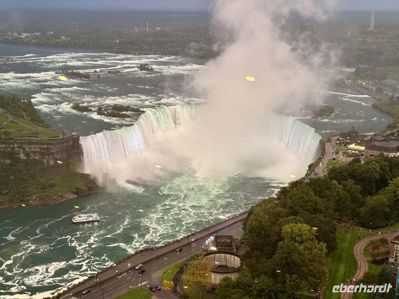 Die erste Nacht in Kanada liegt hinter uns, das erste Frühstück überzeugt mit einer großen Auswahl. Ausgeruht und gestärkt starten wir zur Stadtrundfahrt durch Toronto, was, ähnlich wie später in Montréal, auch immer eine Baustellenrundfahrt ist. Unglaublich, wie schnell sich in Nordamerika eine Stadt verändert, ja regelrecht umgekrempelt wird. Wir werfen nochmals bei Tageslicht einen Blick auf das Rathaus, fahren dann an der Konzerthalle vorbei und durchqueren Chinatown. Um das Parlament von Ontario drehen wir eine Ehrenrunde und steuern nun den CN Tower an. Meine Wetterengel sorgen für perfekte Bedingungen bei der raschen Auffahrt zu beiden Aussichtsplattformen. Im Süden die Toronto Islands und der Ontariosee, im Norden das Stadtzentrum – ein toller Blick in jede Richtung. Wir saugen alles auf und treffen uns begeistert wieder bei Jason am Bus. Er fährt uns erneut ein Stück durch Chinatown, bevor wir zum Dundas Square abbiegen und zum Distillery District weiterfahren. Hier machen wir nochmals eine längere Pause, kaufen uns eine Kleinigkeit zum Mittagessen und stürmen fast geschlossen die Schokoladenfabrik. Warme Temperaturen, blauer Himmel und köstliches Eis — da kommt sofort Urlaubsfeeling auf. Wir kehren zum Bus zurück und nehmen nun langsam Abschied von Toronto. Während Jason den Bus aus der Stadt hinausschlängelt, passieren wir den St Lawrence Market und das Gooderham Building sowie mit dem Fort York den Ursprung der heutigen Metropole. Die anschließende Fahrt in die Niagara-Region führt durch das Goldene Hufeisen in landwirtschaftlich geprägte Gegenden, in denen der Obst- und Weinanbau dominiert. Am sog. Whirlpool treffen wir erstmals auf den Niagara River und folgen ihm flussaufwärts zu den berühmten Wasserfällen. Beim Fotostopp am Table Rock bekommen wir einen guten ersten Eindruck und werden von der aufspritzenden Gischt auch schon ein bisschen nass. Noch feucht-fröhlicher geht es anschließend bei unserer Bootsfahrt zu den Niagarafällen zu. Unsere roten Regencapes schützen wenigstens den Oberkörper, als das Schiff ganz dicht an die Horseshoe Falls heranfährt, bis sich außer weißer Gischt eigentlich nichts mehr ringsum erkennen lässt. Da wird die Kraft der Wassermassen wirklich spürbar. Das war aufregend! Und bis hierhin auch schon ein ereignisreicher zweiter Tag in Kanada. Der Jetlag holt uns langsam ein, weshalb wir das Hotel ansteuern, um uns für ein Weilchen zurückzuziehen. Jason hat freundlicherweise schon die Zimmerkarten und Begrüßungskekse besorgt. Nach der Erholungspause treffen wir uns in der Lobby wieder und begeben uns zu unserem Abendessen auf dem Skylon Tower. Tatsächlich hat überraschenderweise ein leichter Regen eingesetzt, der jedoch im Laufe des Abends wieder endet. Die Aussicht vom Turm auf die Wasserfälle ist natürlich toll. Wir sind auch pünktlich zum Sonnenuntergang eingetroffen. Nach dem leckeren Essen ist vor dem nächsten Höhepunkt: Später am Abend gibt es nämlich noch ein kleines Feuerwerk über den Niagarafällen.