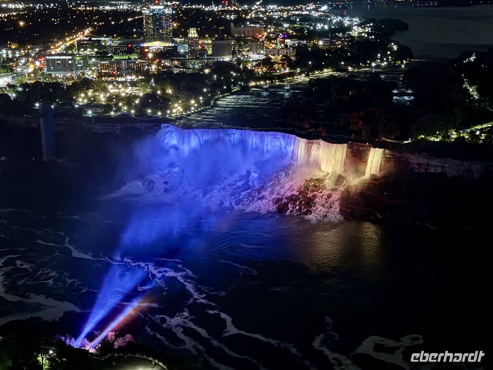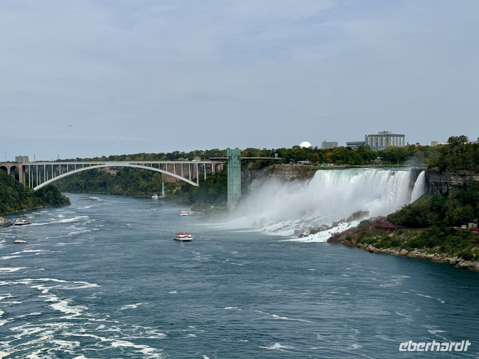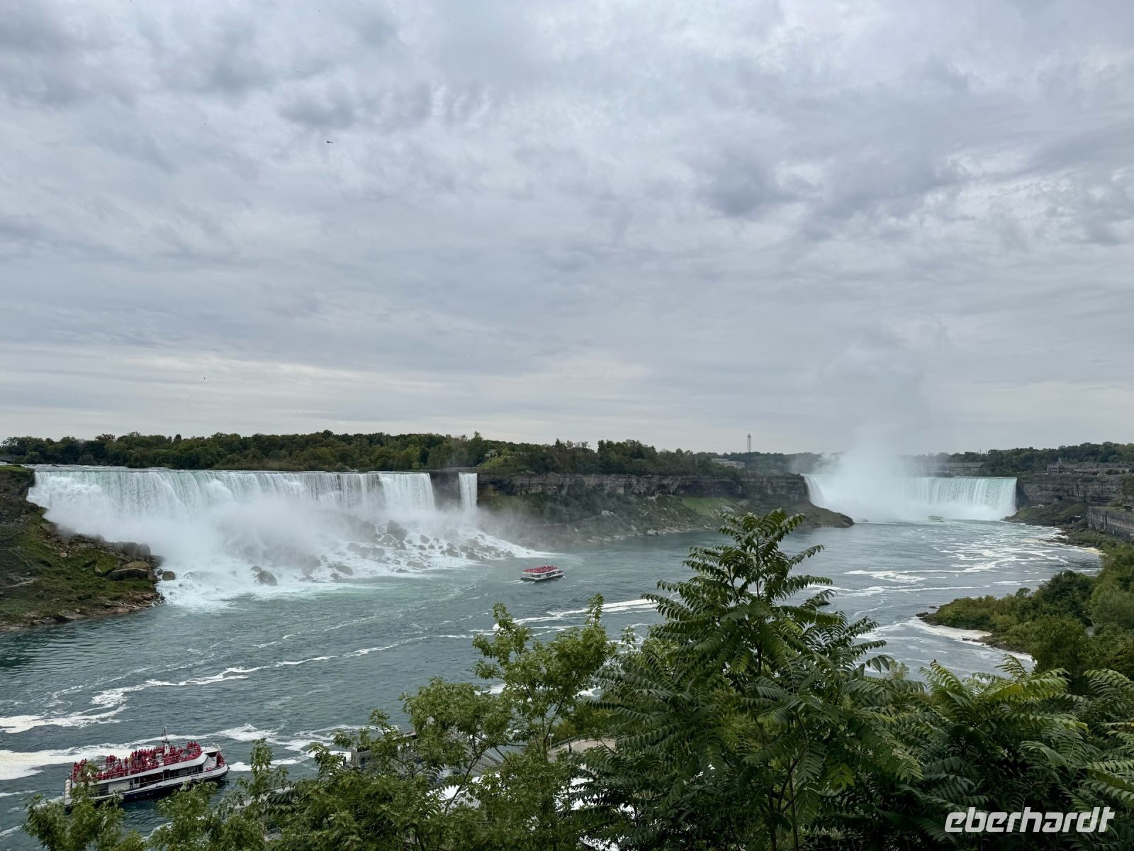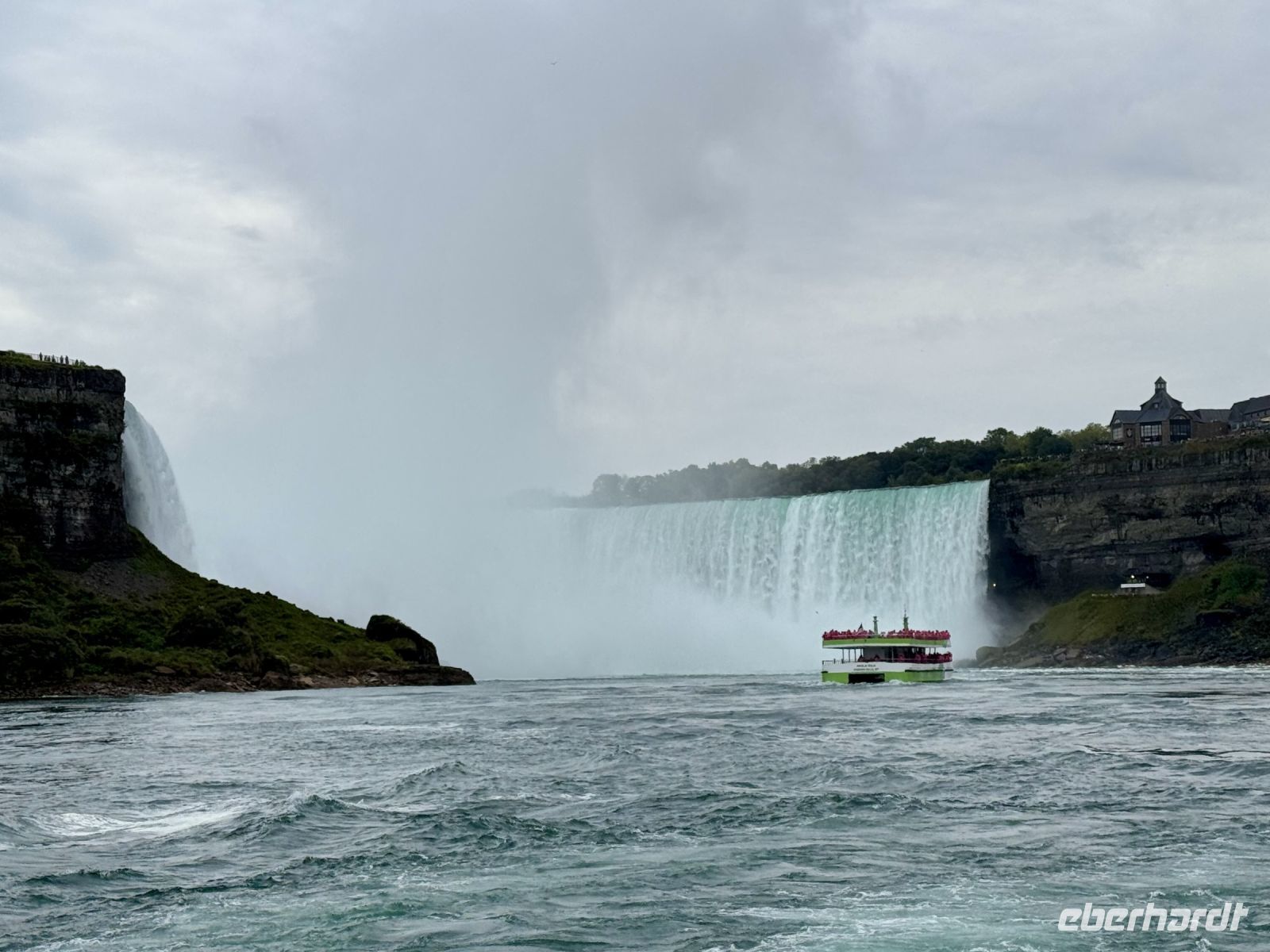 Die erste Nacht in Kanada liegt hinter uns, das erste Frühstück überzeugt mit einer großen Auswahl. Ausgeruht und gestärkt starten wir zur Stadtrundfahrt durch Toronto, was, ähnlich wie später in Montréal, auch immer eine Baustellenrundfahrt ist. Unglaublich, wie schnell sich in Nordamerika eine Stadt verändert, ja regelrecht umgekrempelt wird. Wir werfen nochmals bei Tageslicht einen Blick auf das Rathaus, fahren dann an der Konzerthalle vorbei und durchqueren Chinatown. Um das Parlament von Ontario drehen wir eine Ehrenrunde und steuern nun den CN Tower an. Meine Wetterengel sorgen für perfekte Bedingungen bei der raschen Auffahrt zu beiden Aussichtsplattformen. Im Süden die Toronto Islands und der Ontariosee, im Norden das Stadtzentrum – ein toller Blick in jede Richtung. Wir saugen alles auf und treffen uns begeistert wieder bei Jason am Bus. Er fährt uns erneut ein Stück durch Chinatown, bevor wir zum Dundas Square abbiegen und zum Distillery District weiterfahren. Hier machen wir nochmals eine längere Pause, kaufen uns eine Kleinigkeit zum Mittagessen und stürmen fast geschlossen die Schokoladenfabrik. Warme Temperaturen, blauer Himmel und köstliches Eis — da kommt sofort Urlaubsfeeling auf. Wir kehren zum Bus zurück und nehmen nun langsam Abschied von Toronto. Während Jason den Bus aus der Stadt hinausschlängelt, passieren wir den St Lawrence Market und das Gooderham Building sowie mit dem Fort York den Ursprung der heutigen Metropole. Die anschließende Fahrt in die Niagara-Region führt durch das Goldene Hufeisen in landwirtschaftlich geprägte Gegenden, in denen der Obst- und Weinanbau dominiert. Am sog. Whirlpool treffen wir erstmals auf den Niagara River und folgen ihm flussaufwärts zu den berühmten Wasserfällen. Beim Fotostopp am Table Rock bekommen wir einen guten ersten Eindruck und werden von der aufspritzenden Gischt auch schon ein bisschen nass. Noch feucht-fröhlicher geht es anschließend bei unserer Bootsfahrt zu den Niagarafällen zu. Unsere roten Regencapes schützen wenigstens den Oberkörper, als das Schiff ganz dicht an die Horseshoe Falls heranfährt, bis sich außer weißer Gischt eigentlich nichts mehr ringsum erkennen lässt. Da wird die Kraft der Wassermassen wirklich spürbar. Das war aufregend! Und bis hierhin auch schon ein ereignisreicher zweiter Tag in Kanada. Der Jetlag holt uns langsam ein, weshalb wir das Hotel ansteuern, um uns für ein Weilchen zurückzuziehen. Jason hat freundlicherweise schon die Zimmerkarten und Begrüßungskekse besorgt. Nach der Erholungspause treffen wir uns in der Lobby wieder und begeben uns zu unserem Abendessen auf dem Skylon Tower. Tatsächlich hat überraschenderweise ein leichter Regen eingesetzt, der jedoch im Laufe des Abends wieder endet. Die Aussicht vom Turm auf die Wasserfälle ist natürlich toll. Wir sind auch pünktlich zum Sonnenuntergang eingetroffen. Nach dem leckeren Essen ist vor dem nächsten Höhepunkt: Später am Abend gibt es nämlich noch ein kleines Feuerwerk über den Niagarafällen.