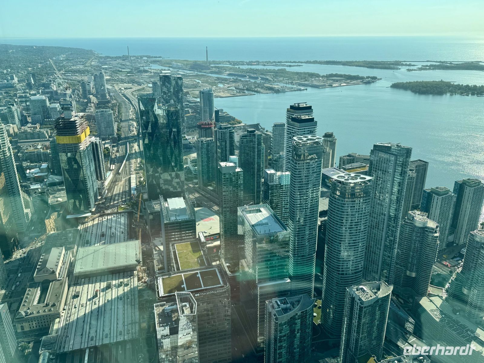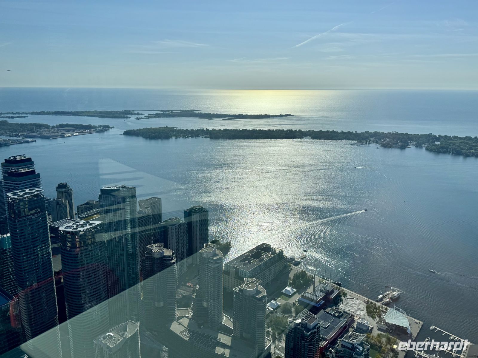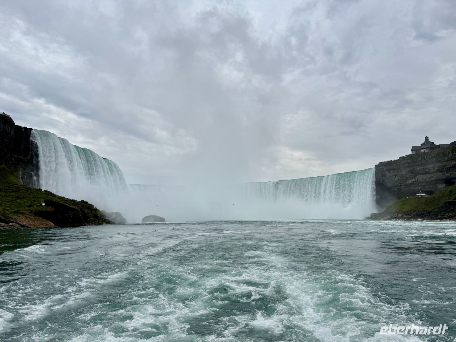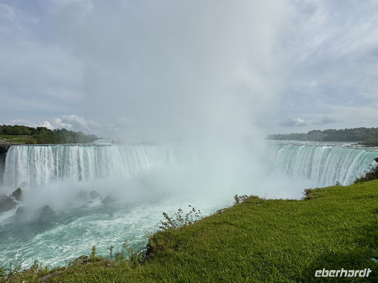 Die erste Nacht in Kanada liegt hinter uns, das erste Frühstück überzeugt mit einer großen Auswahl. Ausgeruht und gestärkt starten wir zur Stadtrundfahrt durch Toronto, was, ähnlich wie später in Montréal, auch immer eine Baustellenrundfahrt ist. Unglaublich, wie schnell sich in Nordamerika eine Stadt verändert, ja regelrecht umgekrempelt wird. Wir werfen nochmals bei Tageslicht einen Blick auf das Rathaus, fahren dann an der Konzerthalle vorbei und durchqueren Chinatown. Um das Parlament von Ontario drehen wir eine Ehrenrunde und steuern nun den CN Tower an. Meine Wetterengel sorgen für perfekte Bedingungen bei der raschen Auffahrt zu beiden Aussichtsplattformen. Im Süden die Toronto Islands und der Ontariosee, im Norden das Stadtzentrum – ein toller Blick in jede Richtung. Wir saugen alles auf und treffen uns begeistert wieder bei Jason am Bus. Er fährt uns erneut ein Stück durch Chinatown, bevor wir zum Dundas Square abbiegen und zum Distillery District weiterfahren. Hier machen wir nochmals eine längere Pause, kaufen uns eine Kleinigkeit zum Mittagessen und stürmen fast geschlossen die Schokoladenfabrik. Warme Temperaturen, blauer Himmel und köstliches Eis — da kommt sofort Urlaubsfeeling auf. Wir kehren zum Bus zurück und nehmen nun langsam Abschied von Toronto. Während Jason den Bus aus der Stadt hinausschlängelt, passieren wir den St Lawrence Market und das Gooderham Building sowie mit dem Fort York den Ursprung der heutigen Metropole. Die anschließende Fahrt in die Niagara-Region führt durch das Goldene Hufeisen in landwirtschaftlich geprägte Gegenden, in denen der Obst- und Weinanbau dominiert. Am sog. Whirlpool treffen wir erstmals auf den Niagara River und folgen ihm flussaufwärts zu den berühmten Wasserfällen. Beim Fotostopp am Table Rock bekommen wir einen guten ersten Eindruck und werden von der aufspritzenden Gischt auch schon ein bisschen nass. Noch feucht-fröhlicher geht es anschließend bei unserer Bootsfahrt zu den Niagarafällen zu. Unsere roten Regencapes schützen wenigstens den Oberkörper, als das Schiff ganz dicht an die Horseshoe Falls heranfährt, bis sich außer weißer Gischt eigentlich nichts mehr ringsum erkennen lässt. Da wird die Kraft der Wassermassen wirklich spürbar. Das war aufregend! Und bis hierhin auch schon ein ereignisreicher zweiter Tag in Kanada. Der Jetlag holt uns langsam ein, weshalb wir das Hotel ansteuern, um uns für ein Weilchen zurückzuziehen. Jason hat freundlicherweise schon die Zimmerkarten und Begrüßungskekse besorgt. Nach der Erholungspause treffen wir uns in der Lobby wieder und begeben uns zu unserem Abendessen auf dem Skylon Tower. Tatsächlich hat überraschenderweise ein leichter Regen eingesetzt, der jedoch im Laufe des Abends wieder endet. Die Aussicht vom Turm auf die Wasserfälle ist natürlich toll. Wir sind auch pünktlich zum Sonnenuntergang eingetroffen. Nach dem leckeren Essen ist vor dem nächsten Höhepunkt: Später am Abend gibt es nämlich noch ein kleines Feuerwerk über den Niagarafällen.
