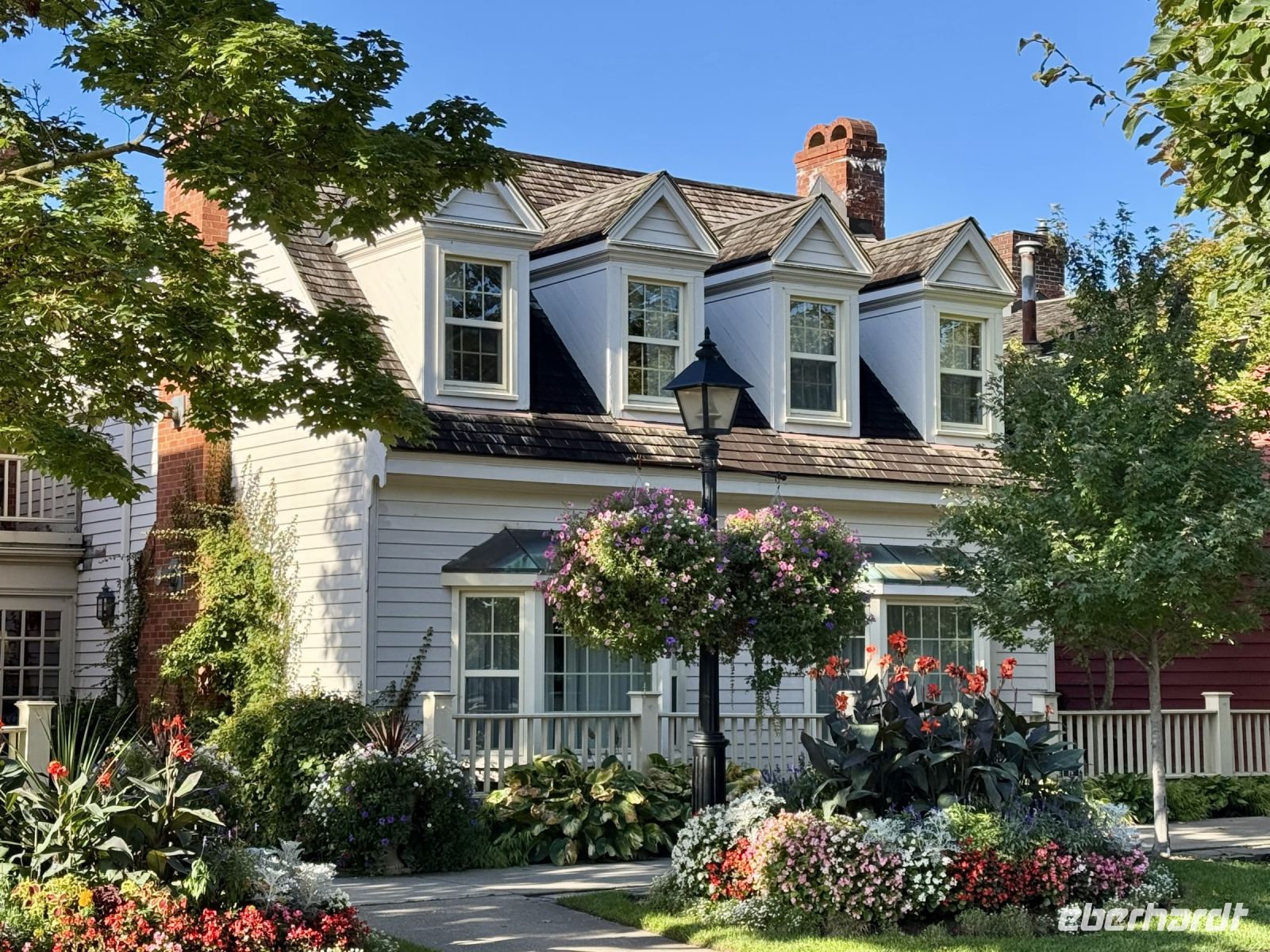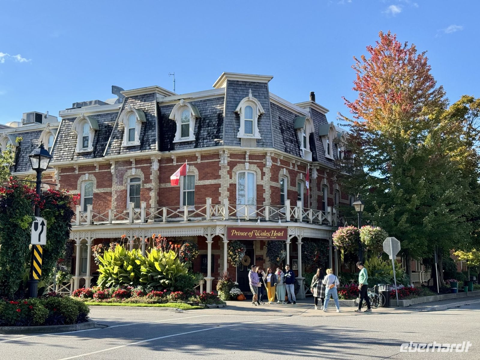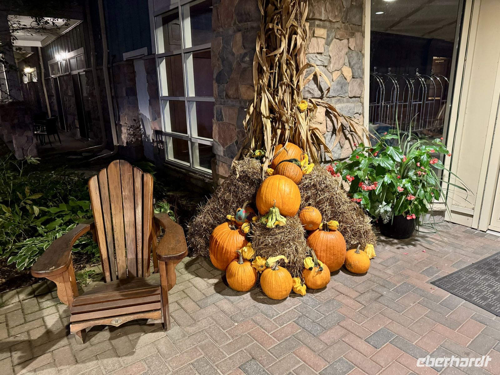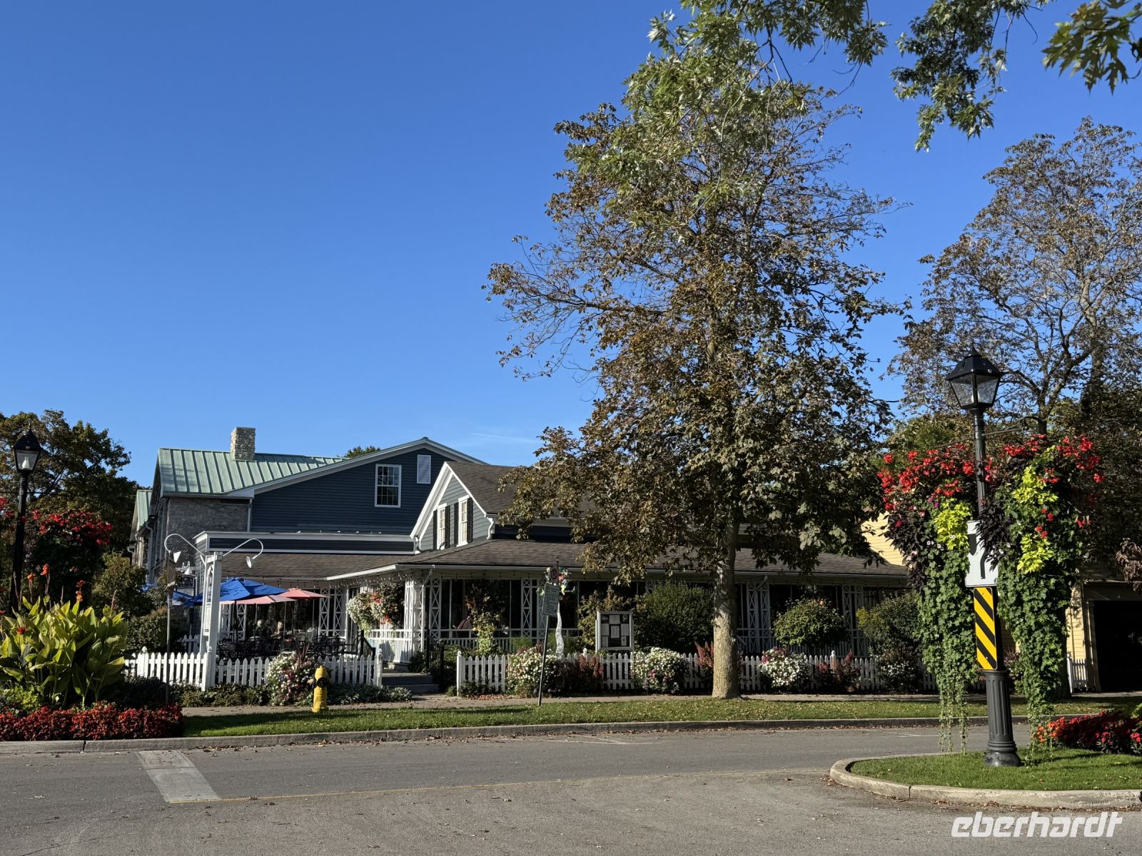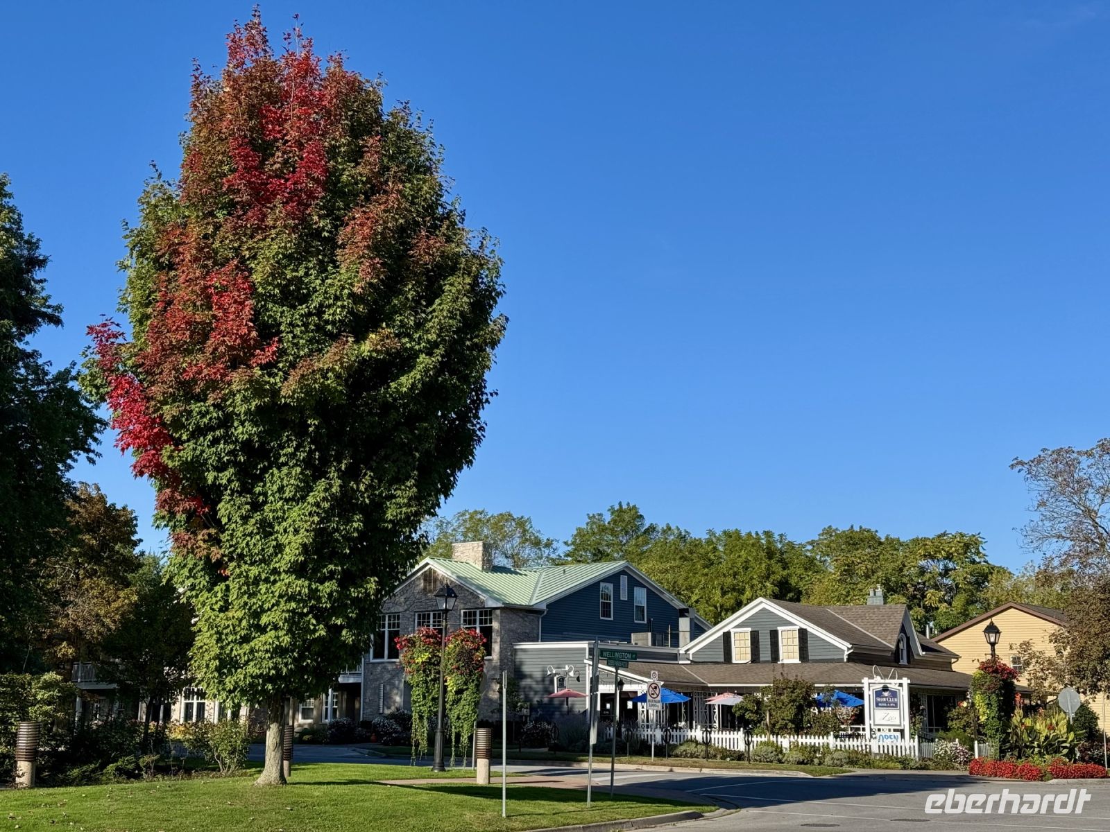 Mit einem wunderschönen Sonnenaufgang über den Niagarafällen beginnt unser dritter Tag in Kanada. So langsam sind wir auch in der hiesigen Zeitzone angekommen. Am Morgen ist es noch sehr ruhig in Niagara Falls. Ein Fotostopp an der Blumenuhr ist der Auftakt für unser heutiges Programm. Sie ist hübsch, geht aber völlig falsch. Also an ebenfalls hübschen Häuschen und herrschaftlichen Anwesen schnell weiter nach Niagara-on-the-Lake. Auch hier geht es noch (!) sehr beschaulich zu. Gemütlich können wir durch die Hauptstraße schlendern, uns an der Blumenpracht erfreuen und an den Schaufenstern des Weihnachtsgeschäfts die Nase platt drücken. Oder uns bei einem Immobilienmakler ein Häuschen aussuchen und geschwind den Kaufvertrag unterzeichnen, bevor die Konkurrenz anrückt. Inzwischen sind weitere Busse und damit Touristen angekommen, und Straße und Geschäfte füllen sich. Wir kehren zu unserem Jason zurück, der uns nun nach Penetanguishene bringt. In einem urigen Restaurant warten unser Mittagessen und eine sehr nette Bedienung auf uns. Einen Abstecher an den Pier kann ich mir anschließend bei dem herrlichen Wetter nicht verkneifen. Motorboote und Segelboote liegen im Wasser der Georgian Bay, das im Licht der Sonne magisch glitzert. Im Museumsdorf Sainte-Marie among the Hurons wagen wir eine Reise in die Vergangenheit der ersten europäischen Kolonisten. In diesem Fall waren es jesuitische Missionare, die sich fernab der Heimat unter den Huronen ein neues Zuhause aufbauten. Der Feueralarm reißt uns jäh zurück in die Gegenwart und kürzt unseren Besuch um vielleicht 10 Minuten ab. Die heranbrausende Feuerwehr sieht auch schon historisch aus … Bei einem Stopp an einem Supermarkt in Orillia erfolgt dann die Konfrontation mit der heutigen Alltagswelt der Kanadier. Von hier aus sind es noch rund 1,5 Stunden bis zum Deerhurst Resort bei Huntsville in der Muskoka-Region. Hier hat der Indian Summer schon Einzug gehalten und wir erfreuen uns während der Fahrt an der herbstlichen Farbenpracht. Schroffe Felsen und viele kleine Seen ziehen an uns vorbei. Das Deerhurst Resort ist herbstlich geschmückt, die Lobby sehr einladend. Nach dem Bezug der Zimmer finden wir alle zwischen Pub, Buffetrestaurant und Grillbar eine Möglichkeit zum Abendessen.