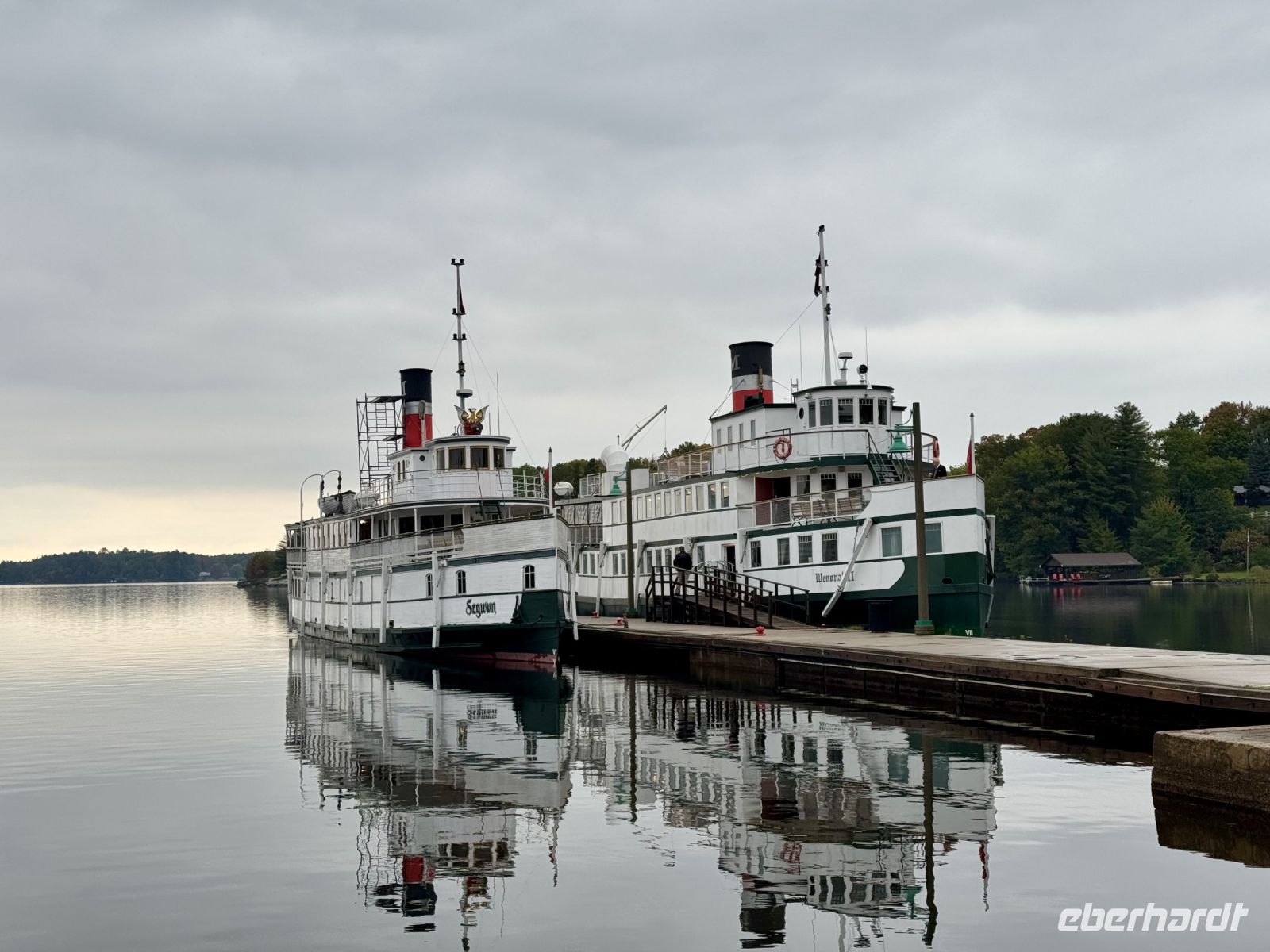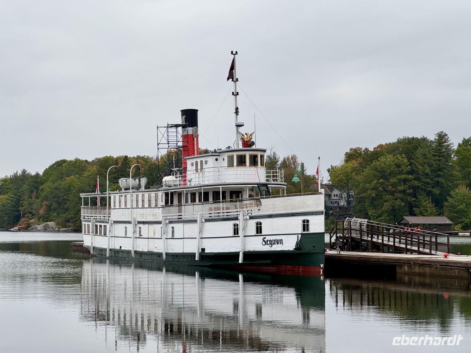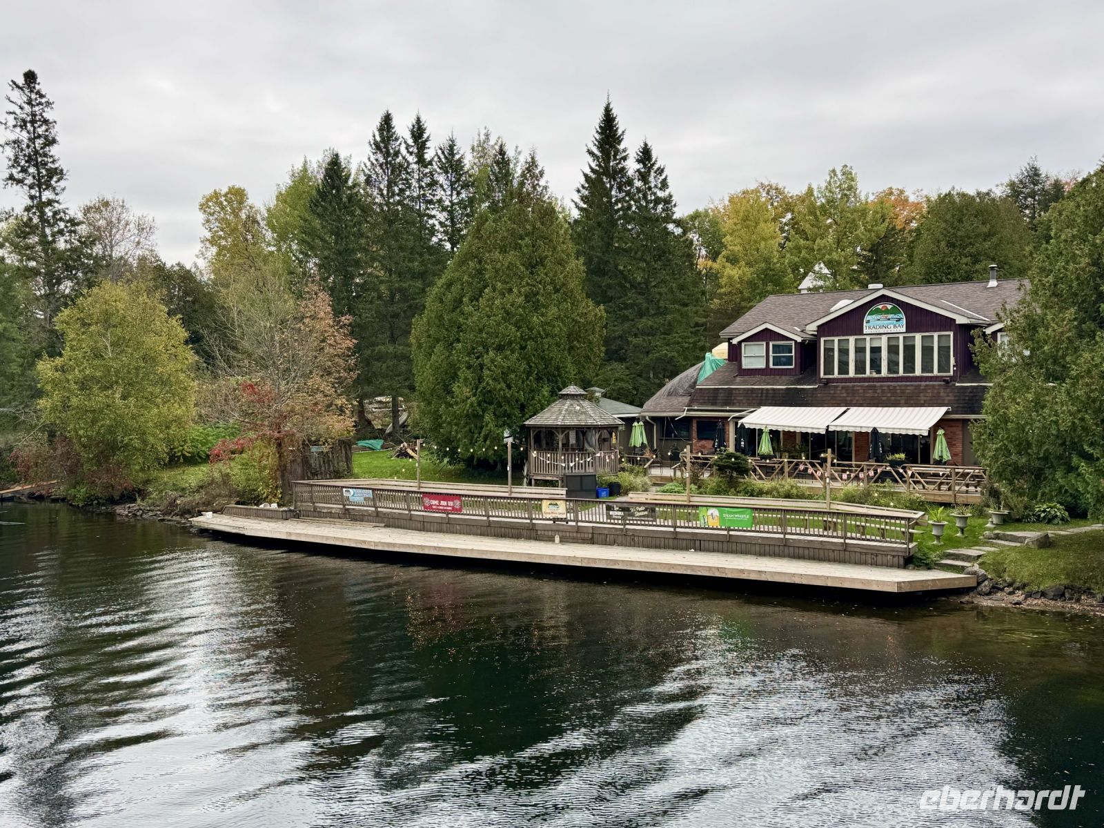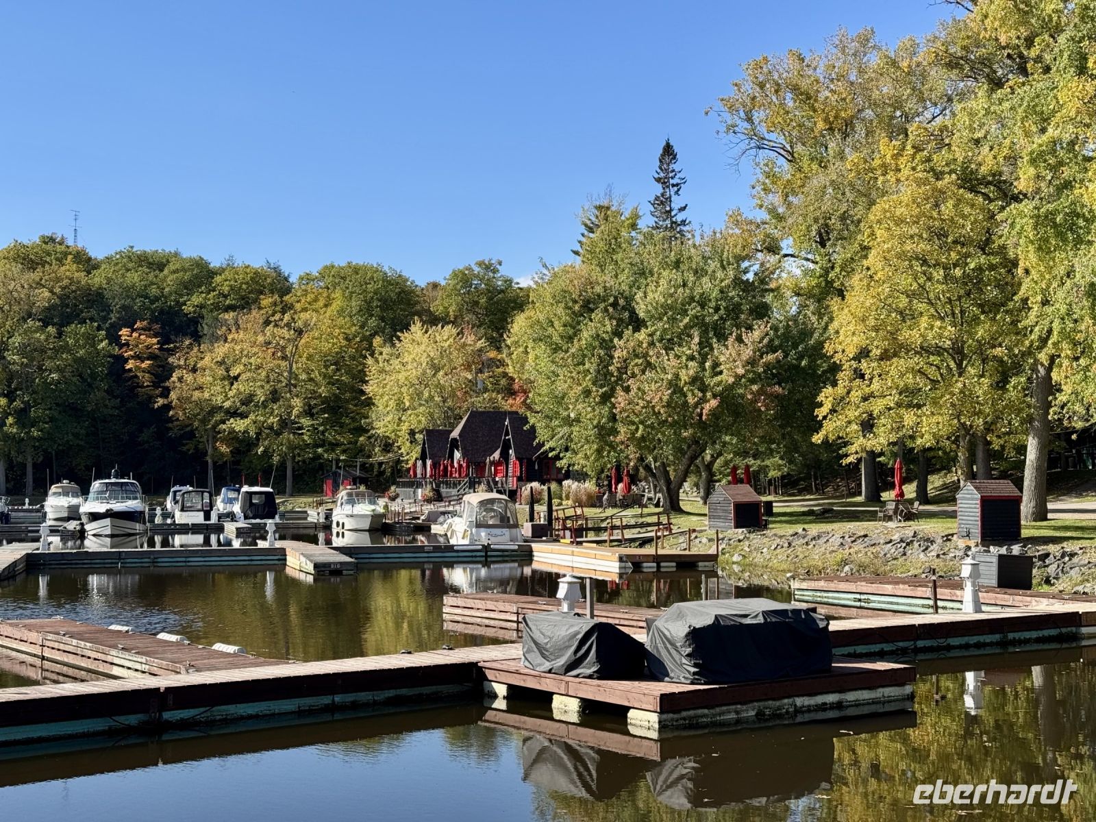 Auch der heutige Tag beginnt mit einem herrlichen Sonnenaufgang mit wunderschönen Rot- und Violetttönen — und mit einem ausgiebigen späten Frühstück, denn ich lasse meine Gäste freundlicherweise fast ausschlafen. Ist ja auch Sonntag! Das Tagesprogramm ziehen wir heute von hinten auf, d. h. wir beginnen mit einer kleinen herbstlichen Rundfahrt durch die Muskoka-Region. Hier ist der Indian Summer bereits in vollem Gange. Das Herbstlaub leuchtet trotz Wolkendecke wunderschön in Gelb, Orange und Rot. Herrlich! In Dorset an der Lake of Bays machen wir eine Pause am berühmten Robinson’s General Store und setzen dann unsere Fahrt in Richtung Gravenhurst fort. Nach einer Weile setzt dann doch der angekündigte Regen ein. Es entwickelt sich sogar ein richtiges Gewitter mit Platzregen. Da hilft nur eines: Wir müssen uns das Wetter schöntrinken! Rein zufällig habe ich als Überraschung sowieso einen Stopp an der Muskoka Brewery eingeplant. Hier können wir lokales Craft Beer verkosten und den schlimmsten Teil des Regens aussitzen. Als wir Gravenhurst erreichen, ist das Unwetter nämlich schon fast vorbei. Und während unserer Bootstour auf dem Lake Muskoka mit dem „Dampfschiff“ wird das Wetter immer besser und besser, bis am Ende tatsächlich wieder die Sonne vom blauen Himmel lacht. Da können wir auf dem Deck sitzen und Vitamin D tanken, während die vielen kleinen Inseln mit einigen hübschen Sommerhäuschen an uns vorüberziehen. Das ist fast schon wie Urlaub! Auf der Rückfahrt nach Huntsville genießen wir wieder die schöne Laubfärbung, die nun im Licht der Sonne noch viel besser zur Geltung kommt. Zum krönenden Abschluss des Tages werden wir im Resort mit Suppe oder Salat, leckerem Lachs und noch leckererer Crème Brûlée verwöhnt.