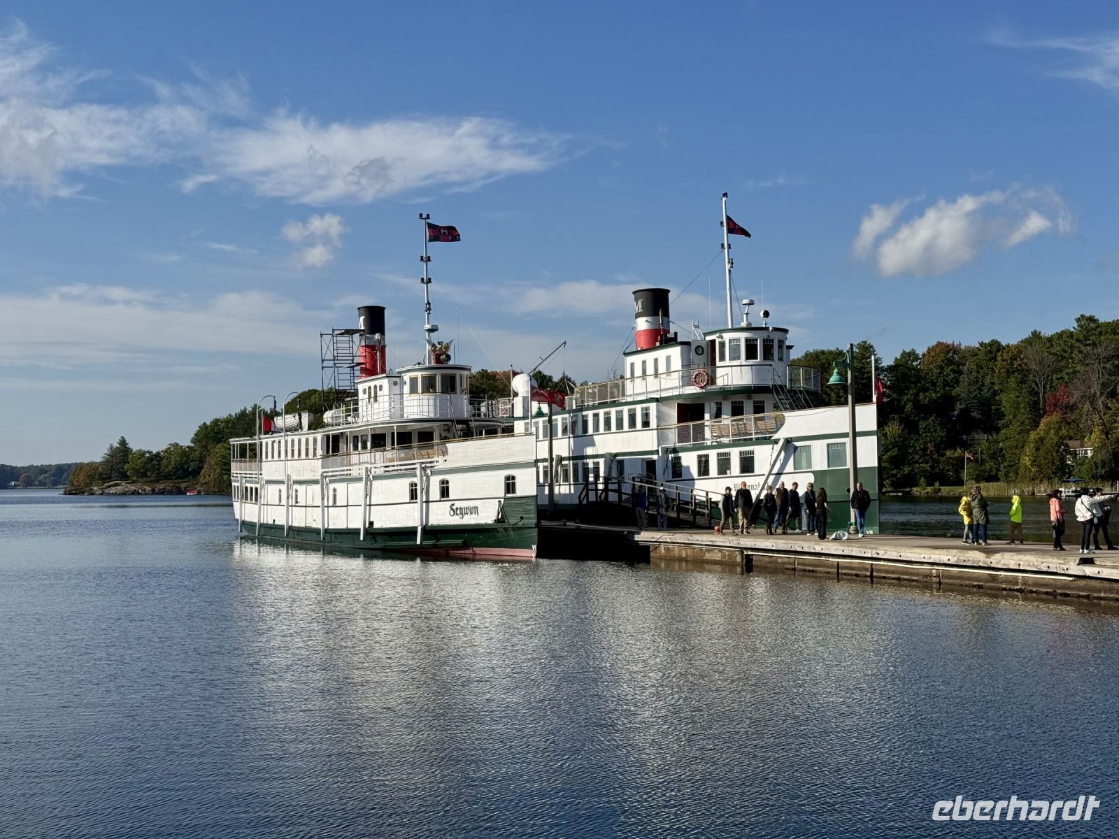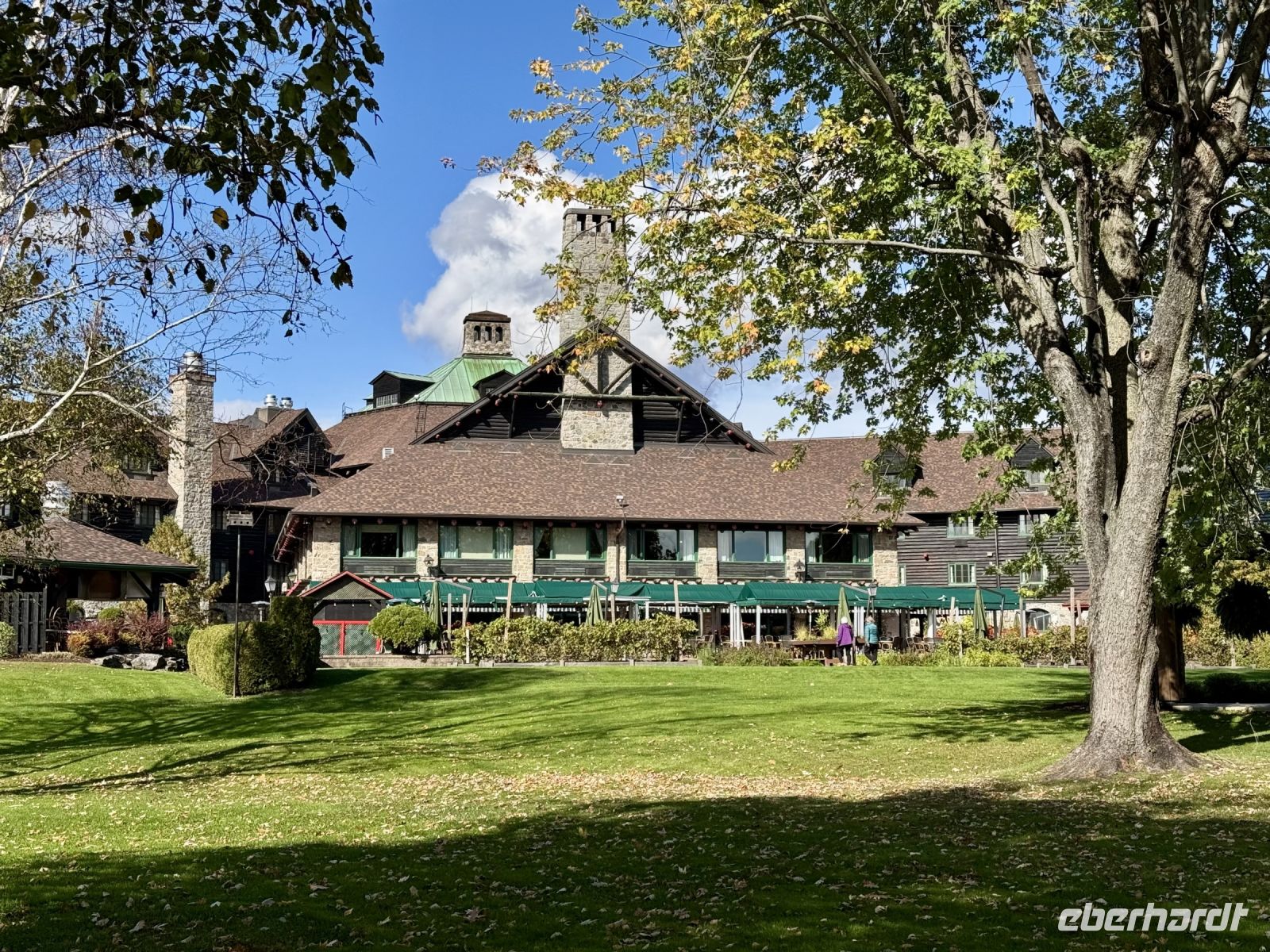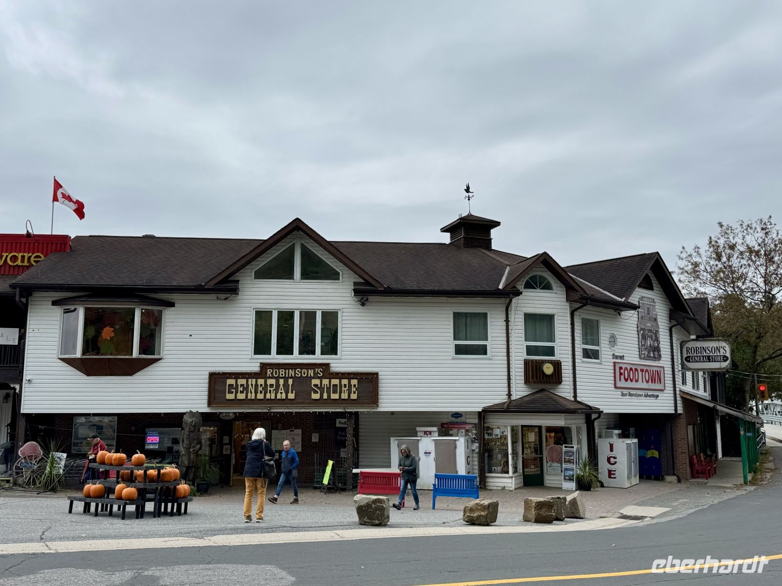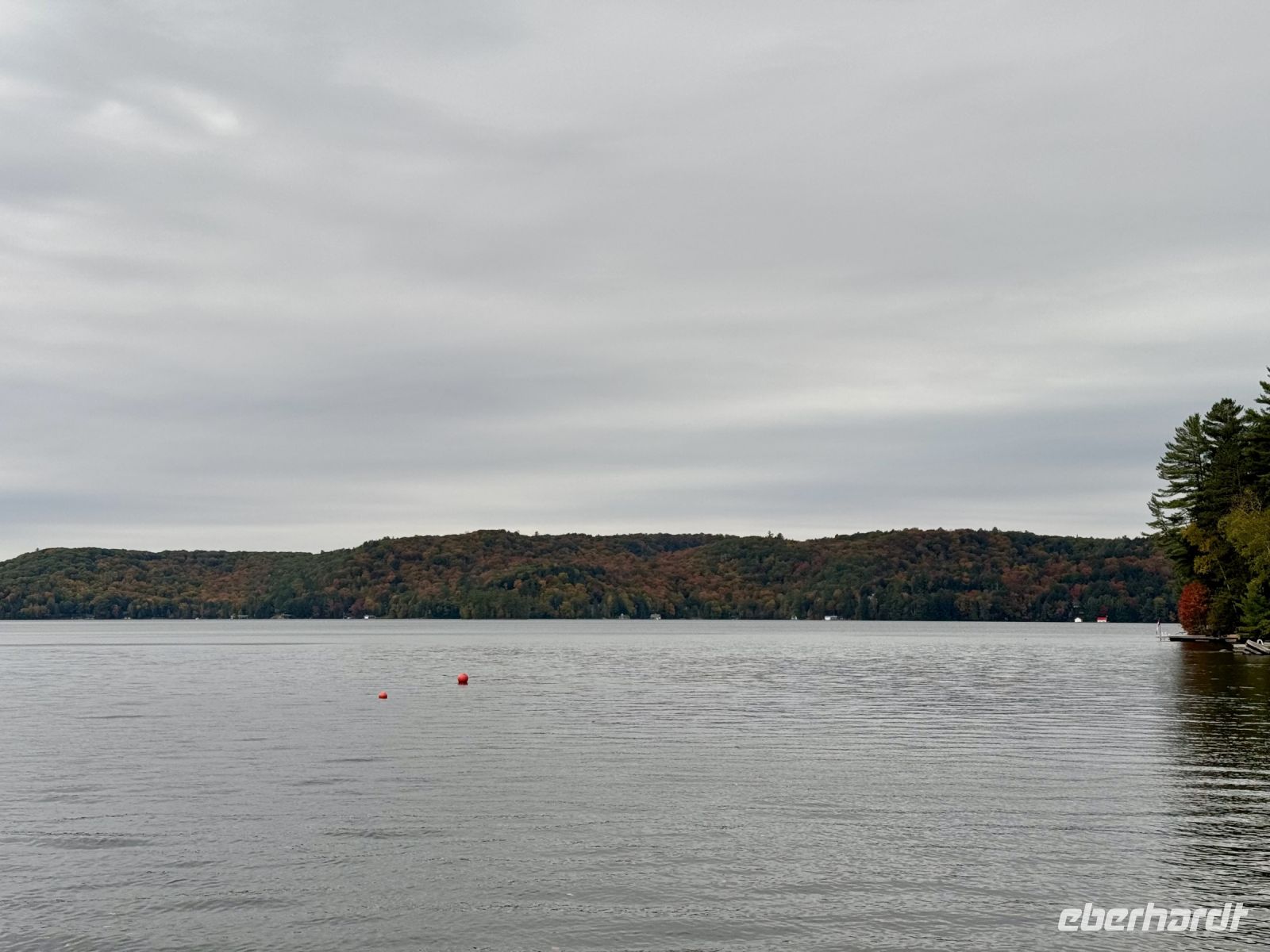 Auch der heutige Tag beginnt mit einem herrlichen Sonnenaufgang mit wunderschönen Rot- und Violetttönen — und mit einem ausgiebigen späten Frühstück, denn ich lasse meine Gäste freundlicherweise fast ausschlafen. Ist ja auch Sonntag! Das Tagesprogramm ziehen wir heute von hinten auf, d. h. wir beginnen mit einer kleinen herbstlichen Rundfahrt durch die Muskoka-Region. Hier ist der Indian Summer bereits in vollem Gange. Das Herbstlaub leuchtet trotz Wolkendecke wunderschön in Gelb, Orange und Rot. Herrlich! In Dorset an der Lake of Bays machen wir eine Pause am berühmten Robinson’s General Store und setzen dann unsere Fahrt in Richtung Gravenhurst fort. Nach einer Weile setzt dann doch der angekündigte Regen ein. Es entwickelt sich sogar ein richtiges Gewitter mit Platzregen. Da hilft nur eines: Wir müssen uns das Wetter schöntrinken! Rein zufällig habe ich als Überraschung sowieso einen Stopp an der Muskoka Brewery eingeplant. Hier können wir lokales Craft Beer verkosten und den schlimmsten Teil des Regens aussitzen. Als wir Gravenhurst erreichen, ist das Unwetter nämlich schon fast vorbei. Und während unserer Bootstour auf dem Lake Muskoka mit dem „Dampfschiff“ wird das Wetter immer besser und besser, bis am Ende tatsächlich wieder die Sonne vom blauen Himmel lacht. Da können wir auf dem Deck sitzen und Vitamin D tanken, während die vielen kleinen Inseln mit einigen hübschen Sommerhäuschen an uns vorüberziehen. Das ist fast schon wie Urlaub! Auf der Rückfahrt nach Huntsville genießen wir wieder die schöne Laubfärbung, die nun im Licht der Sonne noch viel besser zur Geltung kommt. Zum krönenden Abschluss des Tages werden wir im Resort mit Suppe oder Salat, leckerem Lachs und noch leckererer Crème Brûlée verwöhnt.