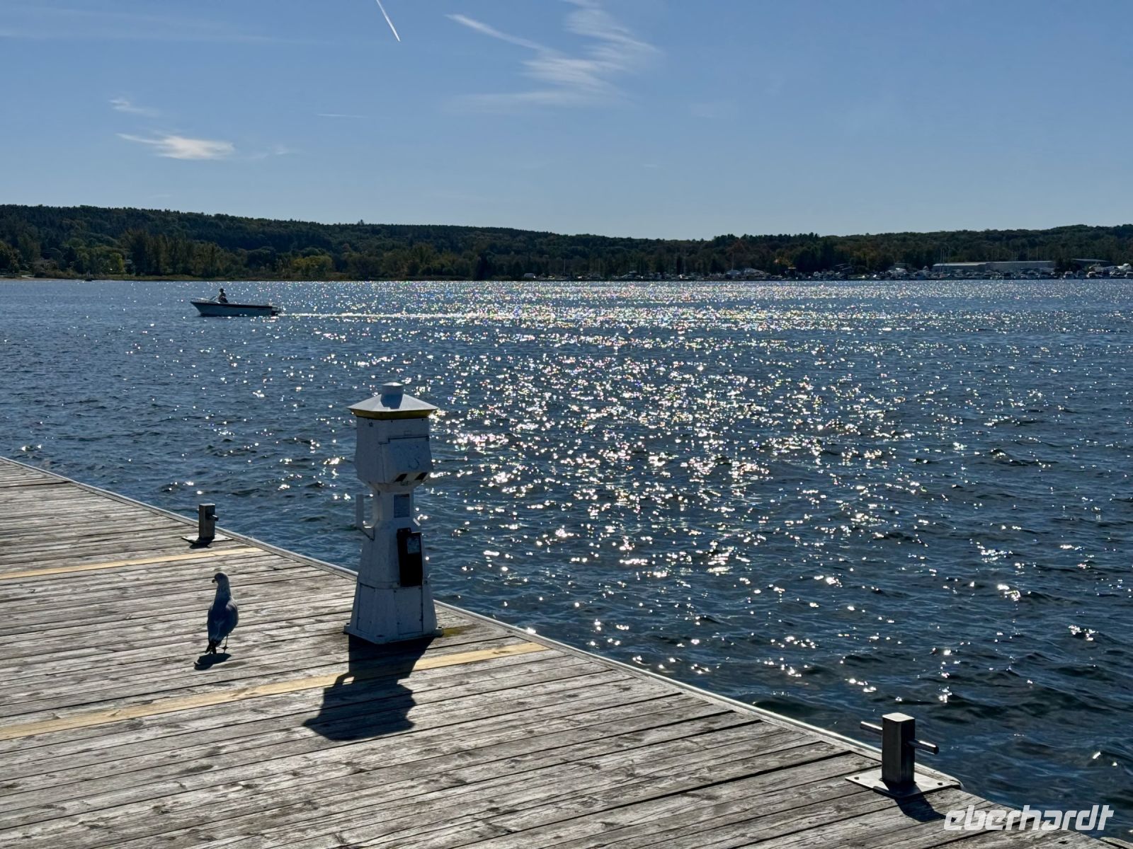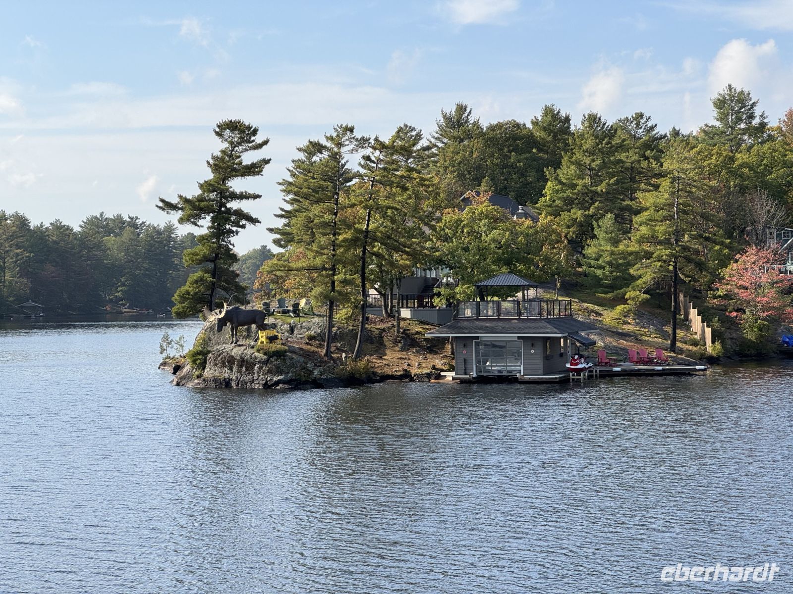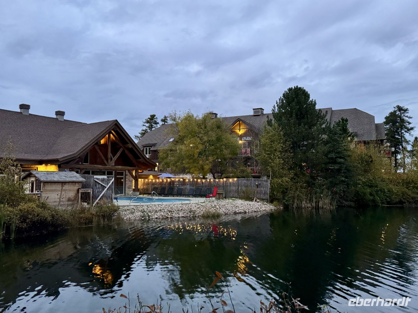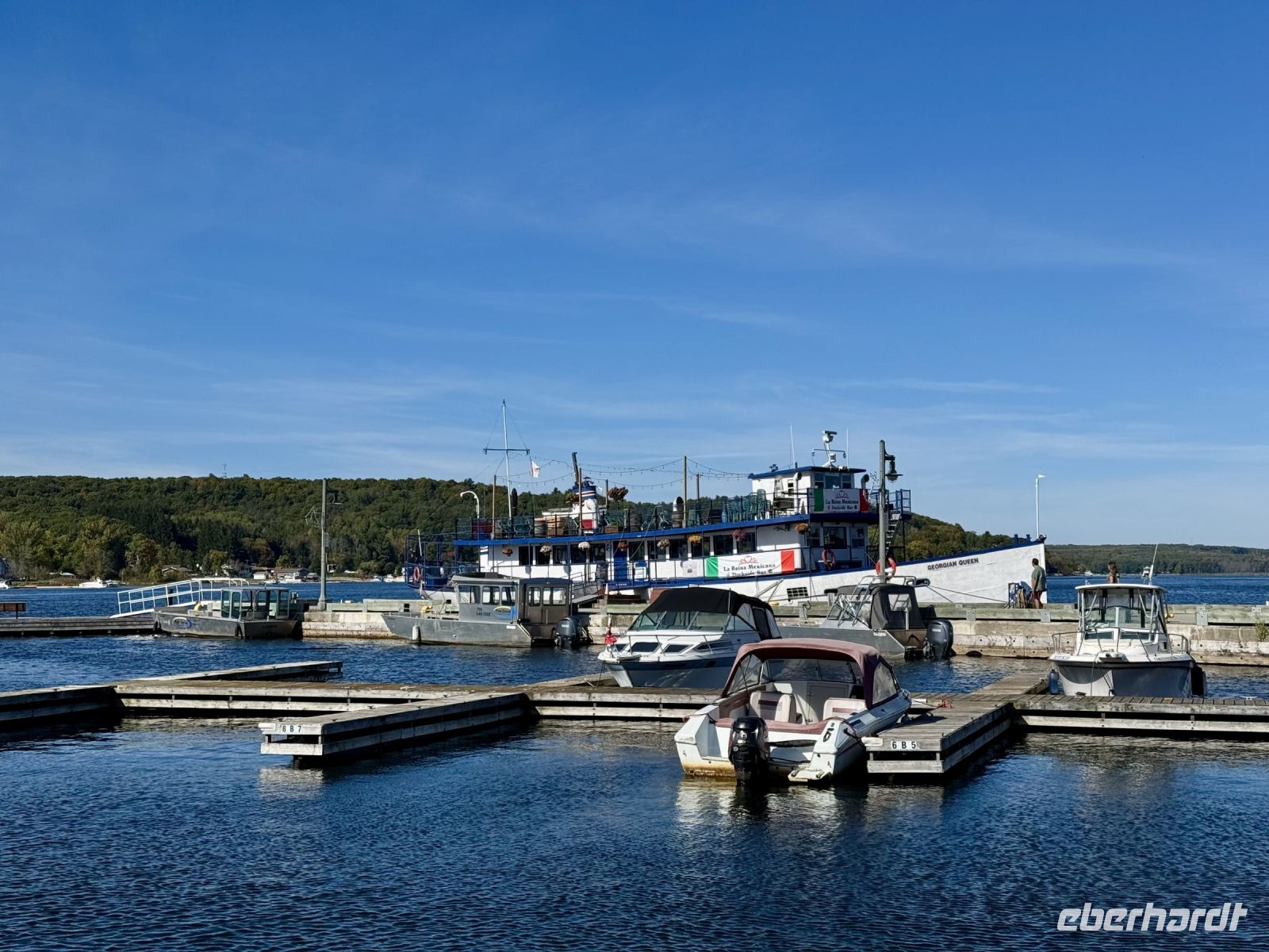 Auch der heutige Tag beginnt mit einem herrlichen Sonnenaufgang mit wunderschönen Rot- und Violetttönen — und mit einem ausgiebigen späten Frühstück, denn ich lasse meine Gäste freundlicherweise fast ausschlafen. Ist ja auch Sonntag! Das Tagesprogramm ziehen wir heute von hinten auf, d. h. wir beginnen mit einer kleinen herbstlichen Rundfahrt durch die Muskoka-Region. Hier ist der Indian Summer bereits in vollem Gange. Das Herbstlaub leuchtet trotz Wolkendecke wunderschön in Gelb, Orange und Rot. Herrlich! In Dorset an der Lake of Bays machen wir eine Pause am berühmten Robinson’s General Store und setzen dann unsere Fahrt in Richtung Gravenhurst fort. Nach einer Weile setzt dann doch der angekündigte Regen ein. Es entwickelt sich sogar ein richtiges Gewitter mit Platzregen. Da hilft nur eines: Wir müssen uns das Wetter schöntrinken! Rein zufällig habe ich als Überraschung sowieso einen Stopp an der Muskoka Brewery eingeplant. Hier können wir lokales Craft Beer verkosten und den schlimmsten Teil des Regens aussitzen. Als wir Gravenhurst erreichen, ist das Unwetter nämlich schon fast vorbei. Und während unserer Bootstour auf dem Lake Muskoka mit dem „Dampfschiff“ wird das Wetter immer besser und besser, bis am Ende tatsächlich wieder die Sonne vom blauen Himmel lacht. Da können wir auf dem Deck sitzen und Vitamin D tanken, während die vielen kleinen Inseln mit einigen hübschen Sommerhäuschen an uns vorüberziehen. Das ist fast schon wie Urlaub! Auf der Rückfahrt nach Huntsville genießen wir wieder die schöne Laubfärbung, die nun im Licht der Sonne noch viel besser zur Geltung kommt. Zum krönenden Abschluss des Tages werden wir im Resort mit Suppe oder Salat, leckerem Lachs und noch leckererer Crème Brûlée verwöhnt.