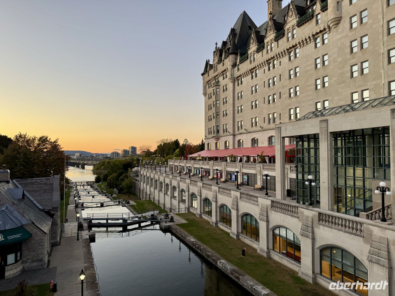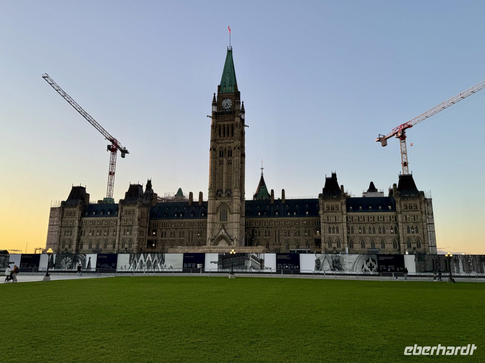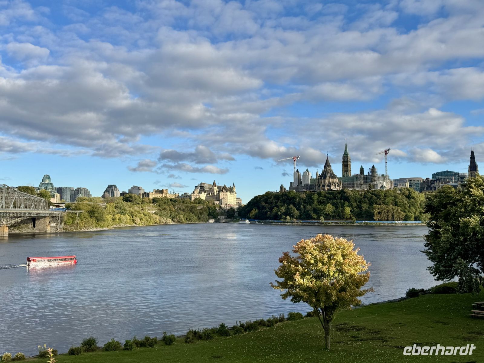 Nachts muss es wohl nochmals geregnet haben, aber zum Frühstück badet uns die Sonne im Hotelrestaurant in ihrem wärmenden Glanz. Wir sind ganz gespannt auf die Fahrt durch den Algonquin Park und werden auch nicht enttäuscht: Der Indian Summer in Kanada ist wirklich wunderschön. Wir kommen aus dem Staunen über so viel Farbenpracht nicht heraus. Im Besucherzentrum des Parks erwarten uns ein Kinobesuch mit tollen Naturaufnahmen und eine herrliche Aussicht von der Terrasse. Einige Kilometer weiter sitzen wir wieder im Kino und sehen einen Film über die Geschichte der Holzfällerei im Algonquin Park. Ein Spaziergang auf dem Logging Trail vertieft das Gelernte anhand vieler Exponate: Nachbauten der Holzfällerhütten, Werkzeuge, dampfbetriebene Schleppboote für die Holzstammflöße. Ein raues, karges, schweres Leben. Meine Gäste wollen doch lieber im Hotel in Ottawa übernachten und ich kann es ihnen nicht einmal verübeln. Bald darauf verlassen wir den Algonquin Park durch das Osttor und setzen die Fahrt nach Ottawa fort. Unsere geplante Mittagspause bei Tim Hortons verschiebt sich leider zeitlich nach hinten, da die erste Option wegen Bauarbeiten geschlossen ist. So müssen wir heute leider bis Renfrew durchhalten, bevor es Kaffee und eine Kleinigkeit zu essen gibt. Unser großer Bus wird in so einem kleinen Nest natürlich neugierig beäugt. Haben wir uns etwa verirrt? Immerhin ist es nun gar nicht mehr so weit bis zur Hauptstadt. Unseren ersten Stopp machen wir jedoch in Gatineau am Nationalmuseum für Geschichte. Erstens ist das Gebäude samt der großen Halle sehr sehenswert, zweitens können wir von hier aus die Silhouette der Stadt mit Parlament, Rideau-Kanal und Nationalgalerie sehr gut fotografieren. Der Amtssitz der Generalgouveneurin bleibt uns heute leider verschlossen und auch bei Justin und der Deutschen Botschaft haben wir kein Glück. Im zentral gelegenen Lord Elgin Hotel werden wir jedoch sehr freundlich empfangen. Fast alle Gäste schließen sich mir danach noch bei meinem kleinen Abendspaziergang zum Parlamentshügel und zum Château Laurier an, dessen schöne Bar leider auch gerade wegen Renovierung geschlossen hat. In dieser Hinsicht haben wir heute wirklich etwas Pech. Wettertechnisch hingegen können wir uns wieder nicht beschweren.