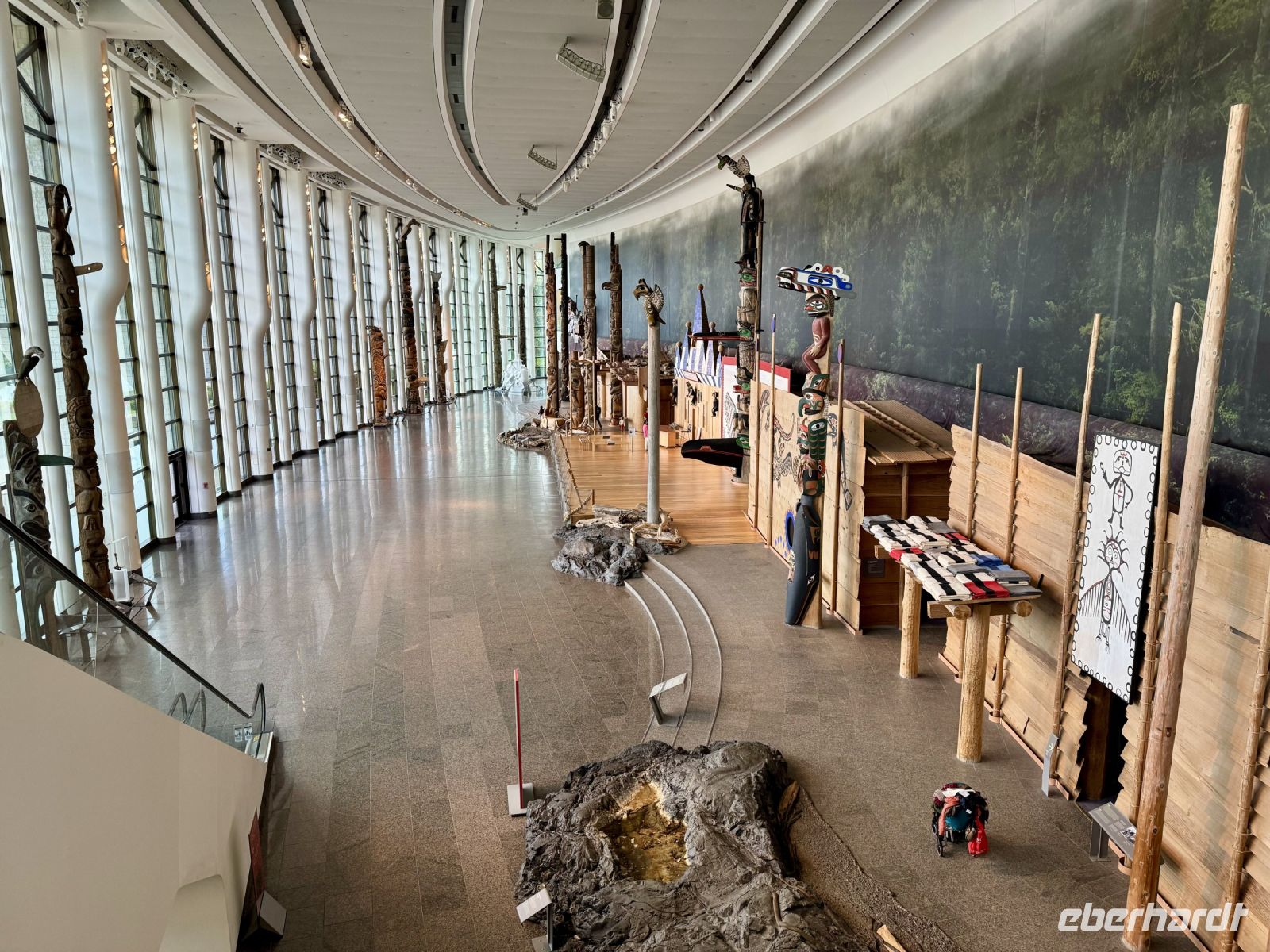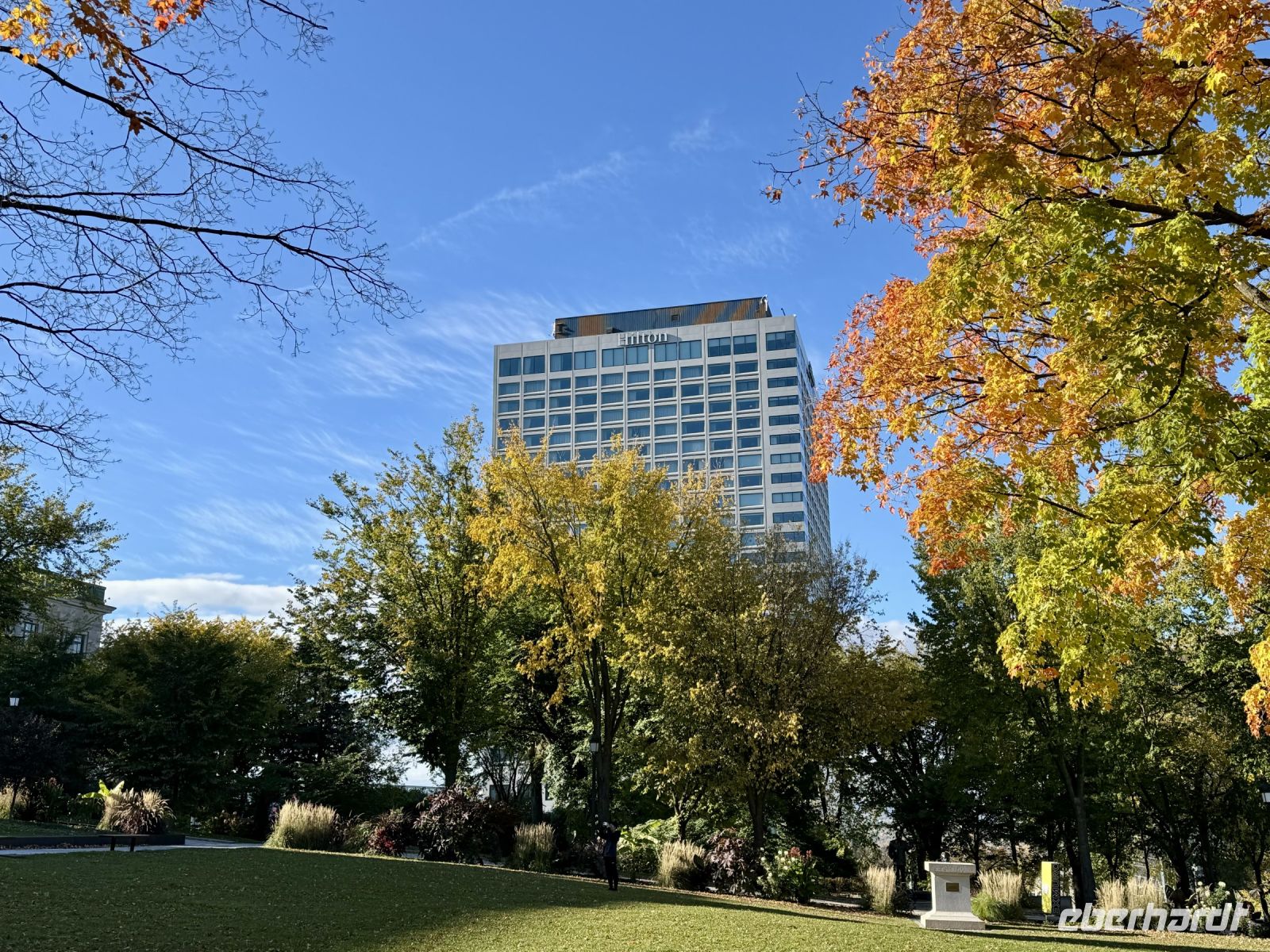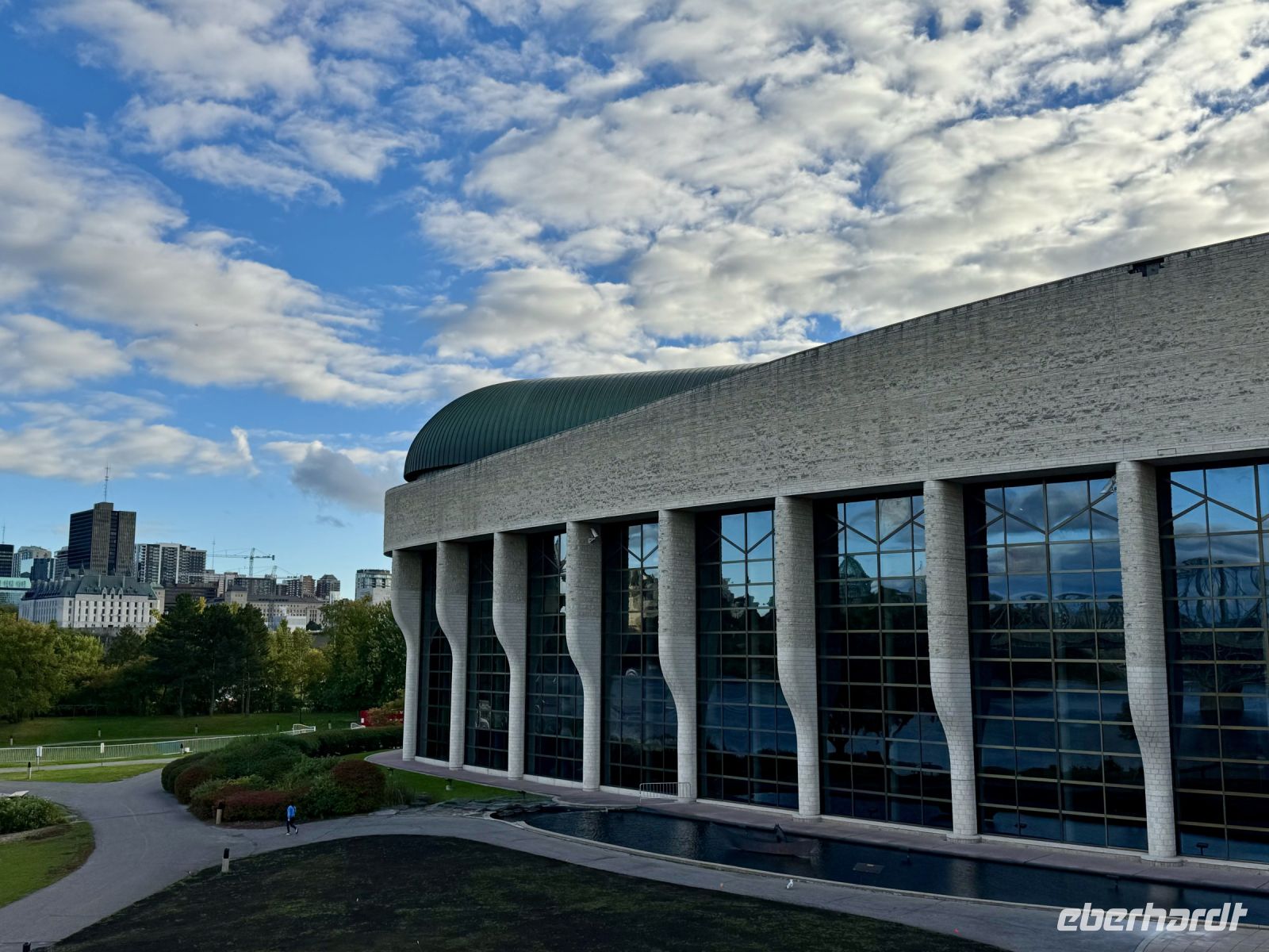 Nachts muss es wohl nochmals geregnet haben, aber zum Frühstück badet uns die Sonne im Hotelrestaurant in ihrem wärmenden Glanz. Wir sind ganz gespannt auf die Fahrt durch den Algonquin Park und werden auch nicht enttäuscht: Der Indian Summer in Kanada ist wirklich wunderschön. Wir kommen aus dem Staunen über so viel Farbenpracht nicht heraus. Im Besucherzentrum des Parks erwarten uns ein Kinobesuch mit tollen Naturaufnahmen und eine herrliche Aussicht von der Terrasse. Einige Kilometer weiter sitzen wir wieder im Kino und sehen einen Film über die Geschichte der Holzfällerei im Algonquin Park. Ein Spaziergang auf dem Logging Trail vertieft das Gelernte anhand vieler Exponate: Nachbauten der Holzfällerhütten, Werkzeuge, dampfbetriebene Schleppboote für die Holzstammflöße. Ein raues, karges, schweres Leben. Meine Gäste wollen doch lieber im Hotel in Ottawa übernachten und ich kann es ihnen nicht einmal verübeln. Bald darauf verlassen wir den Algonquin Park durch das Osttor und setzen die Fahrt nach Ottawa fort. Unsere geplante Mittagspause bei Tim Hortons verschiebt sich leider zeitlich nach hinten, da die erste Option wegen Bauarbeiten geschlossen ist. So müssen wir heute leider bis Renfrew durchhalten, bevor es Kaffee und eine Kleinigkeit zu essen gibt. Unser großer Bus wird in so einem kleinen Nest natürlich neugierig beäugt. Haben wir uns etwa verirrt? Immerhin ist es nun gar nicht mehr so weit bis zur Hauptstadt. Unseren ersten Stopp machen wir jedoch in Gatineau am Nationalmuseum für Geschichte. Erstens ist das Gebäude samt der großen Halle sehr sehenswert, zweitens können wir von hier aus die Silhouette der Stadt mit Parlament, Rideau-Kanal und Nationalgalerie sehr gut fotografieren. Der Amtssitz der Generalgouveneurin bleibt uns heute leider verschlossen und auch bei Justin und der Deutschen Botschaft haben wir kein Glück. Im zentral gelegenen Lord Elgin Hotel werden wir jedoch sehr freundlich empfangen. Fast alle Gäste schließen sich mir danach noch bei meinem kleinen Abendspaziergang zum Parlamentshügel und zum Château Laurier an, dessen schöne Bar leider auch gerade wegen Renovierung geschlossen hat. In dieser Hinsicht haben wir heute wirklich etwas Pech. Wettertechnisch hingegen können wir uns wieder nicht beschweren.