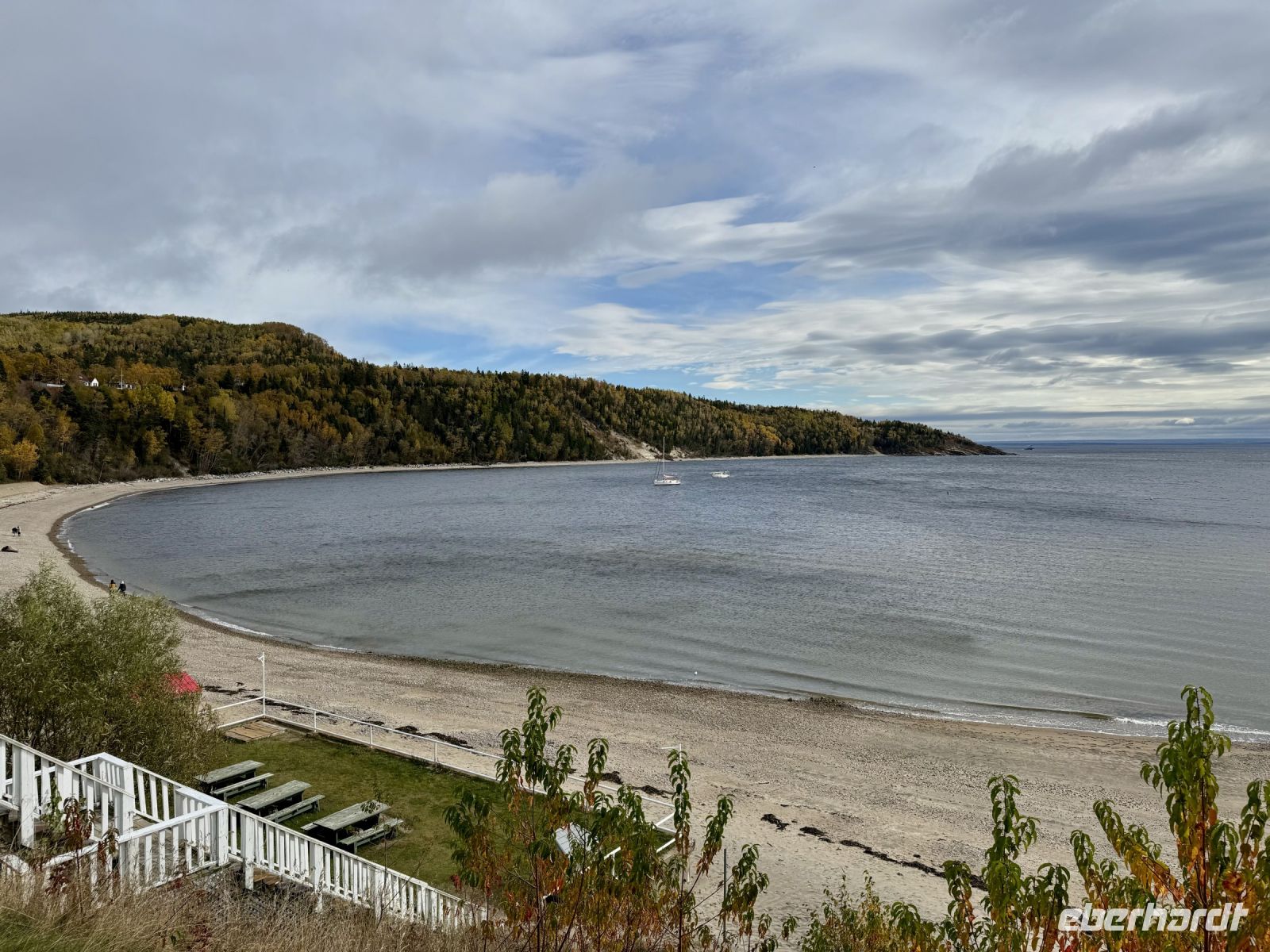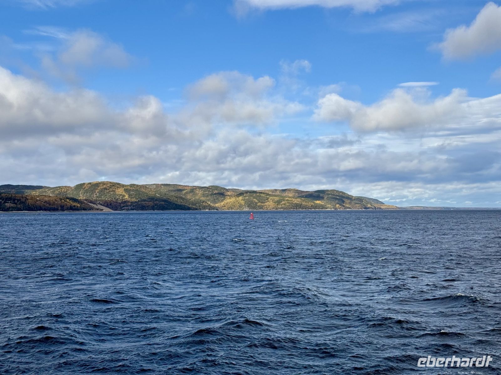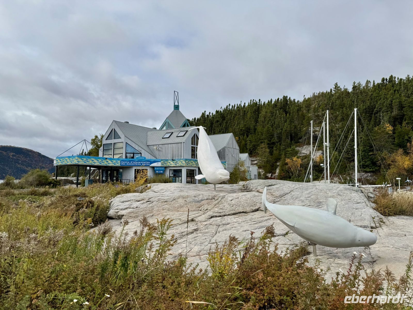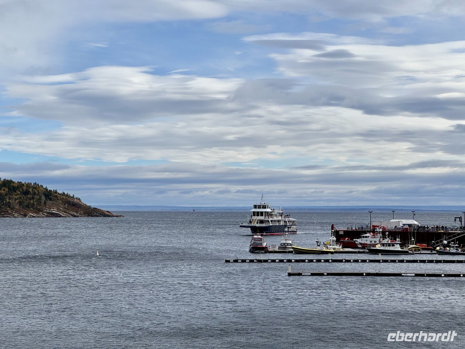 Der Tag beginnt mit stürmischen Winden und einigen kurzen Stromausfällen. Dafür hängen dramatische Wolkenformationen über der Bucht. Zunächst steht eine Fahrt nach Tadoussac auf dem Programm, wo wir das private Museum für Meeressäugetiere besuchen möchten. Gruselige Hexen und Berge von Kürbissen verwehren uns fast den Zutritt zum Supermarkt in La Malbaie, doch wir lassen uns nicht beirren und kaufen uns Proviant für die Mittagspause. Unterwegs wartet ein versprochener Fotostopp an einem See auf meine Gäste, die hier am Rastplatz die Laubfärbung des Indian Summer noch einmal sehr gut fotografieren können. Angesichts des starken Windes fällt es Jason heute gar nicht so leicht, den Bus in der Spur zu halten. Als wir am Fjord auf die Fähre warten und das schäumende Wasser sehen, machen wir uns schon ein bisschen Sorgen, ob wir später überhaupt mit dem Schiff hinausfahren können. Jason setzt uns an der Anlegestelle der malerischen sichelförmigen Bucht von Tadoussac ab und wir laufen erstmal zum Walmuseum. Zwei schöne Filme über das Leben der Belugas stimmen uns thematisch auf den Tag ein und sind etwas fürs Herz. Im Nachbarraum wartet eine Sammlung riesiger Walskelette auf uns — und das waren alles noch junge Tiere! Wie riesig sind dann erst ausgewachsene Exemplare? Leider werden diese sanften Riesen vor allem durch Fischernetze und Umweltverschmutzung durch uns Menschen bedroht, was uns unser freundlicher Guide nachdrücklich erklärt. Mit einer Licht- und Soundshow endet unser Besuch. Wer möchte, kann jedoch auch gern noch länger bleiben und die Exponate betrachten. Alternativ ist jetzt die Gelegenheit für einen Spaziergang entlang der Uferpromenade zum altehrwürdigen Hotel Tadoussac und zurück bzw. die Mittagspause. Fast die Hälfte der Gruppe wärmt sich nach einer Weile mit mir in einem kleinen Café bei Tee, Kaffee oder einer heißen Schokolade erstmal wieder auf. Unsere Walbeobachtung auf dem Sankt-Lorenz-Strom findet dann tatsächlich auch statt — das ist erstmal die gute Nachricht. Und es schaukelt und ruckelt trotz des weiterhin starken Windes weniger heftig als befürchtet — die zweite gute Nachricht. Allerdings machen es die Wellen schwierig für uns, die Wale überhaupt zu finden. Außerdem halten wir es draußen auf dem offenen Deck immer nur wenige Minuten aus und flüchten dann schnell wieder hinein hinter die großen Glasscheiben. So bleibt jedenfalls die „Ausbeute“ nach drei Stunden Fahrt auf dem Sankt-Lorenz-Strom insgesamt recht mager: ein oder zwei Zwergwale und zwei Belugas wurden kurz gesichtet, eventuell auch eine Robbe. Ein bisschen enttäuschend für meine Gäste, die sich natürlich mehr erhofft haben. Immerhin klart es im Laufe des Nachmittags immer mehr auf und der Kapitän kann uns ein bisschen die landschaftliche Schönheit des Saguenay-Fjords zeigen, bevor wir in Baie Sainte-Catherine von Bord gehen. Jason erwartet uns natürlich mit einem frisch gefegten Bus. Teils entlang der Küste und teils durch herbstliche Wälder mit lieblichen Seen geht es wieder zurück nach La Malbaie. Vor der Rückkehr ins Hotel fahren wir dort noch am Fairmont-Hotel und am Casino vorbei — falls jemand später auf den Spuren von „The Donald“ und Miss Merkel wandeln bzw. sein Glück im Spiel versuchen will. Das Abendessen ist geschmacklich wieder ein Traum, obwohl es heute leider keinen Schokoladenkuchen gibt …