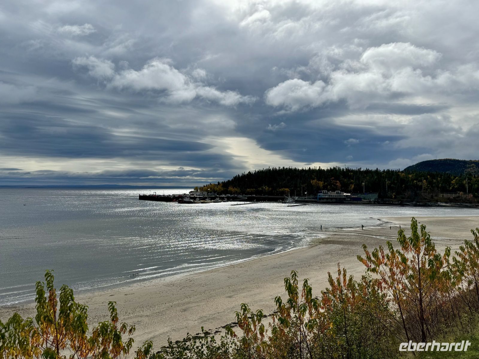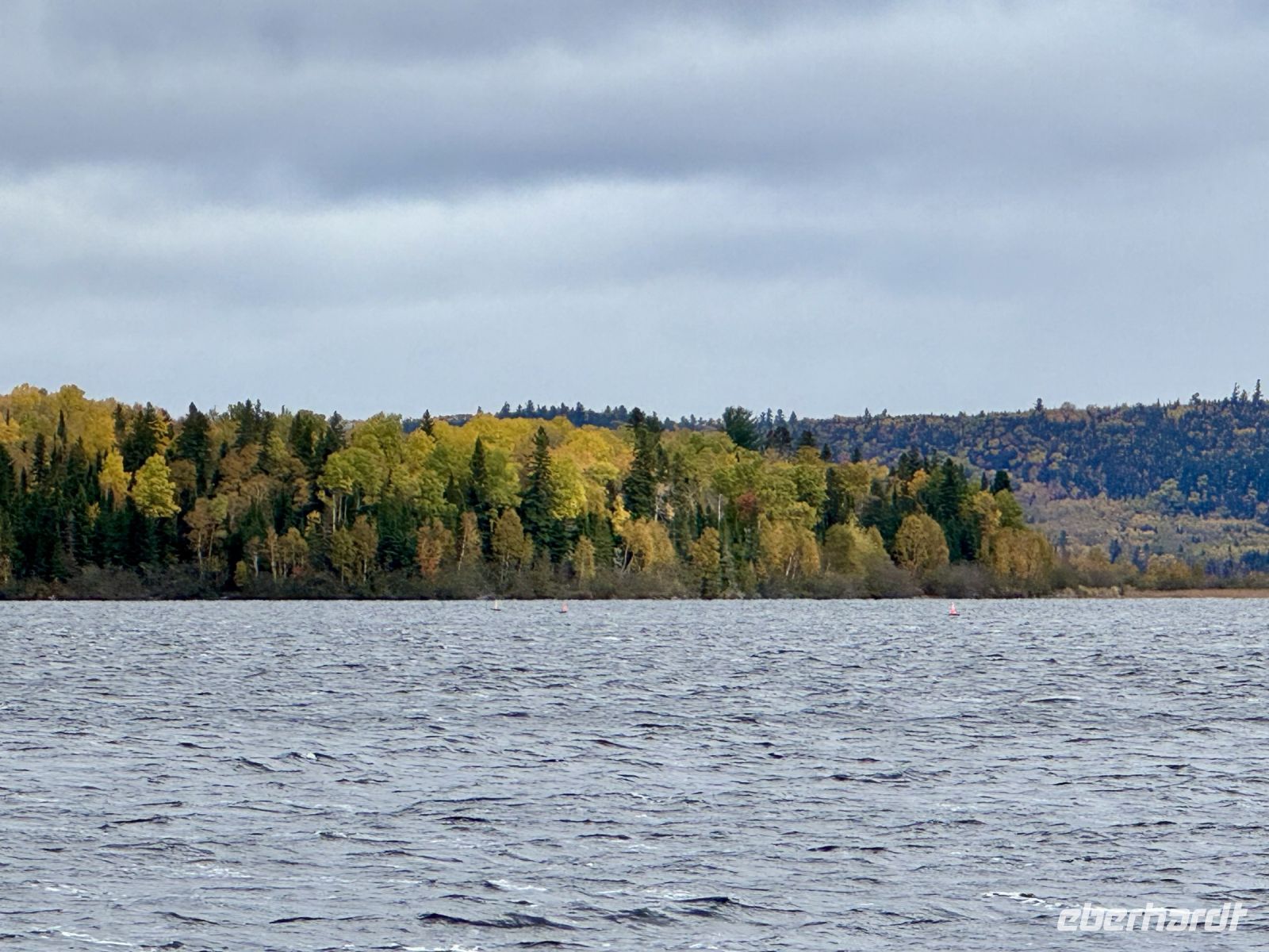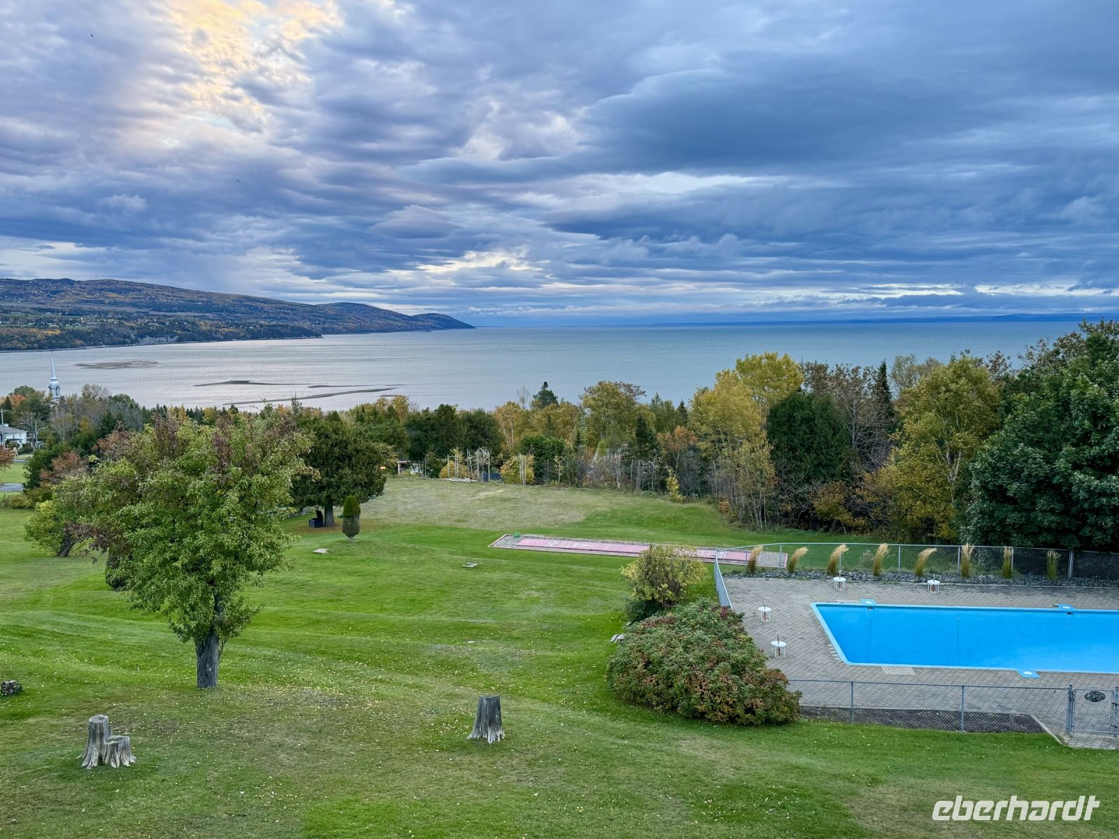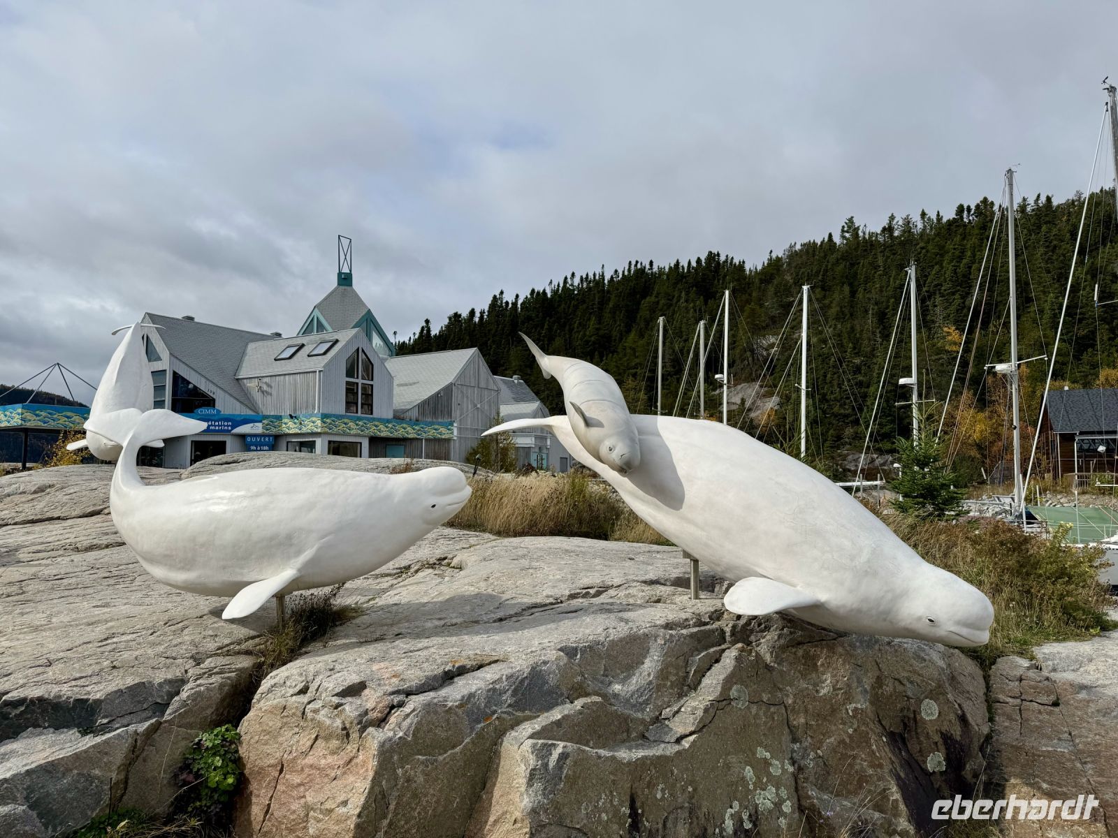 Der Tag beginnt mit stürmischen Winden und einigen kurzen Stromausfällen. Dafür hängen dramatische Wolkenformationen über der Bucht. Zunächst steht eine Fahrt nach Tadoussac auf dem Programm, wo wir das private Museum für Meeressäugetiere besuchen möchten. Gruselige Hexen und Berge von Kürbissen verwehren uns fast den Zutritt zum Supermarkt in La Malbaie, doch wir lassen uns nicht beirren und kaufen uns Proviant für die Mittagspause. Unterwegs wartet ein versprochener Fotostopp an einem See auf meine Gäste, die hier am Rastplatz die Laubfärbung des Indian Summer noch einmal sehr gut fotografieren können. Angesichts des starken Windes fällt es Jason heute gar nicht so leicht, den Bus in der Spur zu halten. Als wir am Fjord auf die Fähre warten und das schäumende Wasser sehen, machen wir uns schon ein bisschen Sorgen, ob wir später überhaupt mit dem Schiff hinausfahren können. Jason setzt uns an der Anlegestelle der malerischen sichelförmigen Bucht von Tadoussac ab und wir laufen erstmal zum Walmuseum. Zwei schöne Filme über das Leben der Belugas stimmen uns thematisch auf den Tag ein und sind etwas fürs Herz. Im Nachbarraum wartet eine Sammlung riesiger Walskelette auf uns — und das waren alles noch junge Tiere! Wie riesig sind dann erst ausgewachsene Exemplare? Leider werden diese sanften Riesen vor allem durch Fischernetze und Umweltverschmutzung durch uns Menschen bedroht, was uns unser freundlicher Guide nachdrücklich erklärt. Mit einer Licht- und Soundshow endet unser Besuch. Wer möchte, kann jedoch auch gern noch länger bleiben und die Exponate betrachten. Alternativ ist jetzt die Gelegenheit für einen Spaziergang entlang der Uferpromenade zum altehrwürdigen Hotel Tadoussac und zurück bzw. die Mittagspause. Fast die Hälfte der Gruppe wärmt sich nach einer Weile mit mir in einem kleinen Café bei Tee, Kaffee oder einer heißen Schokolade erstmal wieder auf. Unsere Walbeobachtung auf dem Sankt-Lorenz-Strom findet dann tatsächlich auch statt — das ist erstmal die gute Nachricht. Und es schaukelt und ruckelt trotz des weiterhin starken Windes weniger heftig als befürchtet — die zweite gute Nachricht. Allerdings machen es die Wellen schwierig für uns, die Wale überhaupt zu finden. Außerdem halten wir es draußen auf dem offenen Deck immer nur wenige Minuten aus und flüchten dann schnell wieder hinein hinter die großen Glasscheiben. So bleibt jedenfalls die „Ausbeute“ nach drei Stunden Fahrt auf dem Sankt-Lorenz-Strom insgesamt recht mager: ein oder zwei Zwergwale und zwei Belugas wurden kurz gesichtet, eventuell auch eine Robbe. Ein bisschen enttäuschend für meine Gäste, die sich natürlich mehr erhofft haben. Immerhin klart es im Laufe des Nachmittags immer mehr auf und der Kapitän kann uns ein bisschen die landschaftliche Schönheit des Saguenay-Fjords zeigen, bevor wir in Baie Sainte-Catherine von Bord gehen. Jason erwartet uns natürlich mit einem frisch gefegten Bus. Teils entlang der Küste und teils durch herbstliche Wälder mit lieblichen Seen geht es wieder zurück nach La Malbaie. Vor der Rückkehr ins Hotel fahren wir dort noch am Fairmont-Hotel und am Casino vorbei — falls jemand später auf den Spuren von „The Donald“ und Miss Merkel wandeln bzw. sein Glück im Spiel versuchen will. Das Abendessen ist geschmacklich wieder ein Traum, obwohl es heute leider keinen Schokoladenkuchen gibt …