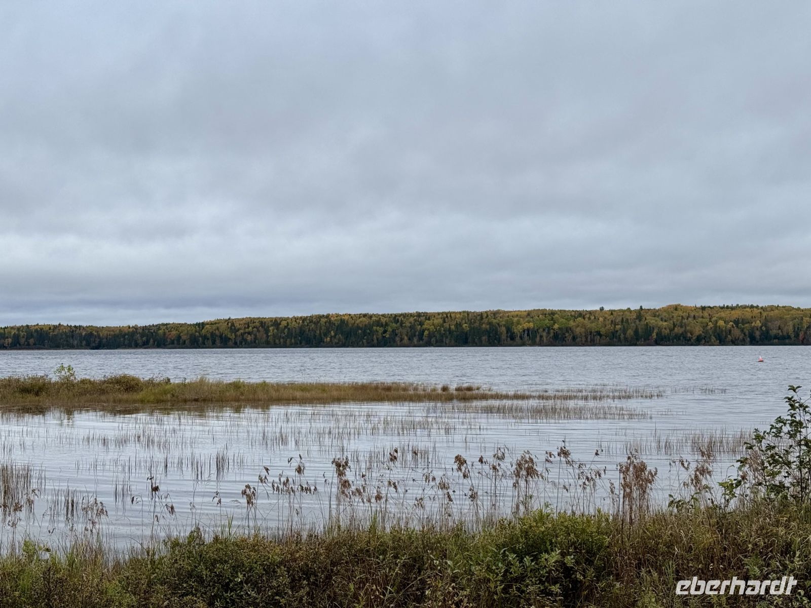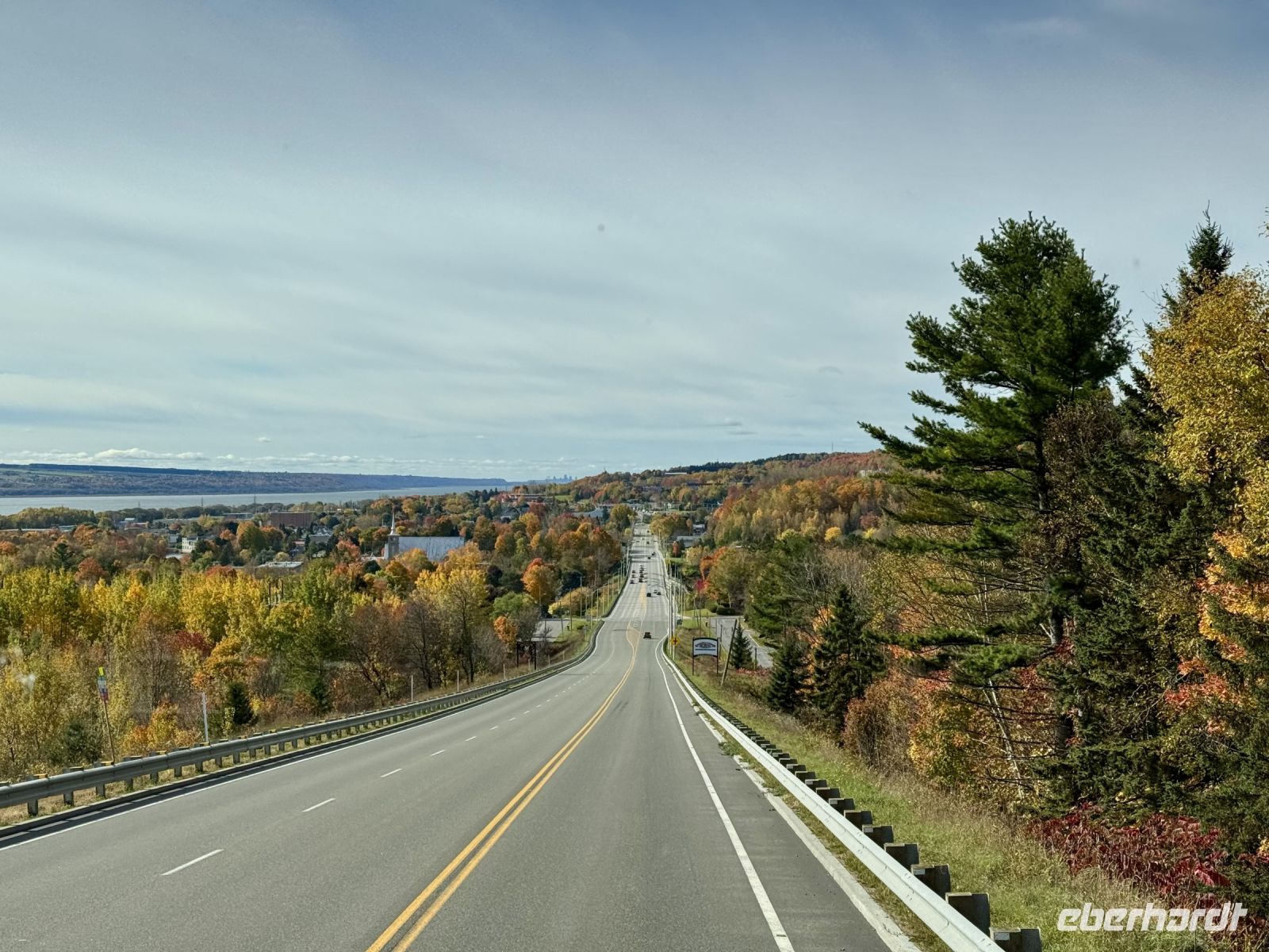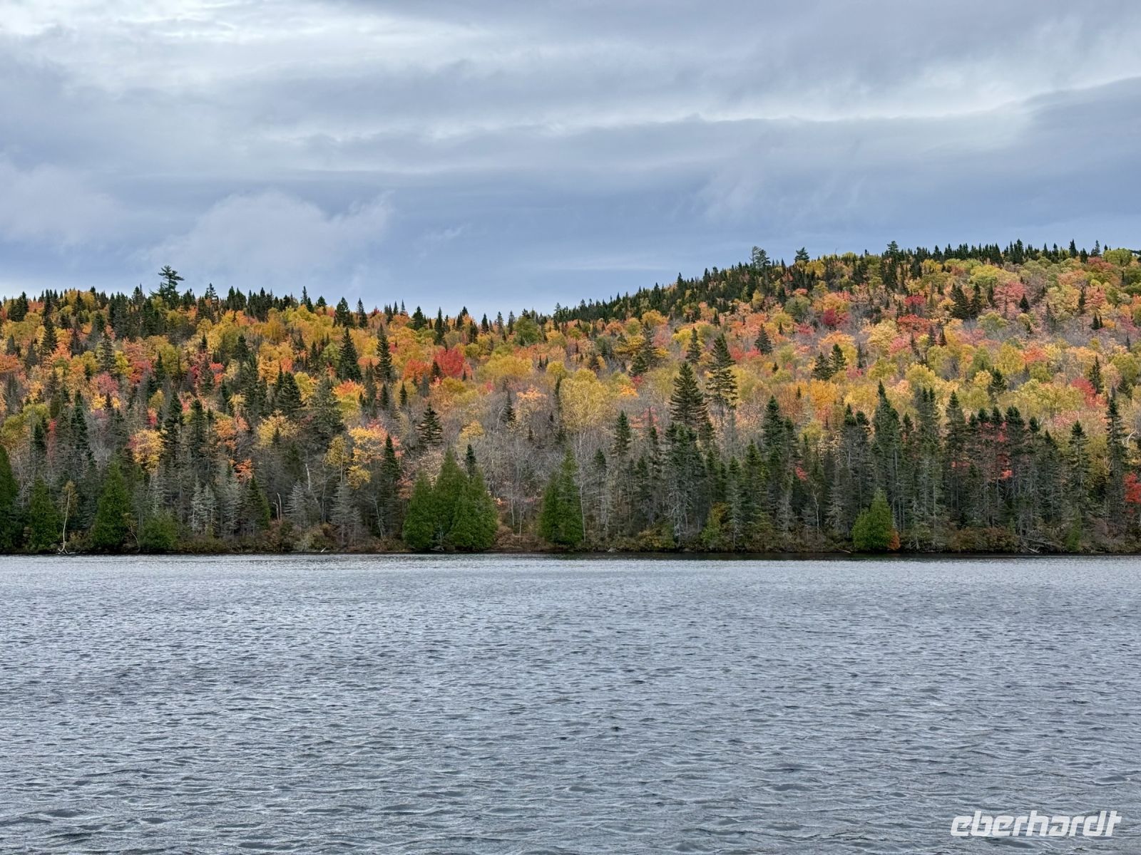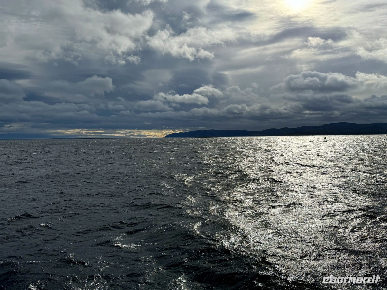 Der Tag beginnt mit stürmischen Winden und einigen kurzen Stromausfällen. Dafür hängen dramatische Wolkenformationen über der Bucht. Zunächst steht eine Fahrt nach Tadoussac auf dem Programm, wo wir das private Museum für Meeressäugetiere besuchen möchten. Gruselige Hexen und Berge von Kürbissen verwehren uns fast den Zutritt zum Supermarkt in La Malbaie, doch wir lassen uns nicht beirren und kaufen uns Proviant für die Mittagspause. Unterwegs wartet ein versprochener Fotostopp an einem See auf meine Gäste, die hier am Rastplatz die Laubfärbung des Indian Summer noch einmal sehr gut fotografieren können. Angesichts des starken Windes fällt es Jason heute gar nicht so leicht, den Bus in der Spur zu halten. Als wir am Fjord auf die Fähre warten und das schäumende Wasser sehen, machen wir uns schon ein bisschen Sorgen, ob wir später überhaupt mit dem Schiff hinausfahren können. Jason setzt uns an der Anlegestelle der malerischen sichelförmigen Bucht von Tadoussac ab und wir laufen erstmal zum Walmuseum. Zwei schöne Filme über das Leben der Belugas stimmen uns thematisch auf den Tag ein und sind etwas fürs Herz. Im Nachbarraum wartet eine Sammlung riesiger Walskelette auf uns — und das waren alles noch junge Tiere! Wie riesig sind dann erst ausgewachsene Exemplare? Leider werden diese sanften Riesen vor allem durch Fischernetze und Umweltverschmutzung durch uns Menschen bedroht, was uns unser freundlicher Guide nachdrücklich erklärt. Mit einer Licht- und Soundshow endet unser Besuch. Wer möchte, kann jedoch auch gern noch länger bleiben und die Exponate betrachten. Alternativ ist jetzt die Gelegenheit für einen Spaziergang entlang der Uferpromenade zum altehrwürdigen Hotel Tadoussac und zurück bzw. die Mittagspause. Fast die Hälfte der Gruppe wärmt sich nach einer Weile mit mir in einem kleinen Café bei Tee, Kaffee oder einer heißen Schokolade erstmal wieder auf. Unsere Walbeobachtung auf dem Sankt-Lorenz-Strom findet dann tatsächlich auch statt — das ist erstmal die gute Nachricht. Und es schaukelt und ruckelt trotz des weiterhin starken Windes weniger heftig als befürchtet — die zweite gute Nachricht. Allerdings machen es die Wellen schwierig für uns, die Wale überhaupt zu finden. Außerdem halten wir es draußen auf dem offenen Deck immer nur wenige Minuten aus und flüchten dann schnell wieder hinein hinter die großen Glasscheiben. So bleibt jedenfalls die „Ausbeute“ nach drei Stunden Fahrt auf dem Sankt-Lorenz-Strom insgesamt recht mager: ein oder zwei Zwergwale und zwei Belugas wurden kurz gesichtet, eventuell auch eine Robbe. Ein bisschen enttäuschend für meine Gäste, die sich natürlich mehr erhofft haben. Immerhin klart es im Laufe des Nachmittags immer mehr auf und der Kapitän kann uns ein bisschen die landschaftliche Schönheit des Saguenay-Fjords zeigen, bevor wir in Baie Sainte-Catherine von Bord gehen. Jason erwartet uns natürlich mit einem frisch gefegten Bus. Teils entlang der Küste und teils durch herbstliche Wälder mit lieblichen Seen geht es wieder zurück nach La Malbaie. Vor der Rückkehr ins Hotel fahren wir dort noch am Fairmont-Hotel und am Casino vorbei — falls jemand später auf den Spuren von „The Donald“ und Miss Merkel wandeln bzw. sein Glück im Spiel versuchen will. Das Abendessen ist geschmacklich wieder ein Traum, obwohl es heute leider keinen Schokoladenkuchen gibt …