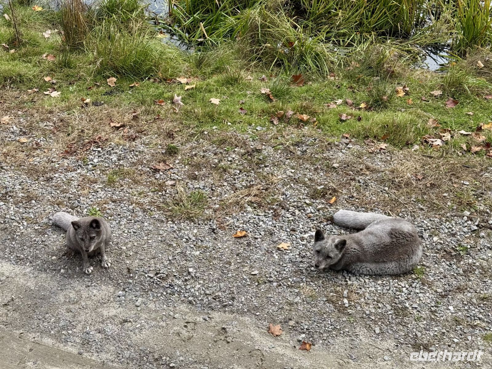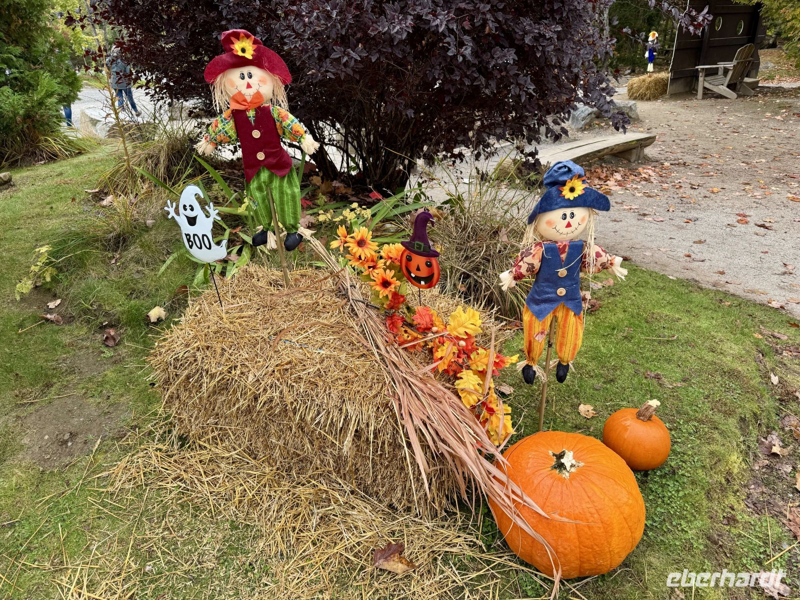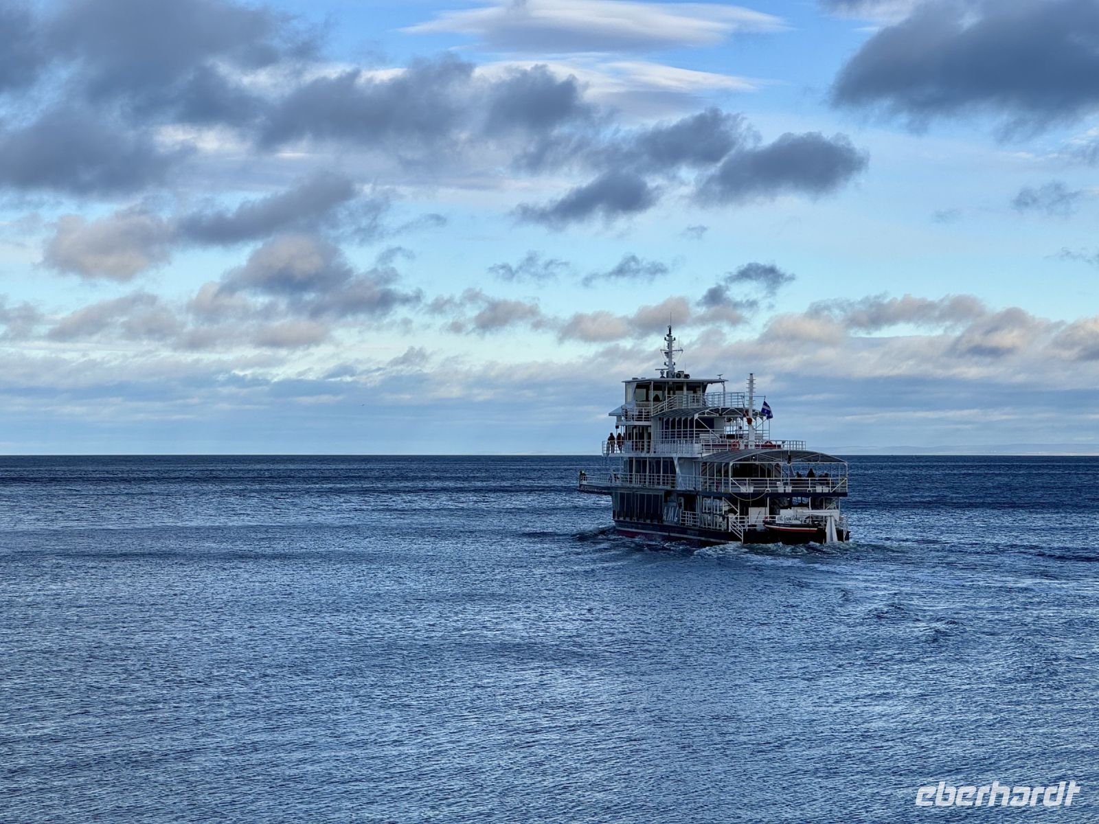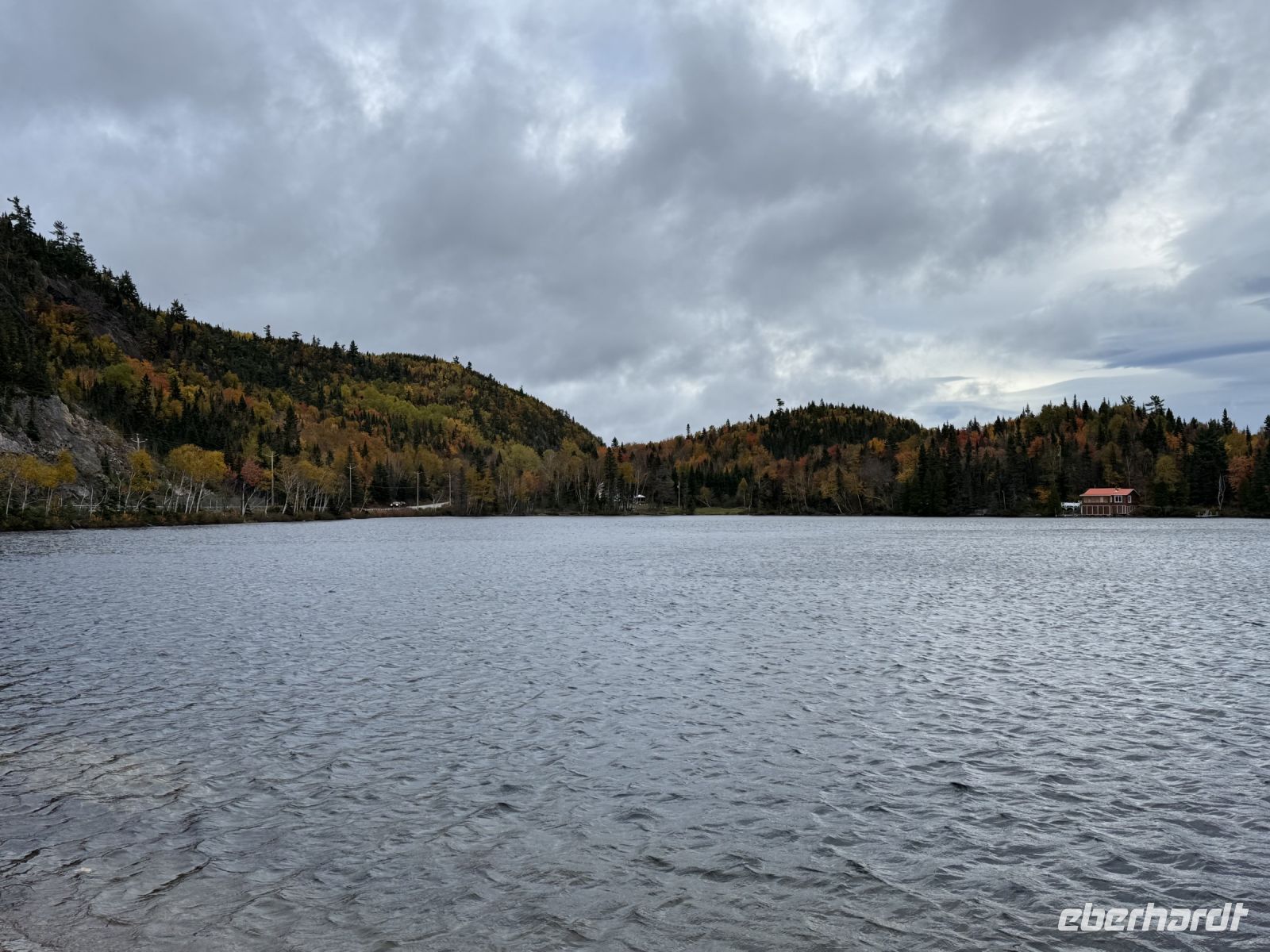 Der Tag beginnt mit stürmischen Winden und einigen kurzen Stromausfällen. Dafür hängen dramatische Wolkenformationen über der Bucht. Zunächst steht eine Fahrt nach Tadoussac auf dem Programm, wo wir das private Museum für Meeressäugetiere besuchen möchten. Gruselige Hexen und Berge von Kürbissen verwehren uns fast den Zutritt zum Supermarkt in La Malbaie, doch wir lassen uns nicht beirren und kaufen uns Proviant für die Mittagspause. Unterwegs wartet ein versprochener Fotostopp an einem See auf meine Gäste, die hier am Rastplatz die Laubfärbung des Indian Summer noch einmal sehr gut fotografieren können. Angesichts des starken Windes fällt es Jason heute gar nicht so leicht, den Bus in der Spur zu halten. Als wir am Fjord auf die Fähre warten und das schäumende Wasser sehen, machen wir uns schon ein bisschen Sorgen, ob wir später überhaupt mit dem Schiff hinausfahren können. Jason setzt uns an der Anlegestelle der malerischen sichelförmigen Bucht von Tadoussac ab und wir laufen erstmal zum Walmuseum. Zwei schöne Filme über das Leben der Belugas stimmen uns thematisch auf den Tag ein und sind etwas fürs Herz. Im Nachbarraum wartet eine Sammlung riesiger Walskelette auf uns — und das waren alles noch junge Tiere! Wie riesig sind dann erst ausgewachsene Exemplare? Leider werden diese sanften Riesen vor allem durch Fischernetze und Umweltverschmutzung durch uns Menschen bedroht, was uns unser freundlicher Guide nachdrücklich erklärt. Mit einer Licht- und Soundshow endet unser Besuch. Wer möchte, kann jedoch auch gern noch länger bleiben und die Exponate betrachten. Alternativ ist jetzt die Gelegenheit für einen Spaziergang entlang der Uferpromenade zum altehrwürdigen Hotel Tadoussac und zurück bzw. die Mittagspause. Fast die Hälfte der Gruppe wärmt sich nach einer Weile mit mir in einem kleinen Café bei Tee, Kaffee oder einer heißen Schokolade erstmal wieder auf. Unsere Walbeobachtung auf dem Sankt-Lorenz-Strom findet dann tatsächlich auch statt — das ist erstmal die gute Nachricht. Und es schaukelt und ruckelt trotz des weiterhin starken Windes weniger heftig als befürchtet — die zweite gute Nachricht. Allerdings machen es die Wellen schwierig für uns, die Wale überhaupt zu finden. Außerdem halten wir es draußen auf dem offenen Deck immer nur wenige Minuten aus und flüchten dann schnell wieder hinein hinter die großen Glasscheiben. So bleibt jedenfalls die „Ausbeute“ nach drei Stunden Fahrt auf dem Sankt-Lorenz-Strom insgesamt recht mager: ein oder zwei Zwergwale und zwei Belugas wurden kurz gesichtet, eventuell auch eine Robbe. Ein bisschen enttäuschend für meine Gäste, die sich natürlich mehr erhofft haben. Immerhin klart es im Laufe des Nachmittags immer mehr auf und der Kapitän kann uns ein bisschen die landschaftliche Schönheit des Saguenay-Fjords zeigen, bevor wir in Baie Sainte-Catherine von Bord gehen. Jason erwartet uns natürlich mit einem frisch gefegten Bus. Teils entlang der Küste und teils durch herbstliche Wälder mit lieblichen Seen geht es wieder zurück nach La Malbaie. Vor der Rückkehr ins Hotel fahren wir dort noch am Fairmont-Hotel und am Casino vorbei — falls jemand später auf den Spuren von „The Donald“ und Miss Merkel wandeln bzw. sein Glück im Spiel versuchen will. Das Abendessen ist geschmacklich wieder ein Traum, obwohl es heute leider keinen Schokoladenkuchen gibt …