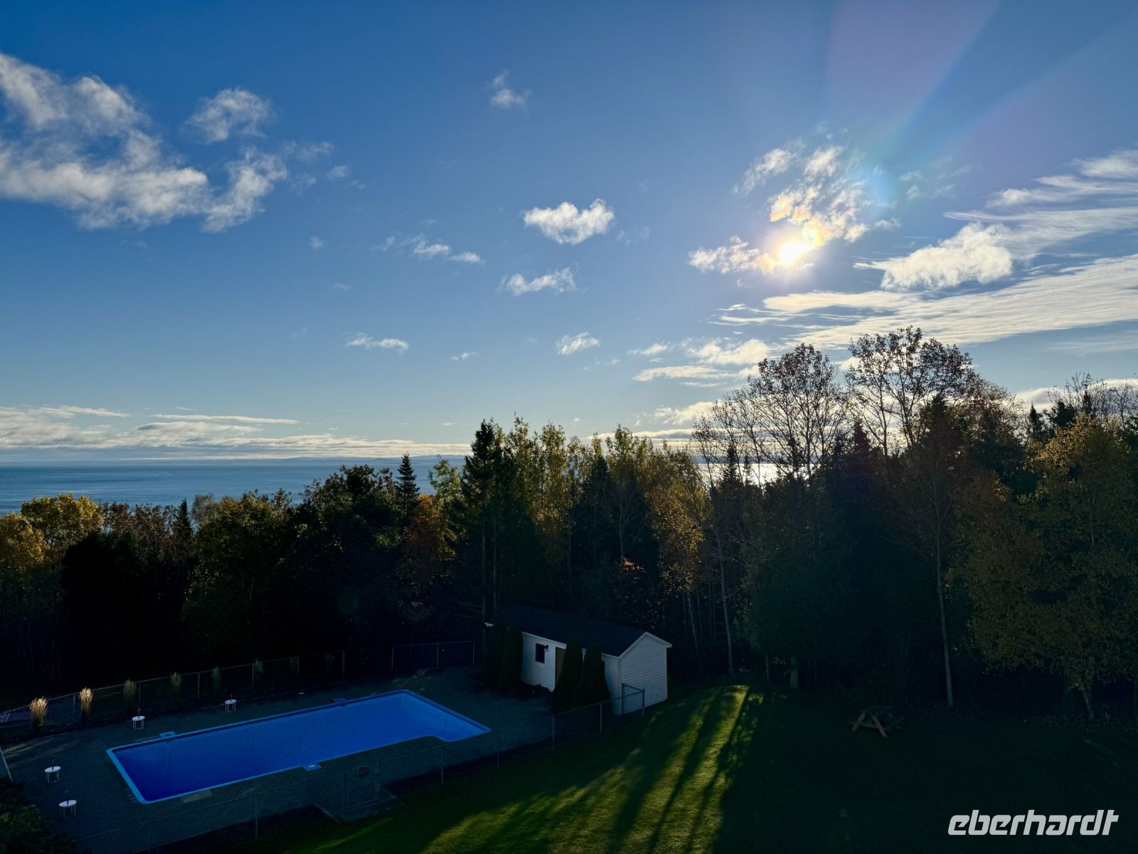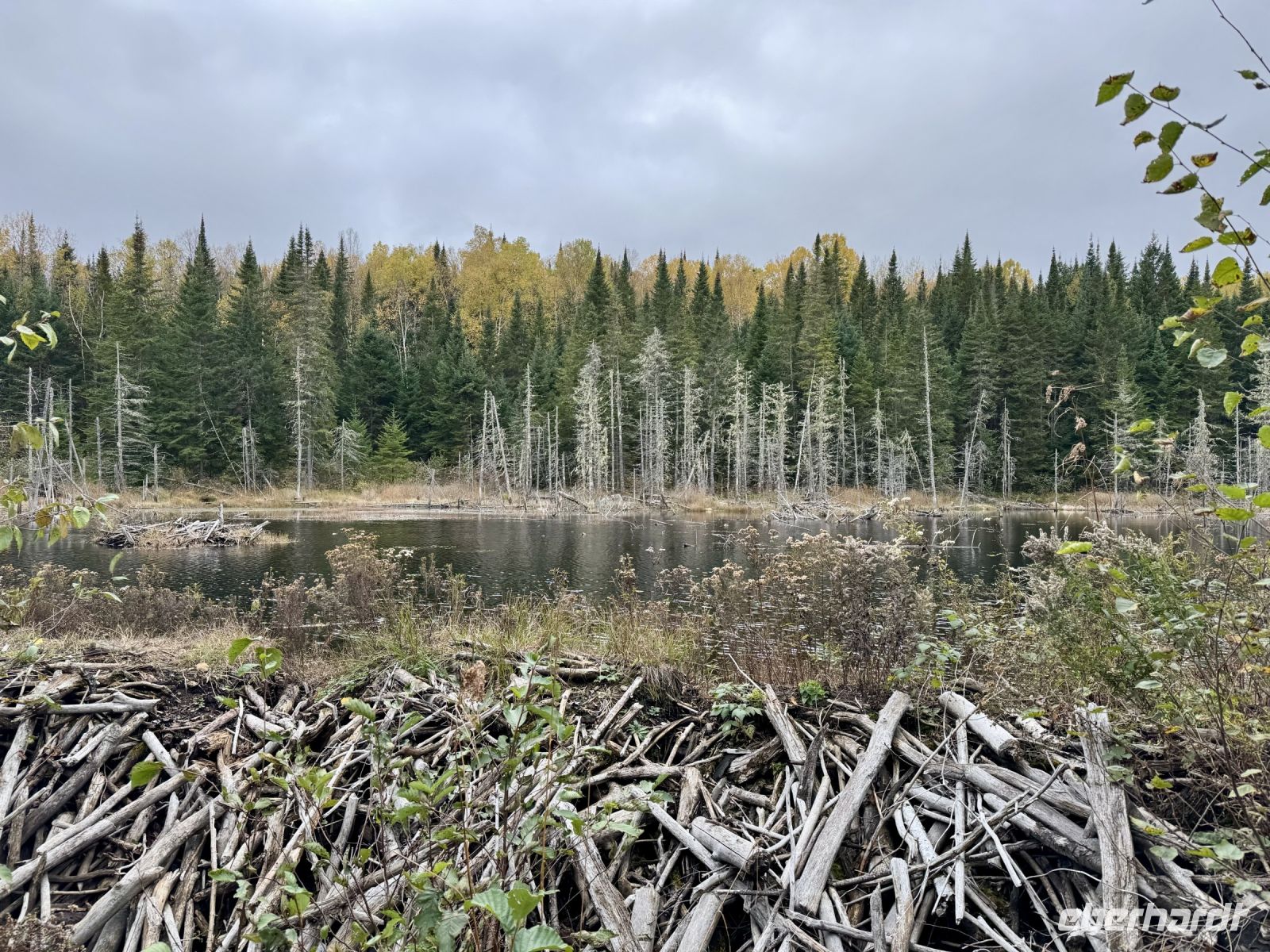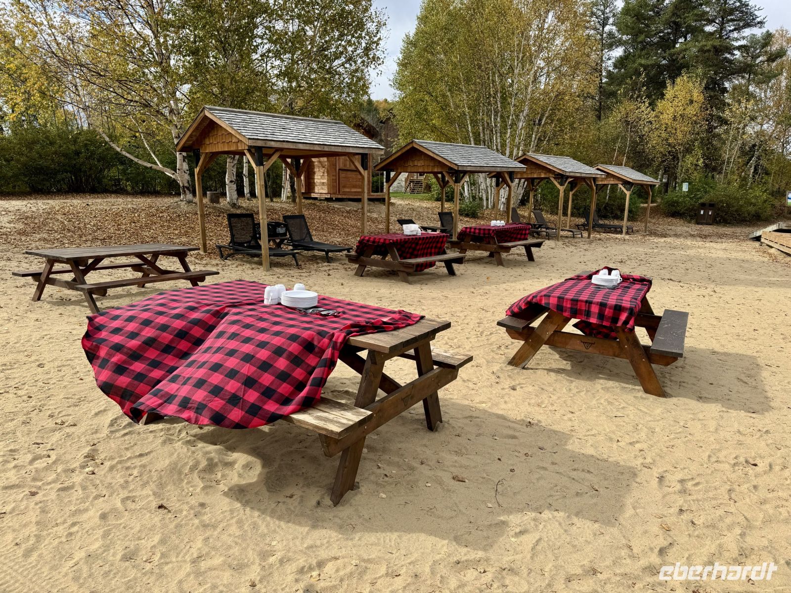 Es ist auch schön, einmal ganz ruhig und gemütlich in den Tag zu starten, sich ausgiebig durch das gute Frühstücksbuffet zu schlemmen und hinaus auf den See und den Wald zu blicken. Für 10 Uhr biete ich einen Waldspaziergang an, neuerdings auch Waldbaden genannt, an dem zu meiner Überraschung die ganze Gruppe geschlossen teilnimmt. Vielleicht haben sie auch nur alle Angst, dass mich der Bär holt, wenn ich alleine losziehe. Wir beginnen am Ufer des Lac Taureau und folgen dann dem Pfad ins Unterholz. Um uns herum der herbstliche Wald, grün, gelb, hier und da ein bisschen rot. Auf einem kleinen Teich zwei Enten, ab und zu ist der Ruf der Kanadagänse zu hören oder das Trillern eines Streifenhörnchens. Auf dem Rückweg kommen wir am Biberdamm vorbei. Die fleißigen Erbauer scheinen nicht zuhause zu sein, weder hier noch im „Neubaugebiet“ nebenan. Es ist kaum zu begreifen, wie so kleine Tierchen so große Bauwerke errichten können; der größte Biberdamm in Kanada ist 850 Meter lang. Nun sind wir schon fast zurück am Hotel. Freundlicherweise wurden für uns Picknicktische am Seeufer gedeckt. Angesichts des Windes und der Temperaturen ziehen wir jedoch lieber in den Loungebereich um. Wir holen unsere Einkäufe von unseren Zimmern und treffen uns kurze Zeit später zum gemeinsamen Mittagessen und Klönen. Von der Bar bekommen wir Tee oder Kaffee zum Aufwärmen. Den weiteren Nachmittag verbringen alle individuell mit einem weiteren Spaziergang, einem Besuch im Schwimmbad mit Whirlpool und/oder einfach einem kleinen Nickerchen auf dem Zimmer. Zum Abendessen finden wir uns im gemütlichen rustikalen Speisesaal unserer Herberge zusammen und lassen uns erneut mit einem leckeren 3-Gänge-Menü verwöhnen. Nach diesem entspannten Erholungstag sind wir innerlich gerüstet und bereit für die weitere Erkundung der schönen Provinz Québec.