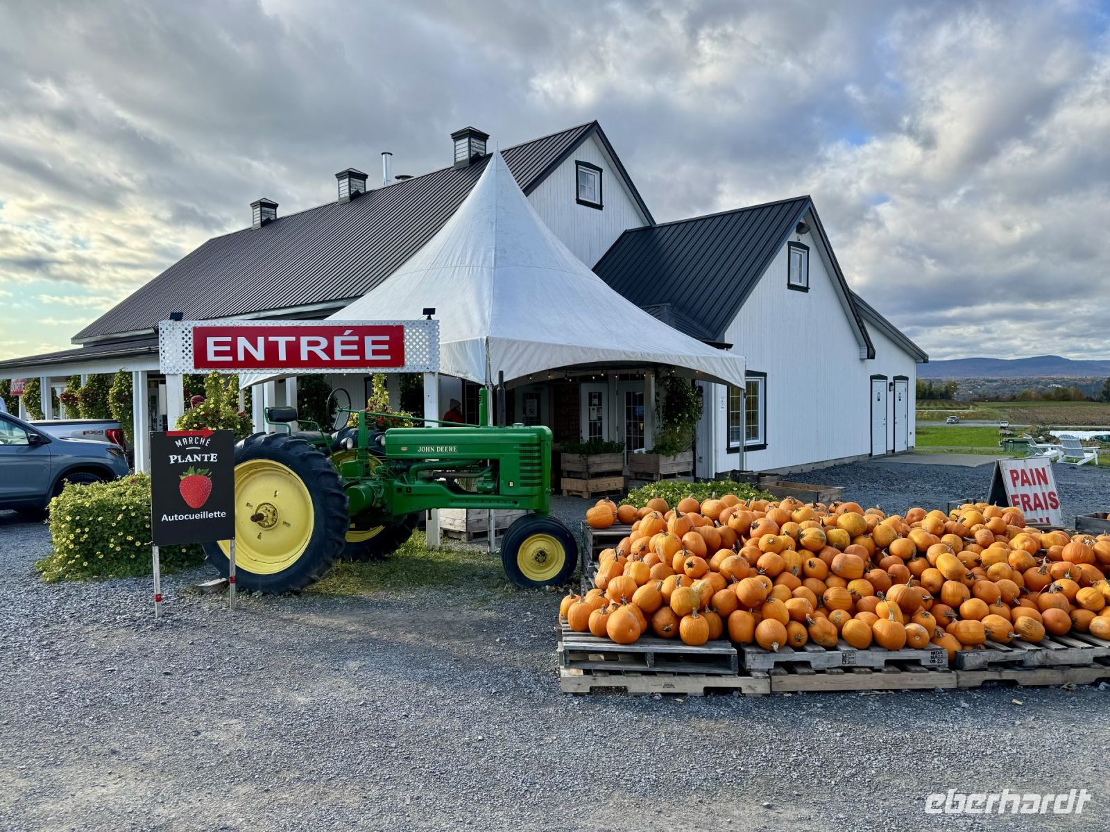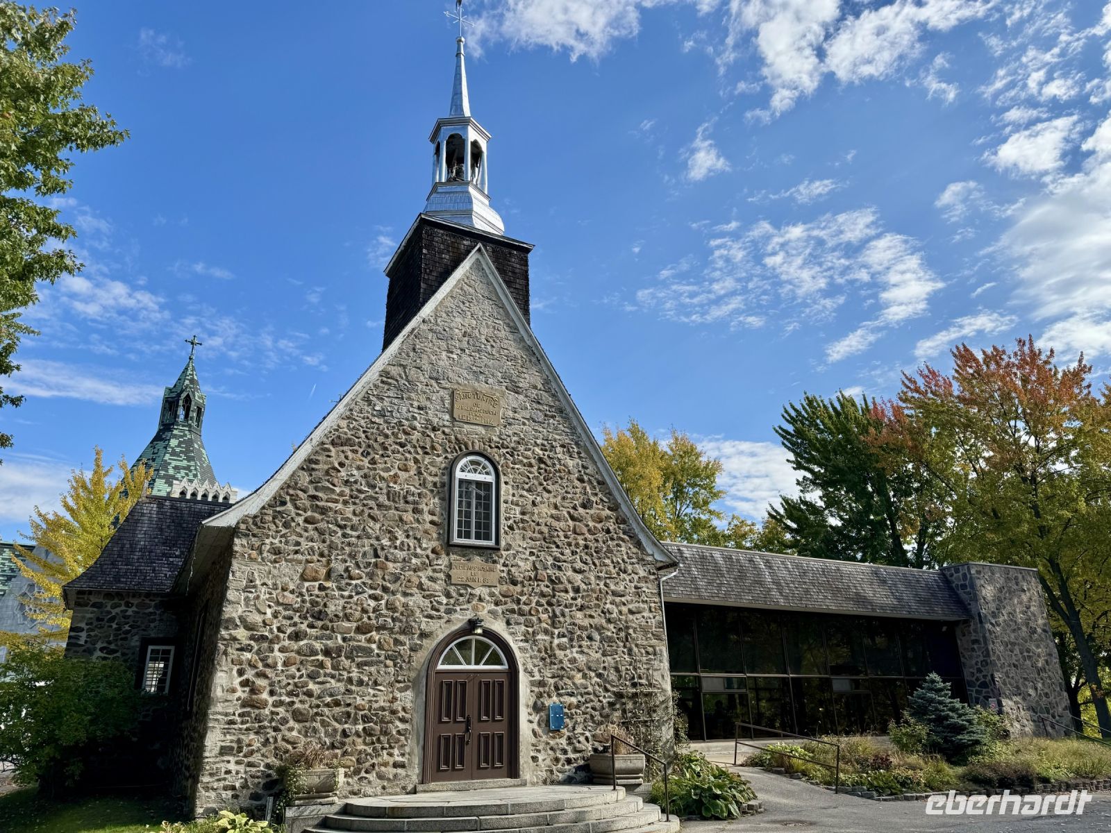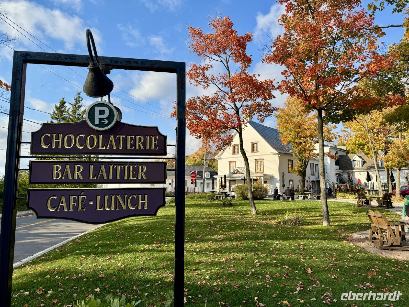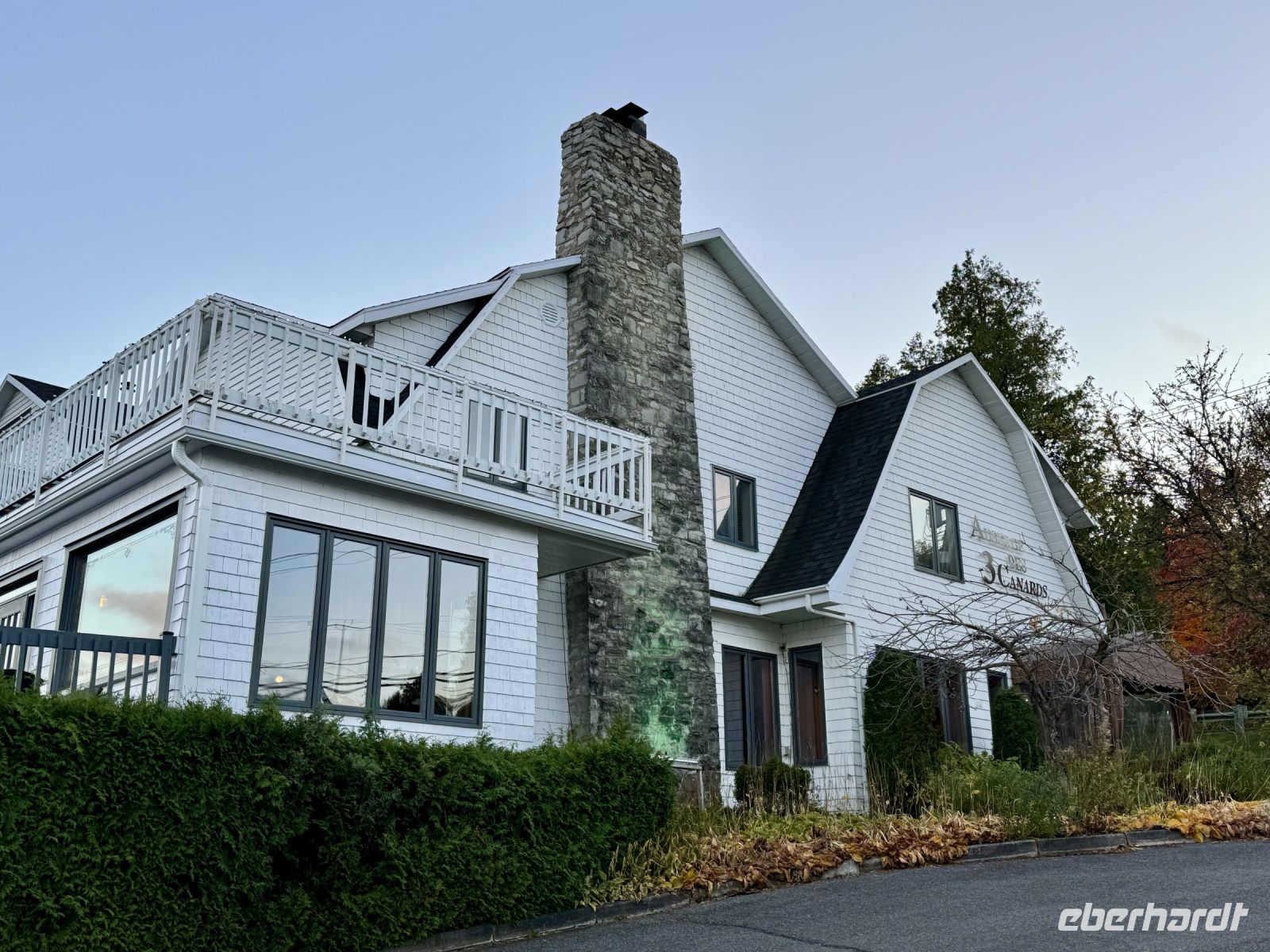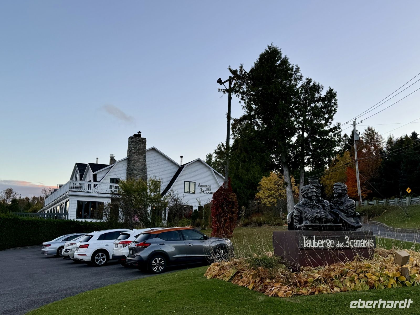 Zwei erholsame Nächte haben wir in unserem Refugium am Lac Taureau verbracht und wurden dabei gut verpflegt. Bevor sich meine Gäste zu sehr an das Urlaubs-Lotterleben gewöhnen können, wird heute mal wieder schon um halb neun zum allgemeinen Aufbruch geblasen. Wir müssen zurück an den Sankt-Lorenz-Strom und dann weiter bis nach La Malbaie. Eine lange Fahrstrecke, die aber immer wieder durch kleine und große Stopps unterbrochen wird. Der erste Kaffeestopp nach ca. 1,5 Stunden Fahrt durch liebliche Täler und Schluchten ist vor allem für unseren Jason gedacht, der bei Tim Hortons in Saint-Félix-de-Valois seine Entzugserscheinungen bekämpfen kann. Statt wieder nach Montréal zurückzufahren, biegen wir hier aber in Richtung Trois-Rivières ab, wo wir am Sanctuaire Notre-Dame du Cap direkt am Wasser die nächste Pause machen und vergeblich hoffen, ebenfalls ein Wunder zu erleben. Entlang der ältesten Straße Kanadas, dem Chemin du Roy, geht es nun durch hübsche kleine Ortschaften mit sehr schönen Häusern. Um uns nicht zu sehr in diese hübsche Gegend zu verlieben, biegen wir nach einer Weile wieder ab und fahren auf dem großen, breiten Highway 40 vorbei an der Provinzhauptstadt Québec bis zu den Montmorency Falls. Sie sind zwar nicht so breit wie die Niagarafälle, aber etwa 30 Meter höher und damit ebenfalls sehr beeindruckend. Vor allem zum Indian Summer sind sie und der umliegende Park immer einen Abstecher wert. Da Québec das weltweite Zentrum der Ahornsirupproduktion ist, hat uns Eberhardt natürlich einen Besuch bei einem „Sugar Shack“ organisiert. Dieser befindet sich auf der lang gezogenen Île d’Orléans im Sankt-Lorenz-Strom. Über eine große Stahlbrücke gelangen wir von den Wasserfällen auf die Insel. Beim Sugar Shack wartet eine gut gemachte, informative Videopräsentation auf uns. Anschließend dürfen wir den produzierten Ahornsirup kosten und uns auf kaltem Schnee unsere eigenen Ahornsirup-Lollis drehen. Zwischen den Bäumen hängen sogar noch die Schläuche, mit denen das Wasser aus dem Zuckerahorn abgezapft wird. Wenn wir schonmal auf der Insel sind, machen wir hier spontan noch eine kleine Rundfahrt, halten bei einem Obstmarkt — und bei einer Schokoladenfabrik, wo es wieder ganz leckeres Eis gibt: Sorbet, Gelato und Softeis mit einem ganz dicken Schokomantel. Göttlich! Und noch dazu die Aussicht auf das Wasser und die Silhouette von Québec! Zurück auf dem Festland halten wir nochmals an den Montmorency Falls, diesmal allerdings an der unteren Seilbahnstation, bevor wir schließlich in die hügelige Charlevoix-Region zu unserem vorletzten Hotel in La Malbaie aufbrechen. Die Auberge des 3 Canards erreichen wir am Abend nach einer Fahrt quer durch den Charlevoix-Krater. Inzwischen ist es dunkel, doch auch im Schein der Laternen und Lampen sehen die Häuschen hier sehr bezaubernd aus.