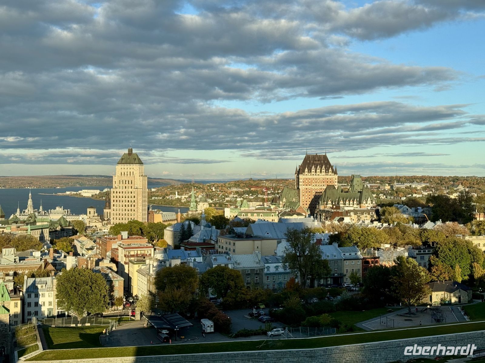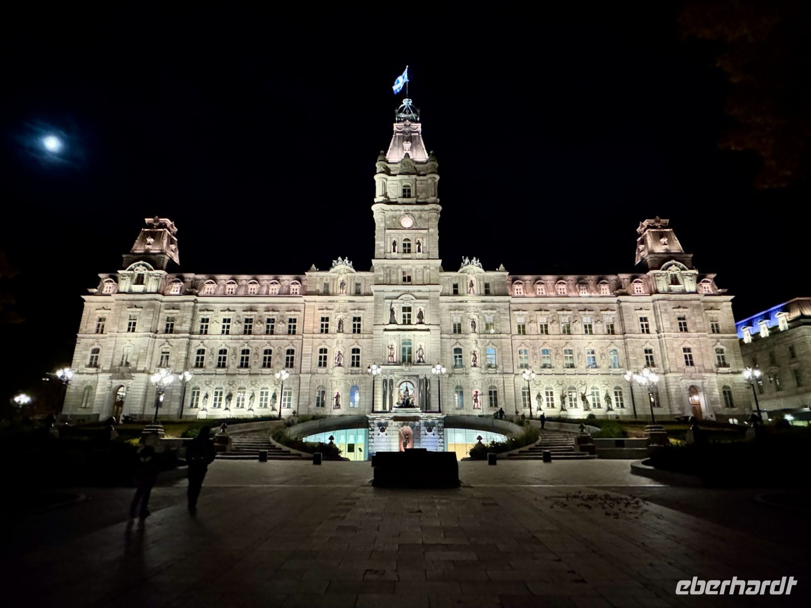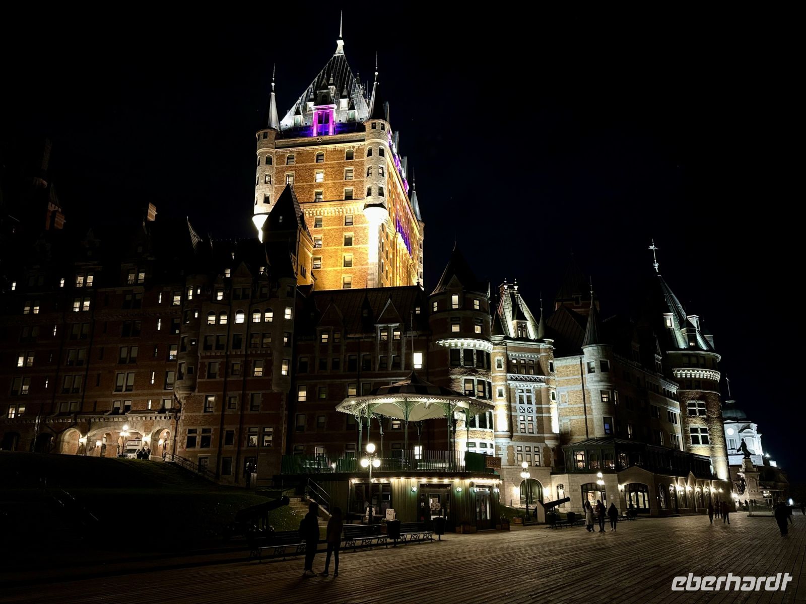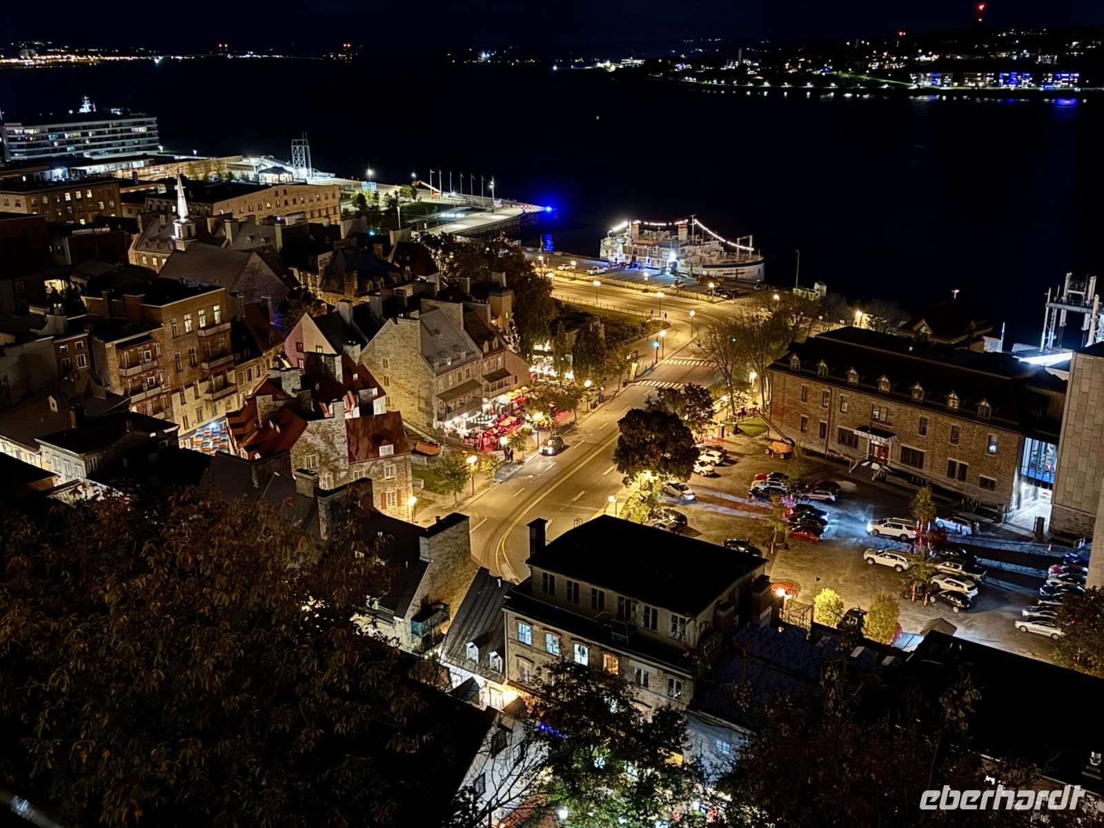 Der heutige Sonnenaufgang und Morgen entschädigt ein bisschen für den gestrigen stürmischen Tag. Auch hier wieder schade, dass wir weiterziehen müssen. Beim Frühstück genießen wir ein letztes Mal die Aussicht auf die Bucht von La Malbaie und sinnieren beim Toasten unseres Brotes im Kamin über die großen Fragen des Urlaubs. Die Rückfahrt nach Québec gestaltet sich als eine Fahrt durch den Indian Summer par excellence. Eine Symphonie an Farben zieht an uns vorbei. Beim Spaziergang durch den Canyon Sainte-Anne können wir den kanadischen Herbst (und natürlich auch den Canyon) aus der Wanderperspektive bewundern. Fast am schönsten ist die Farbenpracht jedoch vor und hinter der gewaltigen Basilique Sainte-Anne de Beaupré, unserem zweiten Etappenziel. Drinnen findet gerade die Sonntagsmesse statt und wir kommen damit sogar in den Genuss einer Darbietung franko-katholischer Kirchenmusik. Pünktlich zur Mittagszeit setzt uns Jason schließlich in der unteren Altstadt von Québec ab. Das ist es, unser letztes Reiseziel. An die vielen anderen Touristen müssen wir uns erst wieder gewöhnen — zwei oder drei Kreuzfahrtschiffe sind gerade in der Stadt. Wir schwärmen also erstmal aus, stürzen uns ins Getümmel und treffen uns pünktlich um 14 Uhr mit unserer Stadtführerin Nadia an der Batterie Royale. Sie führt uns zunächst durch den unteren Teil der UNESCO-geschützten Altstadt, zeigt uns die Place Royale, das berühmte Wandgemälde, die Halsbrechertreppe und die Einkaufsgasse Rue du Petit-Champlain. Für die zweite Hälfte der Erkundungstour rufen wir Jason herbei und wechseln in den Bus. Es stehen noch das Parlamentsgebäude, eine Fahrt über die Plains of Abraham mit Fotostopp am Fluss sowie ein Abstecher zum Château Frontenac auf Nadias Programm. Allerdings kommen wir dann in der oberen Altstadt nur quälend langsam voran, weshalb ein Ausstieg am berühmtesten Eisenbahnhotel entfallen muss. Stattdessen wird unser eigenes Hotel zum nächsten Ziel. Das Hilton Hotel liegt gleich neben dem Parlament und knapp außerhalb der Stadtmauer. Die Panoramafenster in unseren Zimmern bieten uns allen eine tolle Aussicht. Zeit für einen kurzen Bummel bleibt uns ebenfalls. Unser Abschiedsabendessen findet dann in der oberen Altstadt statt. Hier ist immer noch viel los, an mehreren Stellen zeigen Tänzer und Artisten ihr Können. Für das letzte gemeinsame Abendessen stehen sogar vier Gänge auf dem Programm! Verhungert ist mir jedenfalls auf dieser Reise niemand! Mit einigen Gästen gehe ich anschließend noch spontan bis zum Château Frontenac spazieren. Es ist nun merklich ruhiger als noch am Tage — und auch wir kommen langsam zur Ruhe, nachdem wir auf dem Rückweg auch noch einen Abstecher zum schön beleuchteten Parlament gemacht haben und einige der angefutterten Kalorien (hoffentlich) wieder verbrannt haben.