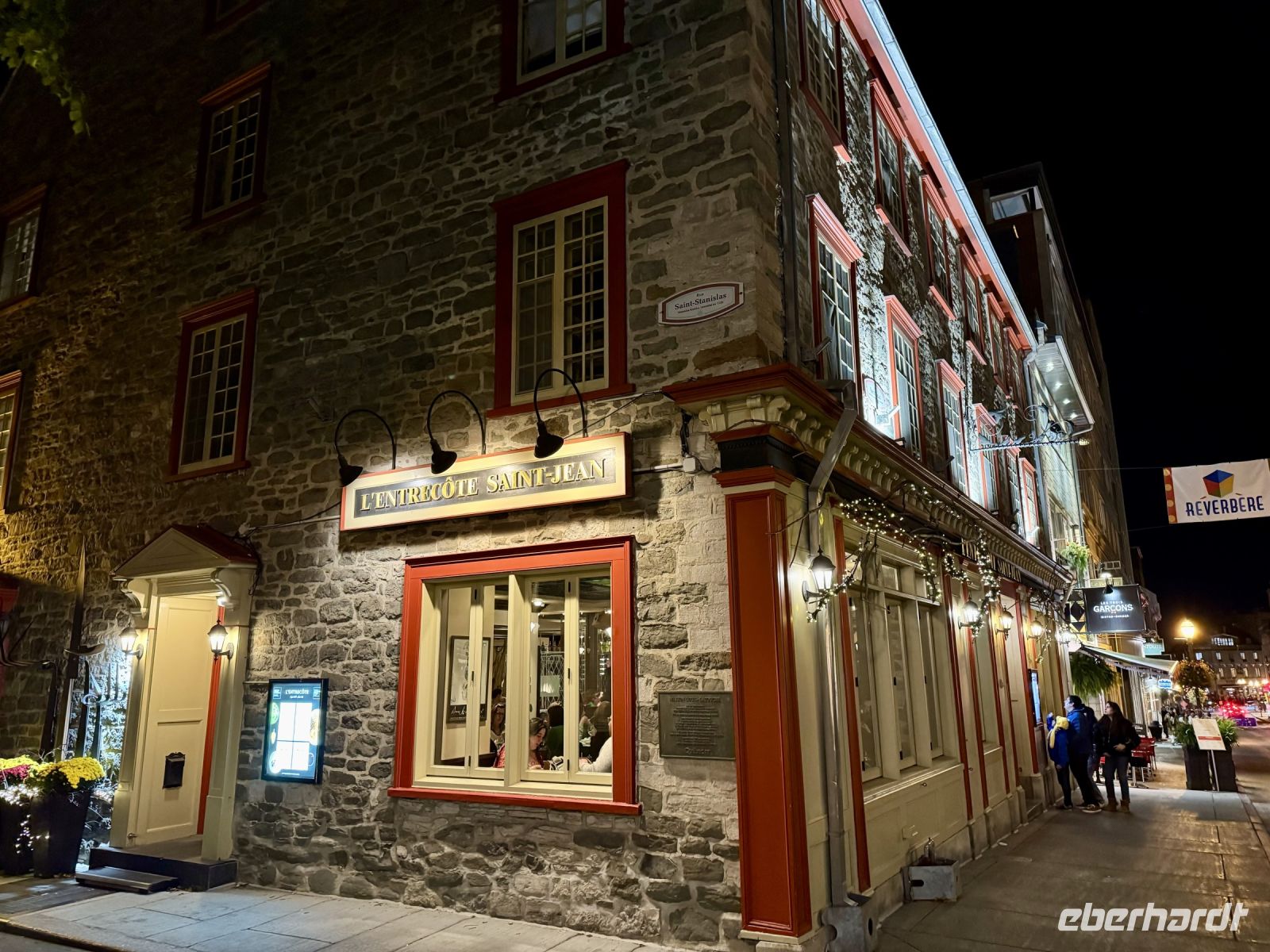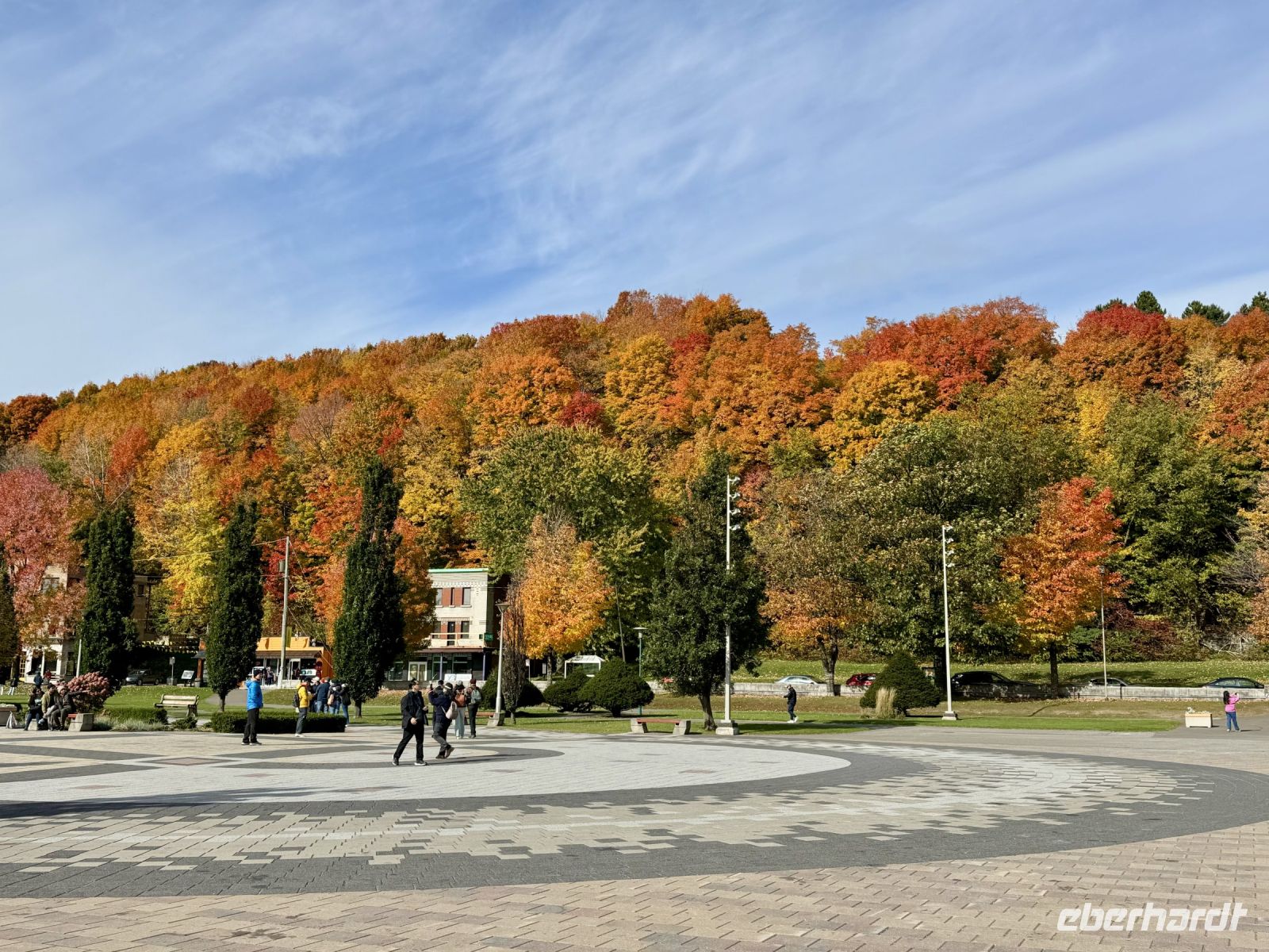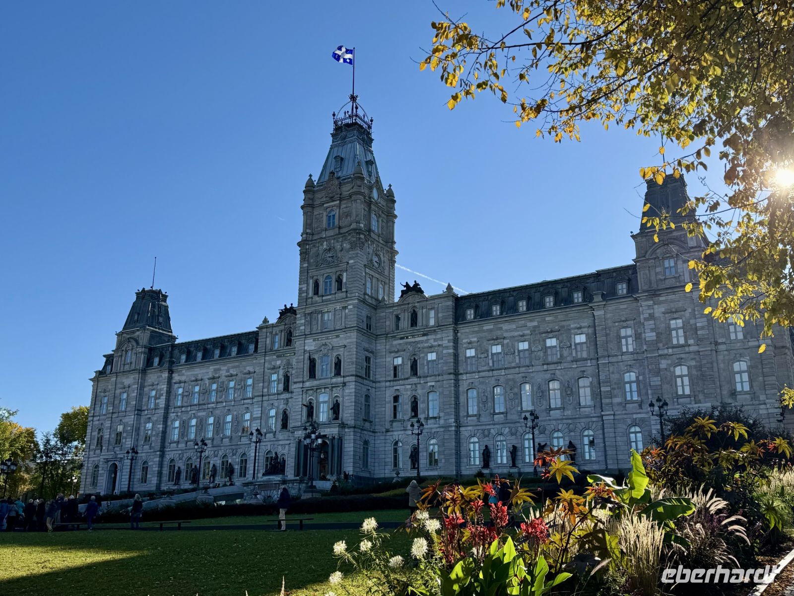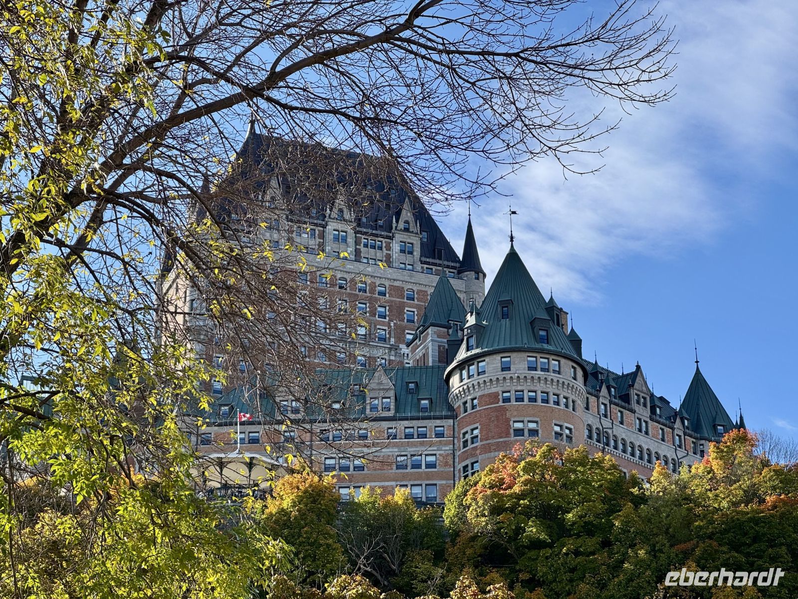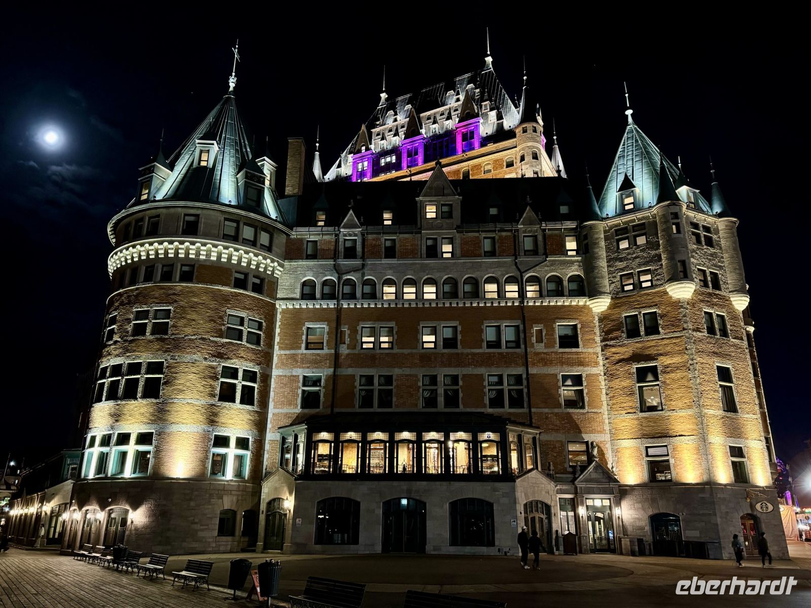 Der heutige Sonnenaufgang und Morgen entschädigt ein bisschen für den gestrigen stürmischen Tag. Auch hier wieder schade, dass wir weiterziehen müssen. Beim Frühstück genießen wir ein letztes Mal die Aussicht auf die Bucht von La Malbaie und sinnieren beim Toasten unseres Brotes im Kamin über die großen Fragen des Urlaubs. Die Rückfahrt nach Québec gestaltet sich als eine Fahrt durch den Indian Summer par excellence. Eine Symphonie an Farben zieht an uns vorbei. Beim Spaziergang durch den Canyon Sainte-Anne können wir den kanadischen Herbst (und natürlich auch den Canyon) aus der Wanderperspektive bewundern. Fast am schönsten ist die Farbenpracht jedoch vor und hinter der gewaltigen Basilique Sainte-Anne de Beaupré, unserem zweiten Etappenziel. Drinnen findet gerade die Sonntagsmesse statt und wir kommen damit sogar in den Genuss einer Darbietung franko-katholischer Kirchenmusik. Pünktlich zur Mittagszeit setzt uns Jason schließlich in der unteren Altstadt von Québec ab. Das ist es, unser letztes Reiseziel. An die vielen anderen Touristen müssen wir uns erst wieder gewöhnen — zwei oder drei Kreuzfahrtschiffe sind gerade in der Stadt. Wir schwärmen also erstmal aus, stürzen uns ins Getümmel und treffen uns pünktlich um 14 Uhr mit unserer Stadtführerin Nadia an der Batterie Royale. Sie führt uns zunächst durch den unteren Teil der UNESCO-geschützten Altstadt, zeigt uns die Place Royale, das berühmte Wandgemälde, die Halsbrechertreppe und die Einkaufsgasse Rue du Petit-Champlain. Für die zweite Hälfte der Erkundungstour rufen wir Jason herbei und wechseln in den Bus. Es stehen noch das Parlamentsgebäude, eine Fahrt über die Plains of Abraham mit Fotostopp am Fluss sowie ein Abstecher zum Château Frontenac auf Nadias Programm. Allerdings kommen wir dann in der oberen Altstadt nur quälend langsam voran, weshalb ein Ausstieg am berühmtesten Eisenbahnhotel entfallen muss. Stattdessen wird unser eigenes Hotel zum nächsten Ziel. Das Hilton Hotel liegt gleich neben dem Parlament und knapp außerhalb der Stadtmauer. Die Panoramafenster in unseren Zimmern bieten uns allen eine tolle Aussicht. Zeit für einen kurzen Bummel bleibt uns ebenfalls. Unser Abschiedsabendessen findet dann in der oberen Altstadt statt. Hier ist immer noch viel los, an mehreren Stellen zeigen Tänzer und Artisten ihr Können. Für das letzte gemeinsame Abendessen stehen sogar vier Gänge auf dem Programm! Verhungert ist mir jedenfalls auf dieser Reise niemand! Mit einigen Gästen gehe ich anschließend noch spontan bis zum Château Frontenac spazieren. Es ist nun merklich ruhiger als noch am Tage — und auch wir kommen langsam zur Ruhe, nachdem wir auf dem Rückweg auch noch einen Abstecher zum schön beleuchteten Parlament gemacht haben und einige der angefutterten Kalorien (hoffentlich) wieder verbrannt haben.