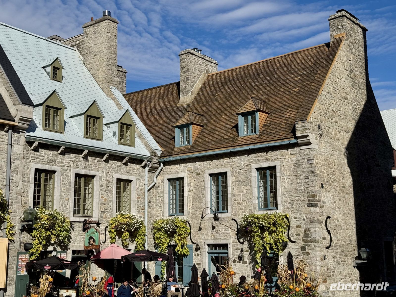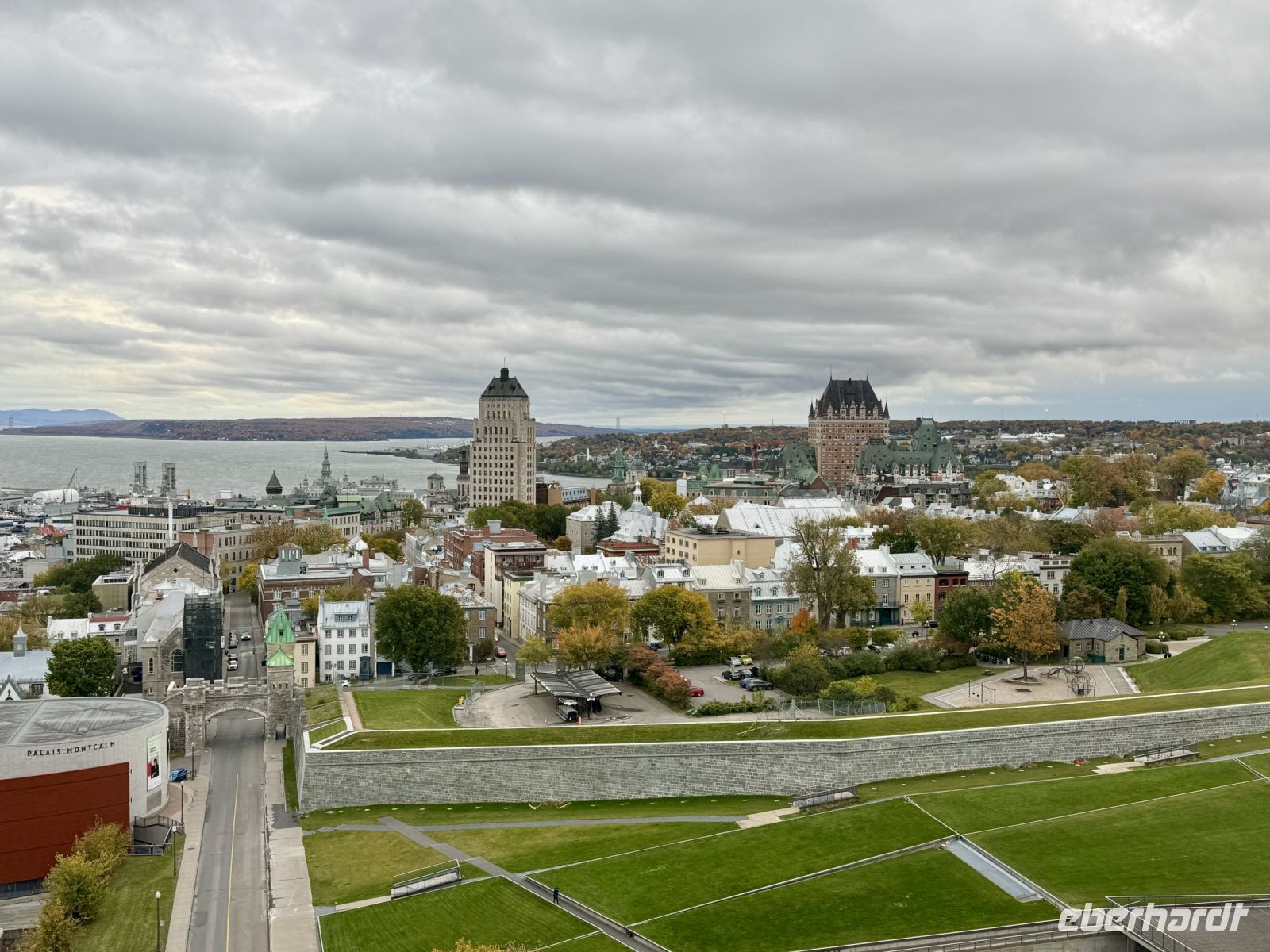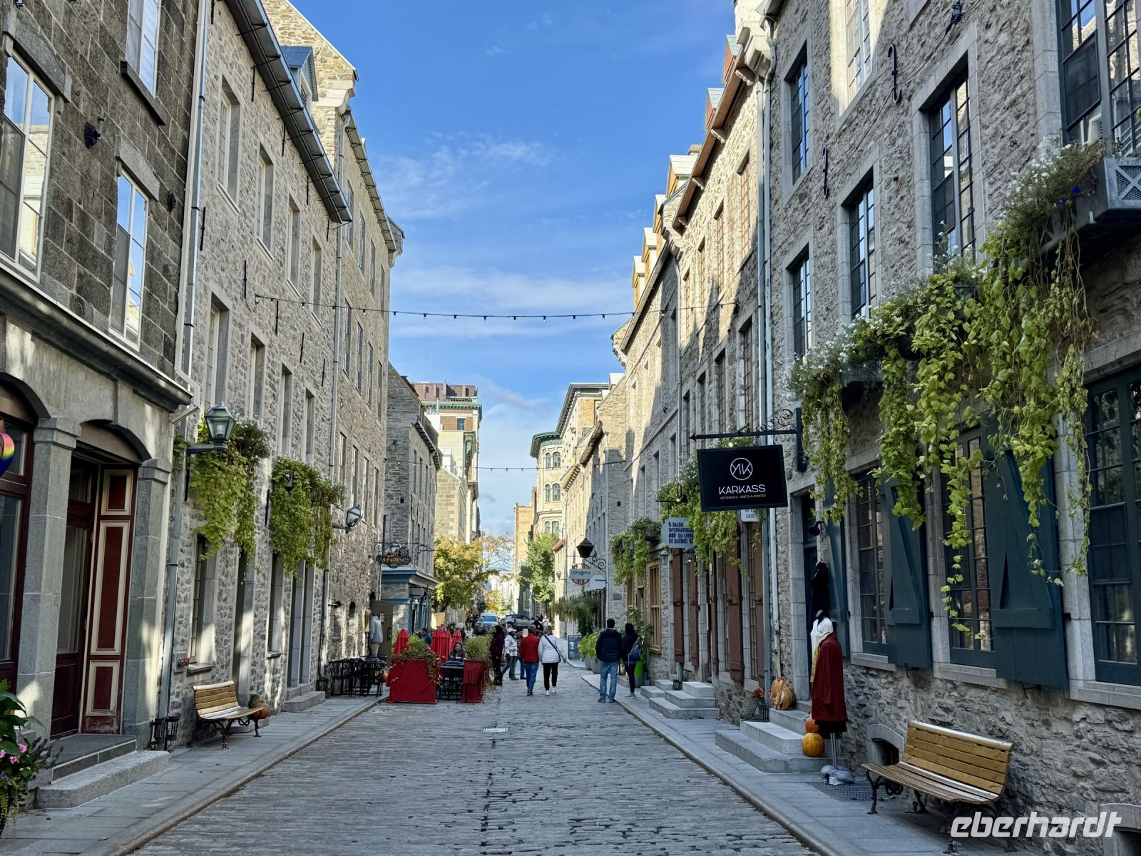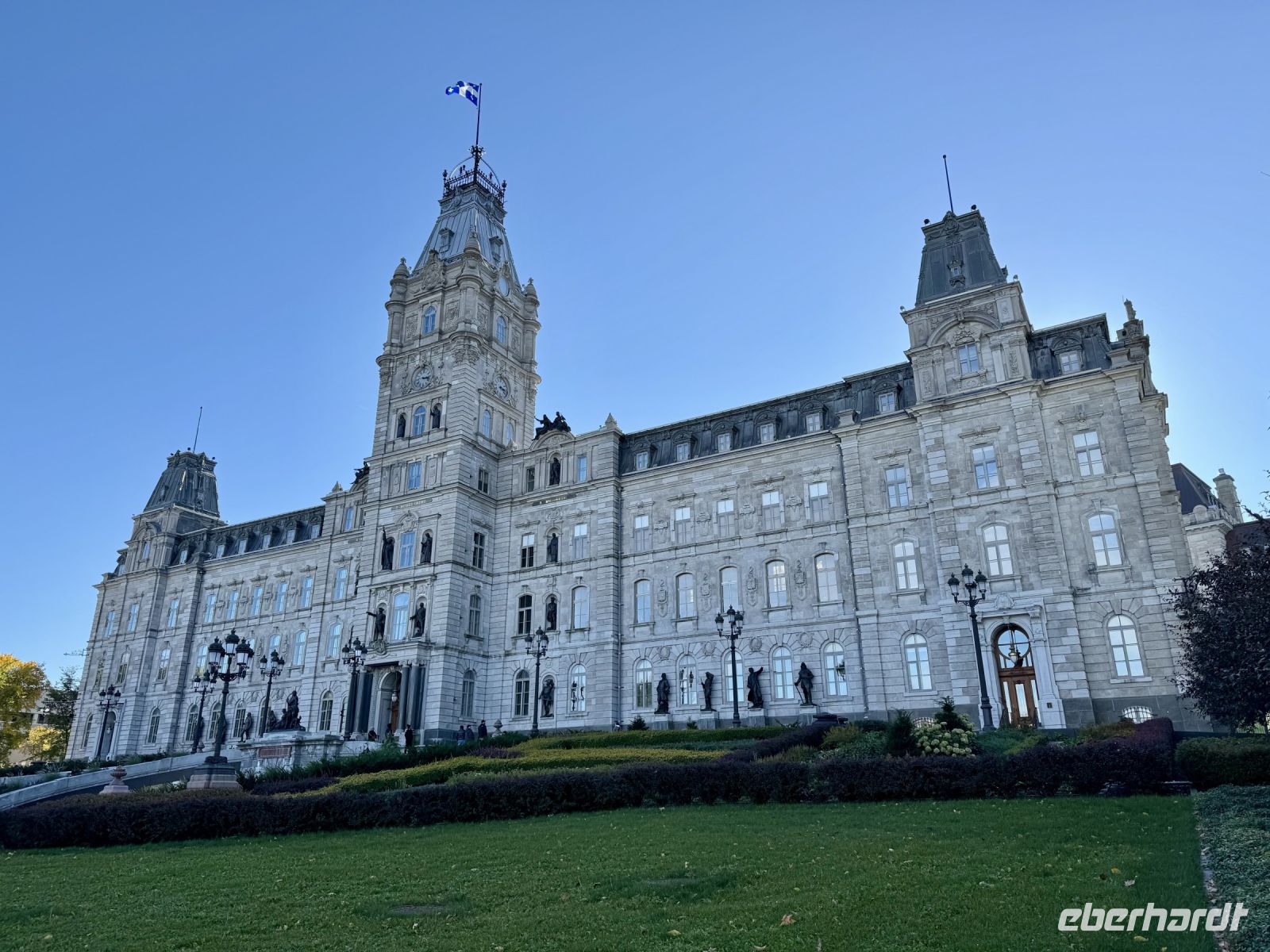 Der heutige Sonnenaufgang und Morgen entschädigt ein bisschen für den gestrigen stürmischen Tag. Auch hier wieder schade, dass wir weiterziehen müssen. Beim Frühstück genießen wir ein letztes Mal die Aussicht auf die Bucht von La Malbaie und sinnieren beim Toasten unseres Brotes im Kamin über die großen Fragen des Urlaubs. Die Rückfahrt nach Québec gestaltet sich als eine Fahrt durch den Indian Summer par excellence. Eine Symphonie an Farben zieht an uns vorbei. Beim Spaziergang durch den Canyon Sainte-Anne können wir den kanadischen Herbst (und natürlich auch den Canyon) aus der Wanderperspektive bewundern. Fast am schönsten ist die Farbenpracht jedoch vor und hinter der gewaltigen Basilique Sainte-Anne de Beaupré, unserem zweiten Etappenziel. Drinnen findet gerade die Sonntagsmesse statt und wir kommen damit sogar in den Genuss einer Darbietung franko-katholischer Kirchenmusik. Pünktlich zur Mittagszeit setzt uns Jason schließlich in der unteren Altstadt von Québec ab. Das ist es, unser letztes Reiseziel. An die vielen anderen Touristen müssen wir uns erst wieder gewöhnen — zwei oder drei Kreuzfahrtschiffe sind gerade in der Stadt. Wir schwärmen also erstmal aus, stürzen uns ins Getümmel und treffen uns pünktlich um 14 Uhr mit unserer Stadtführerin Nadia an der Batterie Royale. Sie führt uns zunächst durch den unteren Teil der UNESCO-geschützten Altstadt, zeigt uns die Place Royale, das berühmte Wandgemälde, die Halsbrechertreppe und die Einkaufsgasse Rue du Petit-Champlain. Für die zweite Hälfte der Erkundungstour rufen wir Jason herbei und wechseln in den Bus. Es stehen noch das Parlamentsgebäude, eine Fahrt über die Plains of Abraham mit Fotostopp am Fluss sowie ein Abstecher zum Château Frontenac auf Nadias Programm. Allerdings kommen wir dann in der oberen Altstadt nur quälend langsam voran, weshalb ein Ausstieg am berühmtesten Eisenbahnhotel entfallen muss. Stattdessen wird unser eigenes Hotel zum nächsten Ziel. Das Hilton Hotel liegt gleich neben dem Parlament und knapp außerhalb der Stadtmauer. Die Panoramafenster in unseren Zimmern bieten uns allen eine tolle Aussicht. Zeit für einen kurzen Bummel bleibt uns ebenfalls. Unser Abschiedsabendessen findet dann in der oberen Altstadt statt. Hier ist immer noch viel los, an mehreren Stellen zeigen Tänzer und Artisten ihr Können. Für das letzte gemeinsame Abendessen stehen sogar vier Gänge auf dem Programm! Verhungert ist mir jedenfalls auf dieser Reise niemand! Mit einigen Gästen gehe ich anschließend noch spontan bis zum Château Frontenac spazieren. Es ist nun merklich ruhiger als noch am Tage — und auch wir kommen langsam zur Ruhe, nachdem wir auf dem Rückweg auch noch einen Abstecher zum schön beleuchteten Parlament gemacht haben und einige der angefutterten Kalorien (hoffentlich) wieder verbrannt haben.