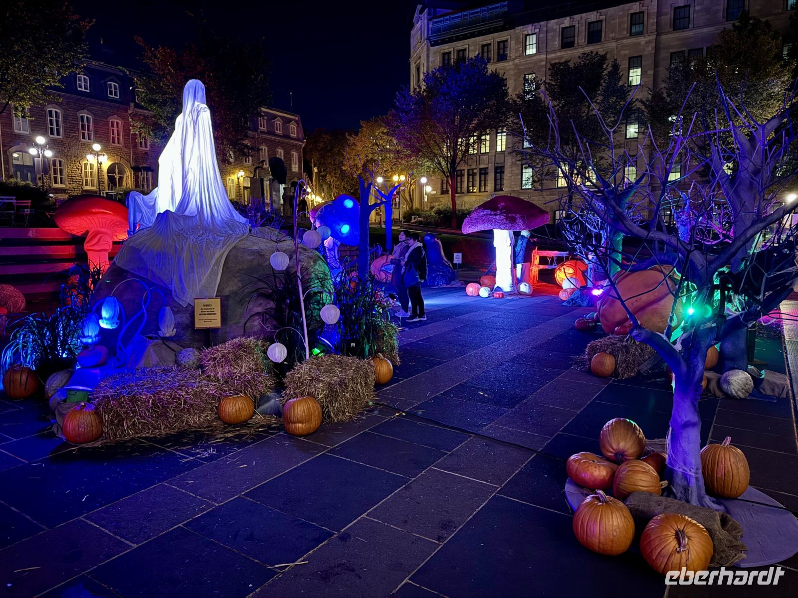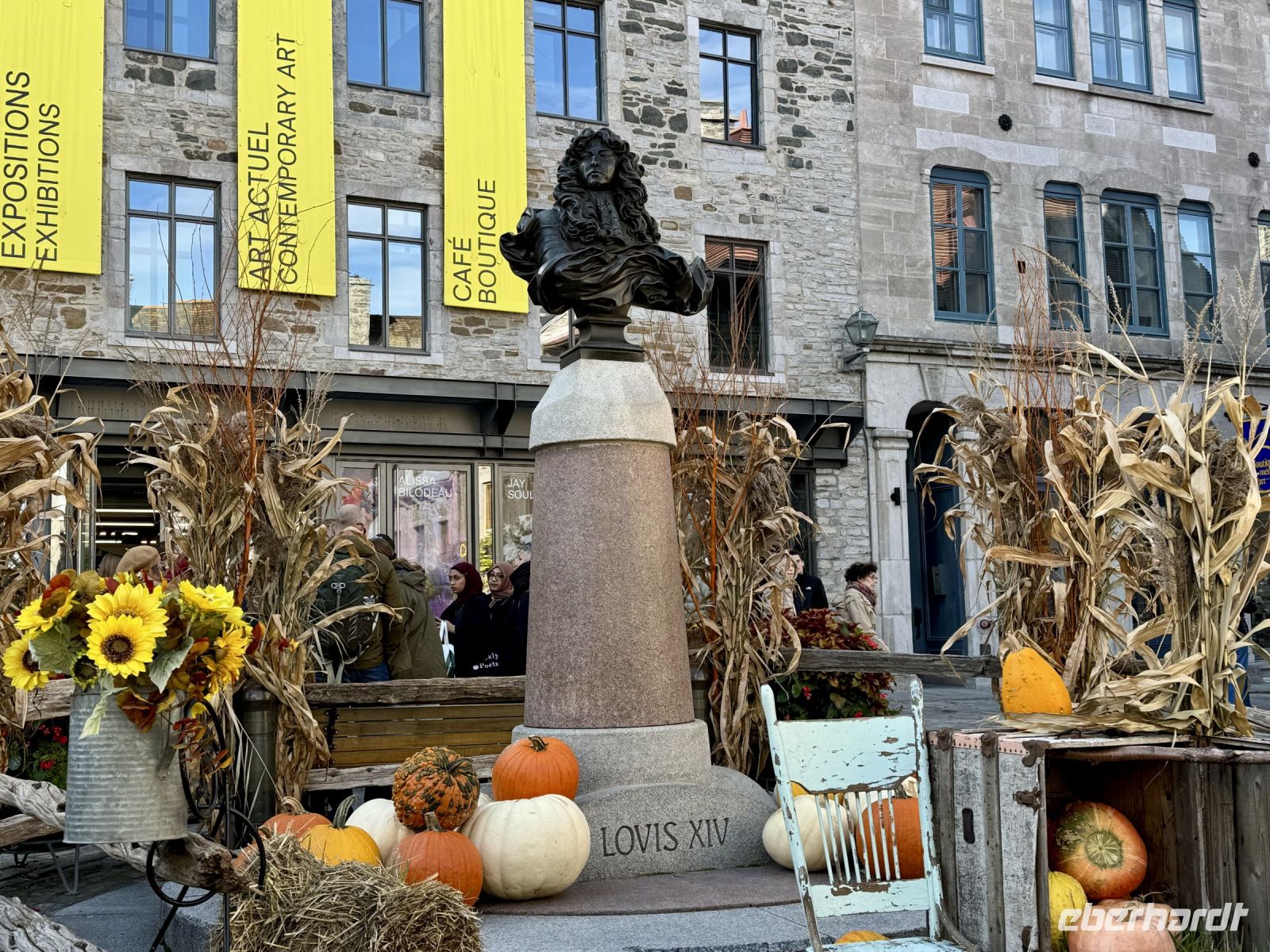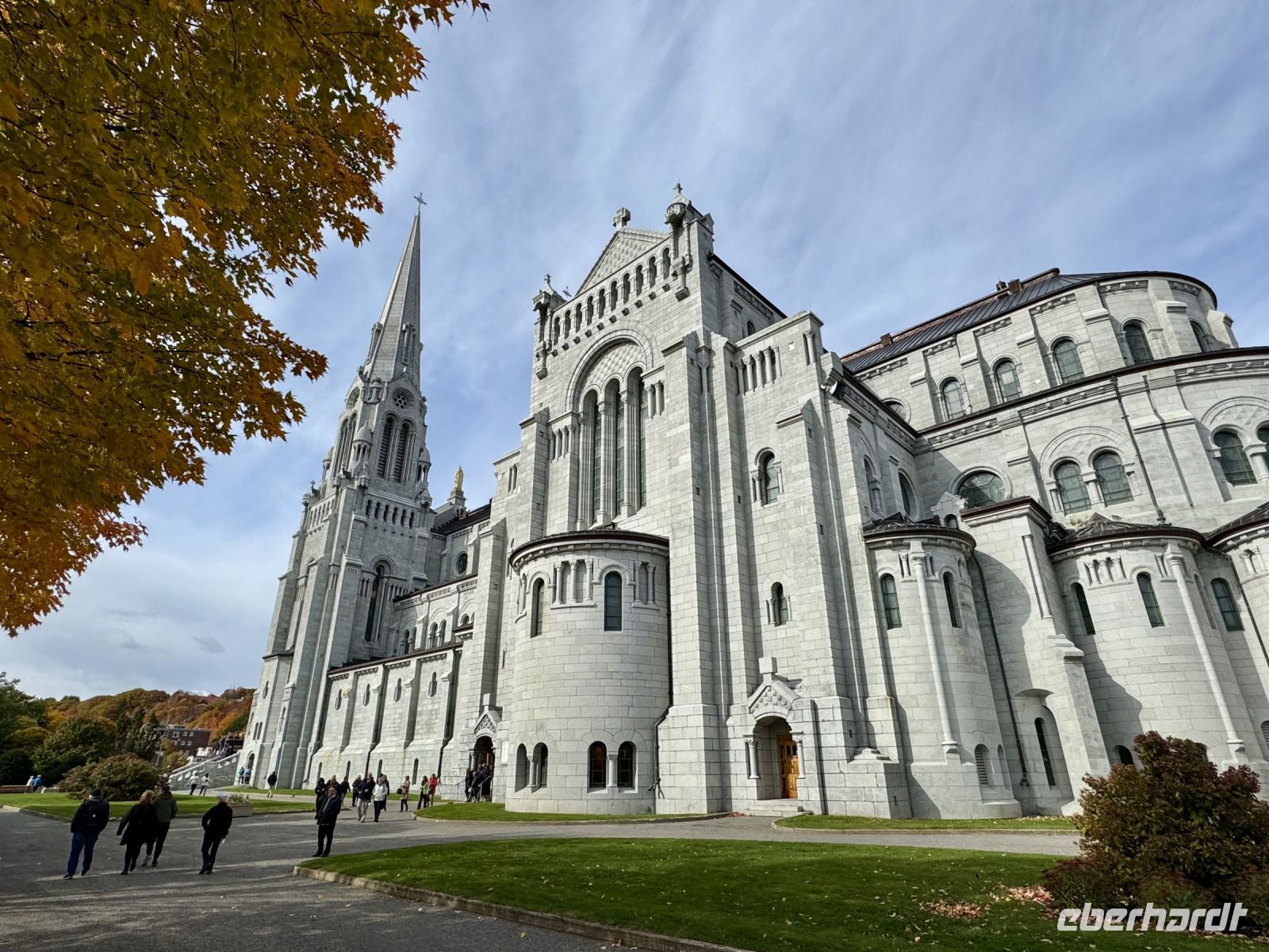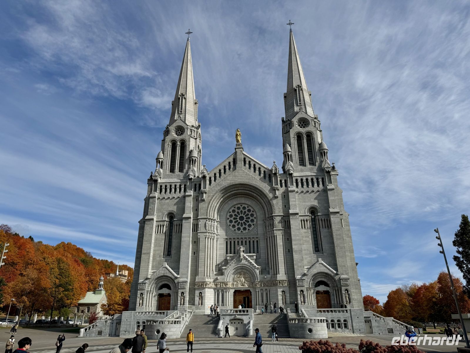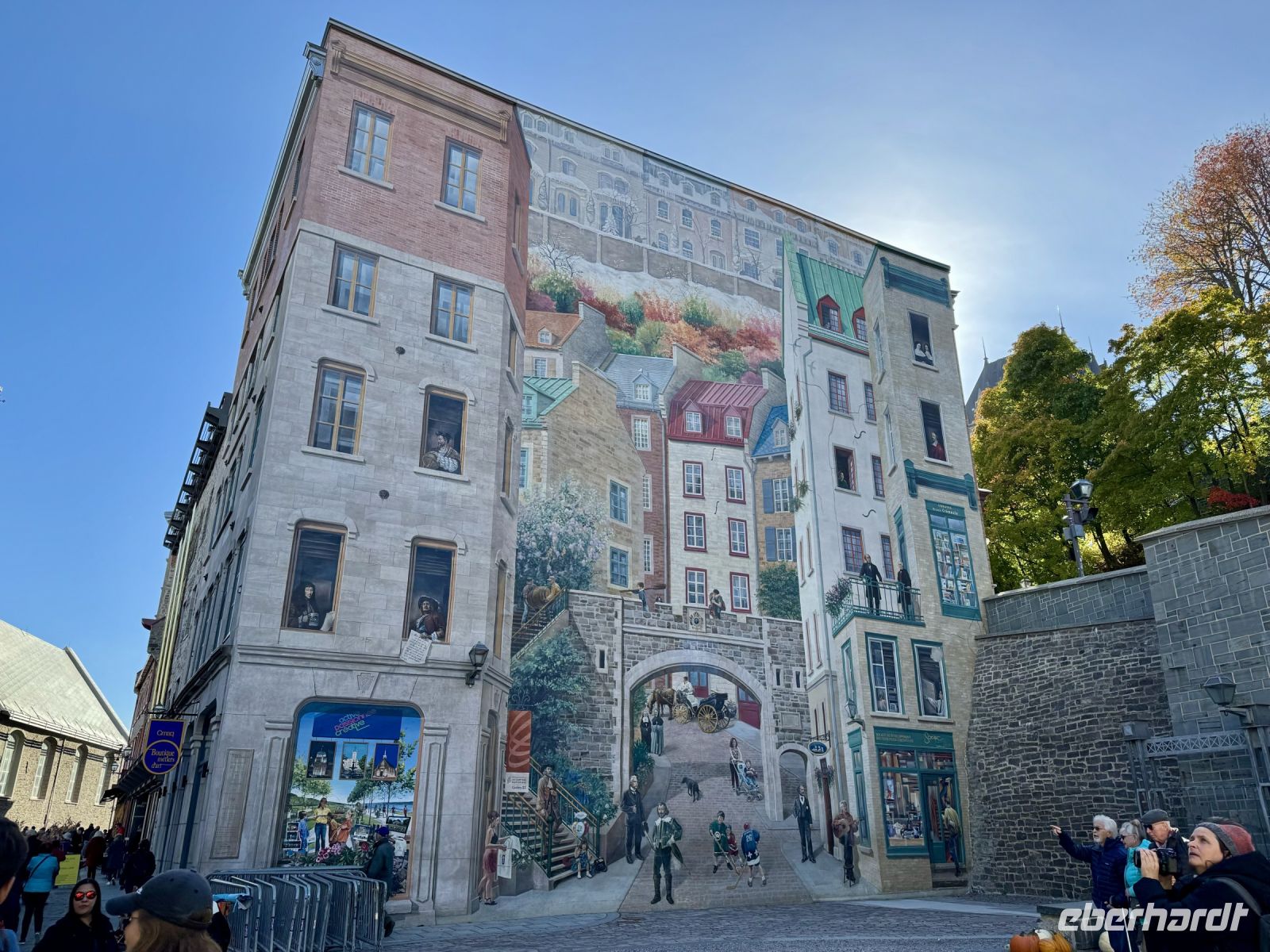 Der heutige Sonnenaufgang und Morgen entschädigt ein bisschen für den gestrigen stürmischen Tag. Auch hier wieder schade, dass wir weiterziehen müssen. Beim Frühstück genießen wir ein letztes Mal die Aussicht auf die Bucht von La Malbaie und sinnieren beim Toasten unseres Brotes im Kamin über die großen Fragen des Urlaubs. Die Rückfahrt nach Québec gestaltet sich als eine Fahrt durch den Indian Summer par excellence. Eine Symphonie an Farben zieht an uns vorbei. Beim Spaziergang durch den Canyon Sainte-Anne können wir den kanadischen Herbst (und natürlich auch den Canyon) aus der Wanderperspektive bewundern. Fast am schönsten ist die Farbenpracht jedoch vor und hinter der gewaltigen Basilique Sainte-Anne de Beaupré, unserem zweiten Etappenziel. Drinnen findet gerade die Sonntagsmesse statt und wir kommen damit sogar in den Genuss einer Darbietung franko-katholischer Kirchenmusik. Pünktlich zur Mittagszeit setzt uns Jason schließlich in der unteren Altstadt von Québec ab. Das ist es, unser letztes Reiseziel. An die vielen anderen Touristen müssen wir uns erst wieder gewöhnen — zwei oder drei Kreuzfahrtschiffe sind gerade in der Stadt. Wir schwärmen also erstmal aus, stürzen uns ins Getümmel und treffen uns pünktlich um 14 Uhr mit unserer Stadtführerin Nadia an der Batterie Royale. Sie führt uns zunächst durch den unteren Teil der UNESCO-geschützten Altstadt, zeigt uns die Place Royale, das berühmte Wandgemälde, die Halsbrechertreppe und die Einkaufsgasse Rue du Petit-Champlain. Für die zweite Hälfte der Erkundungstour rufen wir Jason herbei und wechseln in den Bus. Es stehen noch das Parlamentsgebäude, eine Fahrt über die Plains of Abraham mit Fotostopp am Fluss sowie ein Abstecher zum Château Frontenac auf Nadias Programm. Allerdings kommen wir dann in der oberen Altstadt nur quälend langsam voran, weshalb ein Ausstieg am berühmtesten Eisenbahnhotel entfallen muss. Stattdessen wird unser eigenes Hotel zum nächsten Ziel. Das Hilton Hotel liegt gleich neben dem Parlament und knapp außerhalb der Stadtmauer. Die Panoramafenster in unseren Zimmern bieten uns allen eine tolle Aussicht. Zeit für einen kurzen Bummel bleibt uns ebenfalls. Unser Abschiedsabendessen findet dann in der oberen Altstadt statt. Hier ist immer noch viel los, an mehreren Stellen zeigen Tänzer und Artisten ihr Können. Für das letzte gemeinsame Abendessen stehen sogar vier Gänge auf dem Programm! Verhungert ist mir jedenfalls auf dieser Reise niemand! Mit einigen Gästen gehe ich anschließend noch spontan bis zum Château Frontenac spazieren. Es ist nun merklich ruhiger als noch am Tage — und auch wir kommen langsam zur Ruhe, nachdem wir auf dem Rückweg auch noch einen Abstecher zum schön beleuchteten Parlament gemacht haben und einige der angefutterten Kalorien (hoffentlich) wieder verbrannt haben.