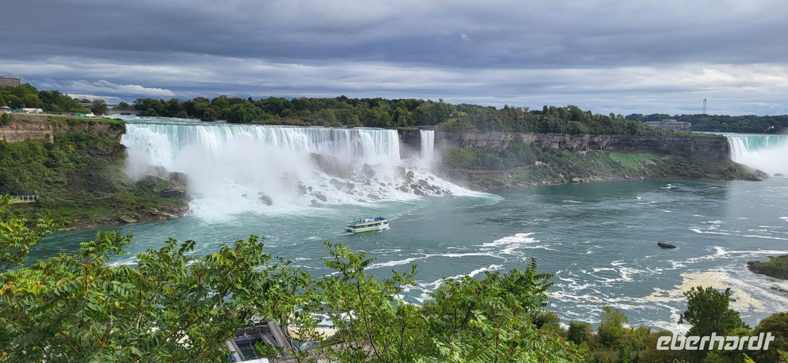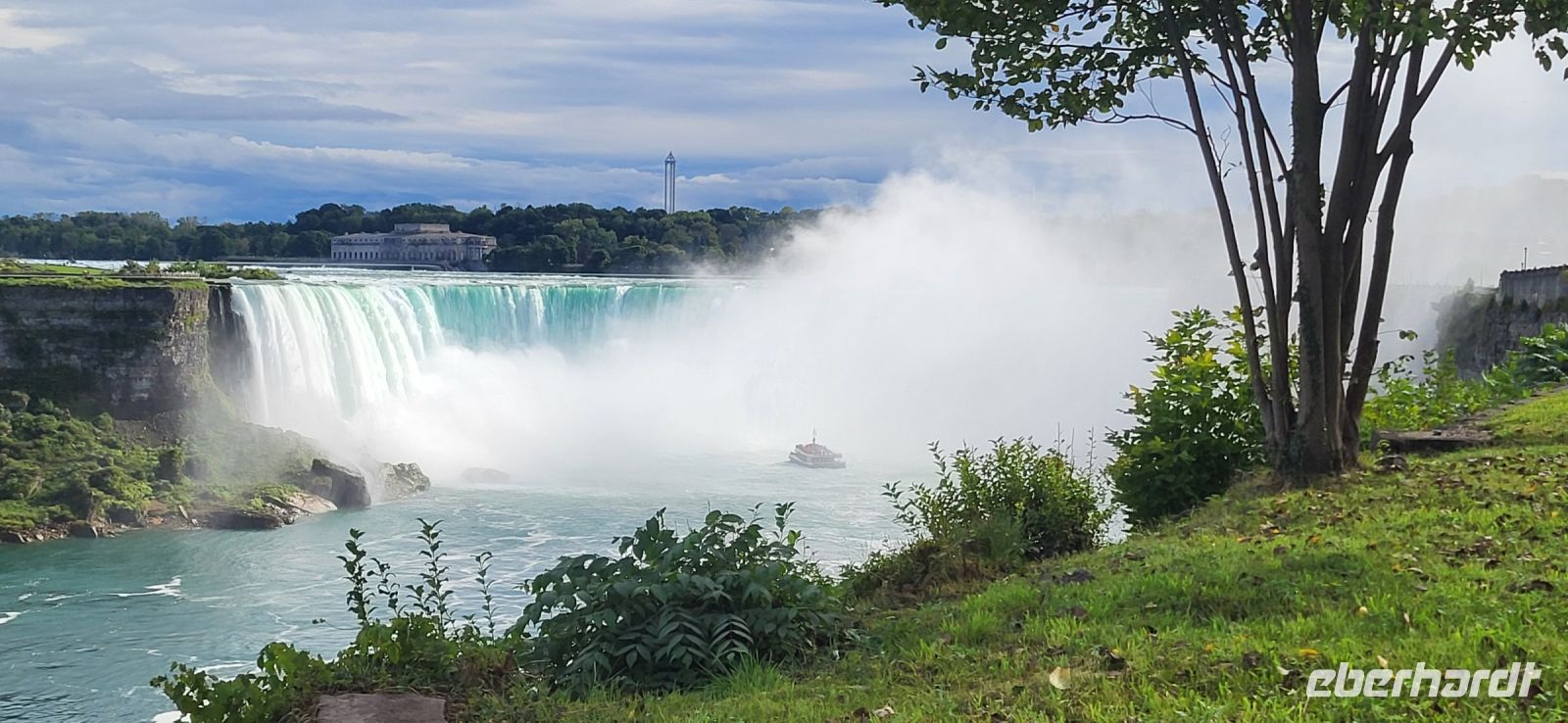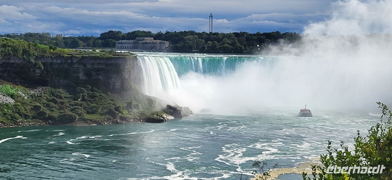 Jetlag bedingt sind wir alle früh putzmunter, treffen uns zum Frühstück am riesigen Buffet des Chelsea Hotels. Wir beginnen leider mit mäßigem Wetter mit einer orientierenden Stadtrundfahrt durch Toronto. Da es 1904 ein Großfeuer in der Stadt gab, musste diese schnell wieder aufgebaut werden, was auch erklärt, dass nur noch wenig alte Bausubstanz zu sehen ist. Toronto gilt als größte Stadt Kanadas mit rund 68.000 Studierenden an sechs Universitäten, deren riesigen Campus wir ebenfalls während unserer Tour anfahren. Vorbei am Royal Ontario Museum geht es entlang der Kunstgalerie, weiter zum Krankenhausbezirk und schließlich durch Chinatown. Hier leben viele chinesische Migranten vieler Generationen, die einst zum Zweck des Baus der Eisenbahnstrecke von Halifax bis Vancouver ins Land kamen. Weiter geht es nun zum ersten Highlight des Tages: Wir erkunden den CN Tower, dem heutige Wahrzeichen der Stadt. Dieser ist 553 m hoch und in weniger als 1 Minute gelangen wir über den gläsernen Aufzug zur Aussichtsplattform auf 342 m Höhe. Normalerweise gibt es hier einen grandiosen Blick über die Stadt. 360 ° Rundumsicht, so leider nicht heute, da wir mit Ankunft in Kanada in eine Regenfront geraten sind. Wir nehmen es, wie es kommt, verlassen die Stadt und ziehen weiter Richtung der 130 Km entfernt gelegenen Niagara-Fällen. Niagara kommt aus der Sprache der indigenen Bevölkerung, was so viel wie „donnerndes Wasser“ bedeutet und dessen Bezeichnung sich uns bald noch eindrücklich erschließen wird. Am heutigen Zielort angekommen, war eigentlich ein 9-minütiger Helikopterflug geplant, bei dem man bei guten Wetterbedingungen die Wasserfälle und deren Umgebung aus luftiger Höhe bestens erleben kann. Leider fällt dies heute witterungsbedingt aus und die Helikopter bleiben am Boden statt in die Lüfte zu ziehen. So erfolgt nun eine andere Betrachtungsweise-wir fahren per Schiff ganz nah an die US und die kanadischen „Hufeisen“ Wasserfälle heran. Gut verpackt in einheitlich roten Regencapes geht es auf dem Niagara Fluss bis an die Gischt der Fälle. Da das Schiff nicht allzu sehr gefüllt ist, haben wir viel Platz und können uns gut verteilen. Eine große Gaudi und natürlich ein gewaltiger Blick auf die Wassermassen, die vor uns herabstürzen. So verbringen wir eine ziemlich feucht-fröhliche Zeit an Bord und danach bleibt für alle noch genug Zeit, um an der schönen Promenade mit Blick auf beide Fälle entlang zu spazieren. Abends speisen wir genüsslich im Drehrestaurant des 1964 erbauten und 160 m hohen Skylon Tower. Mit tollem Panorama und Blick auf die Niagara Fälle lässt sich der Abend bestens ausklingen. Anschließend fahren wir noch an den nun bunt beleuchteten Fällen entlang, welche nochmals einen anderen und ebenso imposanten Anblick bieten. Zurück über die Flaniermeile geht es nun zum Hotel und zu einer geruhsamen Nacht in der Niagara-Region.