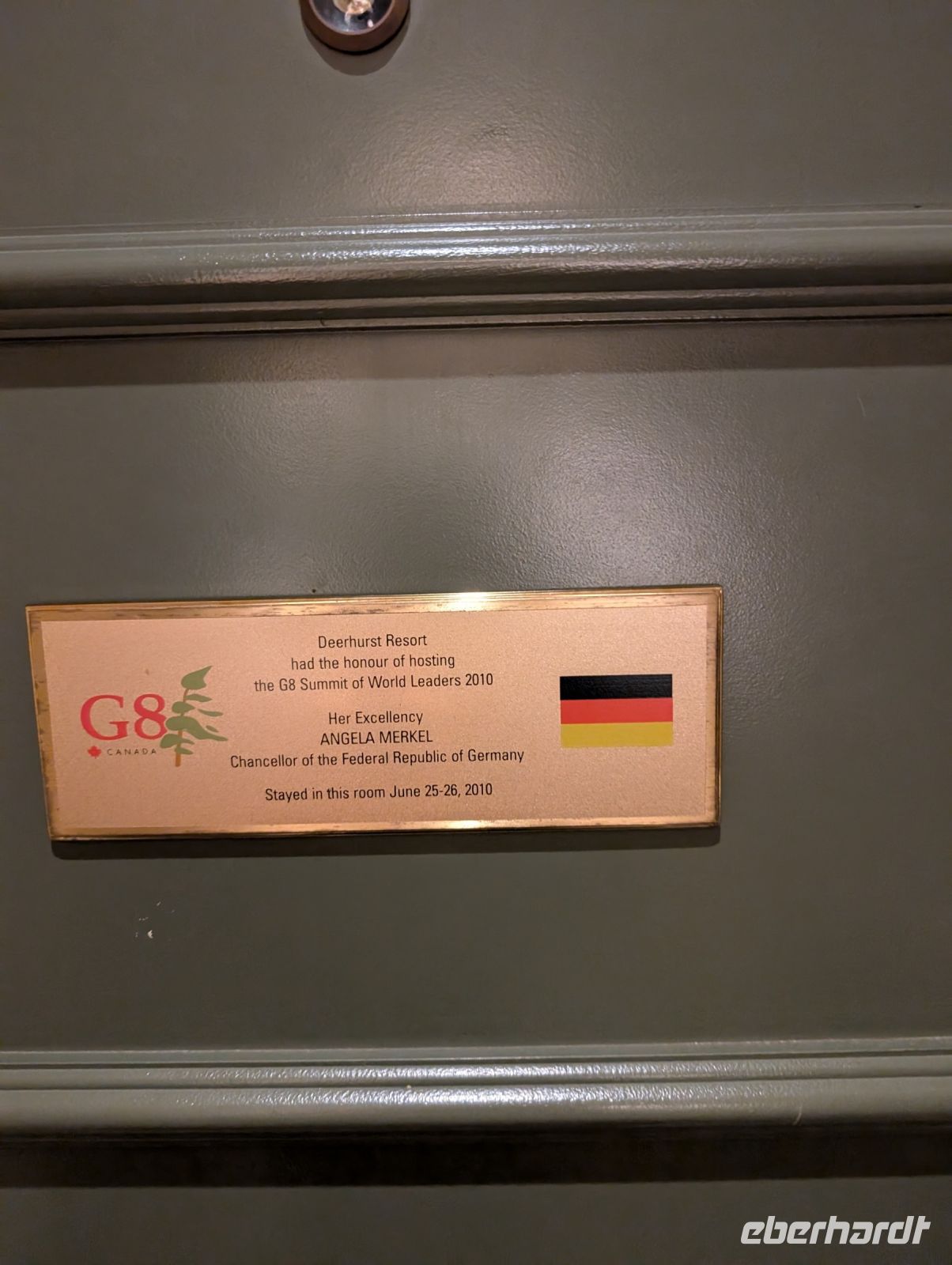 Schließlich kamen wir in unserem Hotel in Huntsville an – und dort wartete die nächste Überraschung auf uns: Ich hatte das Zimmer erwischt, in dem einst Angela Merkel während des G8-Gipfels übernachtet hatte! Das sorgte für einige Lacher, als ich unsere Gruppe dabei ertappte, wie sie immer wieder neugierig wie Paparazzi vor meinem Zimmer lauerten, als wäre Angela noch persönlich anwesend.