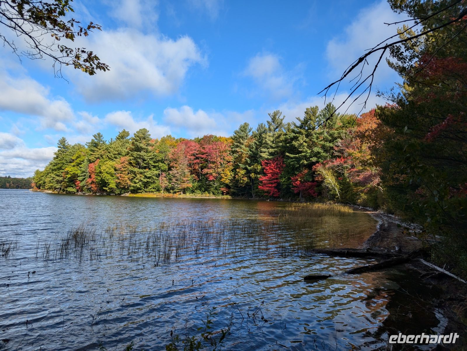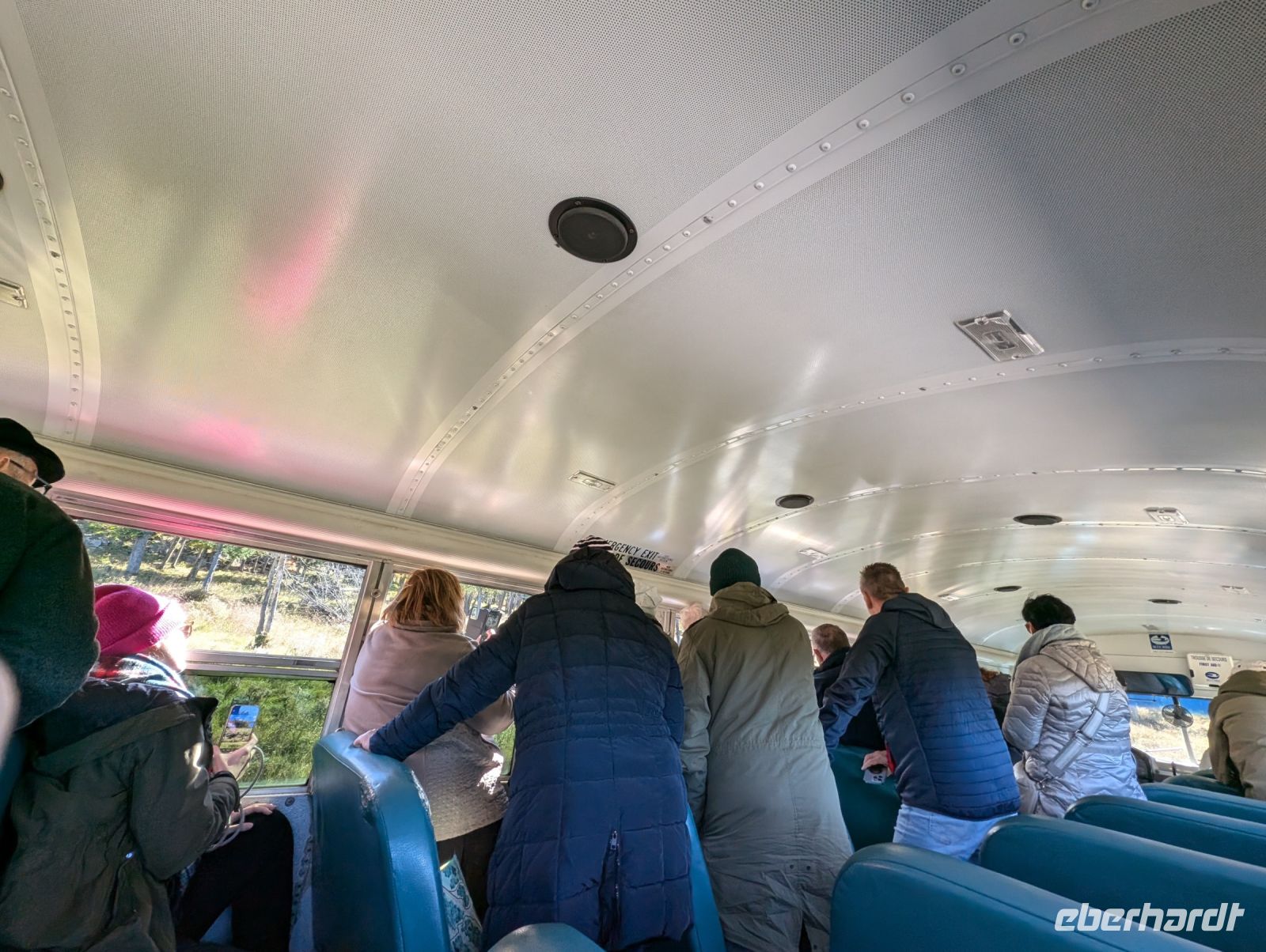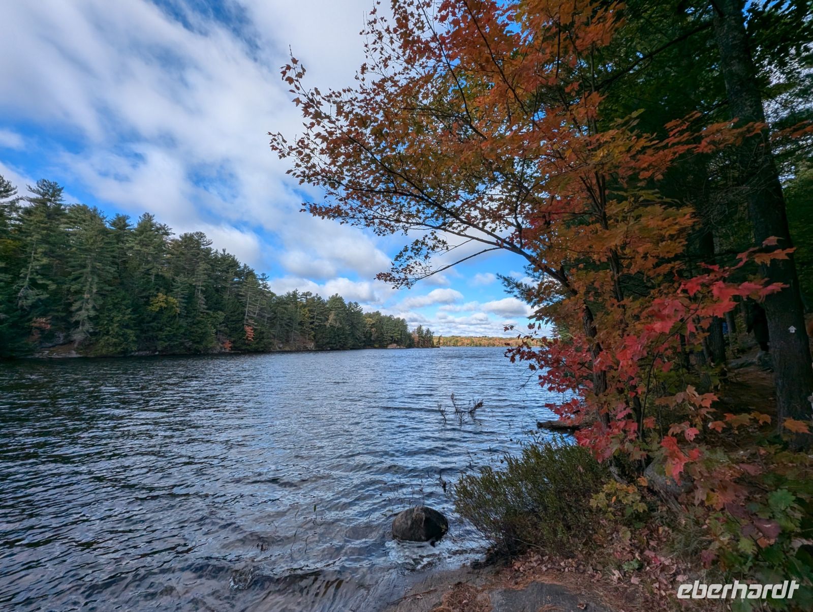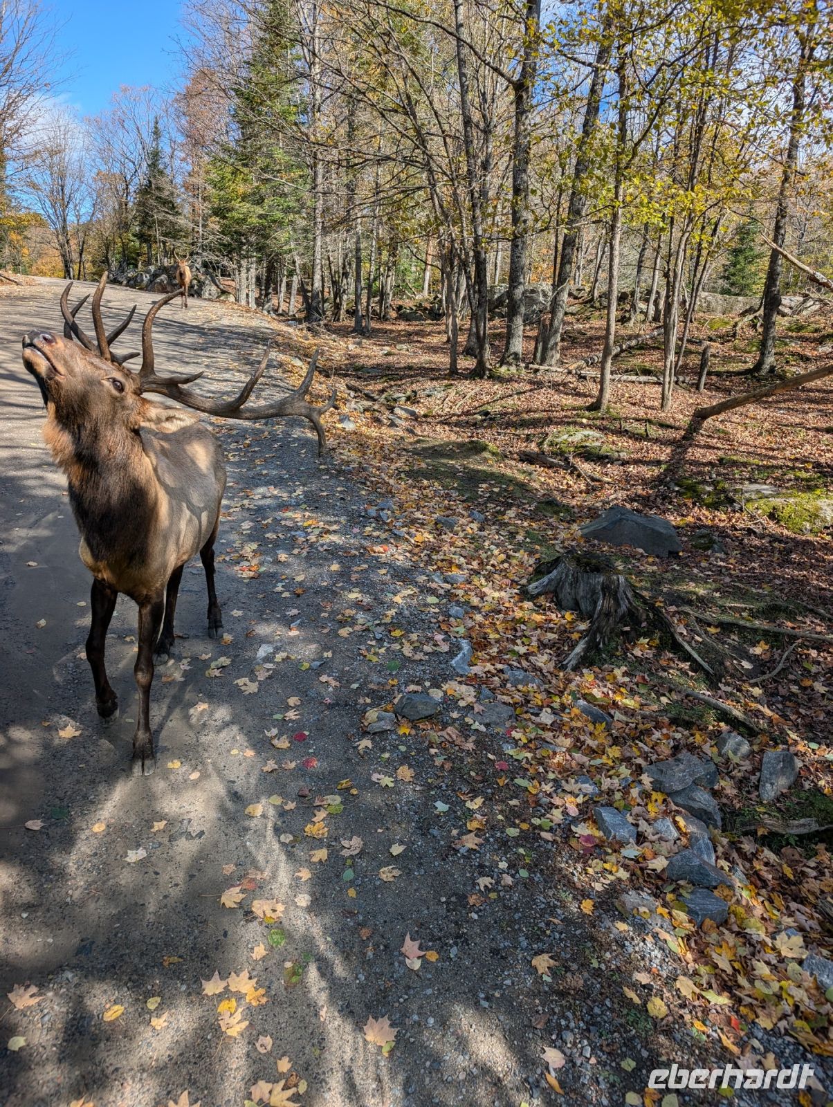 Gut gestärkt brachen wir dann zu einem längeren Spaziergang auf, doch bei gerade einmal 4 Grad waren viele von uns froh, ihre Winterjacken eingepackt zu haben. Die Kälte konnte unserer Entdeckerlust jedoch keinen Abbruch tun. Während des Spaziergangs wartete, wie von Eberhardt persönlich bestellt, ein Streifenhörnchen auf uns, das für viel Begeisterung sorgte. Doch die wahre Faszination galt dem Indian Summer und den leuchtenden Farben der herbstlichen Wälder. Unsere Reiseleiterin Marina hatte alle Hände voll zu tun, unsere fotobegeisterte Gruppe zusammenzuhalten, da jeder an den strahlenden Bäumen Halt machte, um das perfekte Bild zu schießen. Besonders der zweite Teil des Weges forderte einige von uns mehr heraus als erwartet – doch die grandiose Landschaft entschädigte für jede Anstrengung.