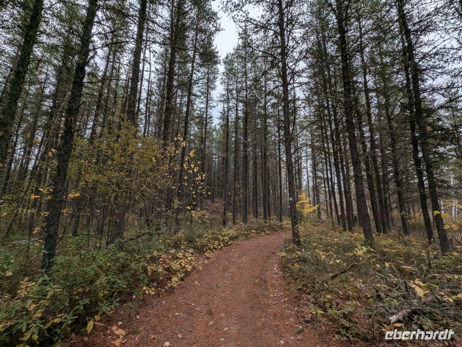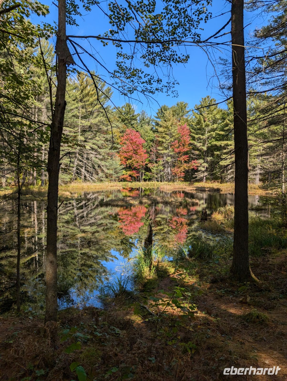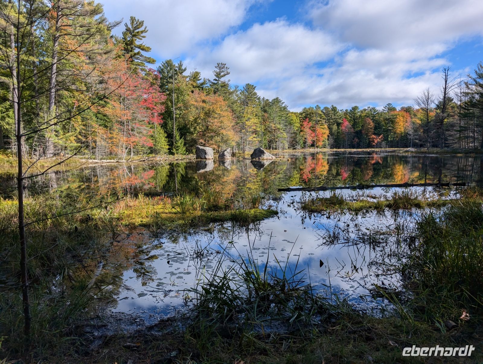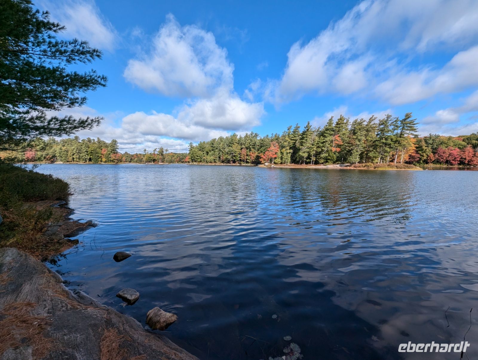 Gut gestärkt brachen wir dann zu einem längeren Spaziergang auf, doch bei gerade einmal 4 Grad waren viele von uns froh, ihre Winterjacken eingepackt zu haben. Die Kälte konnte unserer Entdeckerlust jedoch keinen Abbruch tun. Während des Spaziergangs wartete, wie von Eberhardt persönlich bestellt, ein Streifenhörnchen auf uns, das für viel Begeisterung sorgte. Doch die wahre Faszination galt dem Indian Summer und den leuchtenden Farben der herbstlichen Wälder. Unsere Reiseleiterin Marina hatte alle Hände voll zu tun, unsere fotobegeisterte Gruppe zusammenzuhalten, da jeder an den strahlenden Bäumen Halt machte, um das perfekte Bild zu schießen. Besonders der zweite Teil des Weges forderte einige von uns mehr heraus als erwartet – doch die grandiose Landschaft entschädigte für jede Anstrengung.
