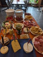 Nach dem Spaziergang wartete eine besondere Überraschung auf unsere Gäste: Ein Picknick, das Marina, Marco und ich im Namen von Eberhardt Reisen organisiert hatten. Mit typisch kanadischen Spezialitäten aus Ontario und Quebec, boten wir eine bunte Auswahl: geräuchertes "koscheres" Rindfleisch aus Montreal, das traditionell mit Senf auf Brot gegessen wird, verschiedene Käsesorten wie Oka, dazu Wein, Cranberrysaft und ein wenig Gemüse mit Hummus. Für den deutschen Geschmack durften natürlich auch Gewürzgurken und dunkles Brot nicht fehlen. Besonders beliebt waren die Ketchup-Chips, die sich schnell als Favorit entpuppten – auch wenn sie eher lila gefärbt waren und eine leichte Essignote hatten.