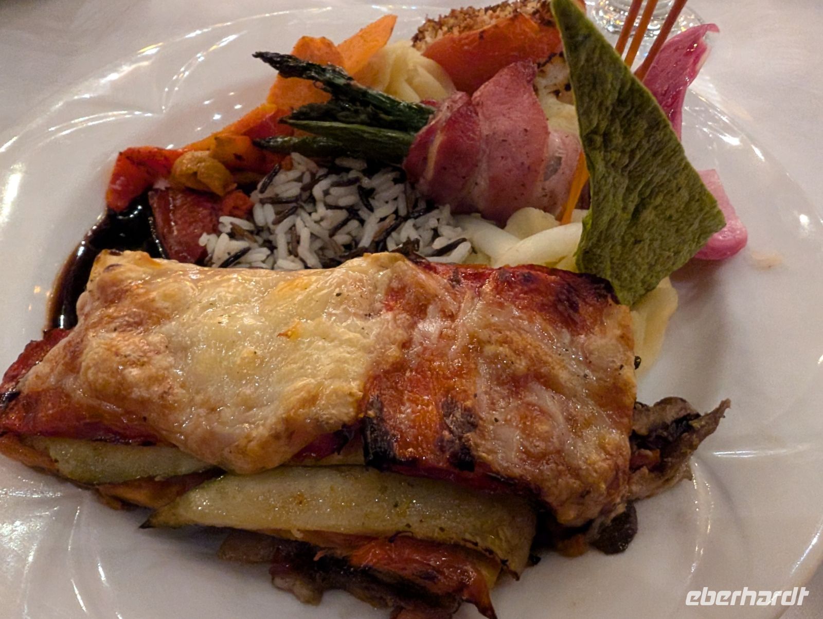 Zum Abendessen waren wir wieder vereint, und der Abend verlief fröhlich und entspannt. Für einen kleinen Lacher sorgte das vegetarische Gericht, das überraschenderweise mit Bohnen im Speckmantel serviert wurde. Aber das tat der guten Laune keinen Abbruch und rundete einen weiteren gelungenen Tag ab.