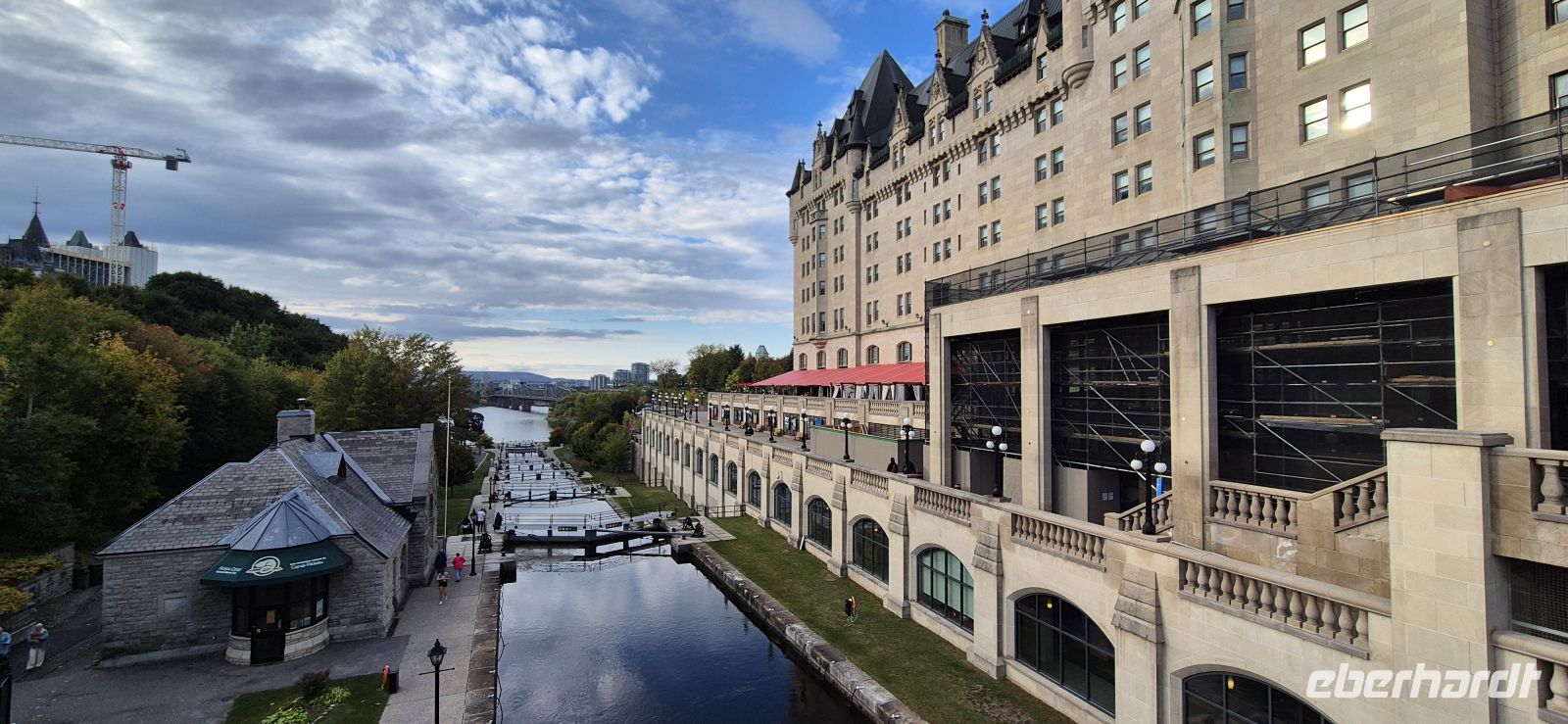 Nach einem ausgiebigen Frühstück verabschieden wir uns vom idyllischen Deerhurst Resort und rollen hinaus in die weite Natur. Die Straße führt uns mitten hinein in den Algonquin Park, Kanadas ältestes Schutzgebiet. Schon beim Hineinfahren tauchen wir ein in eine bunte Mischung aus goldgelben Birken, leuchtend rotem Ahorn und dunklen, majestätischen Kiefern, die seit Jahrhunderten hier stehen. Zwischen all dem glitzern unzählige Seen und Flüsse – ein Gebiet, das größer ist, als man es sich vorstellen kann. Im Visitor Center nehmen wir uns Zeit für einen eindrucksvollen Film und bestaunen anschließend die Ausstellung. Präparate von Elchen, Bären, Wölfen und Greifvögeln lassen uns ahnen, wie vielfältig die Tierwelt hier ist. Auf der Terrasse öffnet sich vor uns ein Meer aus Wäldern, das bis zum Horizont reicht. Später schlendern wir durch das Freilichtmuseum zur Geschichte der Holzfällerei. An jeder Station erfahren wir mehr über die harten Arbeitsbedingungen der Pioniere – und während wir entlang des schattigen Waldwegs wandern, wird deutlich, wie nah Natur und Geschichte hier beieinanderliegen. Am Nachmittag erreichen wir Ottawa, die heutige Hauptstadt Kanadas. Trotz ihrer Bedeutung wirkt sie charmant, überschaubar und fast gemütlich. Gemeinsam mit unserer Stadtführerin Marina spazieren wir auf den Parlamentshügel. Die mächtigen Gebäude aus Sandstein erheben sich im neugotischen Stil, und Marina erzählt vom verheerenden Brand, der einst große Teile zerstörte. Heute glänzen die Dächer aus Kupfer in der Sonne, als sei nichts geschehen. Nur wenige Schritte entfernt flackert die ewige Flamme, die alle Provinzen und Territorien des Landes symbolisch vereint. Wir gehen weiter zum nationalen Kriegsdenkmal, wo wir sogar noch an der Wachablösung teilnehmen und anschließend zu den Schleusen des Rideau-Kanals, der Ottawa mit dem Ontariosee verbindet. Es ist faszinierend, wie dieses historische Wasserbauwerk bis heute in Betrieb ist und von der UNESCO als Weltkulturerbe anerkannt wurde. Unser Spaziergang führt uns vorbei am eleganten Chateau Laurier, das wie ein Märchenschloss über der Stadt thront, bis hin zur Basilika Notre Dame, deren prachtvolles Inneres wir glücklicherweise besichtigen dürfen. Schließlich lassen wir uns vom bunten Treiben am ByWard Market anstecken – kleine Läden, Musiker, lebhafte Lokale und der Duft frischer Köstlichkeiten machen den Bummel zu einem Erlebnis. Am Abend checken wir ins zentral gelegene „The Arc Hotel“ ein. Während einige Gäste individuell auf Entdeckungstour gehen, schließen sich andere unserem kleinen Kreis an, und wir lassen den Tag bei einem gemütlichen Abendessen im Brauhaus ausklingen.