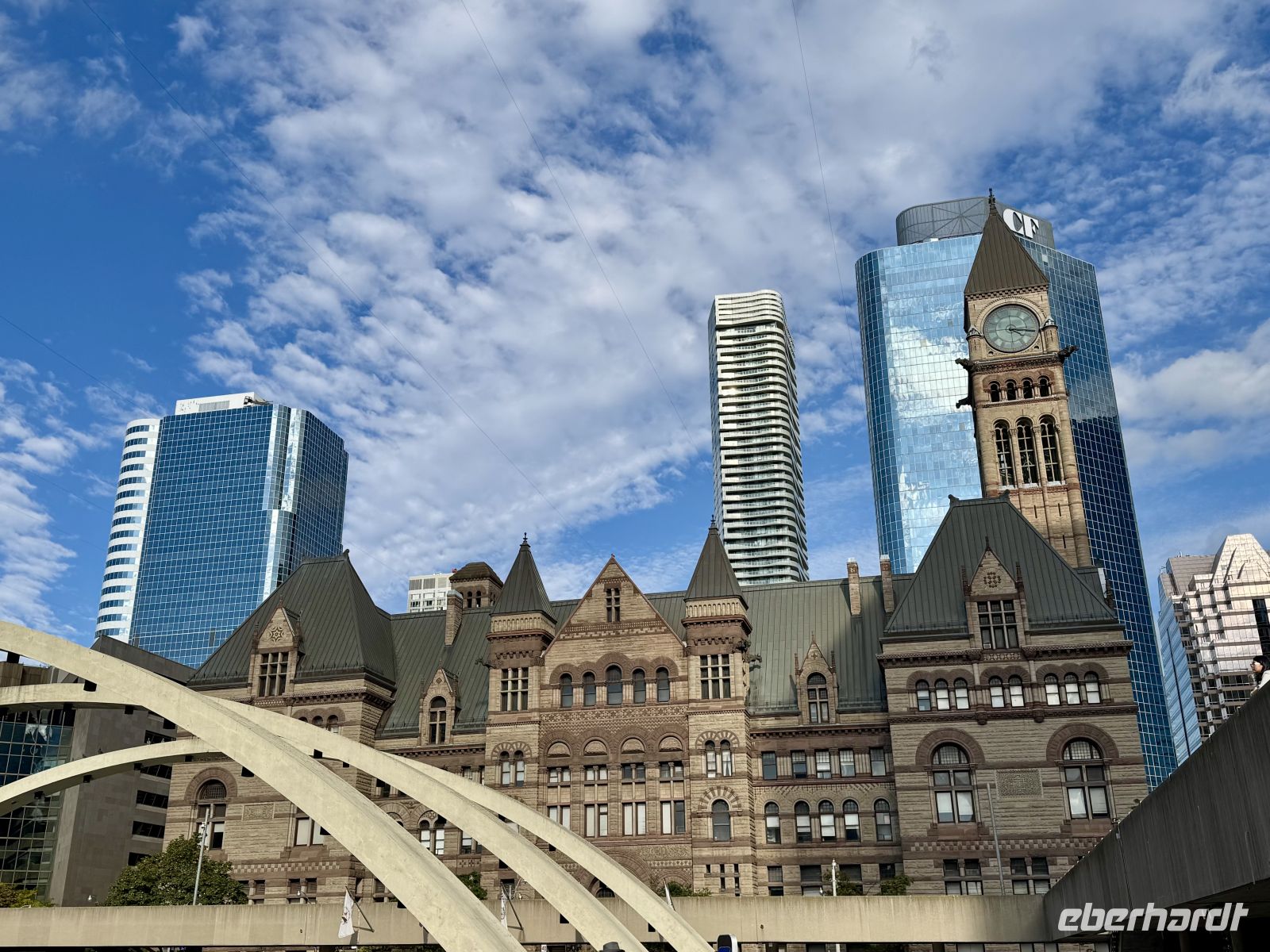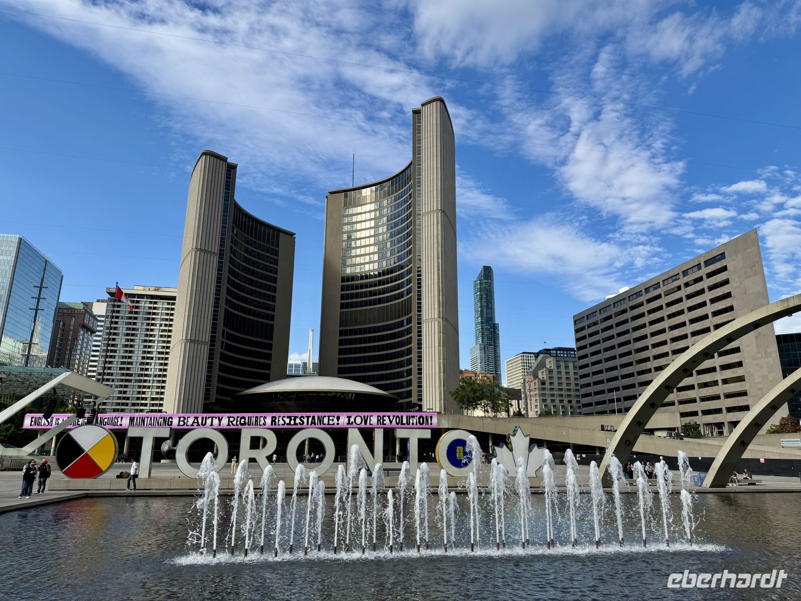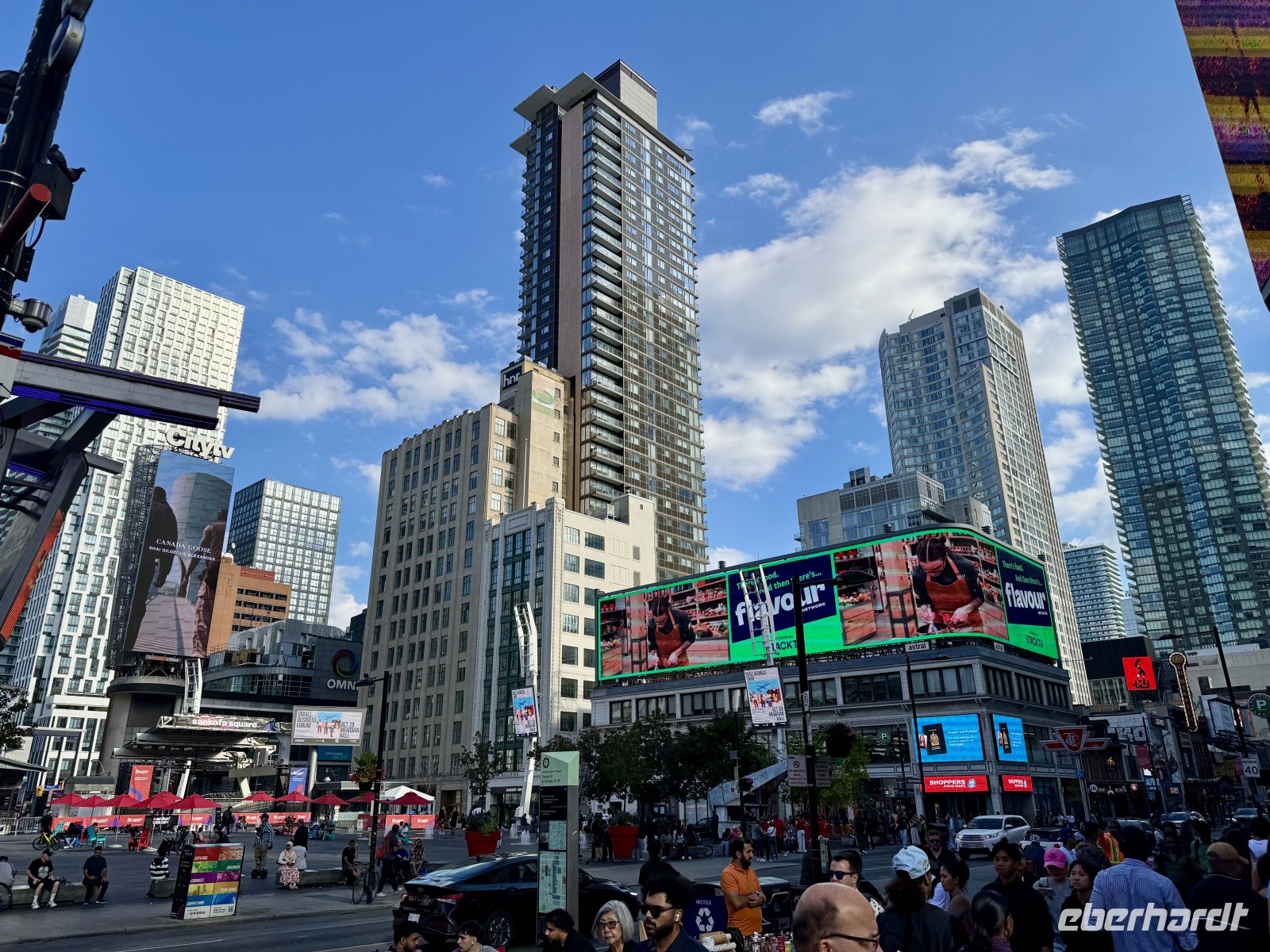 Am Frankfurter Flughafen treffe ich am Check-In-Schalter bzw. später am Gate den Großteil meiner Reisegäste für meine diesjährige Indian-Summer-Reise nach Kanada. Die meisten haben schon einen Zubringerflug hinter sich und mussten zeitig aufstehen. Ausnahmslos alle freuen sich jedoch auf ein spannendes Reiseerlebnis, viel Natur und jede Menge neue Eindrücke. Der Flug nach Toronto mit Air Canada verläuft weitestgehend ruhig, abgesehen von gelegentlichen ganz leichten Turbulenzen. Es ist nur sehr kalt an manchen Stellen der Kabine. Ein kleiner Vorgeschmack auf die Vorliebe auch der Kanadier, alles möglichst unter den Gefrierpunkt runterzukühlen. Auf dem Flughafen von Toronto treffen wir zwei weitere Gäste und lernen (nach der unkomplizierten Einreise) unseren Busfahrer Jim kennen, der uns im nigelnagelneuen Bus bis zum Flughafen von Montréal chauffieren wird. Bis dahin sind es aber noch einige Tage … Wir erreichen das Hotel im Stadtzentrum gegen 14:40 Uhr Ortszeit und können tatsächlich schon auf unsere Zimmer, alles ist fertig! Alle Gäste freuen sich darüber, dass wir schon zeitig in Toronto eingetroffen sind und bei dieser Reise tatsächlich noch etwas vom Tag haben. Da die Sonne scheint und draußen noch 25 Grad sind, biete ich noch einen Spaziergang zum Dundas Square, Eaton Centre und Rathaus an. Vor dem bekannten Schriftzug am Nathan-Philipps-Square können wir somit die ersten Beweisfotos machen, dass wir auch wirklich in Kanada angekommen sind. Die Damentruppe zieht es anschließend in den Biergarten, weshalb ich sie kurzerhand zur Brauerei im Ringlokschuppen am CN Tower schicke. Ansonsten steht der erste Abend meinen Gästen komplett zur freien Verfügung. Zumindest, bis uns die Müdigkeit aufgrund des langen Anreisetags und der Zeitverschiebung doch in die Hotelbetten treibt … Morgen werden wir Toronto im Rahmen der Stadtrundfahrt dann weiter erkunden und am Nachmittag mit dem Boot an die Niagarafälle fahren.