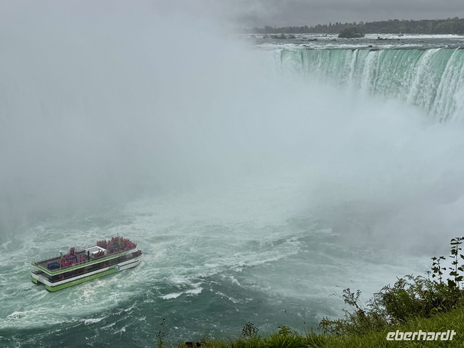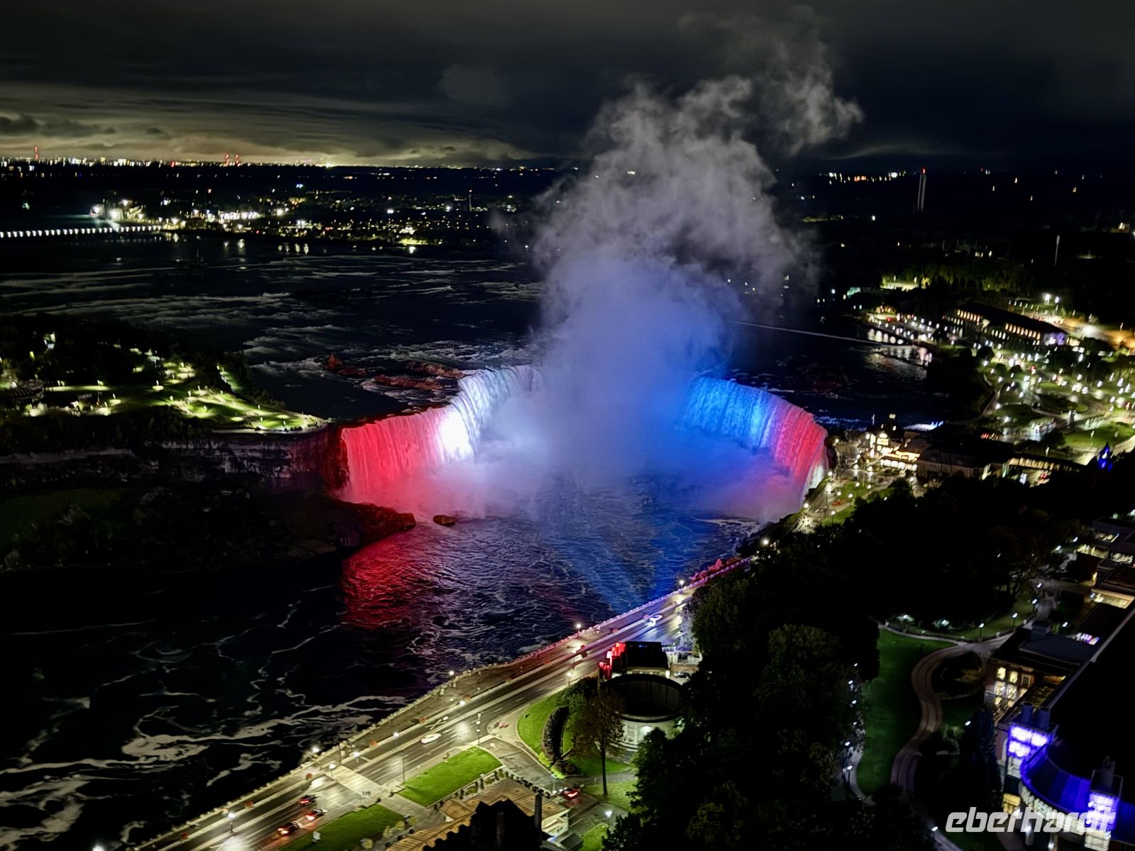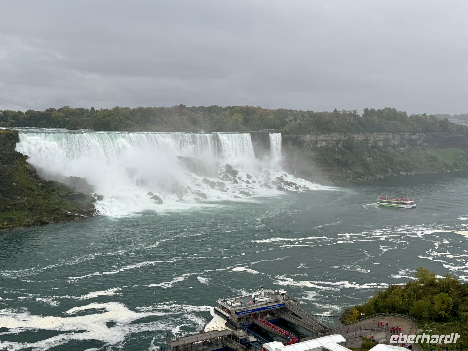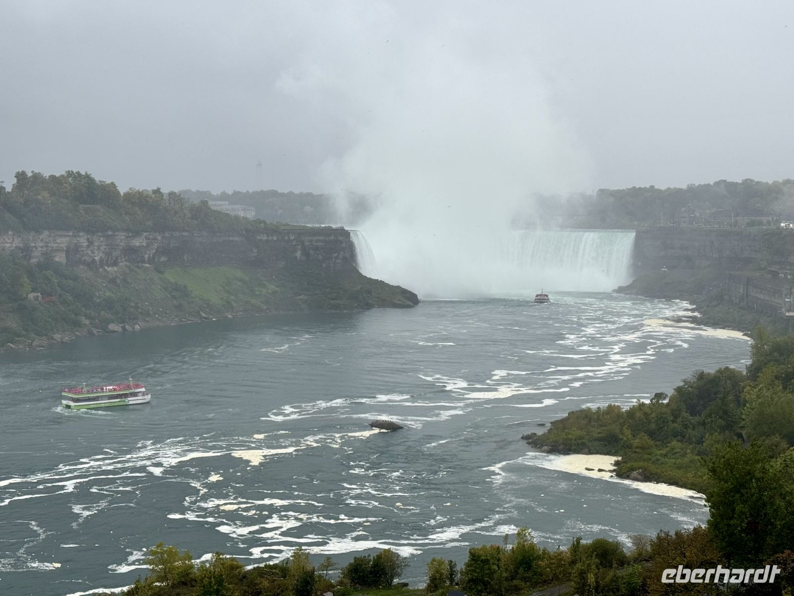 Ein bisschen haben wir Toronto ja gestern schon zu Fuß erkundet — heute wollen wir uns auch ein paar Ecken anschauen, die ein Stück weiter vom Hotel entfernt sind. Zum Glück regnet es erstmal nur ganz früh am Morgen, sodass wir während der Stadtrundfahrt erstmal trocken bleiben und auch aussteigen können. Doch bevor es losgeht muss ich kurz einer Kollegin Hallo sagen, die mit einer anderen Eberhardt-Gruppe unterwegs ist (auf Indian-Summer-Kreuzfahrt). Gegen 9 Uhr herrscht wie üblich viel Verkehr in den Straßen und auf den Gehwegen, denn etwa eine Million Menschen müssen zur Arbeit (grobe Schätzung eines Experimentalphysikers). Wir drehen eine große Runde und fahren am Rathaus vorbei sowie an der Konzerthalle auf der King Street und durch Chinatown. Außerdem geht es am Royal Ontario Museum und dem Parlament von Ontario vorbei. Dann wird es Zeit für unseren Besuch des CN Towers. In weniger als einer Minute geht es mit dem Fahrstuhl hinauf zur Aussichtsplattform des berühmtesten Wahrzeichens von Toronto. Obwohl wir damit heute teilweise in den Wolken sind, gibt es immer wieder Lücken, die uns tolle Blicke aus der Vogelperspektive auf die größte Stadt Kanadas erlauben. Wir sehen zum Beispiel die vorgelagerten Inseln und den großen Hauptbahnhof, aber auch unzählige Wolkenkratzer um uns herum. Einen Kontrast zu den modernen Hochhäusern bildet der Distillery District mit seinen historischen Werksgebäuden, denen Kunstgalerien, kleine Läden und Cafés, mehrere Restaurants und eine Schokoladenfabrik neues Leben eingehaucht haben. Der Wettergott meint es weiterhin gut mit uns und wir können dieses schöne Viertel trockenen Fußes eine Weile erkunden. Hier finden wir auch eine Kleinigkeit zum Mittagessen. Nun führt uns unsere Rundreise jedoch schon aus Toronto hinaus. Vorbei am Fort York und am Messegelände gelangen wir auf den großen Highway, der die Städte des Goldenen Hufeisens um den Ontariosee verbindet. Auf der Fahrt in die Niagara-Region wird das Wetter dann doch wie ursprünglich vorhergesagt bzw. sogar schlimmer. Mit so einem Wolkenbruch haben wir nicht gerechnet. Das ist natürlich vor allem für unseren Fahrer Jim eine Herausforderung, die er aber bravourös meistert. An den Niagarafällen lässt der Regen nach, sodass wir am Aussichtspunkt Table Rock den Ausstieg wagen können. Und ganz ehrlich: Nass wird man hier durch die Gischt fast immer. Auch die anschließende Bootsfahrt zu den Niagarafällen ist stets ein feucht fröhliches Vergnügen. Doch sie gewährt den besten Eindruck von der unnachgiebigen Kraft der Wassermassen. Vielleicht liegt es am Wetter, vielleicht am Ende der Saison: Das Boot ist nur halb voll und wir können uns – in unsere roten Regencapes gehüllt – gut bewegen. Eine weitere Perspektive auf die Niagarafälle vermittelt uns das Abendessen auf dem Skylon Tower. Jim fährt uns freundlicherweise dorthin. Nach Einbruch der Dunkelheit werden sowohl die American Falls als auch die Horseshoe Falls bunt beleuchtet – und um 22 Uhr gibt es zudem ein Feuerwerk! Bis dahin halten wir im Hotel noch durch, dann fallen wir in unsere weichen Hotelbetten.