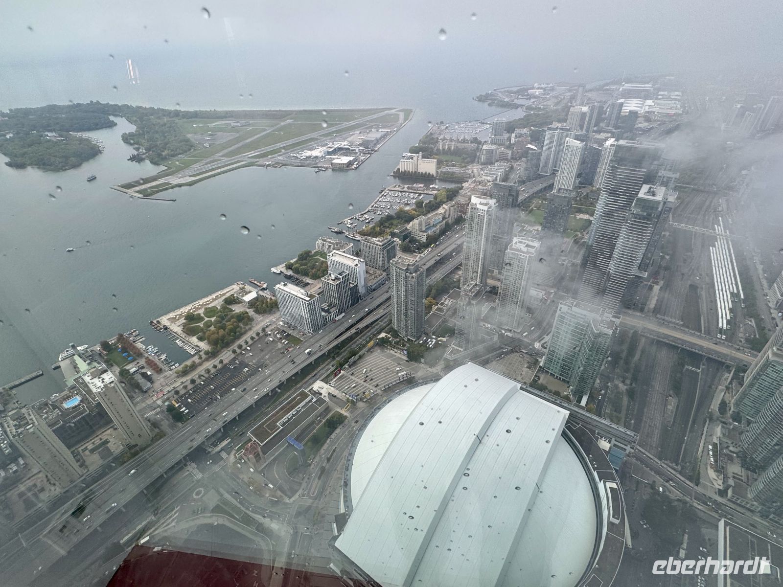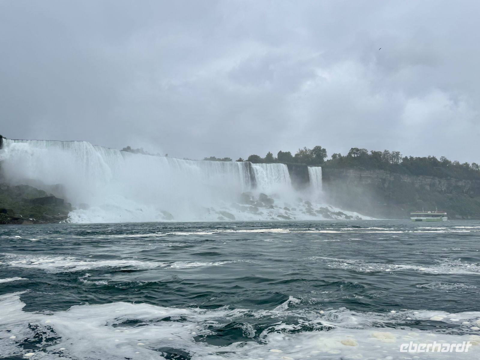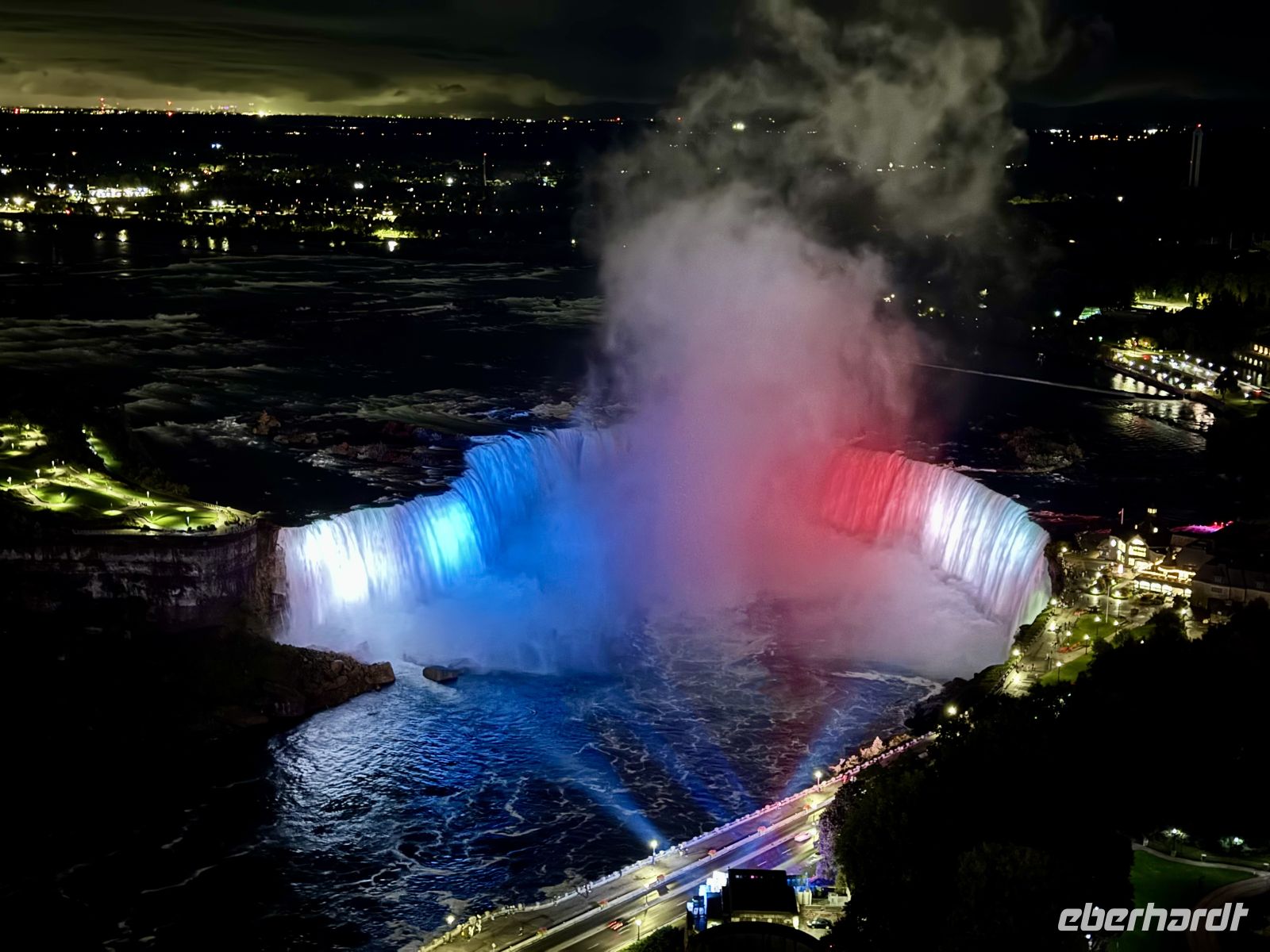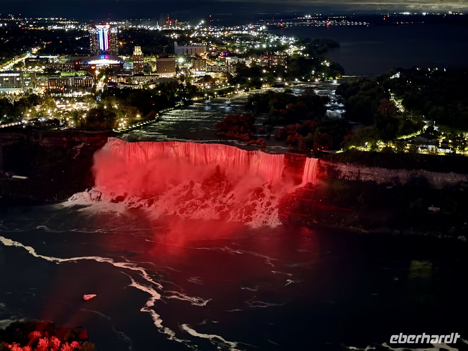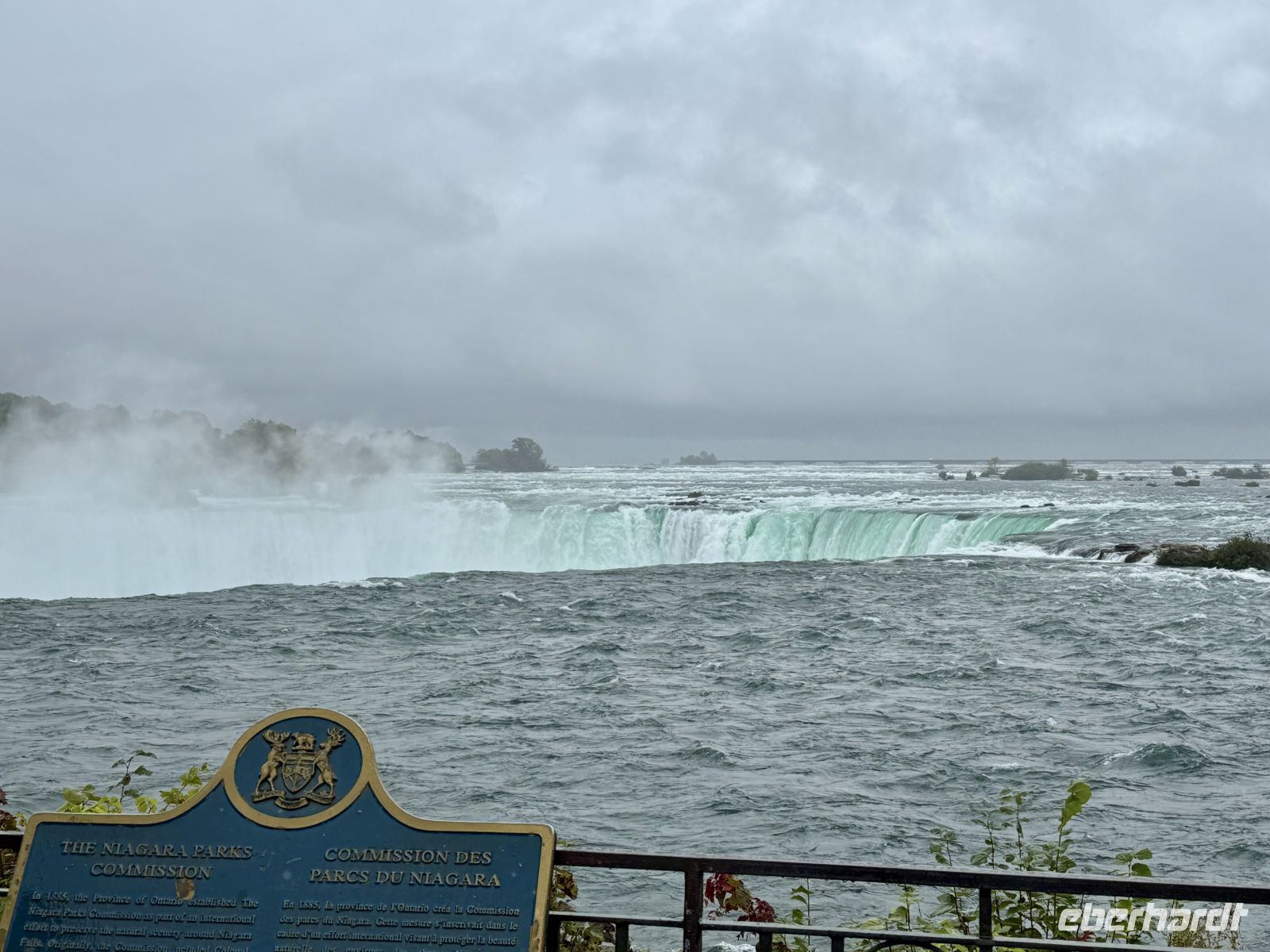 Ein bisschen haben wir Toronto ja gestern schon zu Fuß erkundet — heute wollen wir uns auch ein paar Ecken anschauen, die ein Stück weiter vom Hotel entfernt sind. Zum Glück regnet es erstmal nur ganz früh am Morgen, sodass wir während der Stadtrundfahrt erstmal trocken bleiben und auch aussteigen können. Doch bevor es losgeht muss ich kurz einer Kollegin Hallo sagen, die mit einer anderen Eberhardt-Gruppe unterwegs ist (auf Indian-Summer-Kreuzfahrt). Gegen 9 Uhr herrscht wie üblich viel Verkehr in den Straßen und auf den Gehwegen, denn etwa eine Million Menschen müssen zur Arbeit (grobe Schätzung eines Experimentalphysikers). Wir drehen eine große Runde und fahren am Rathaus vorbei sowie an der Konzerthalle auf der King Street und durch Chinatown. Außerdem geht es am Royal Ontario Museum und dem Parlament von Ontario vorbei. Dann wird es Zeit für unseren Besuch des CN Towers. In weniger als einer Minute geht es mit dem Fahrstuhl hinauf zur Aussichtsplattform des berühmtesten Wahrzeichens von Toronto. Obwohl wir damit heute teilweise in den Wolken sind, gibt es immer wieder Lücken, die uns tolle Blicke aus der Vogelperspektive auf die größte Stadt Kanadas erlauben. Wir sehen zum Beispiel die vorgelagerten Inseln und den großen Hauptbahnhof, aber auch unzählige Wolkenkratzer um uns herum. Einen Kontrast zu den modernen Hochhäusern bildet der Distillery District mit seinen historischen Werksgebäuden, denen Kunstgalerien, kleine Läden und Cafés, mehrere Restaurants und eine Schokoladenfabrik neues Leben eingehaucht haben. Der Wettergott meint es weiterhin gut mit uns und wir können dieses schöne Viertel trockenen Fußes eine Weile erkunden. Hier finden wir auch eine Kleinigkeit zum Mittagessen. Nun führt uns unsere Rundreise jedoch schon aus Toronto hinaus. Vorbei am Fort York und am Messegelände gelangen wir auf den großen Highway, der die Städte des Goldenen Hufeisens um den Ontariosee verbindet. Auf der Fahrt in die Niagara-Region wird das Wetter dann doch wie ursprünglich vorhergesagt bzw. sogar schlimmer. Mit so einem Wolkenbruch haben wir nicht gerechnet. Das ist natürlich vor allem für unseren Fahrer Jim eine Herausforderung, die er aber bravourös meistert. An den Niagarafällen lässt der Regen nach, sodass wir am Aussichtspunkt Table Rock den Ausstieg wagen können. Und ganz ehrlich: Nass wird man hier durch die Gischt fast immer. Auch die anschließende Bootsfahrt zu den Niagarafällen ist stets ein feucht fröhliches Vergnügen. Doch sie gewährt den besten Eindruck von der unnachgiebigen Kraft der Wassermassen. Vielleicht liegt es am Wetter, vielleicht am Ende der Saison: Das Boot ist nur halb voll und wir können uns – in unsere roten Regencapes gehüllt – gut bewegen. Eine weitere Perspektive auf die Niagarafälle vermittelt uns das Abendessen auf dem Skylon Tower. Jim fährt uns freundlicherweise dorthin. Nach Einbruch der Dunkelheit werden sowohl die American Falls als auch die Horseshoe Falls bunt beleuchtet – und um 22 Uhr gibt es zudem ein Feuerwerk! Bis dahin halten wir im Hotel noch durch, dann fallen wir in unsere weichen Hotelbetten.