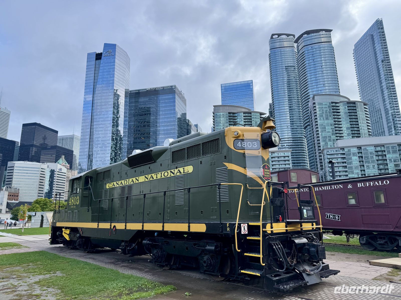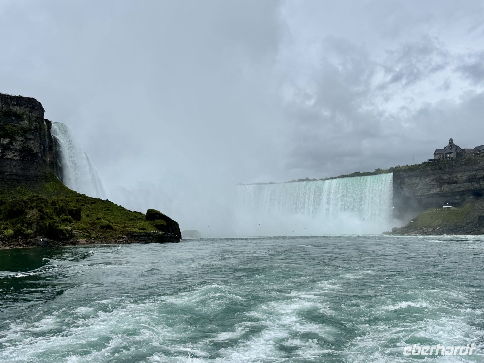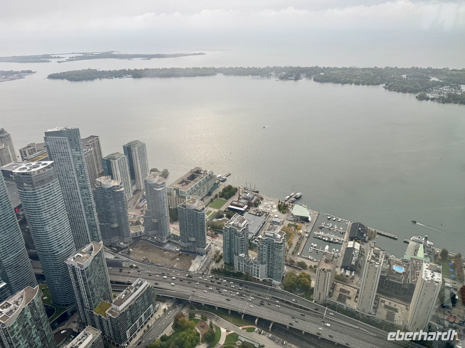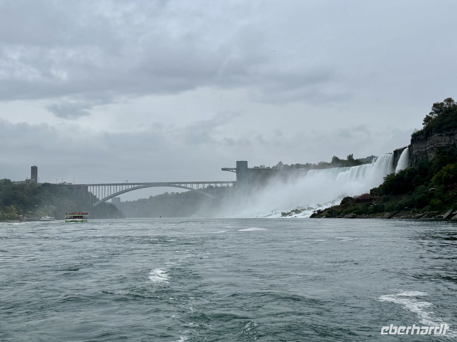 Ein bisschen haben wir Toronto ja gestern schon zu Fuß erkundet — heute wollen wir uns auch ein paar Ecken anschauen, die ein Stück weiter vom Hotel entfernt sind. Zum Glück regnet es erstmal nur ganz früh am Morgen, sodass wir während der Stadtrundfahrt erstmal trocken bleiben und auch aussteigen können. Doch bevor es losgeht muss ich kurz einer Kollegin Hallo sagen, die mit einer anderen Eberhardt-Gruppe unterwegs ist (auf Indian-Summer-Kreuzfahrt). Gegen 9 Uhr herrscht wie üblich viel Verkehr in den Straßen und auf den Gehwegen, denn etwa eine Million Menschen müssen zur Arbeit (grobe Schätzung eines Experimentalphysikers). Wir drehen eine große Runde und fahren am Rathaus vorbei sowie an der Konzerthalle auf der King Street und durch Chinatown. Außerdem geht es am Royal Ontario Museum und dem Parlament von Ontario vorbei. Dann wird es Zeit für unseren Besuch des CN Towers. In weniger als einer Minute geht es mit dem Fahrstuhl hinauf zur Aussichtsplattform des berühmtesten Wahrzeichens von Toronto. Obwohl wir damit heute teilweise in den Wolken sind, gibt es immer wieder Lücken, die uns tolle Blicke aus der Vogelperspektive auf die größte Stadt Kanadas erlauben. Wir sehen zum Beispiel die vorgelagerten Inseln und den großen Hauptbahnhof, aber auch unzählige Wolkenkratzer um uns herum. Einen Kontrast zu den modernen Hochhäusern bildet der Distillery District mit seinen historischen Werksgebäuden, denen Kunstgalerien, kleine Läden und Cafés, mehrere Restaurants und eine Schokoladenfabrik neues Leben eingehaucht haben. Der Wettergott meint es weiterhin gut mit uns und wir können dieses schöne Viertel trockenen Fußes eine Weile erkunden. Hier finden wir auch eine Kleinigkeit zum Mittagessen. Nun führt uns unsere Rundreise jedoch schon aus Toronto hinaus. Vorbei am Fort York und am Messegelände gelangen wir auf den großen Highway, der die Städte des Goldenen Hufeisens um den Ontariosee verbindet. Auf der Fahrt in die Niagara-Region wird das Wetter dann doch wie ursprünglich vorhergesagt bzw. sogar schlimmer. Mit so einem Wolkenbruch haben wir nicht gerechnet. Das ist natürlich vor allem für unseren Fahrer Jim eine Herausforderung, die er aber bravourös meistert. An den Niagarafällen lässt der Regen nach, sodass wir am Aussichtspunkt Table Rock den Ausstieg wagen können. Und ganz ehrlich: Nass wird man hier durch die Gischt fast immer. Auch die anschließende Bootsfahrt zu den Niagarafällen ist stets ein feucht fröhliches Vergnügen. Doch sie gewährt den besten Eindruck von der unnachgiebigen Kraft der Wassermassen. Vielleicht liegt es am Wetter, vielleicht am Ende der Saison: Das Boot ist nur halb voll und wir können uns – in unsere roten Regencapes gehüllt – gut bewegen. Eine weitere Perspektive auf die Niagarafälle vermittelt uns das Abendessen auf dem Skylon Tower. Jim fährt uns freundlicherweise dorthin. Nach Einbruch der Dunkelheit werden sowohl die American Falls als auch die Horseshoe Falls bunt beleuchtet – und um 22 Uhr gibt es zudem ein Feuerwerk! Bis dahin halten wir im Hotel noch durch, dann fallen wir in unsere weichen Hotelbetten.